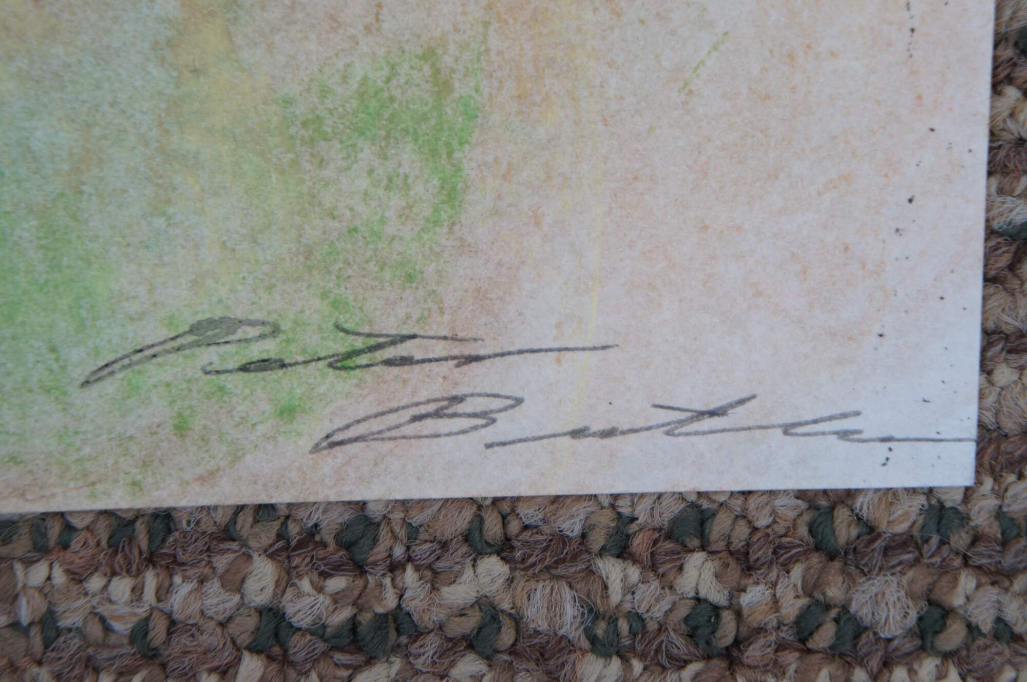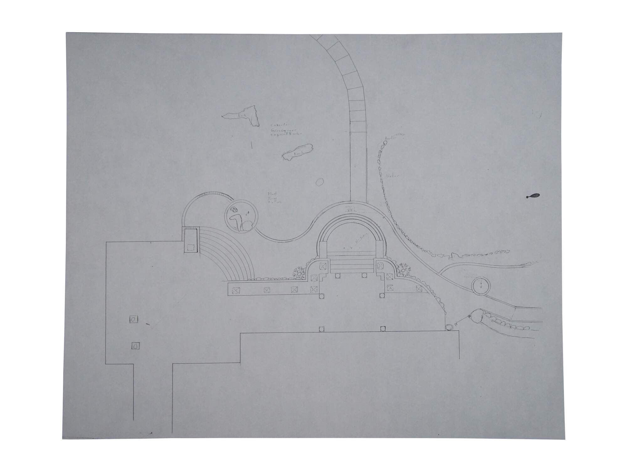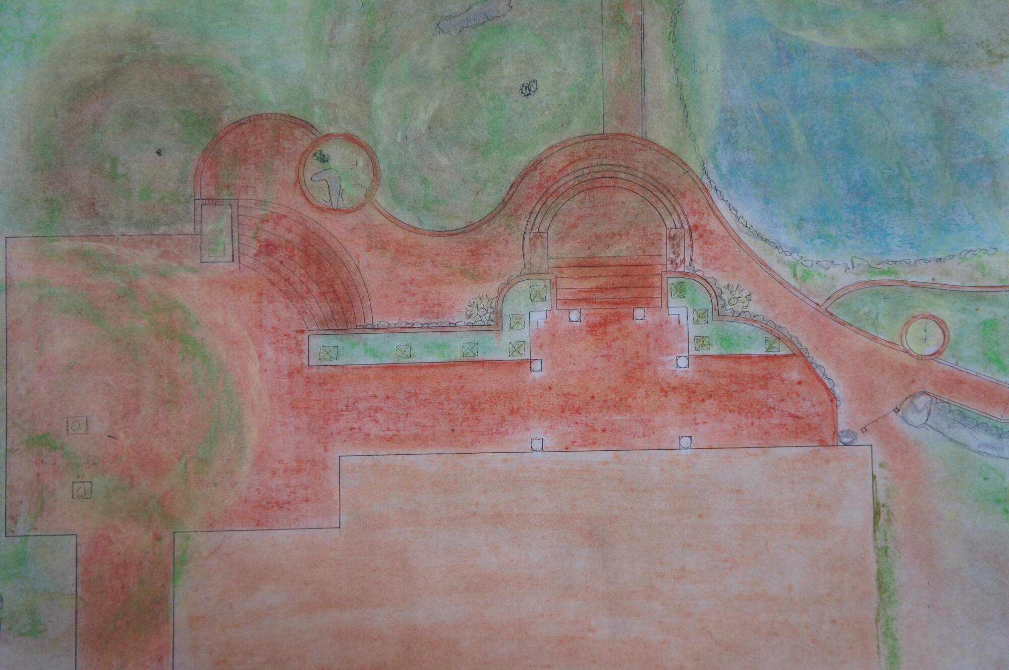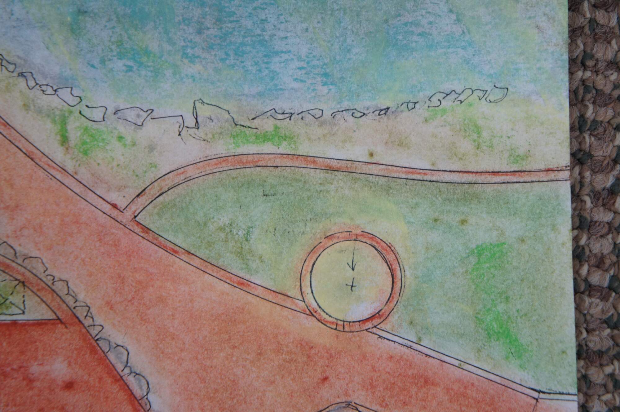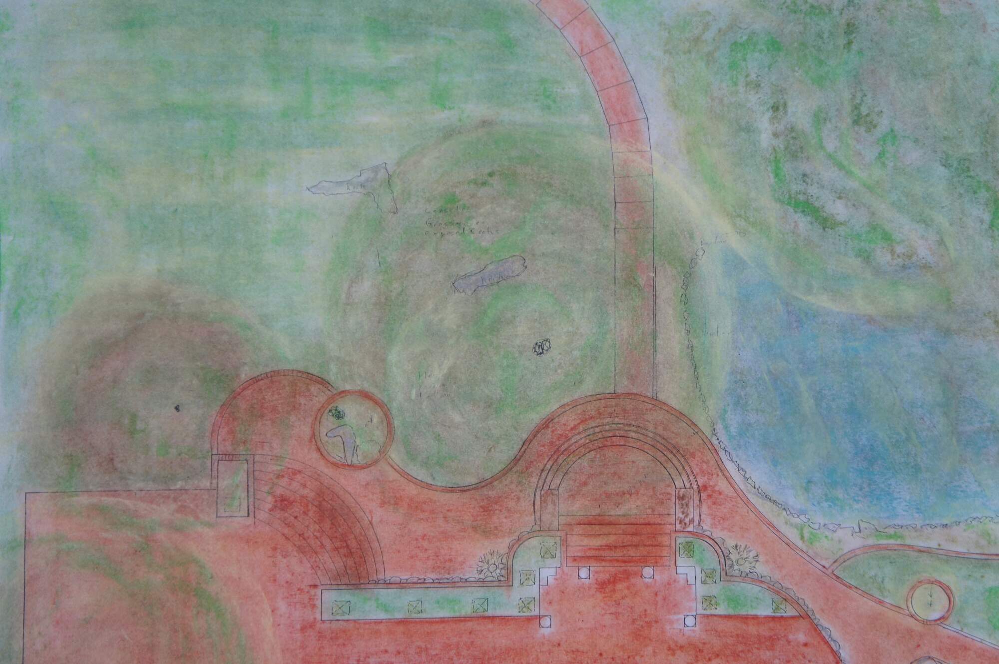 Pen and watercolor bird’s eye view architectural garden / grounds drawing / landscape layout of 995 Deer Point Rd in Olga Washingtons Orcas Island. Signed Peter Butler in one corner. Also includes an un-colored photocopy of the design/layout.