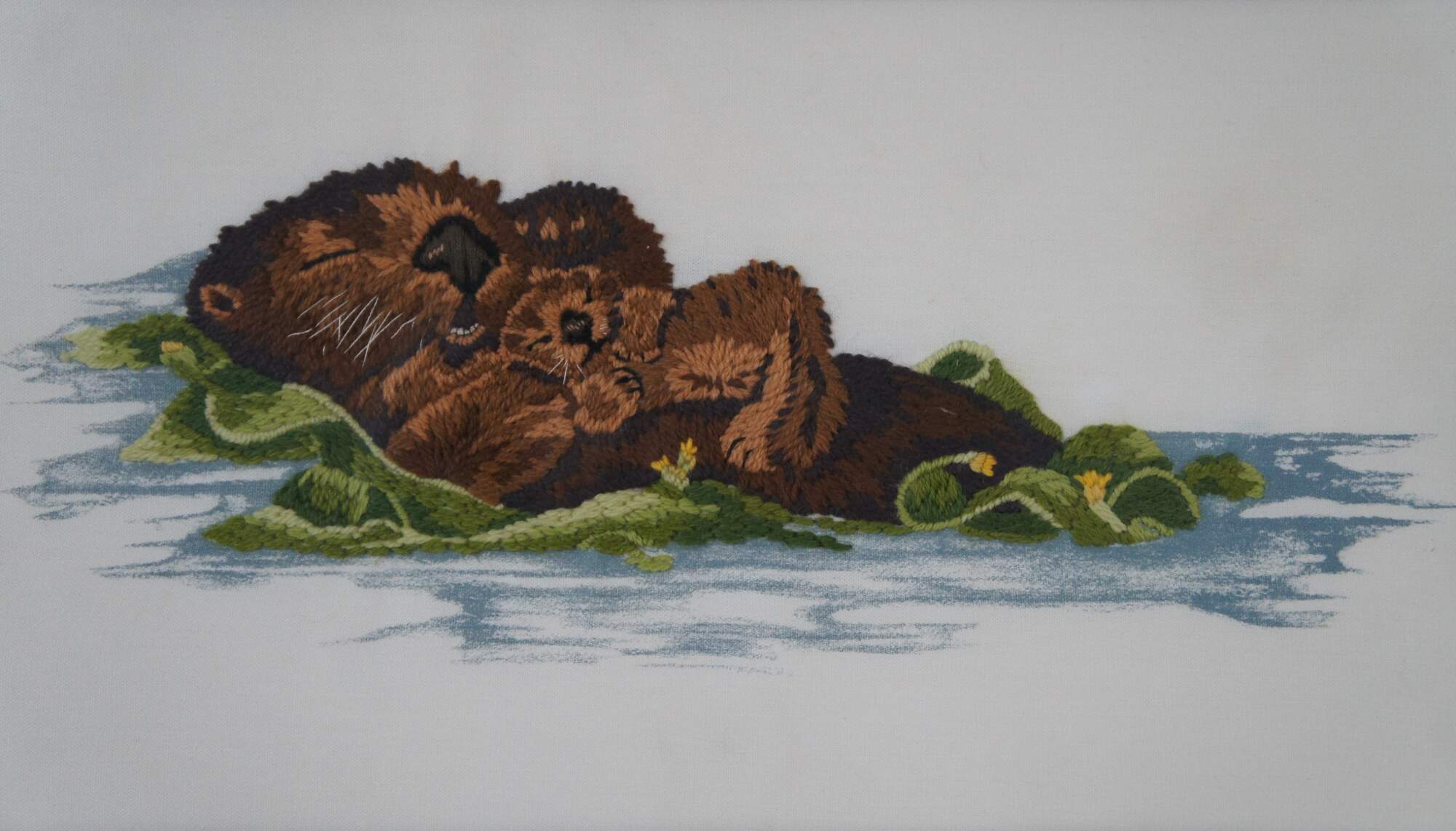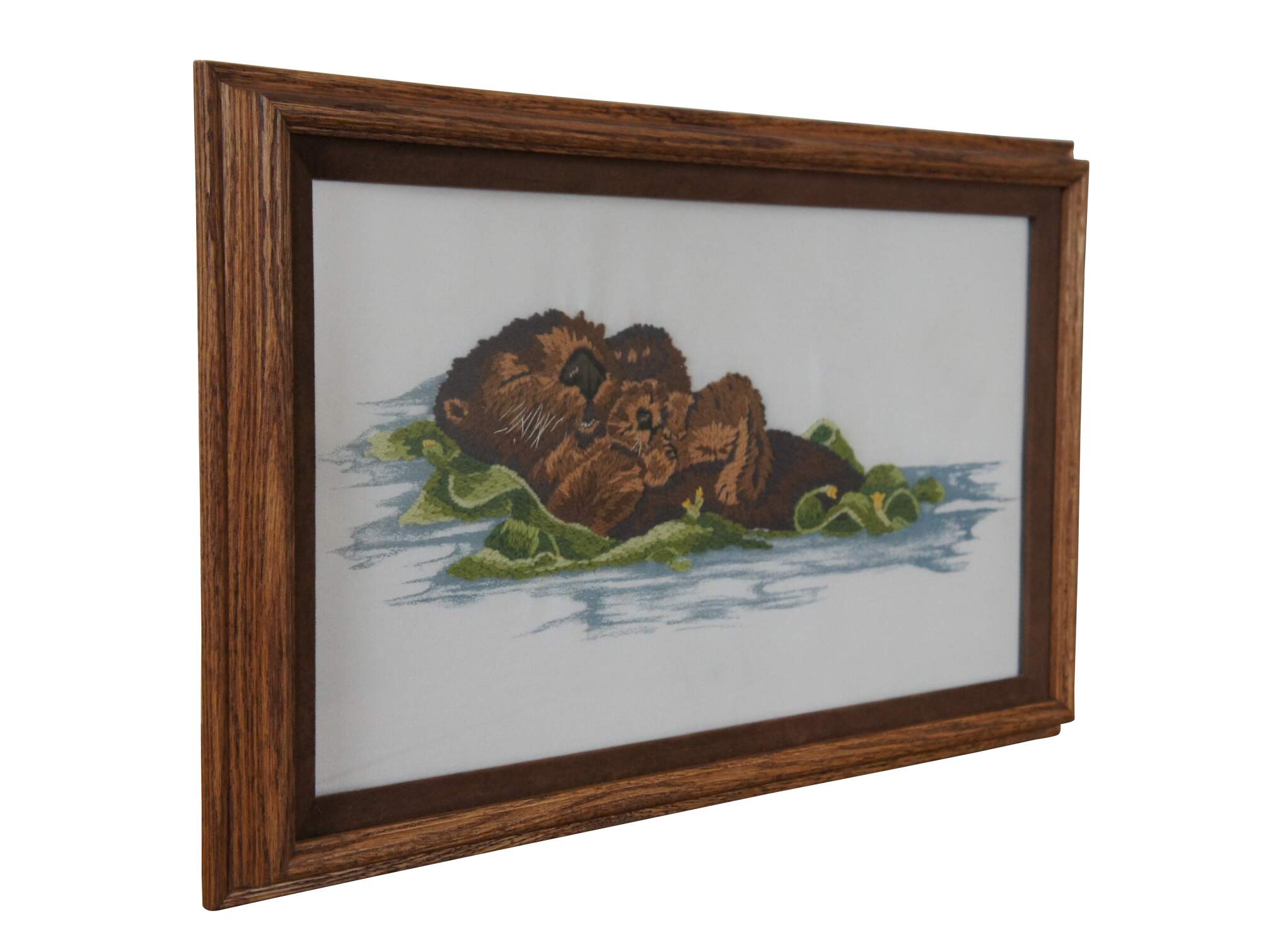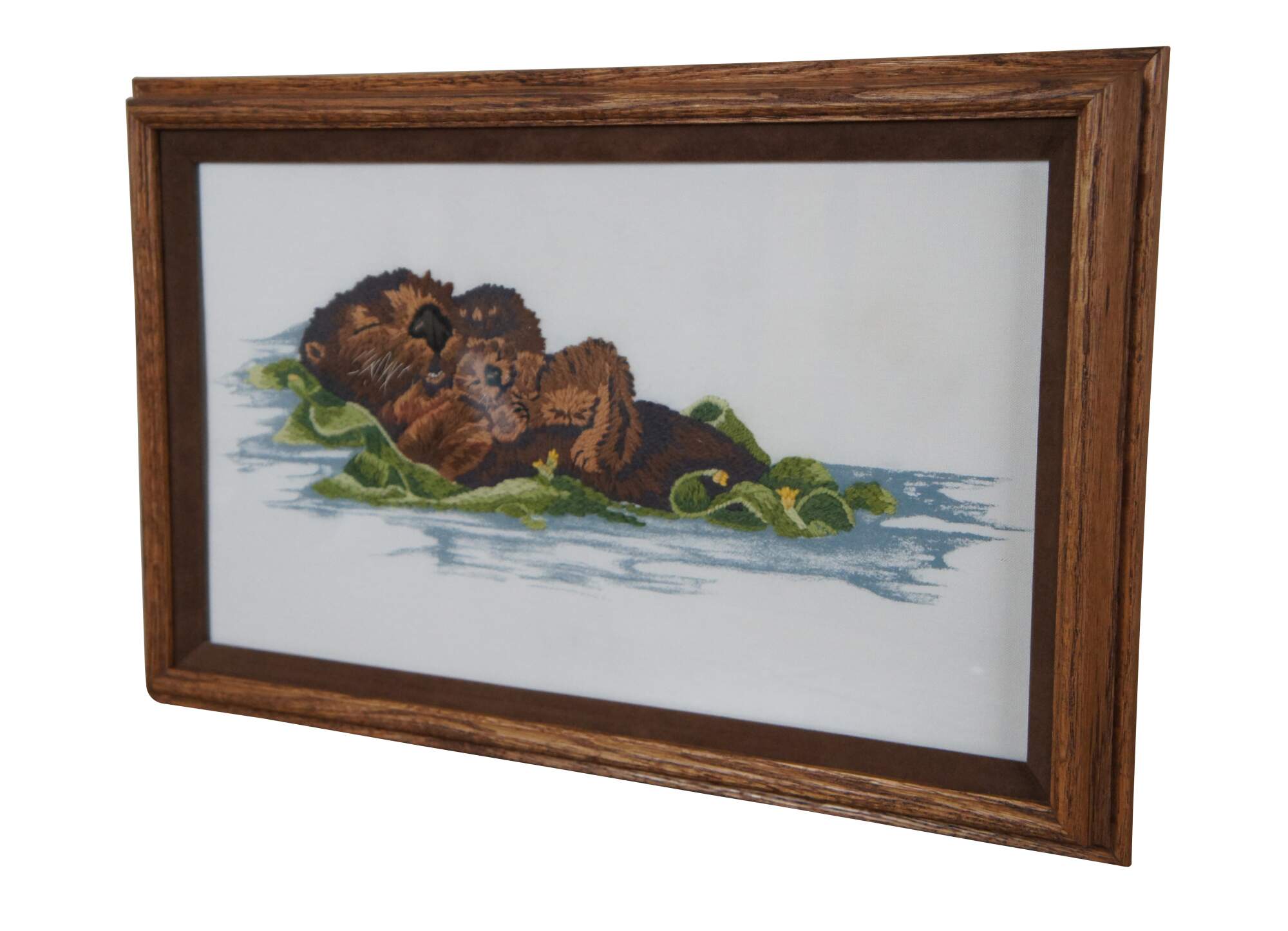 Vintage framed piece of crewel needlepoint embroidery / cross stitch art depicting a sea otter and pup floating in a bed of seaweed. Design by Virginia Miller; kit originally produced by Janlynn circa 1988. Framed in Oak