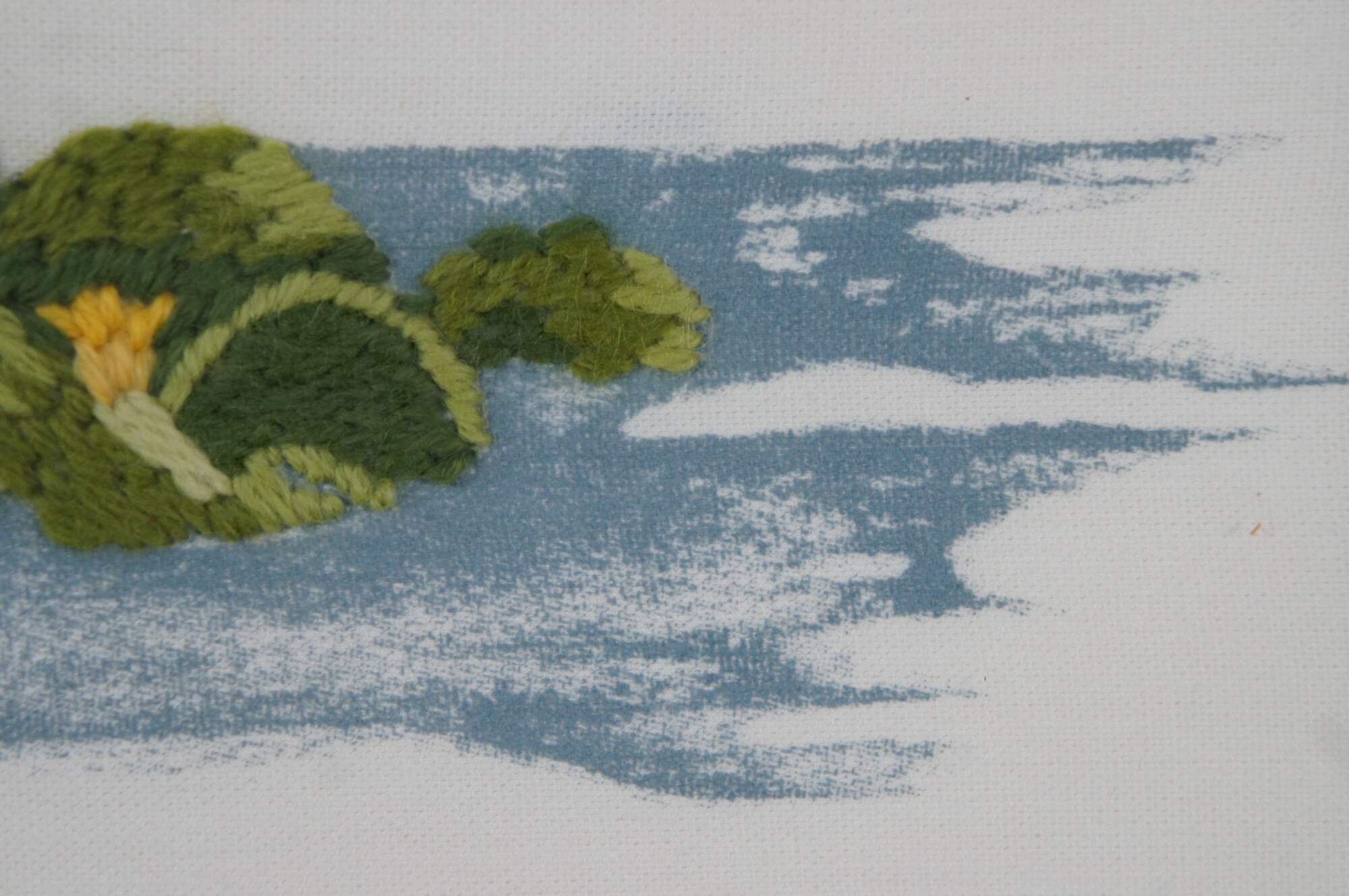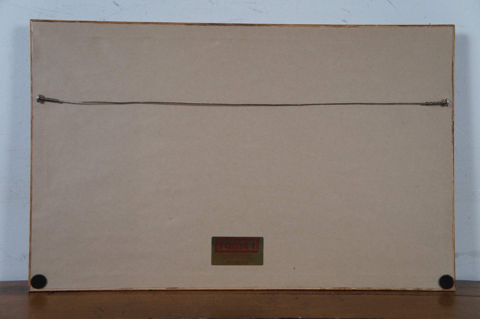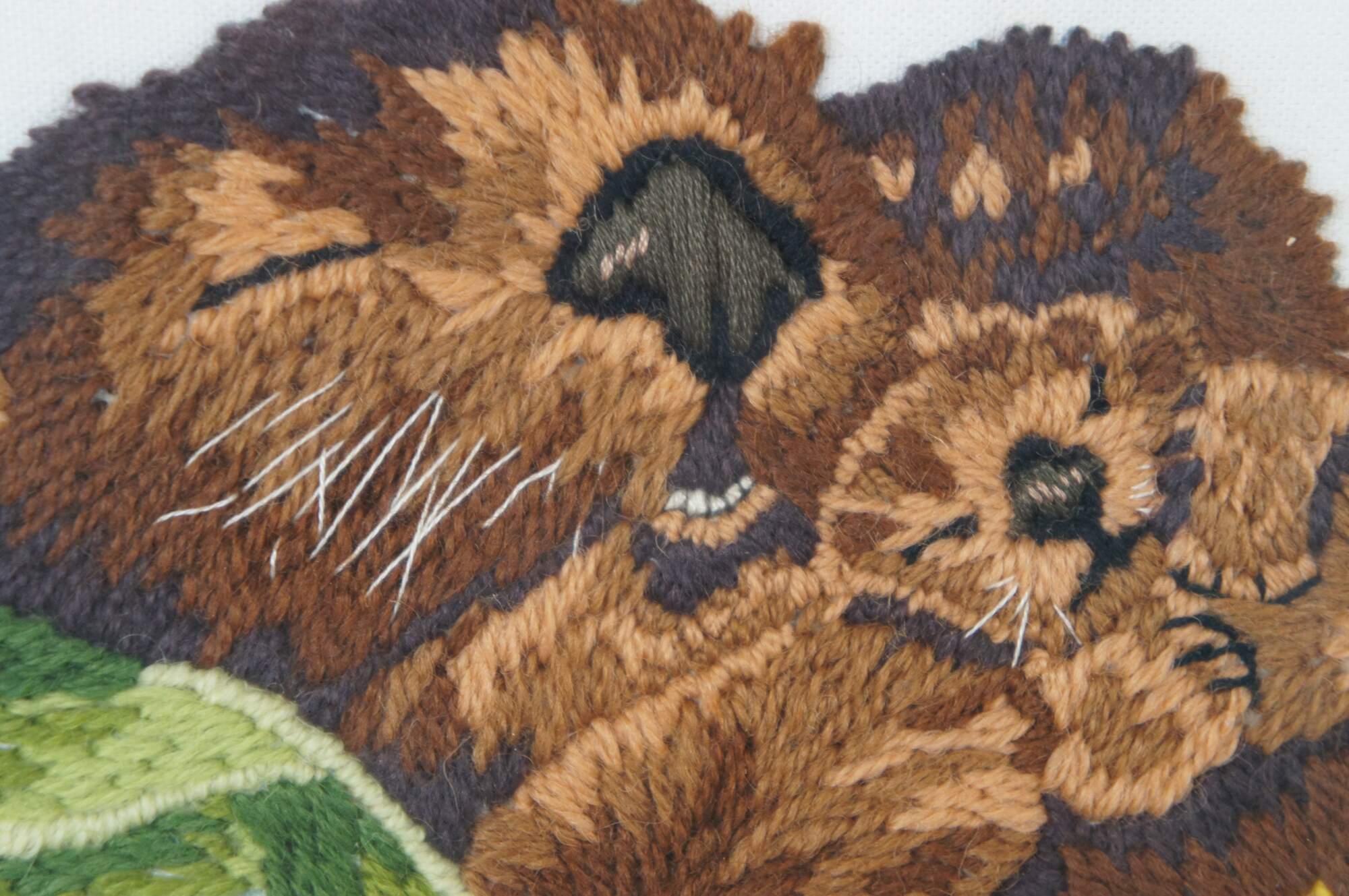 Vintage framed piece of crewel needlepoint embroidery / cross stitch art depicting a sea otter and pup floating in a bed of seaweed. Design by Virginia Miller; kit originally produced by Janlynn circa 1988. Framed in Oak