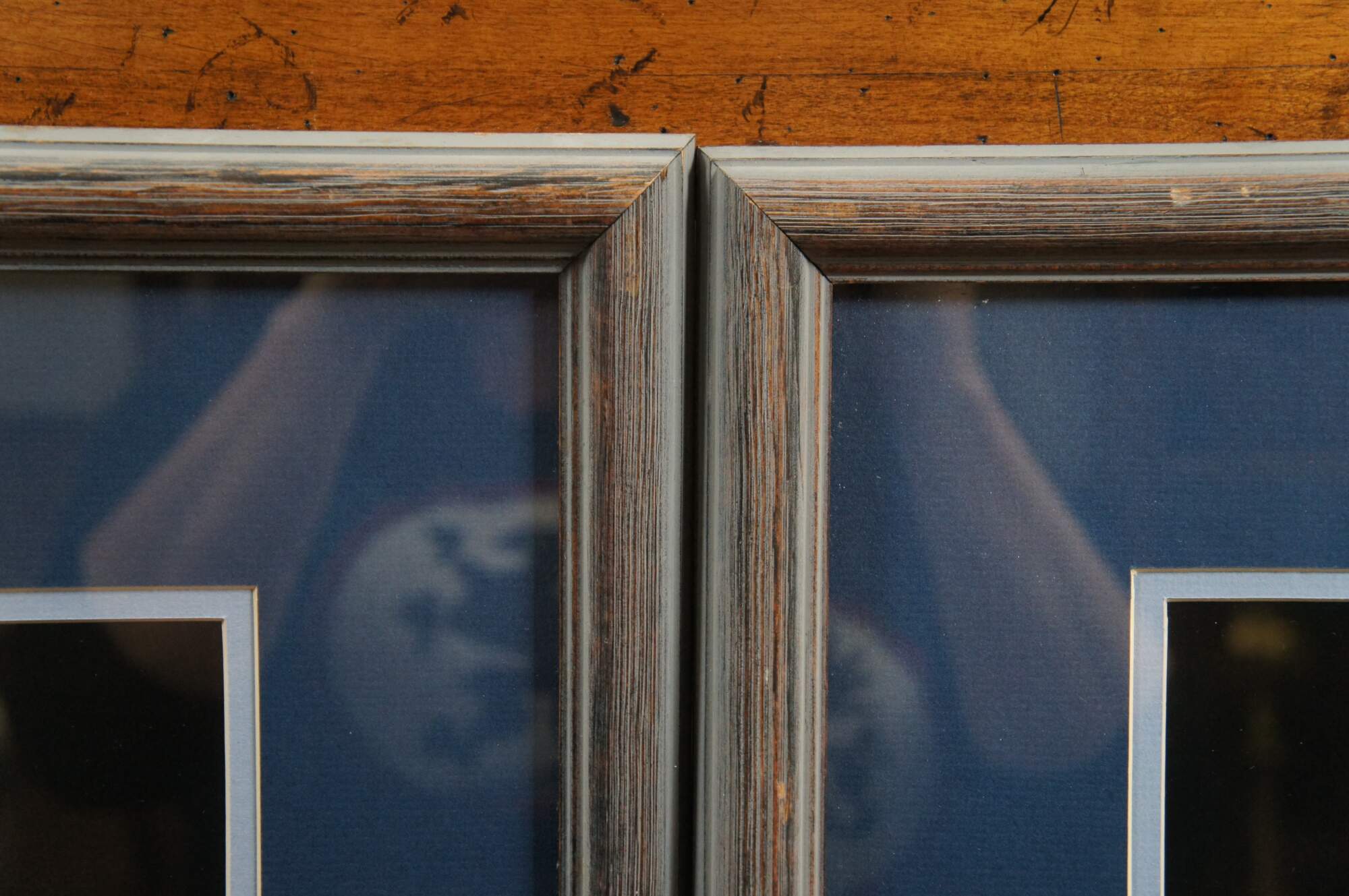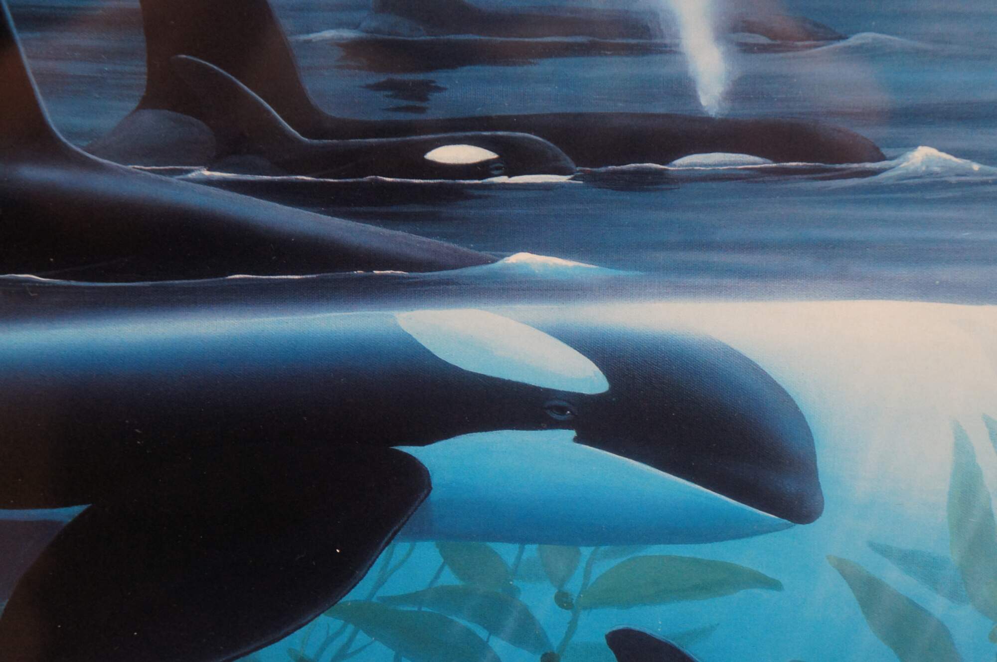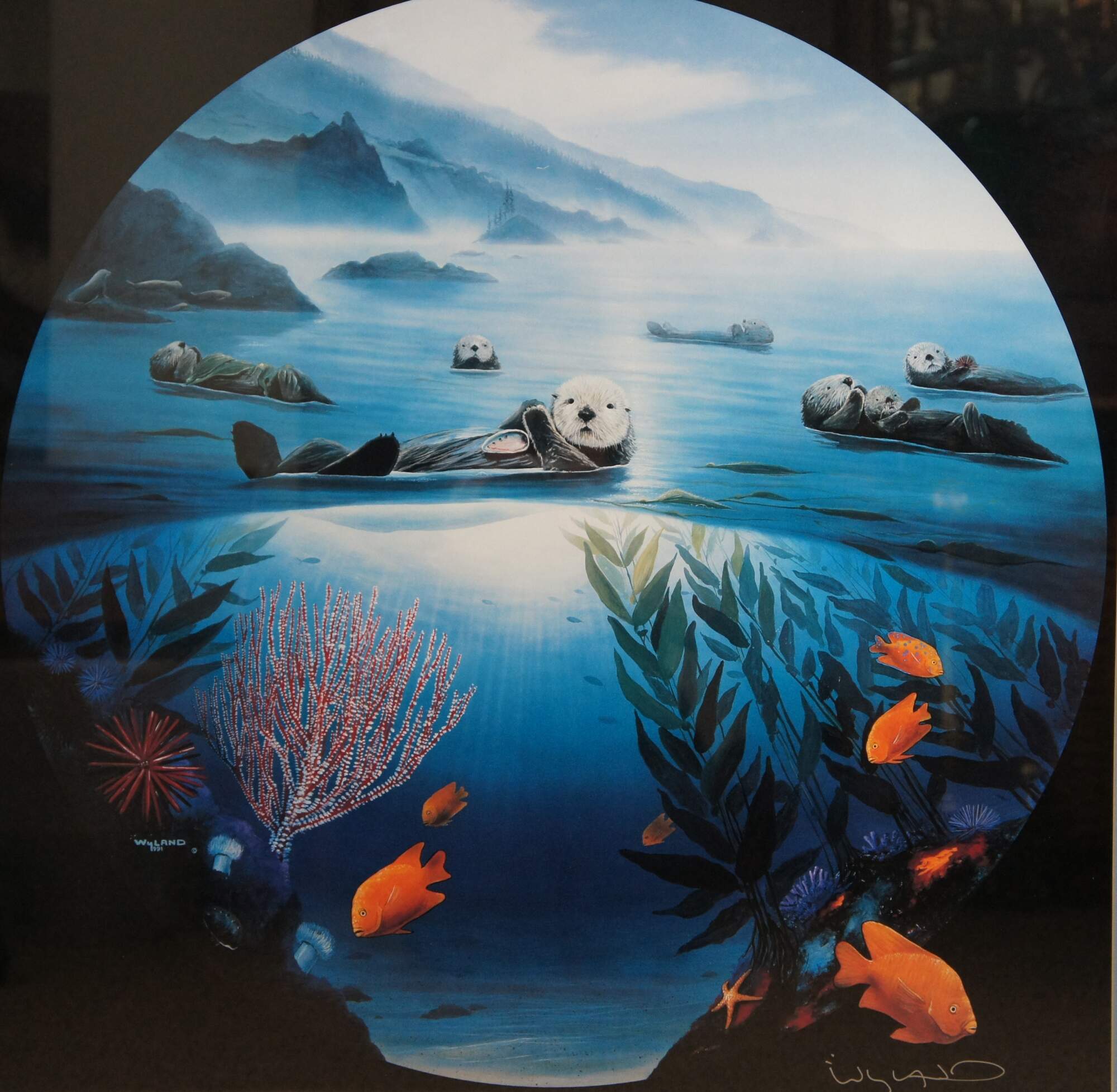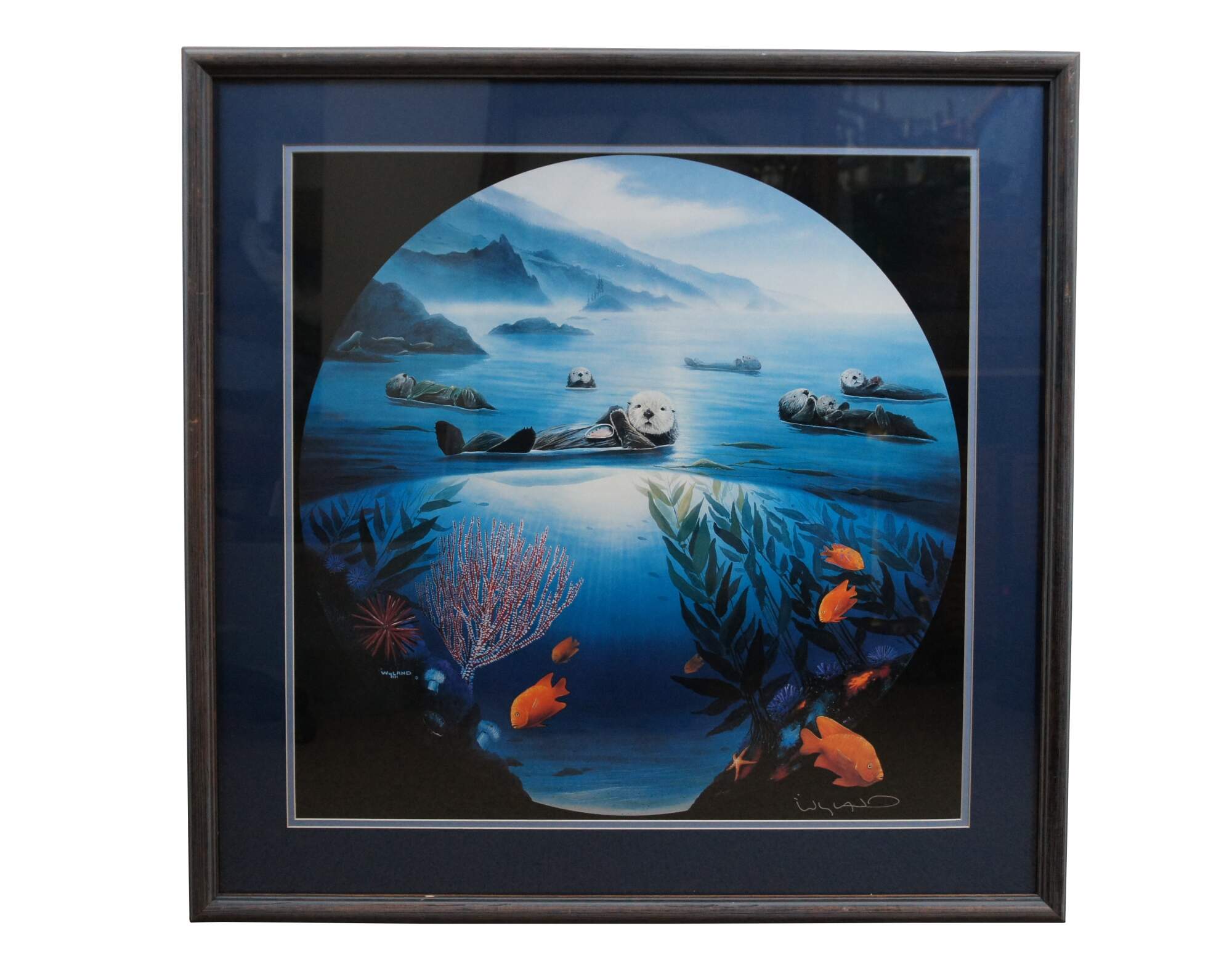 Pair of early 1990's lithograph prints by Robert Wyland - Orca Journey and Sea Otters. Both signed in metallic pen. Framed in factory distressed wood frames with blue matt under glass.