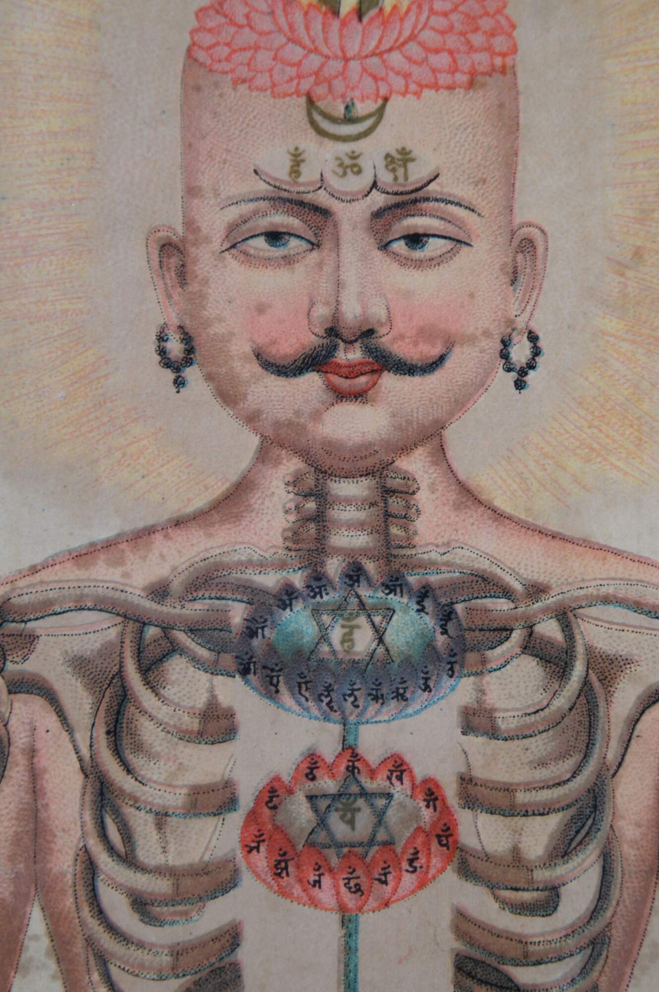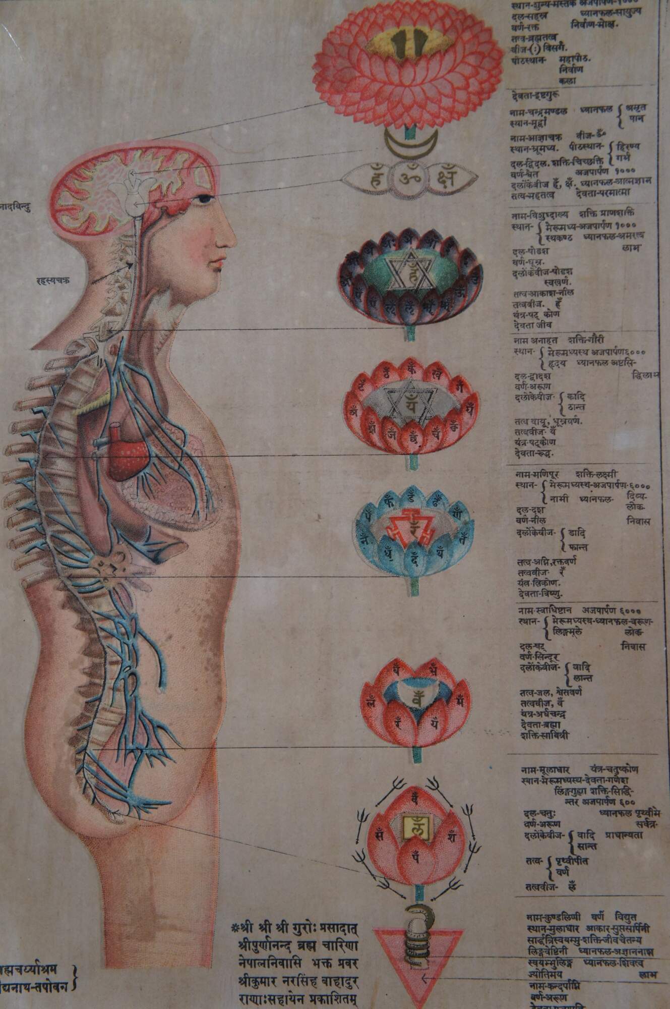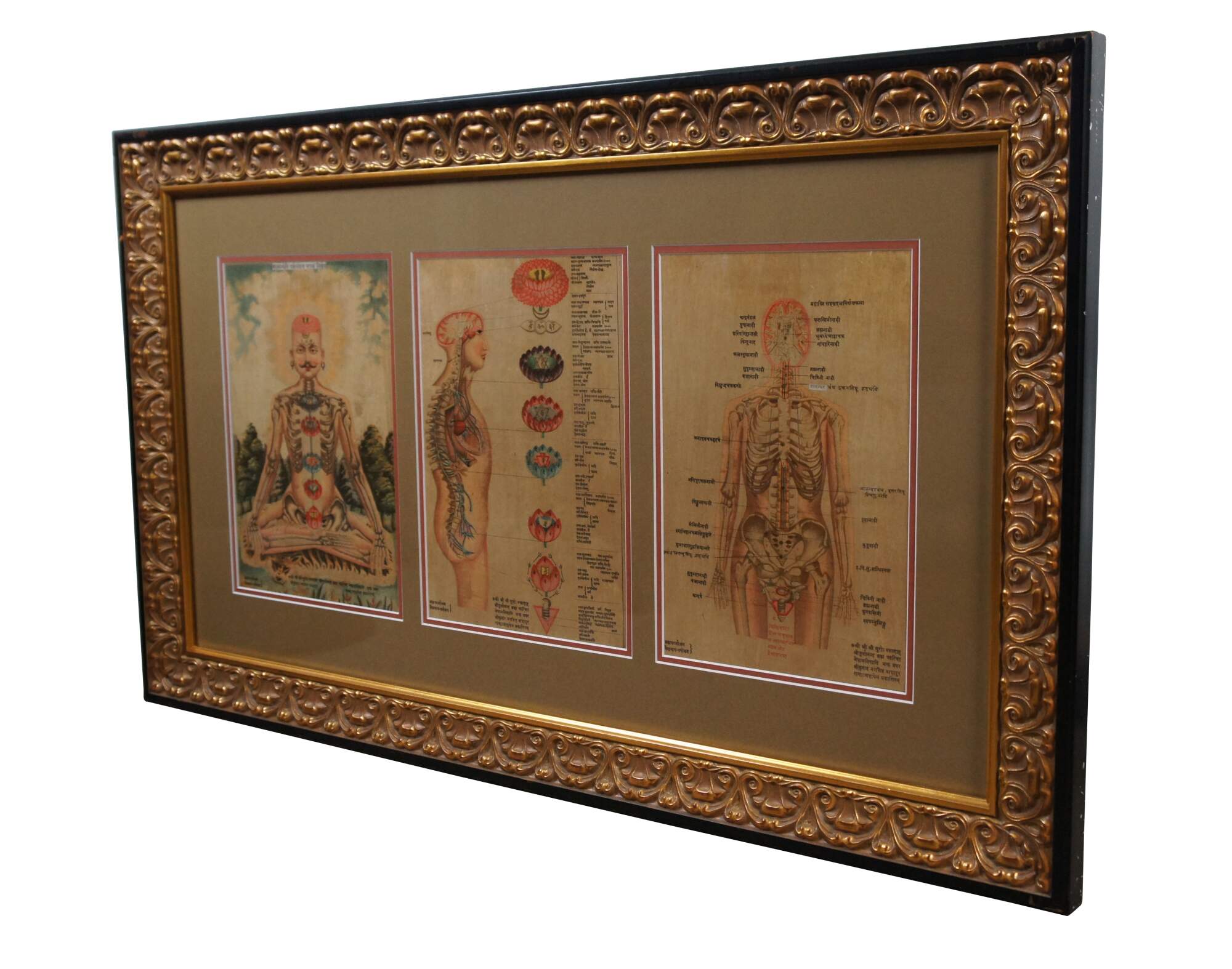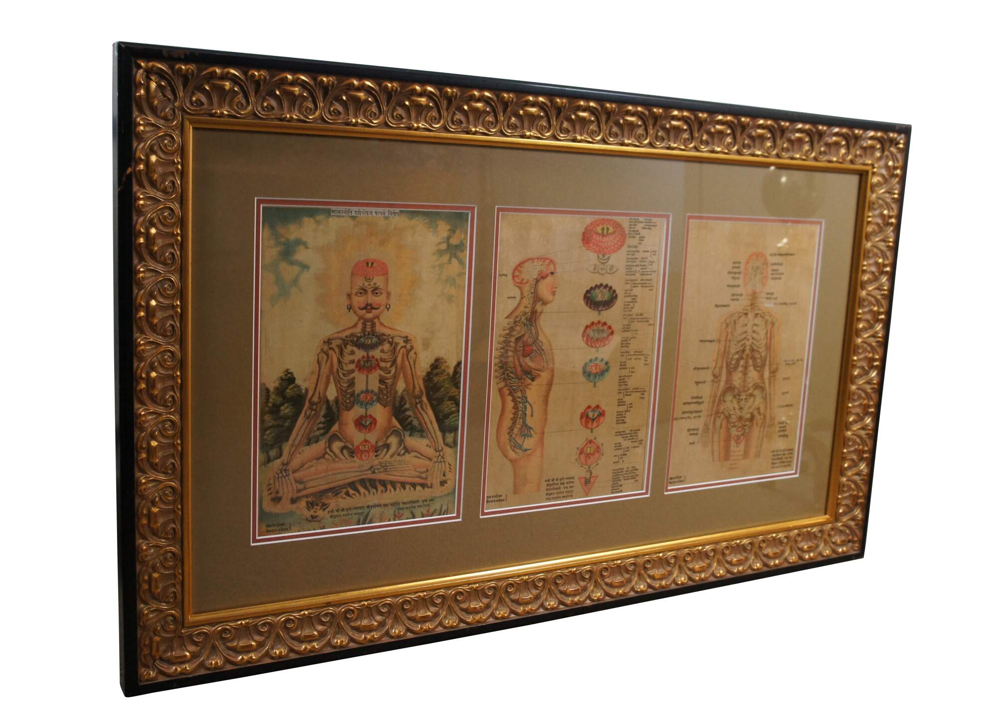 Set of three antique Hindu / Indian anatomical prints, emphasizing the seven chakras with Sanskrit text. Display together in a modern carved gilded yard-long frame with black edge.