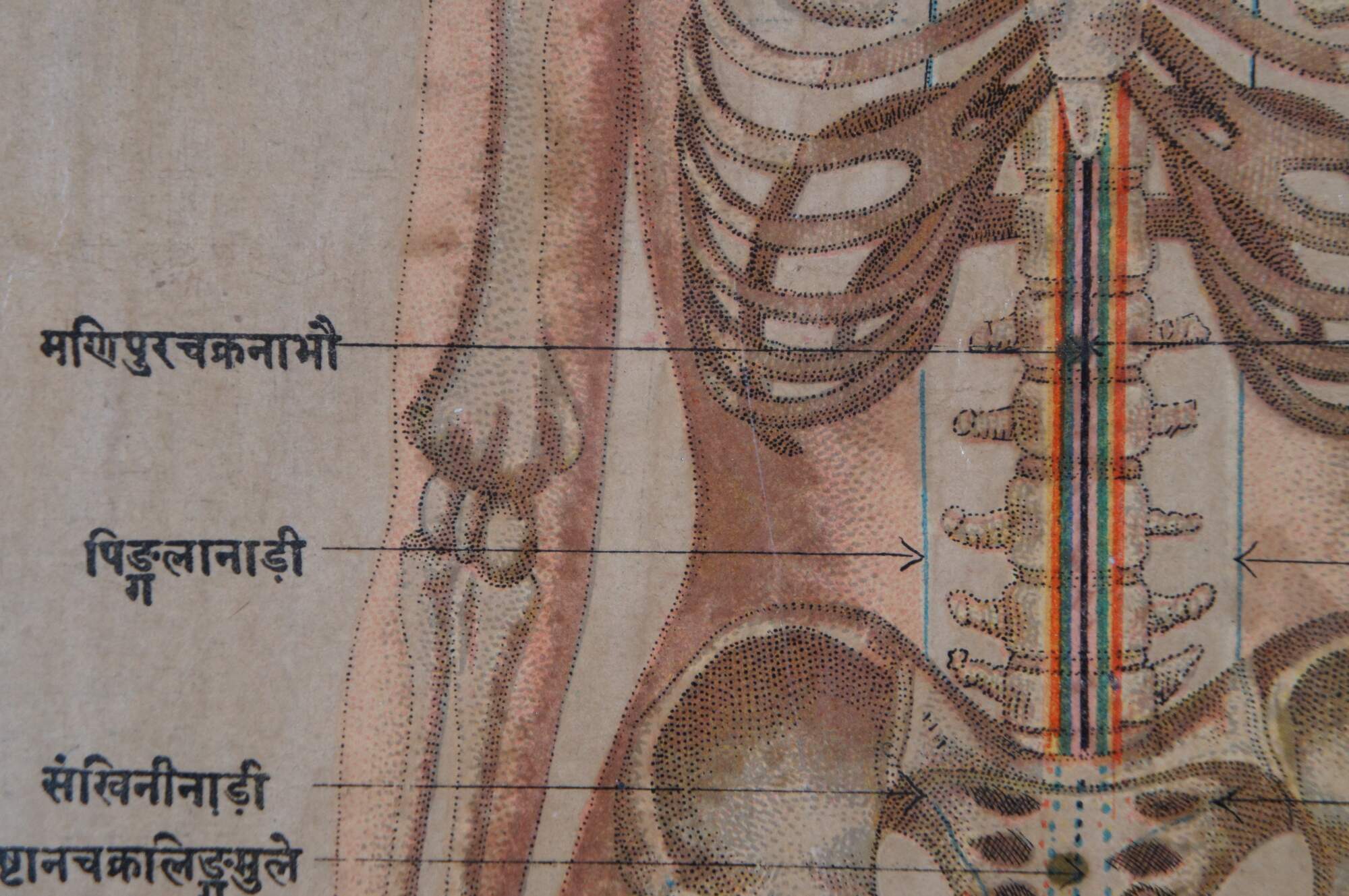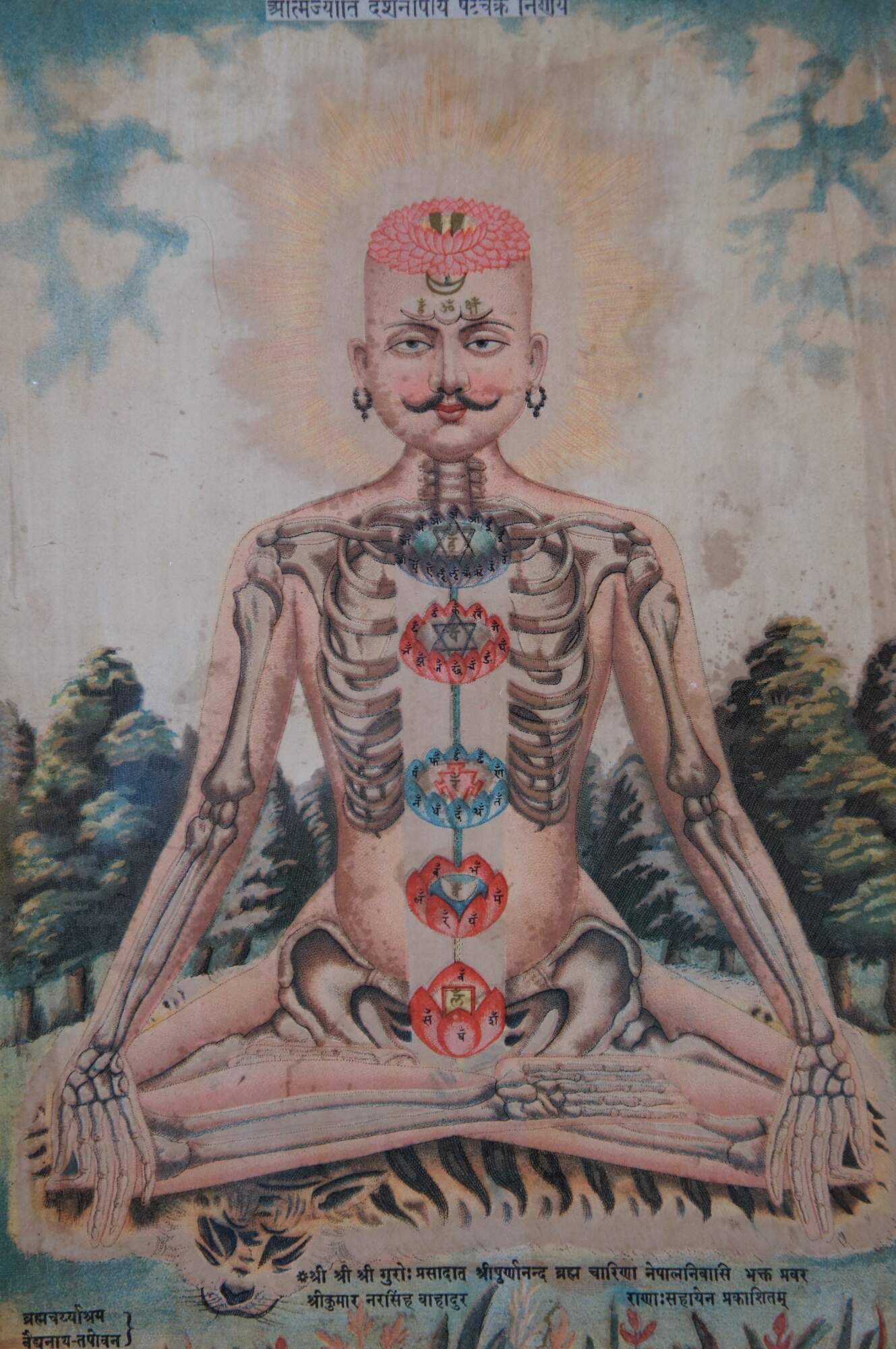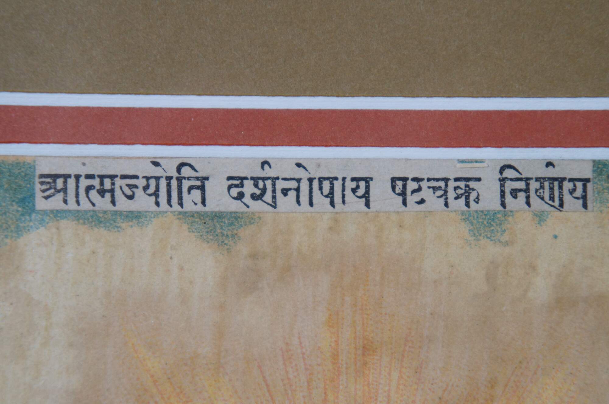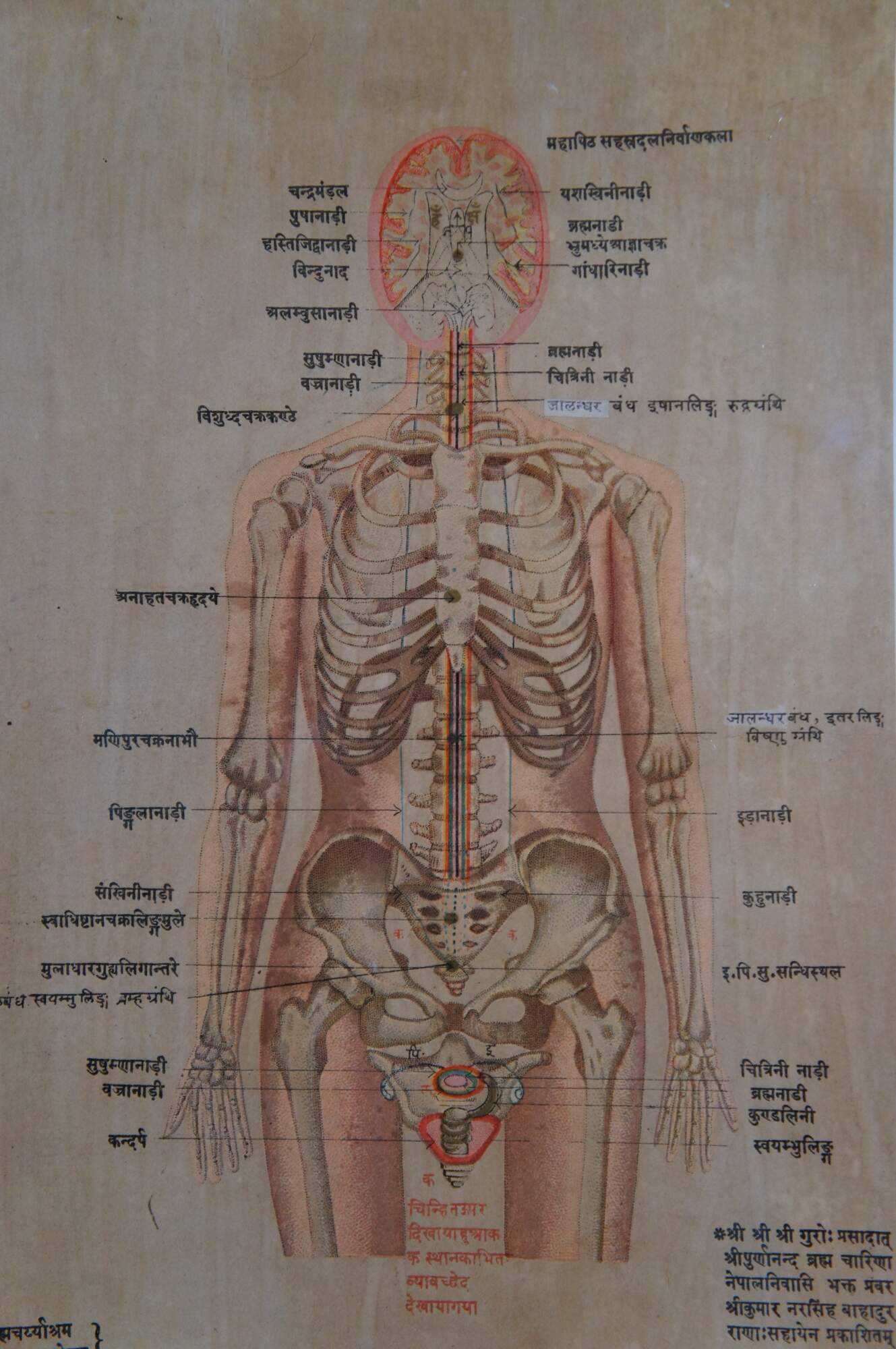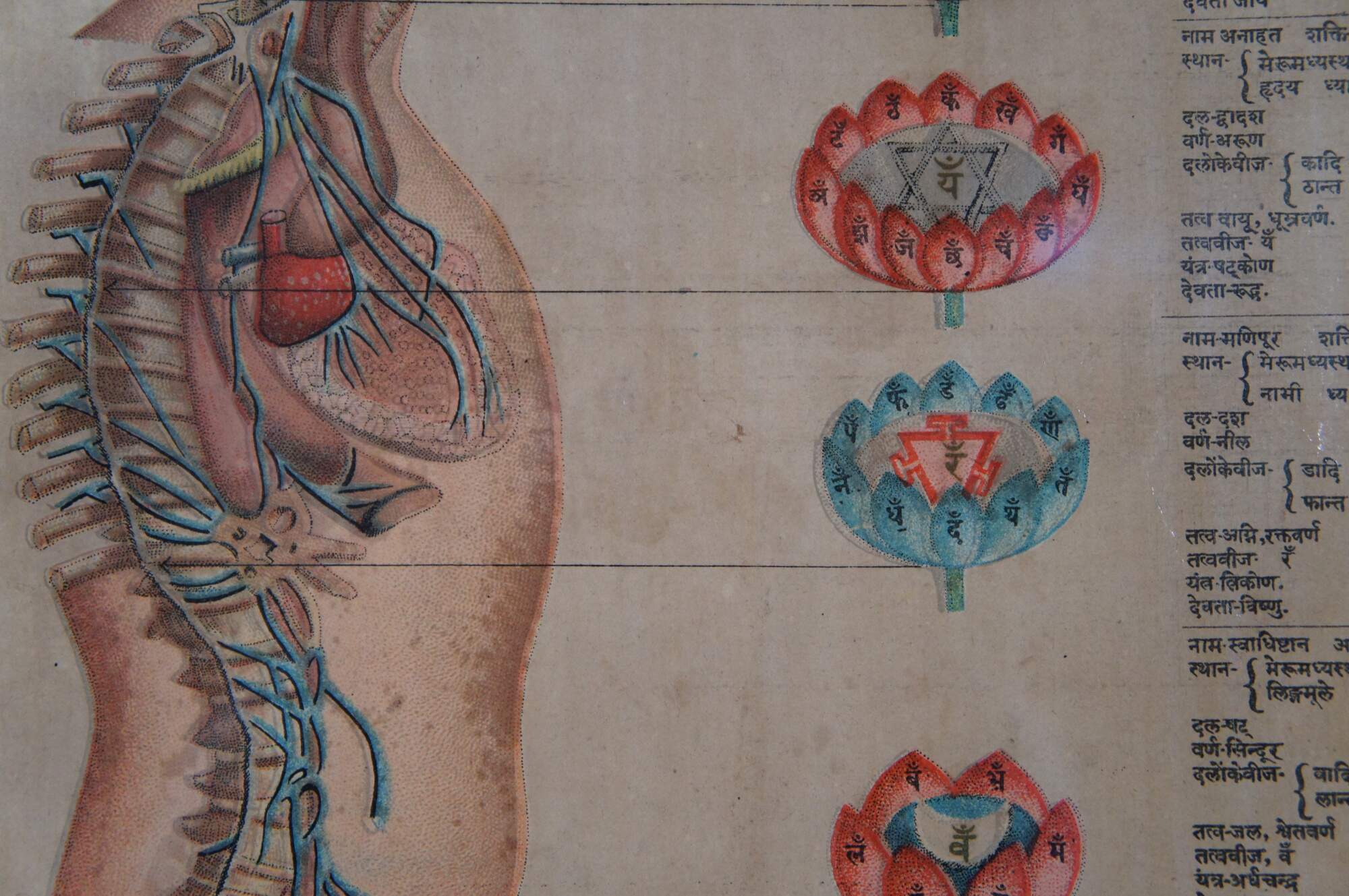 Set of three antique Hindu / Indian anatomical prints, emphasizing the seven chakras with Sanskrit text. Display together in a modern carved gilded yard-long frame with black edge.