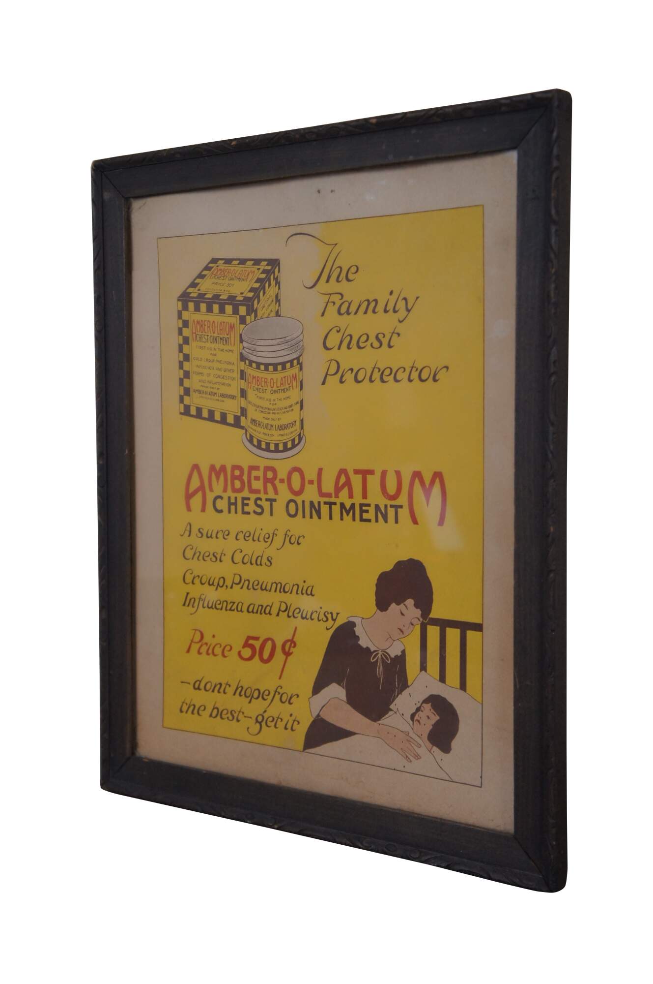 Rare antique medical print ad for Amber-o-Latum Laboratory Chest Ointment. “The Family Chest Protector – A sure relief for Chest Colds, croup, Pneumonia, Influenza, and Pleurisy. Price 50 Cents – Don’t hope for the best – Get it.”