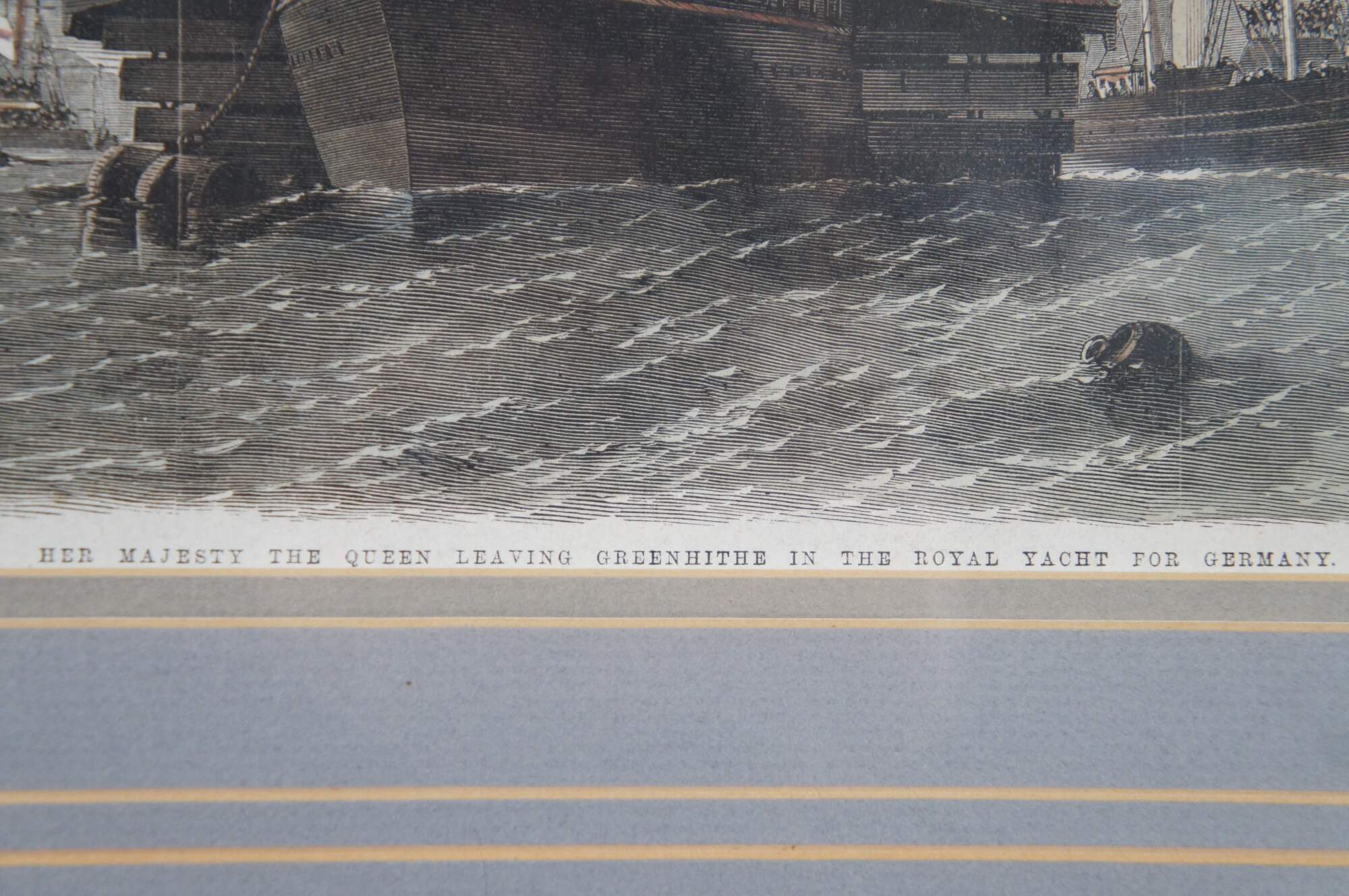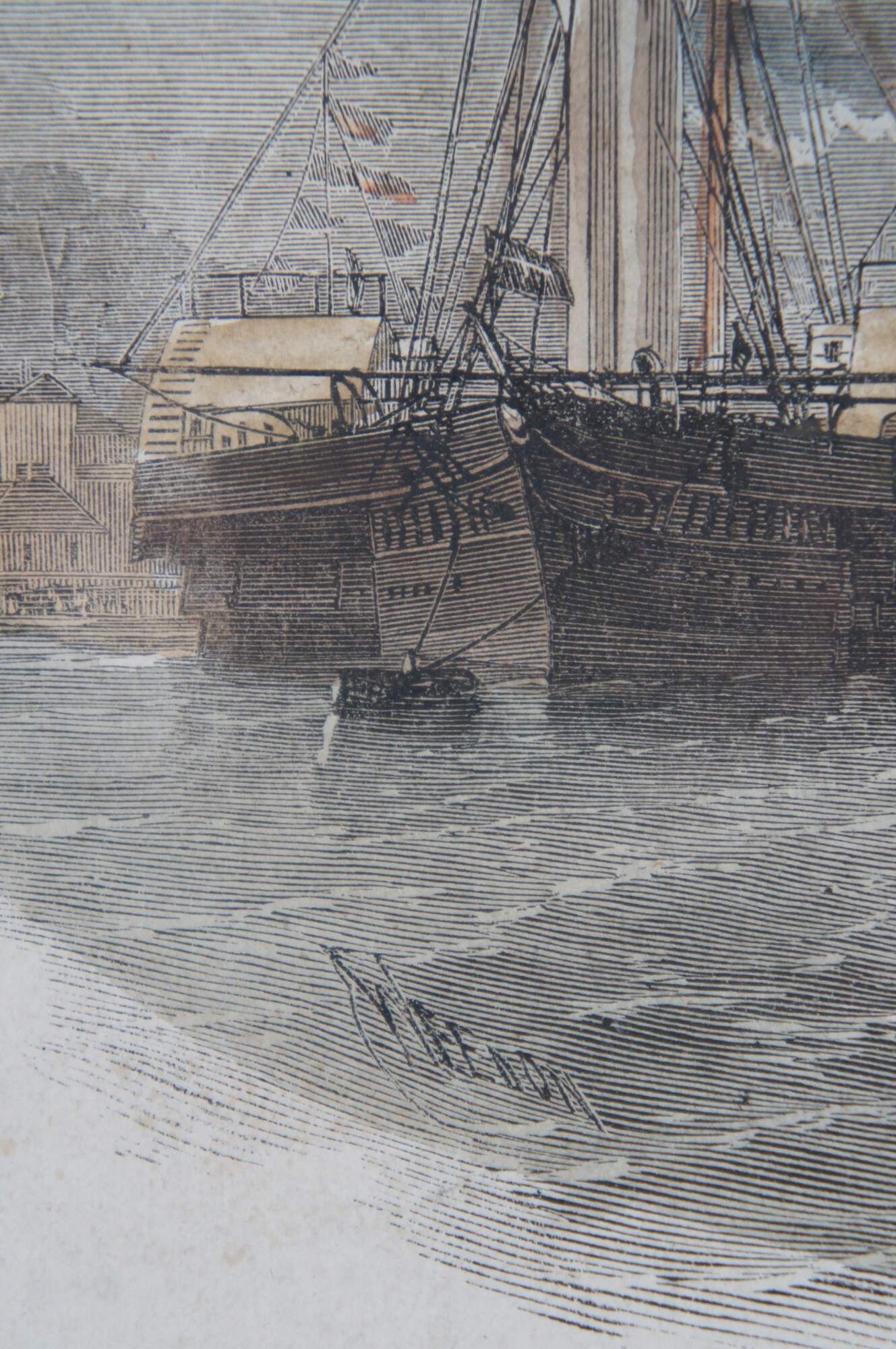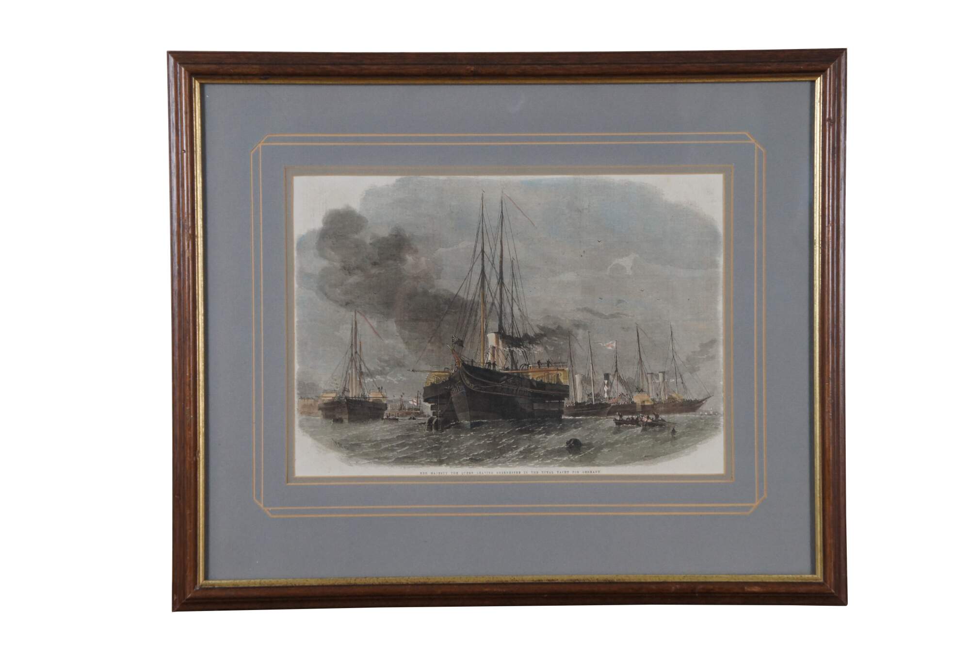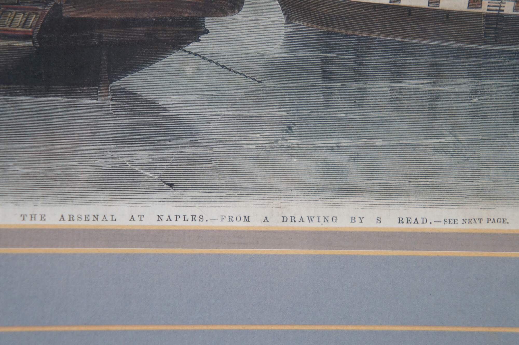 Pair of antique hand colored boat / ship / Galleon engravings depicting “The Arsenal at Naples – From a Drawing by S. Read” and “Her Majesty the Queen Leaving Greenhithe in the Royal Yacht for Germany” from The Illustrated London News, by Frederick James Smyth and Edwin Weedon.