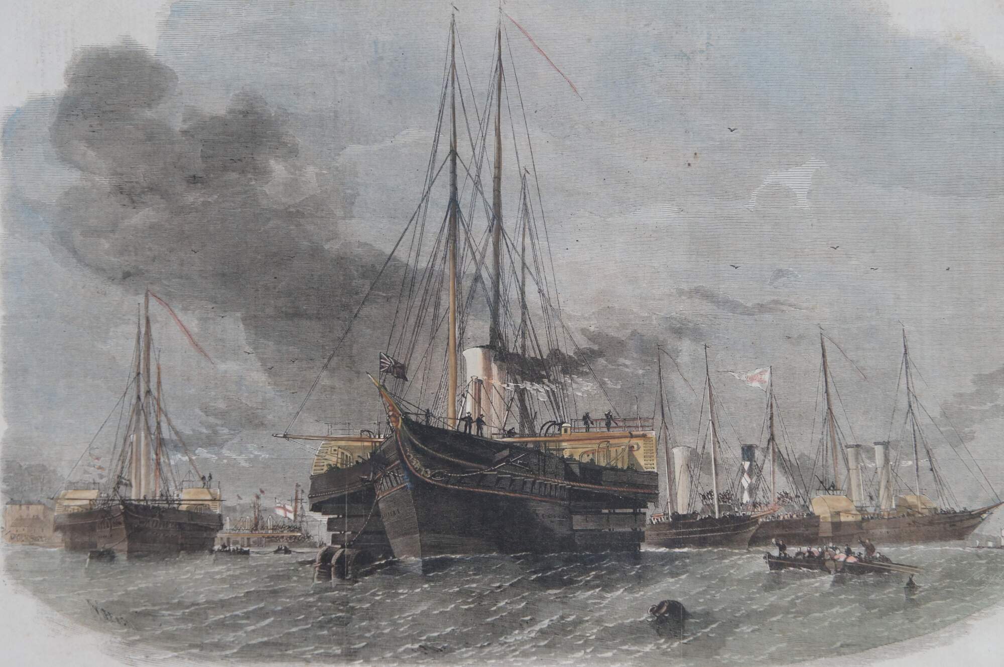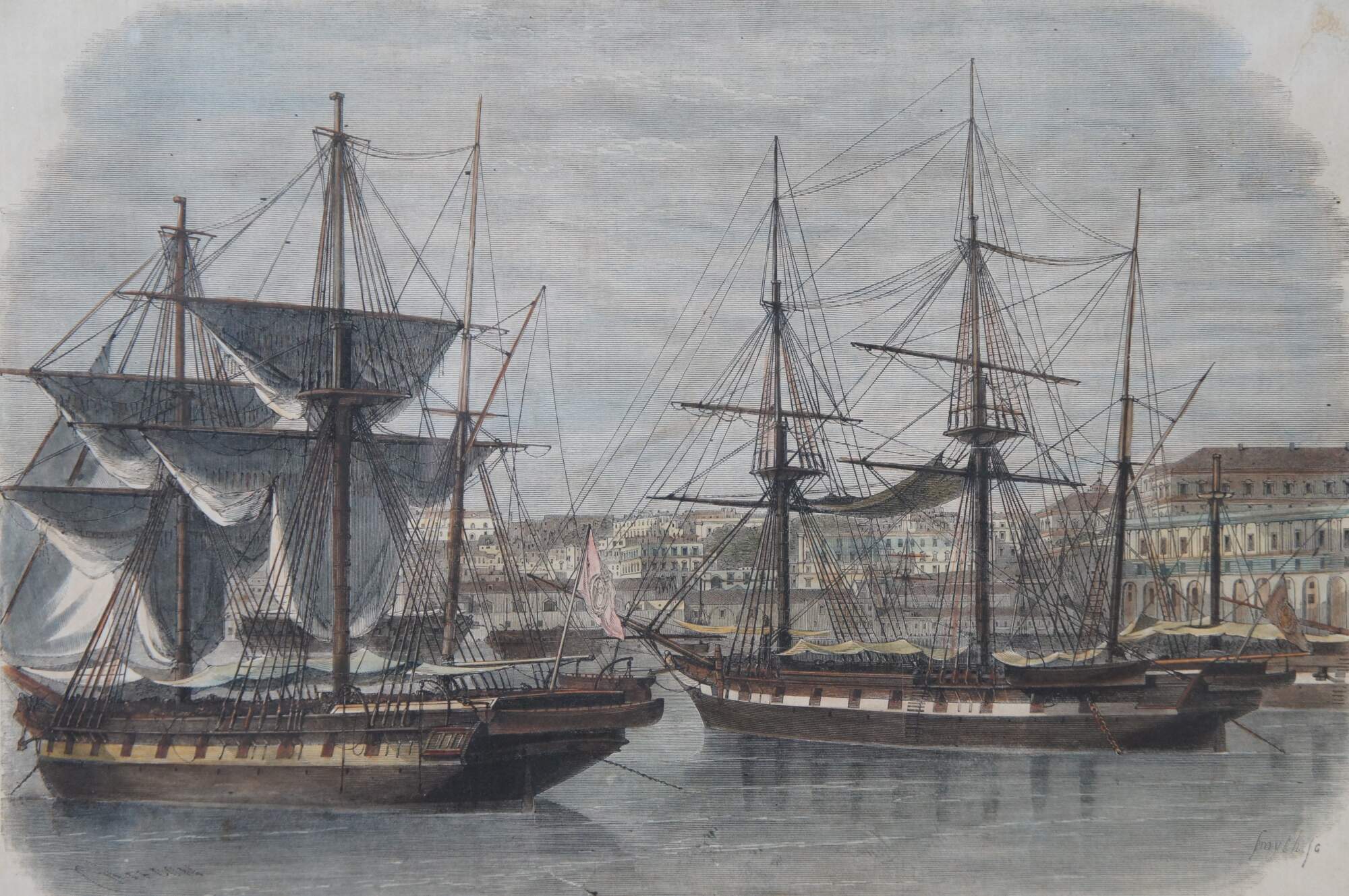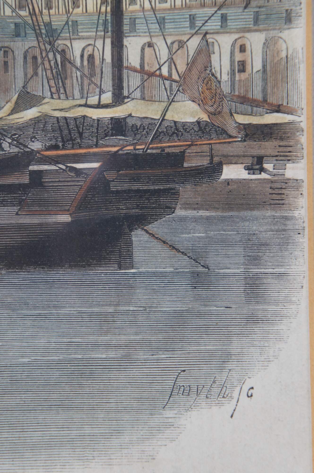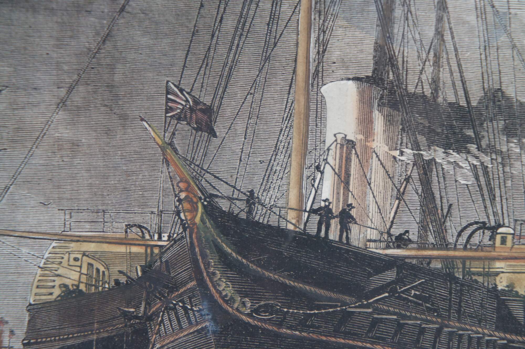 Pair of antique hand colored boat / ship / Galleon engravings depicting “The Arsenal at Naples – From a Drawing by S. Read” and “Her Majesty the Queen Leaving Greenhithe in the Royal Yacht for Germany” from The Illustrated London News, by Frederick James Smyth and Edwin Weedon.