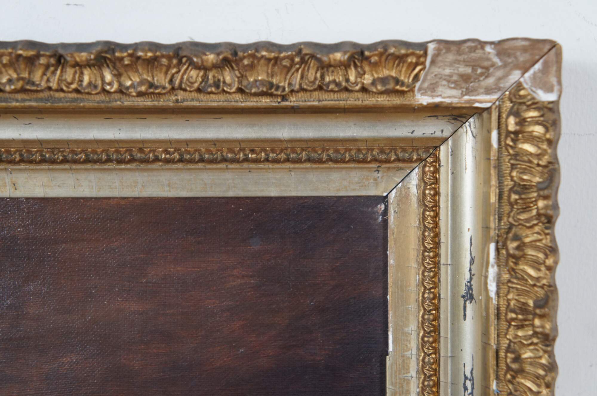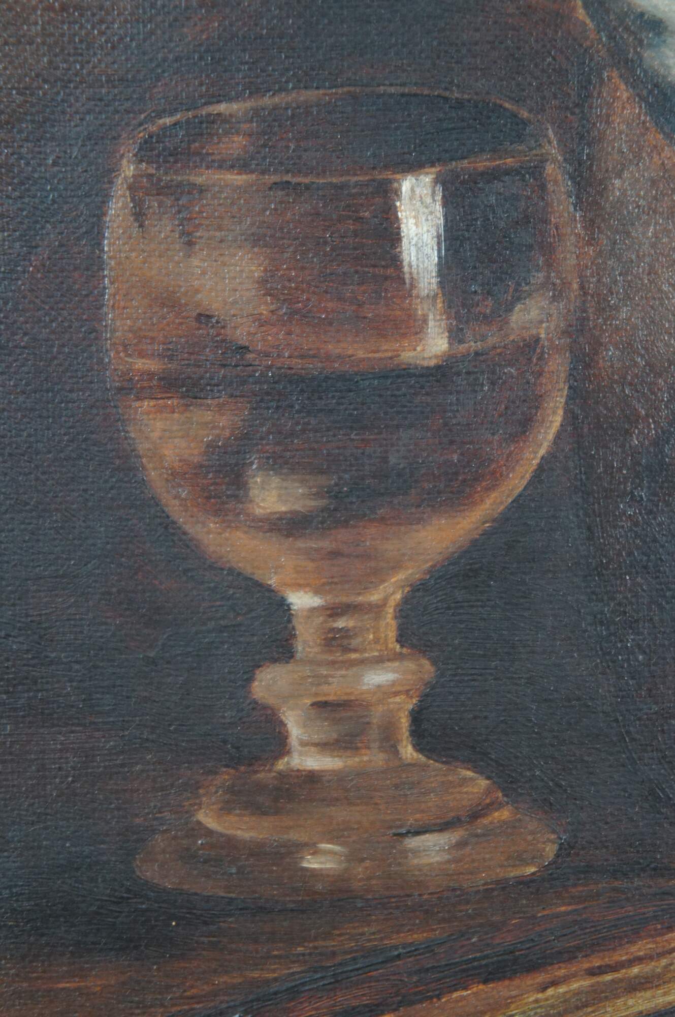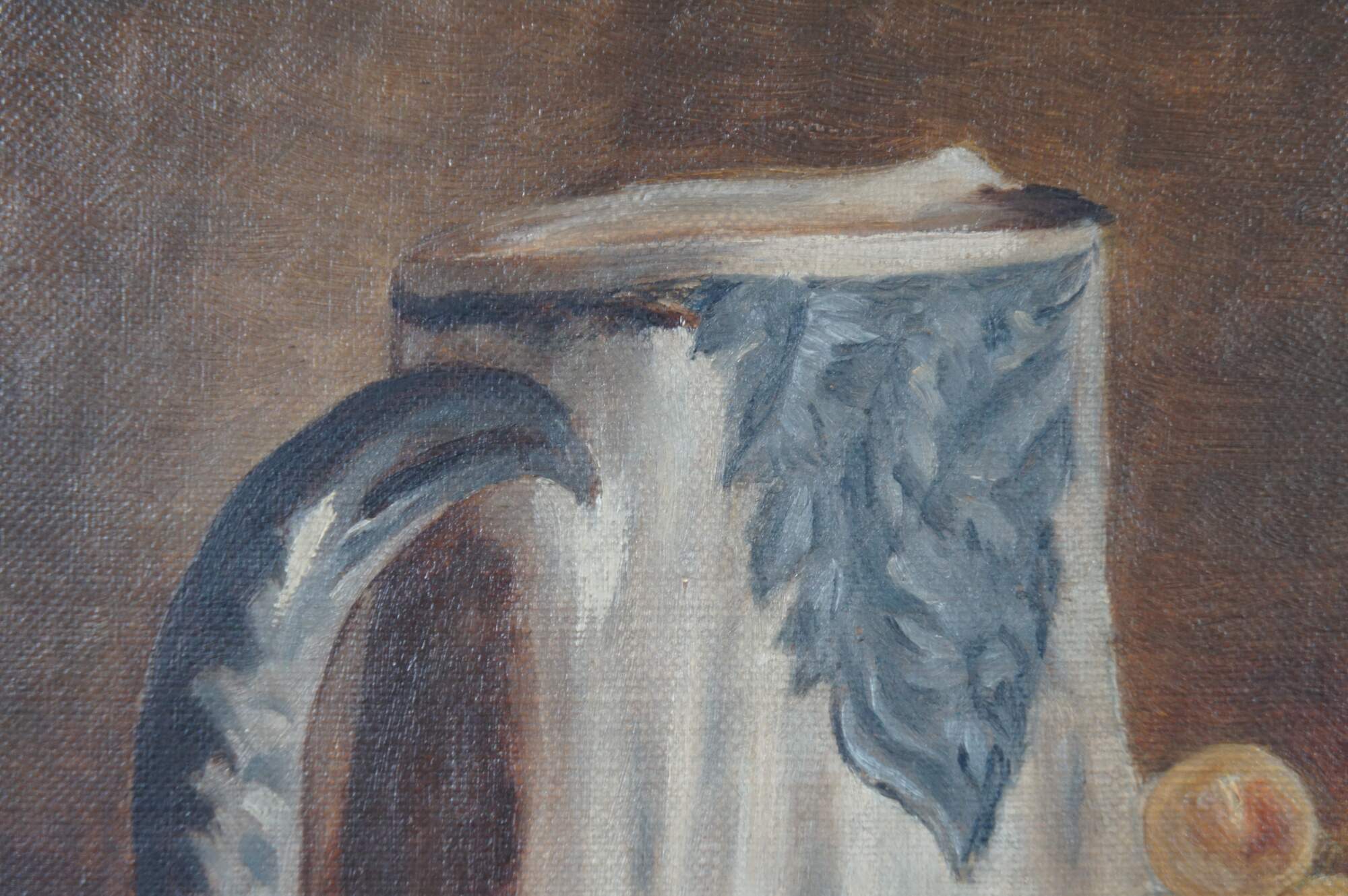 Early 20th century antique A.F. Dyer still life oil painting on canvas depicting a centerpiece bowl of fruit -peaches and grapes- in front of a glass goblet and a white and blue porcelain pitcher. From Robert H. Knight Fine Art Goods of Portland, Maine.