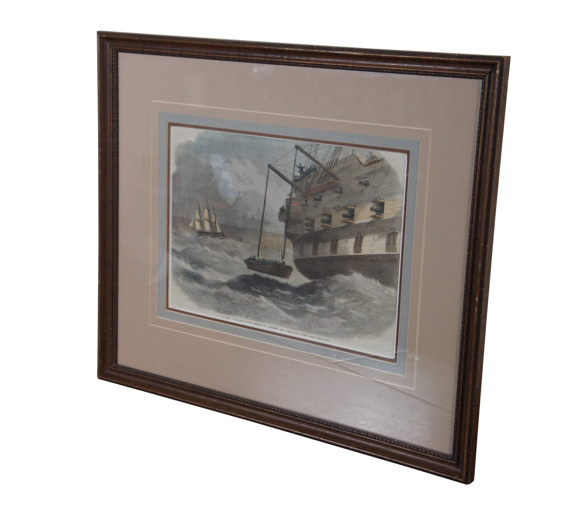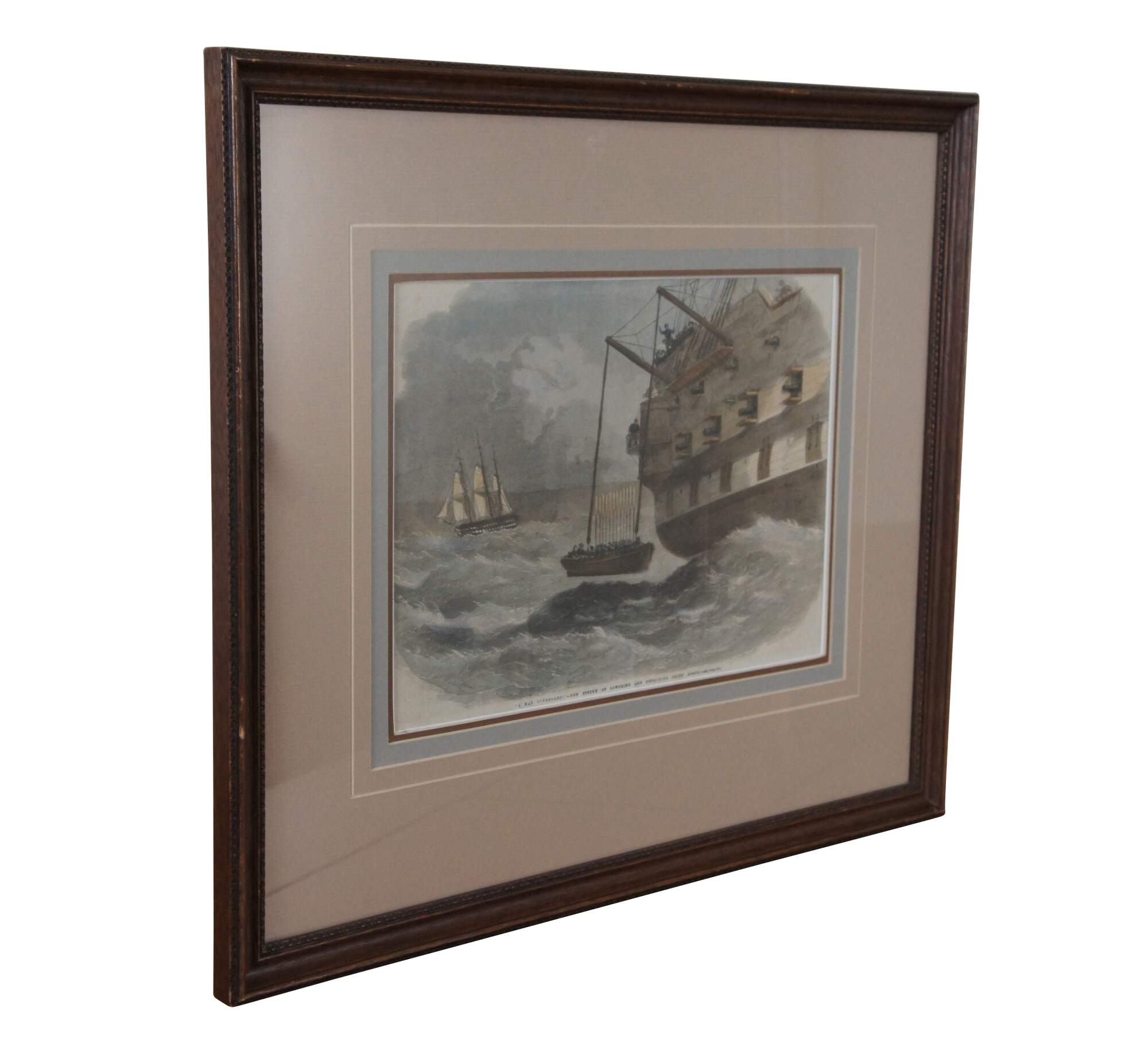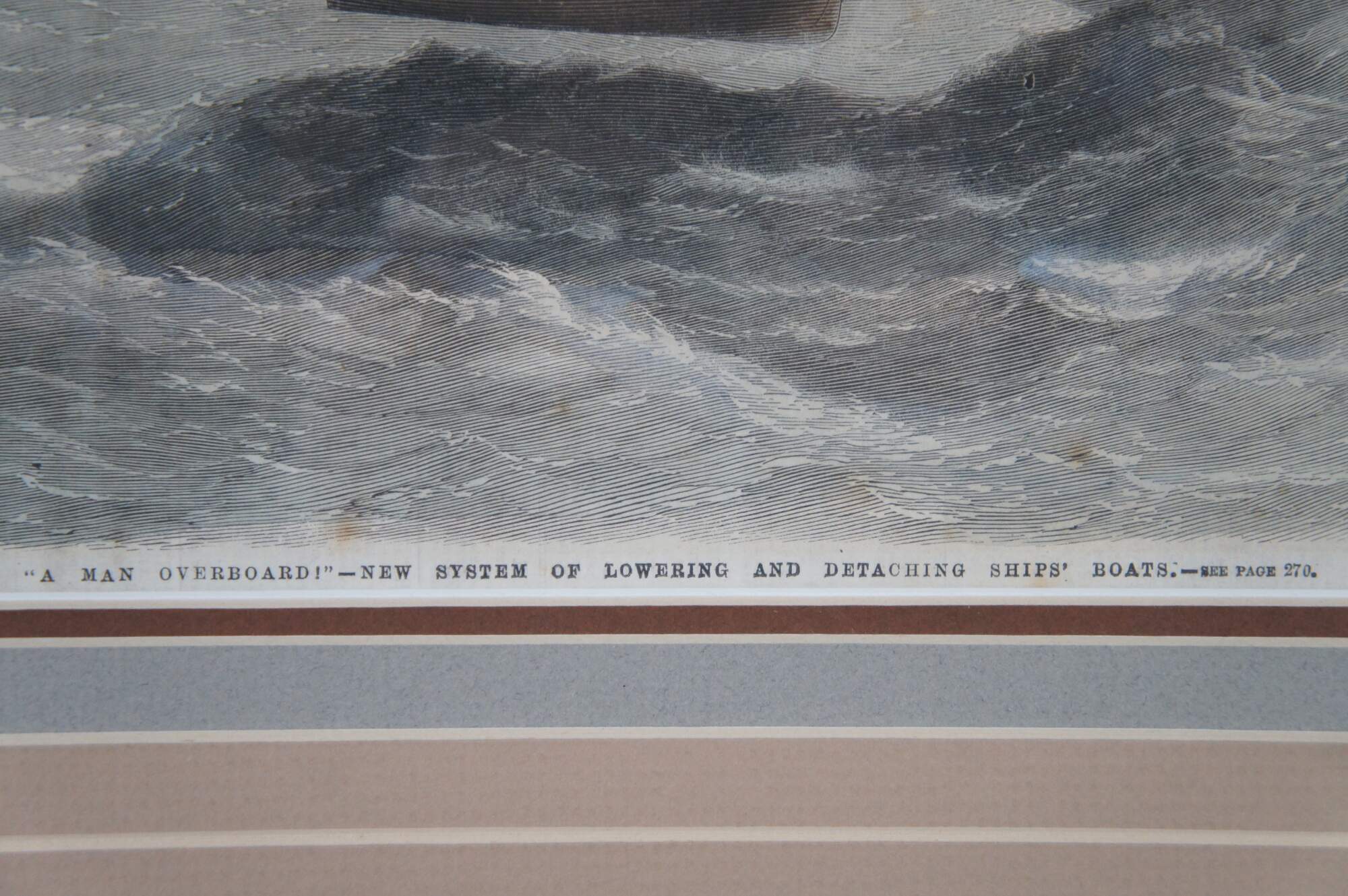 Antique hand colored engraving depicting “A Man Overboard! - New System of Lowering and Detaching Ships Boats” from The Illustrated London News, by Frederick James Smyth. Circa 1860.