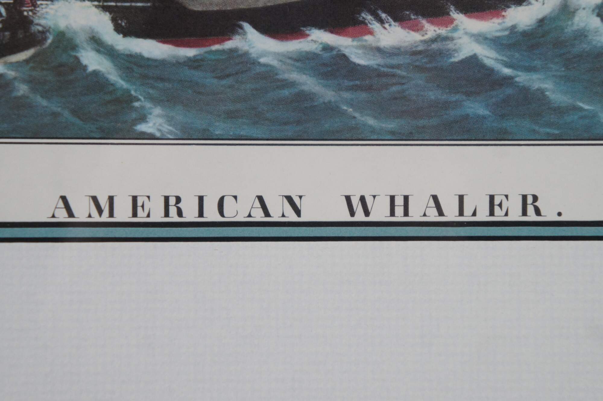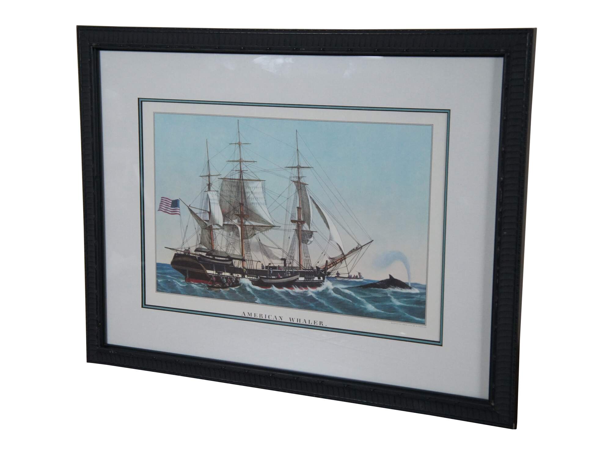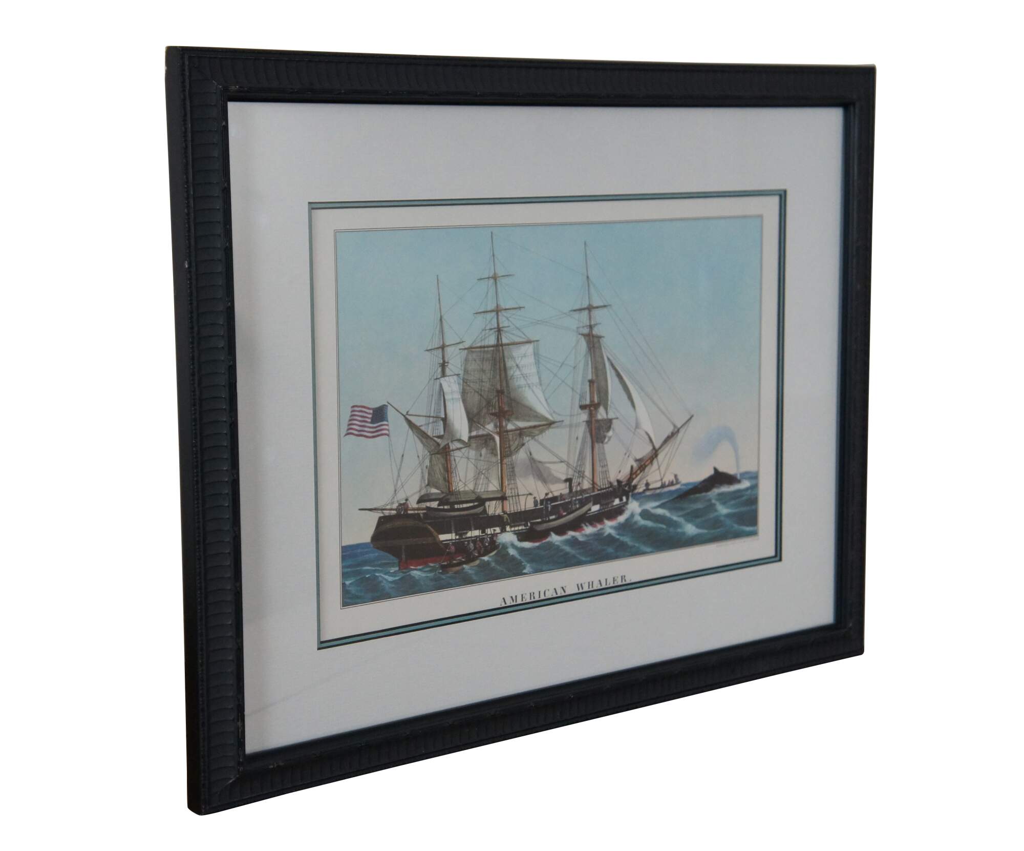 Vintage framed print of “American Whaler,” reprinted from an 1850s lithograph by Nathaniel Currier, showing an American sailing ship / galleon hunting a whale.
