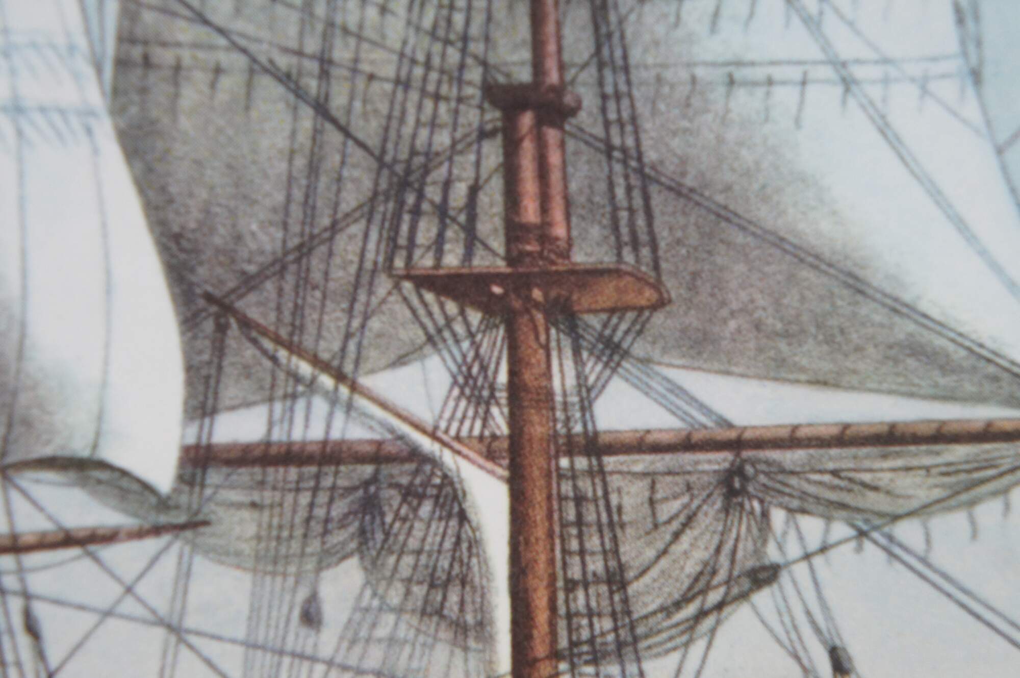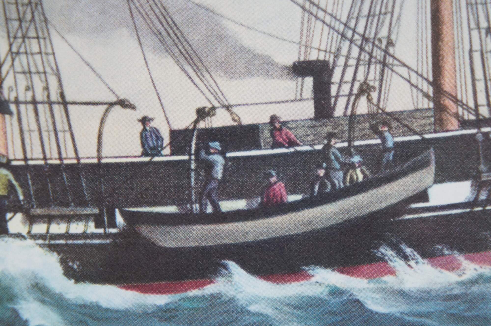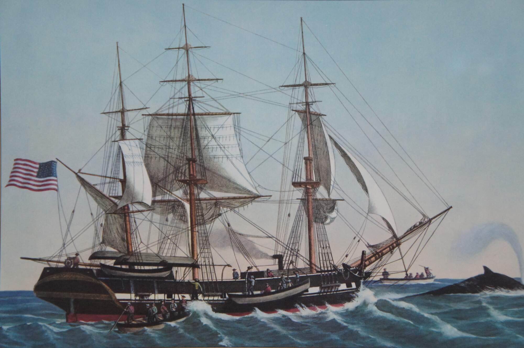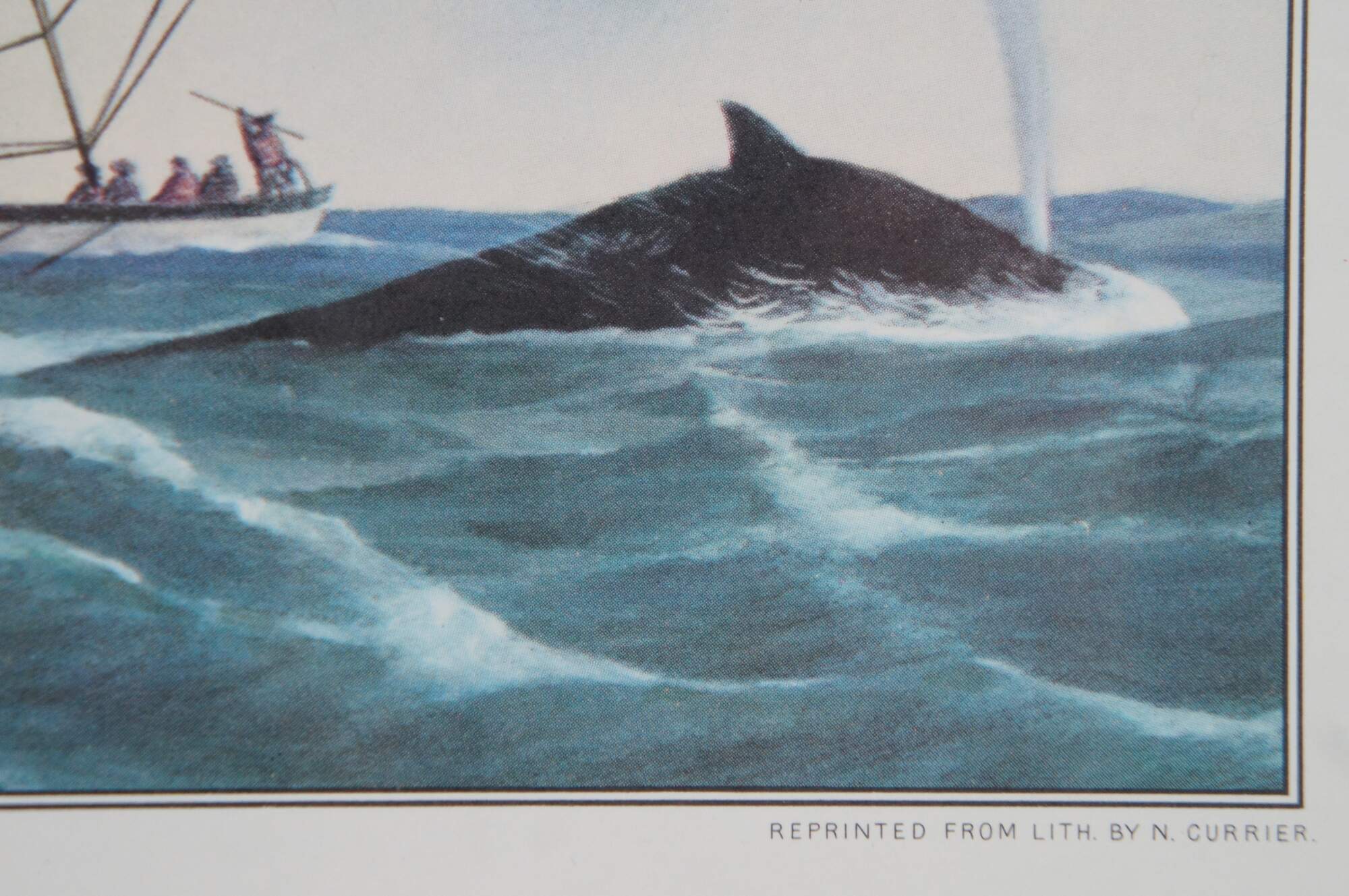 Vintage framed print of “American Whaler,” reprinted from an 1850s lithograph by Nathaniel Currier, showing an American sailing ship / galleon hunting a whale.
