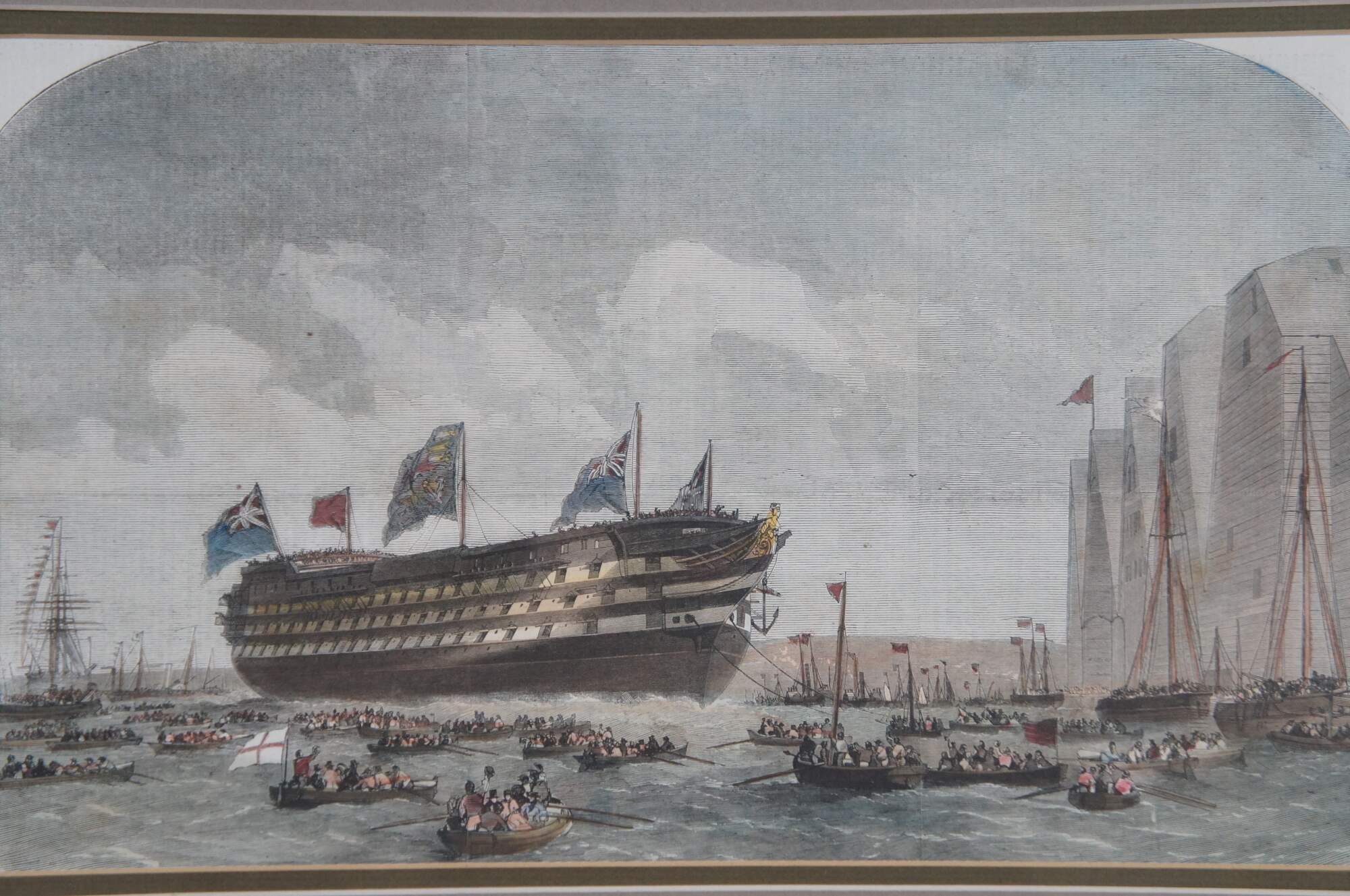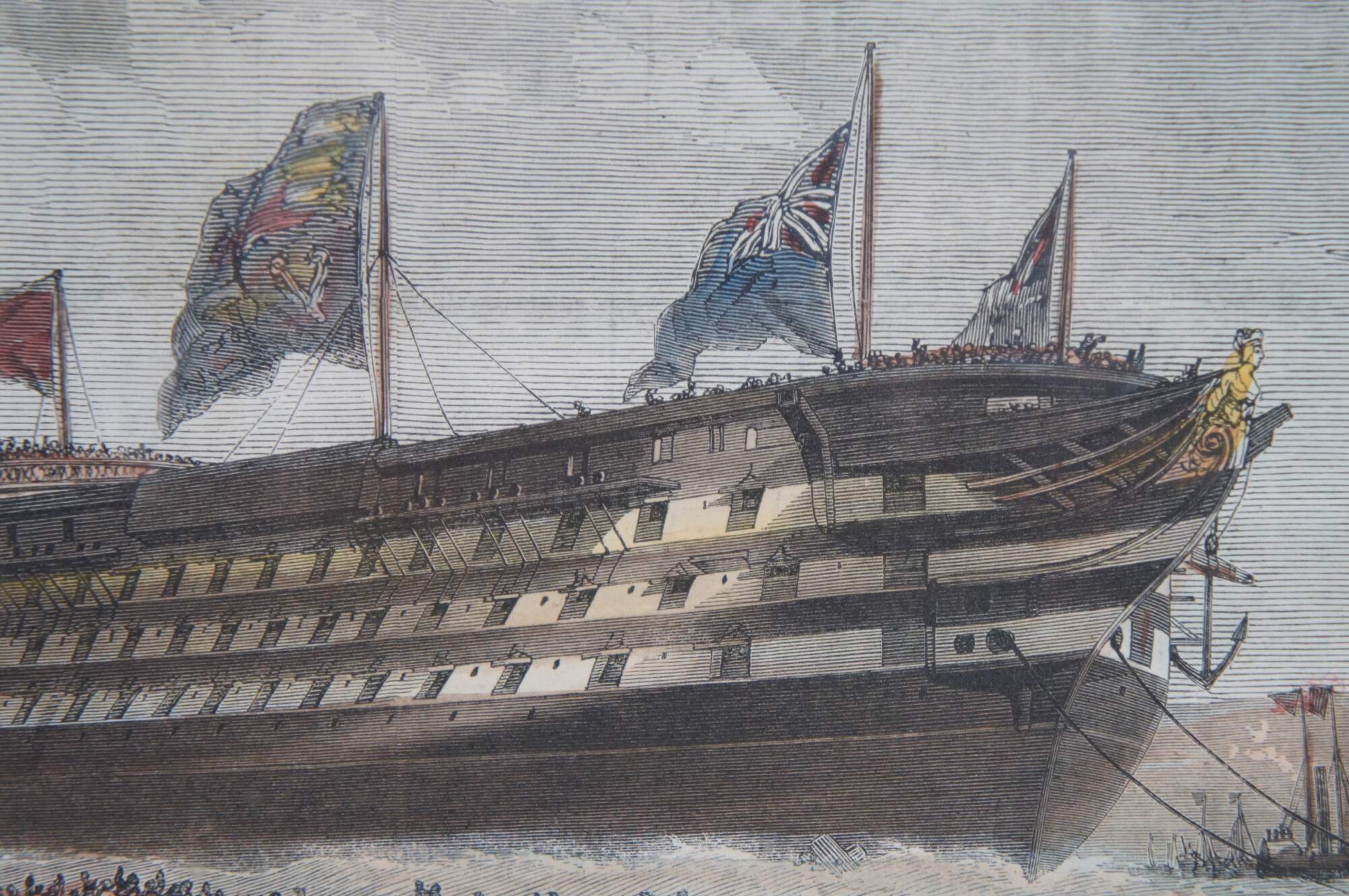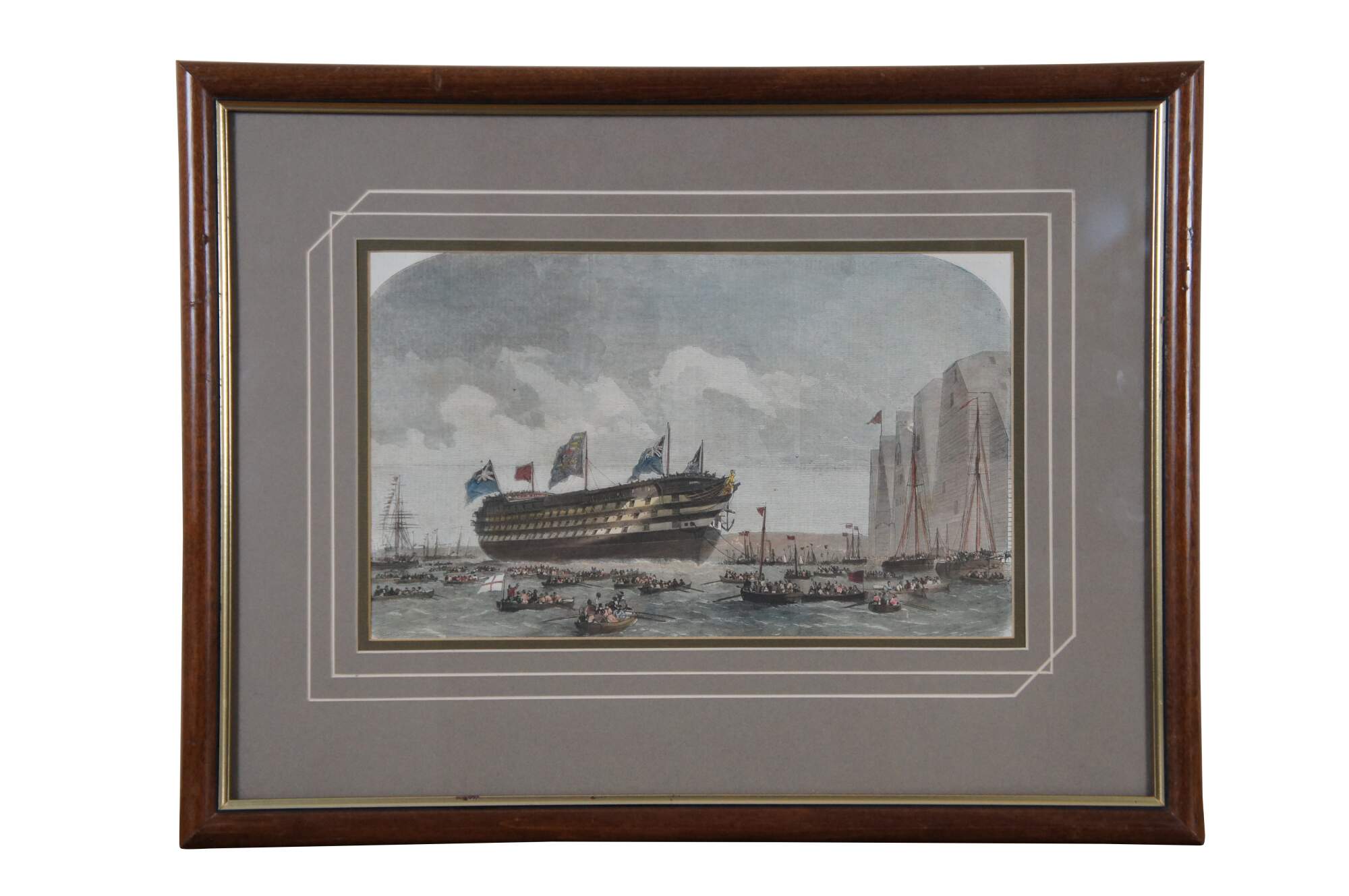 Antique hand colored engravings depicting “Mr. S.J. Mackie’s Channel Passage Steamer” circa 1872, and “The Launch of HM Screw Steam Ship of War the Royal Sovereign, 131 Guns, at Portsmouth,” from The Illustrated London News, by Edwin Weedon. Circa 1857. Illustrated from a Drawing By Cuthbert Bede.