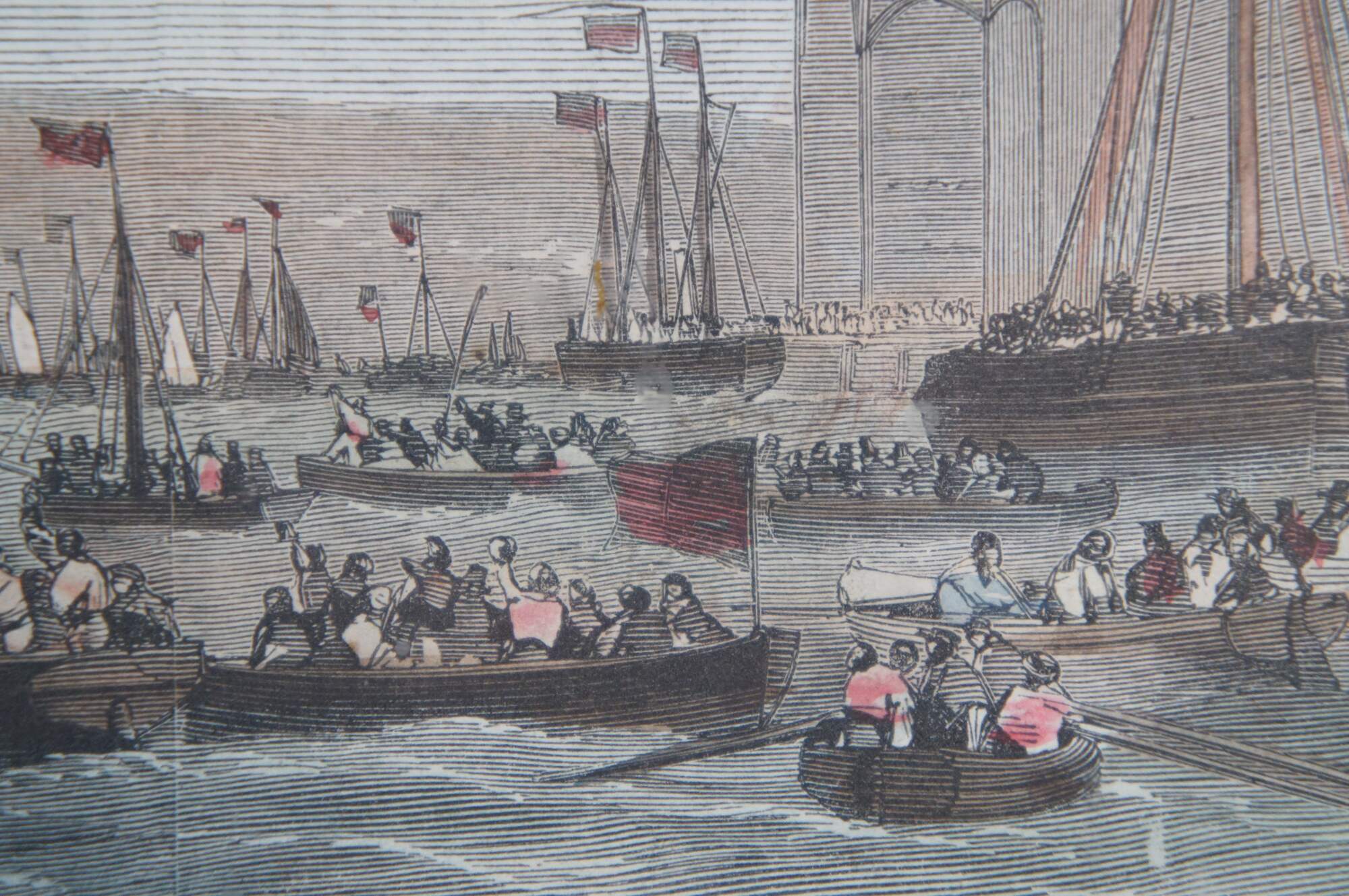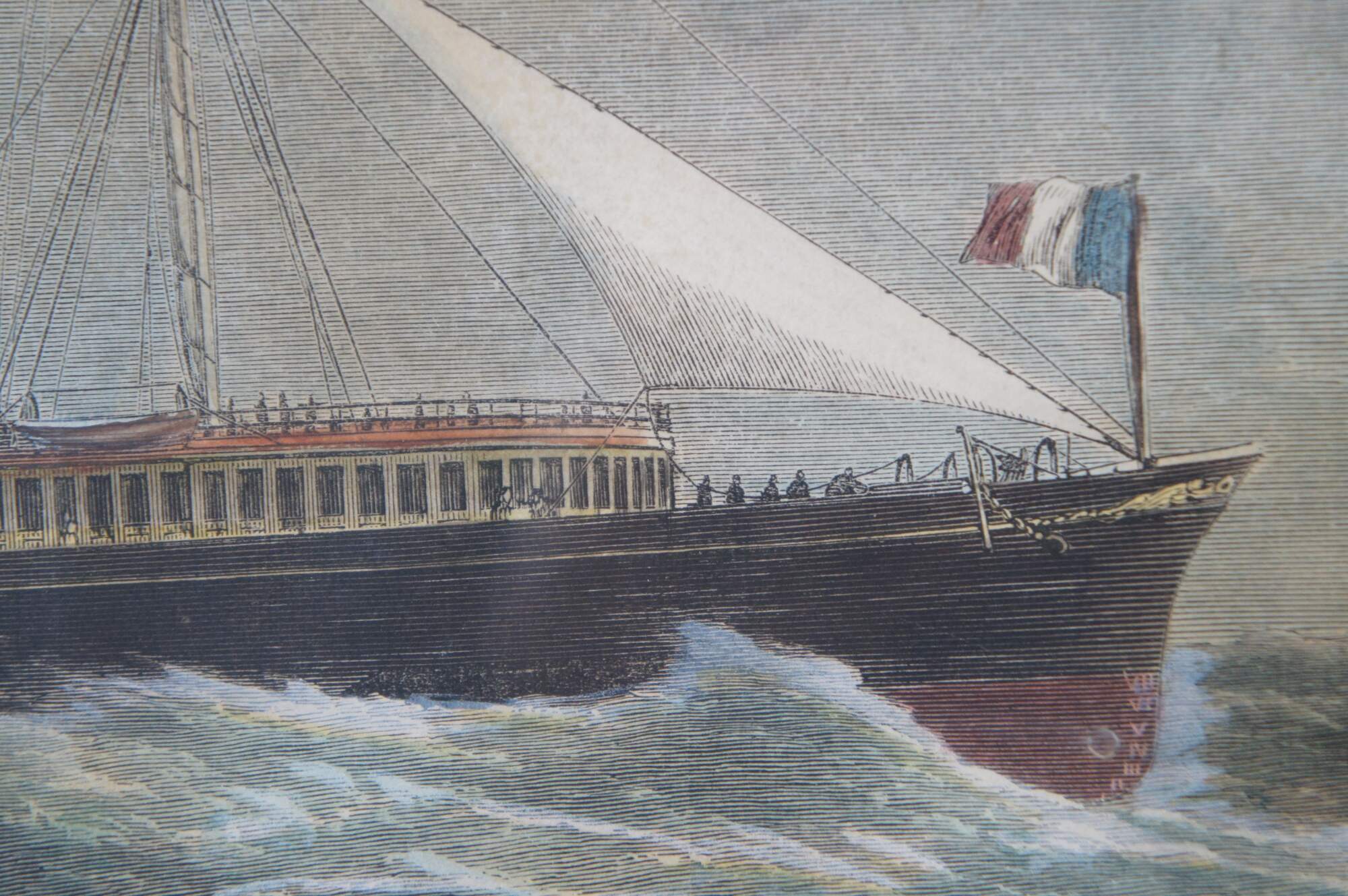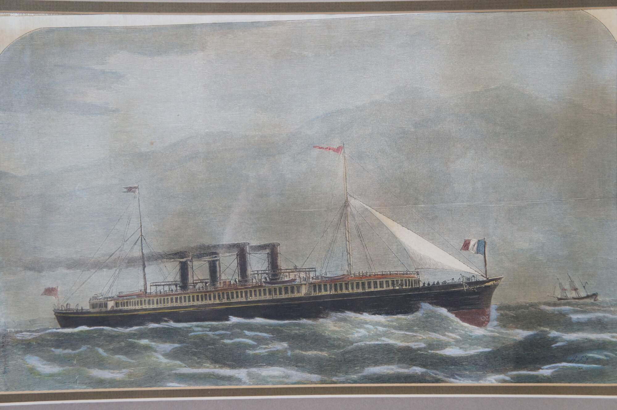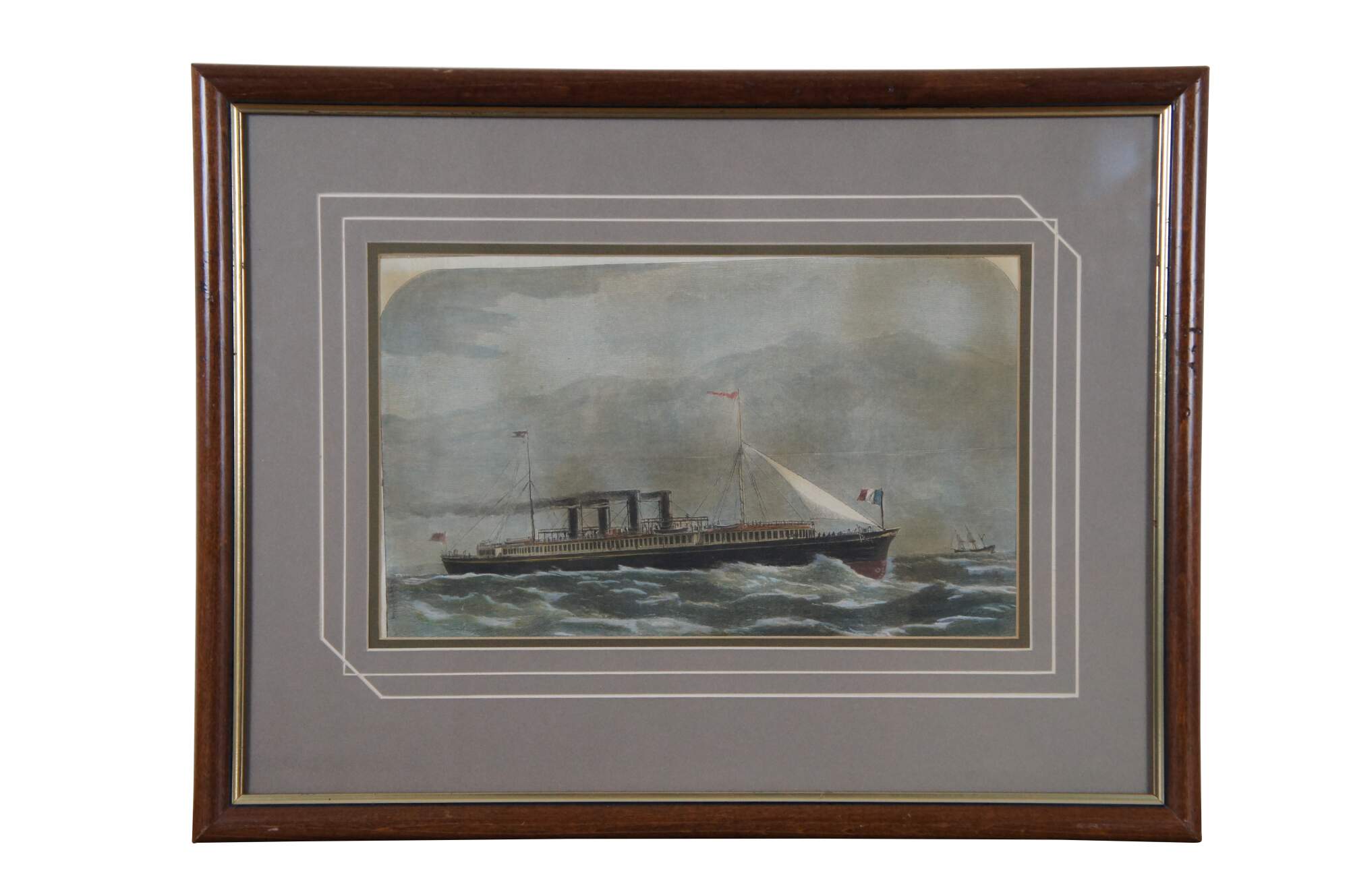 Antique hand colored engravings depicting “Mr. S.J. Mackie’s Channel Passage Steamer” circa 1872, and “The Launch of HM Screw Steam Ship of War the Royal Sovereign, 131 Guns, at Portsmouth,” from The Illustrated London News, by Edwin Weedon. Circa 1857. Illustrated from a Drawing By Cuthbert Bede.