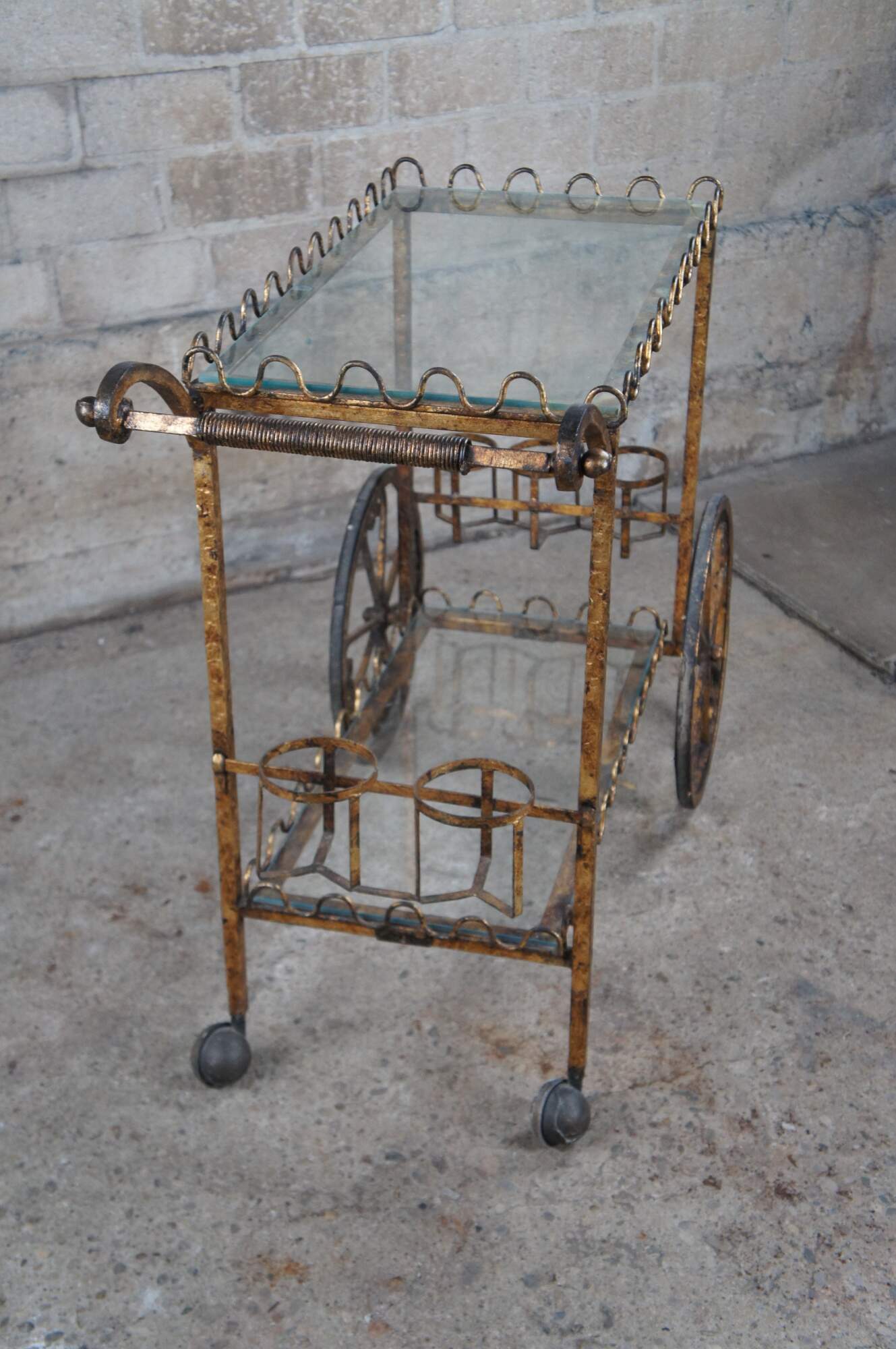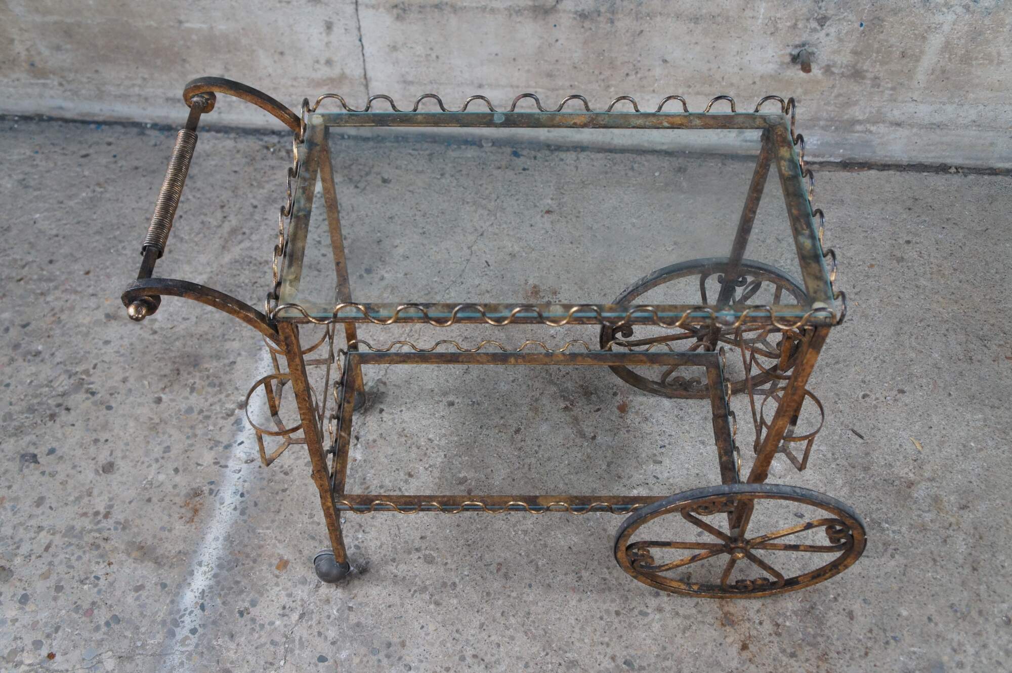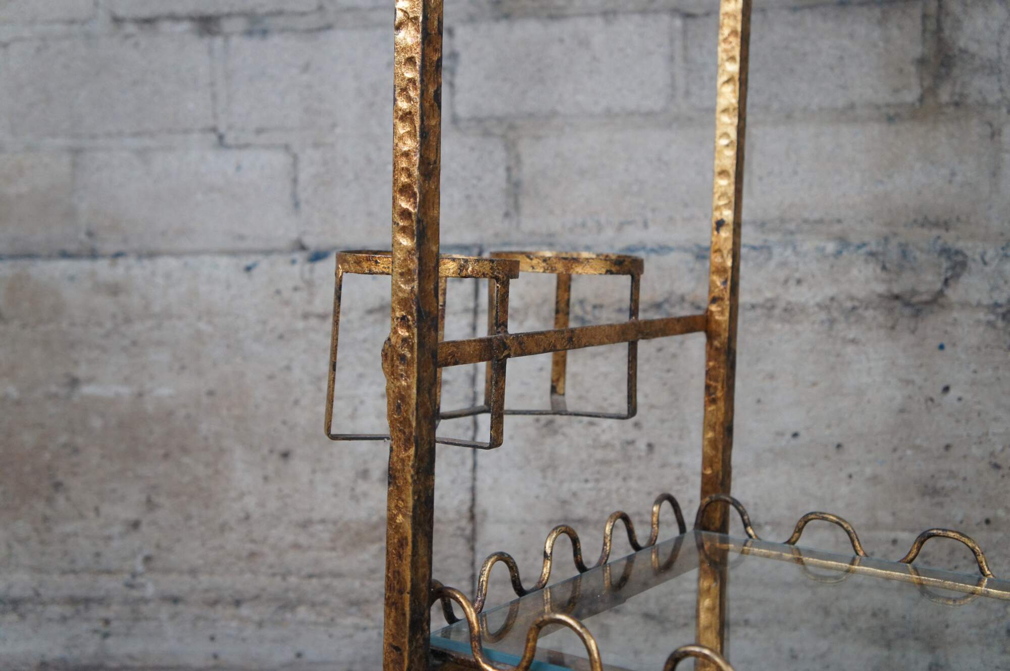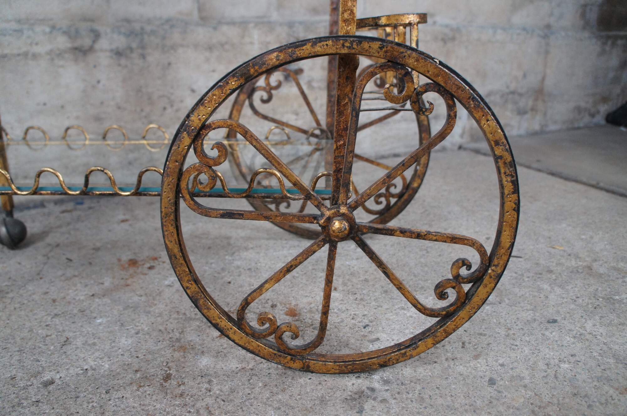 Vintage hammered iron & glass Italian Neoclassical / Regency bar cart, circa 1970s. Features two glass surfaces, a scrolling gallery, 5 bottle holders and scrolled wheels.