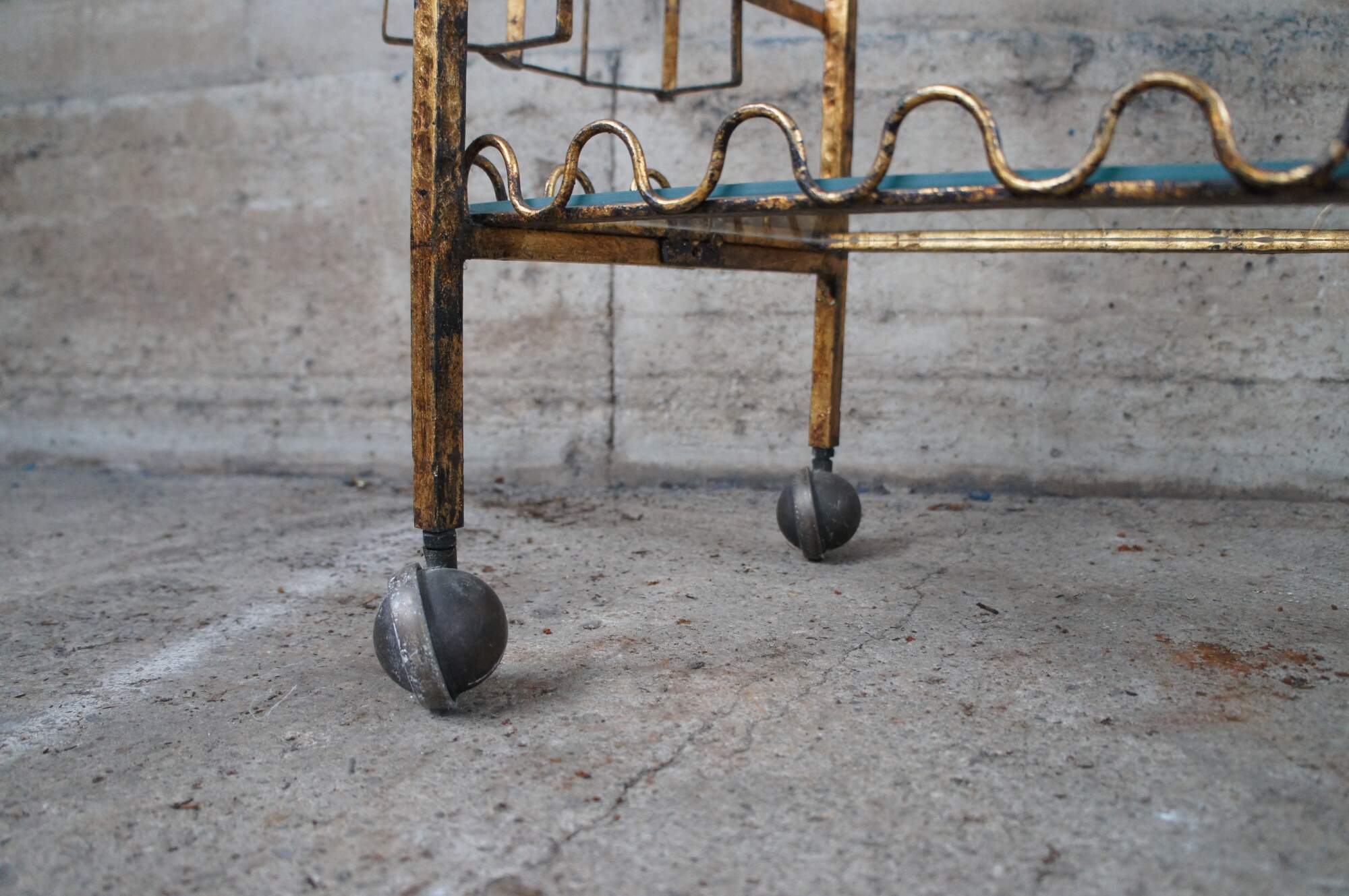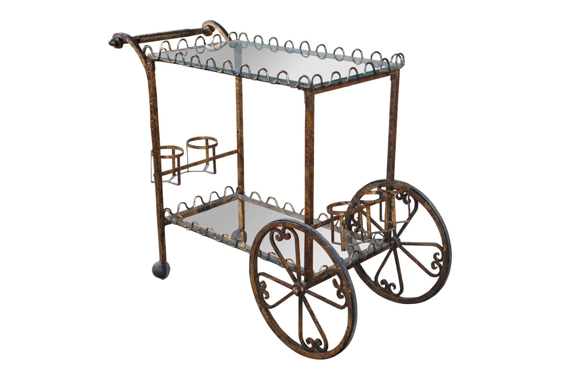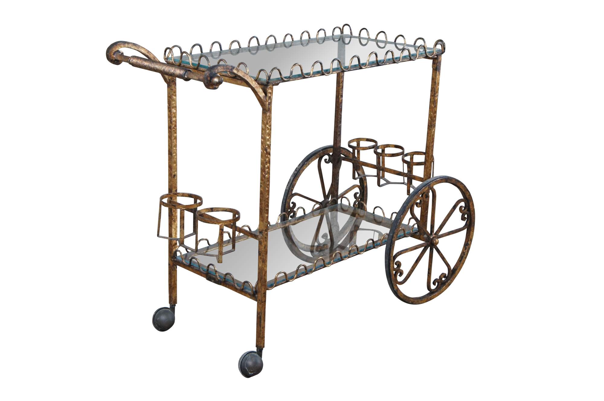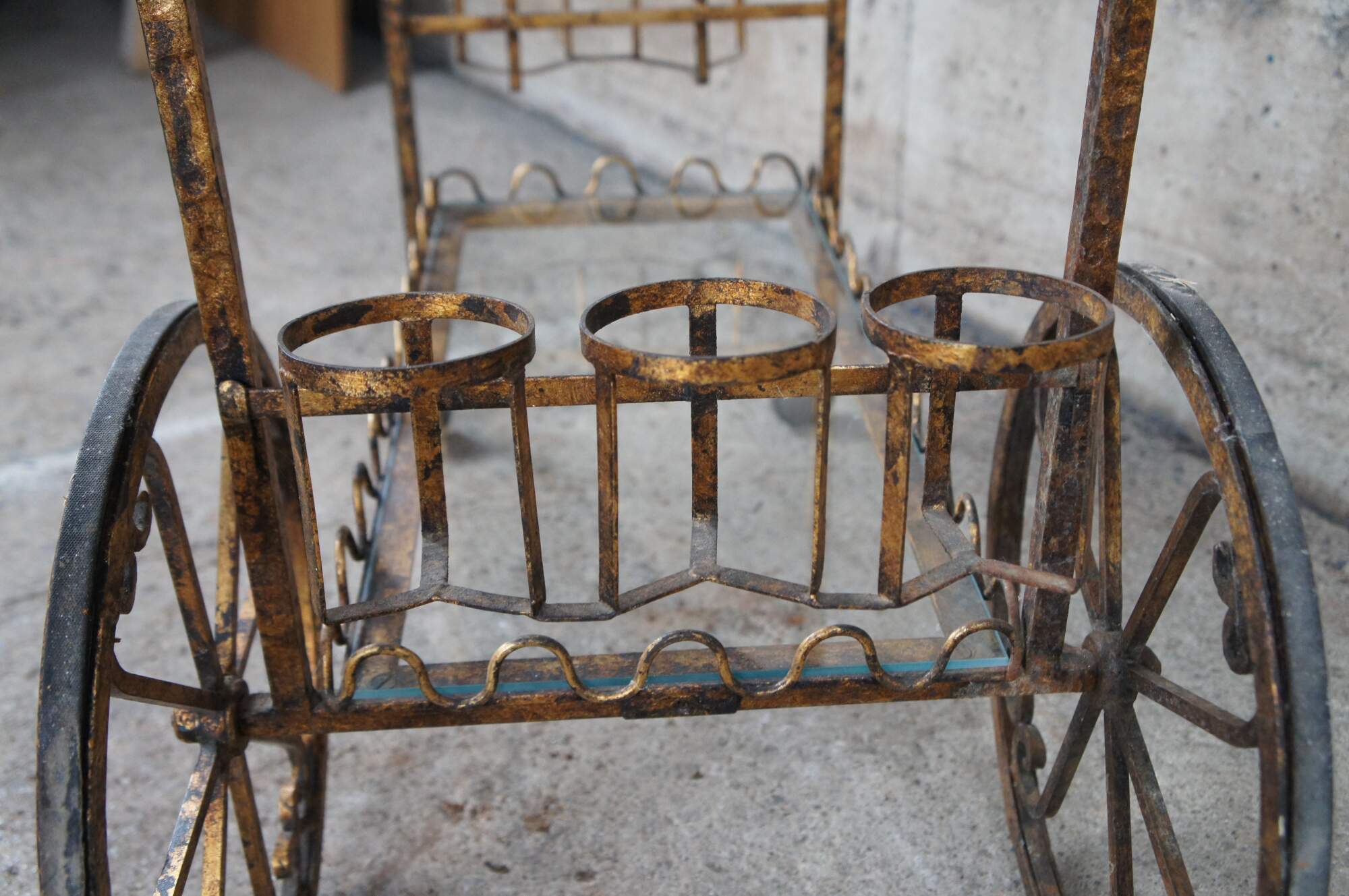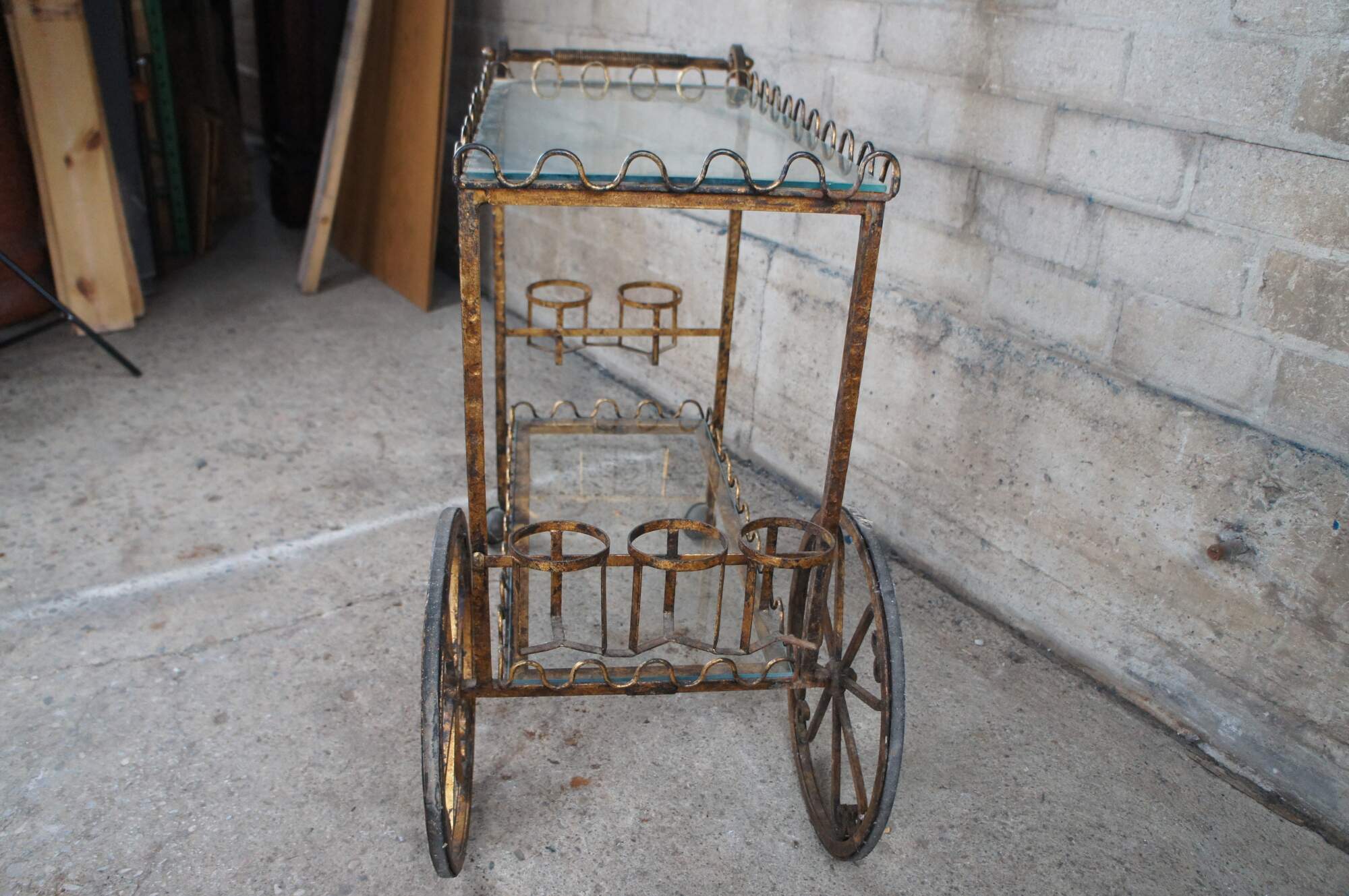 Vintage hammered iron & glass Italian Neoclassical / Regency bar cart, circa 1970s. Features two glass surfaces, a scrolling gallery, 5 bottle holders and scrolled wheels.