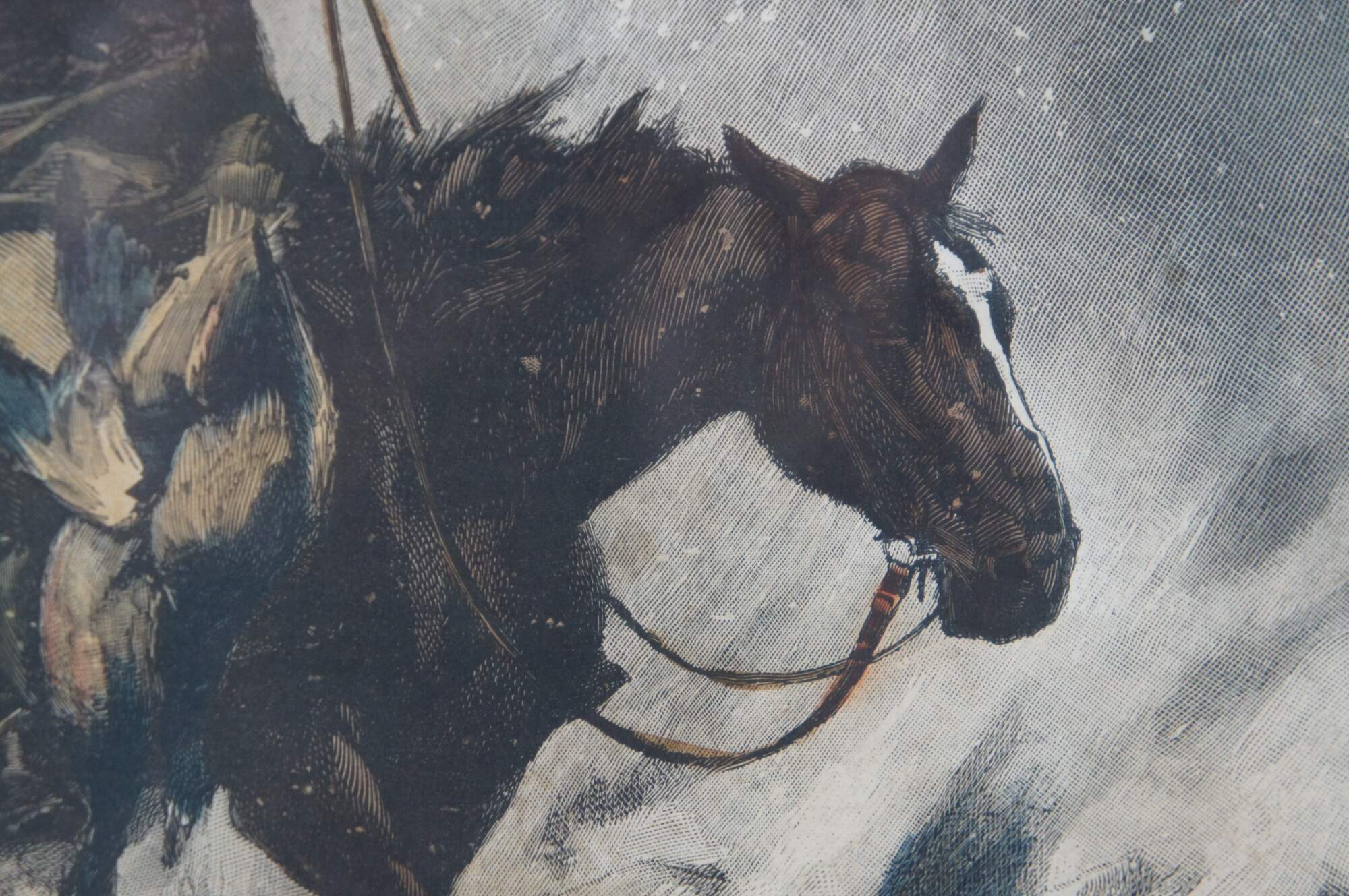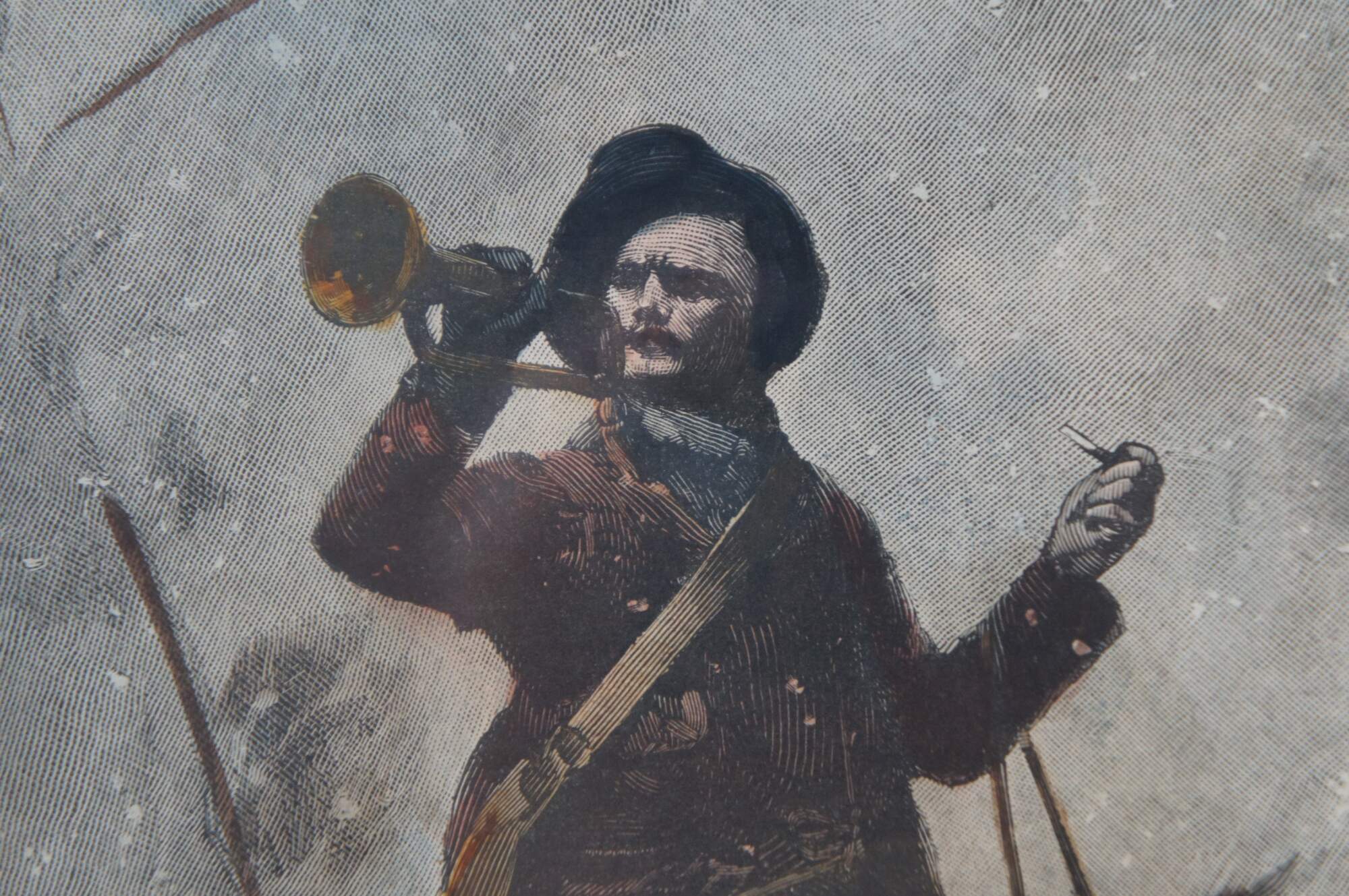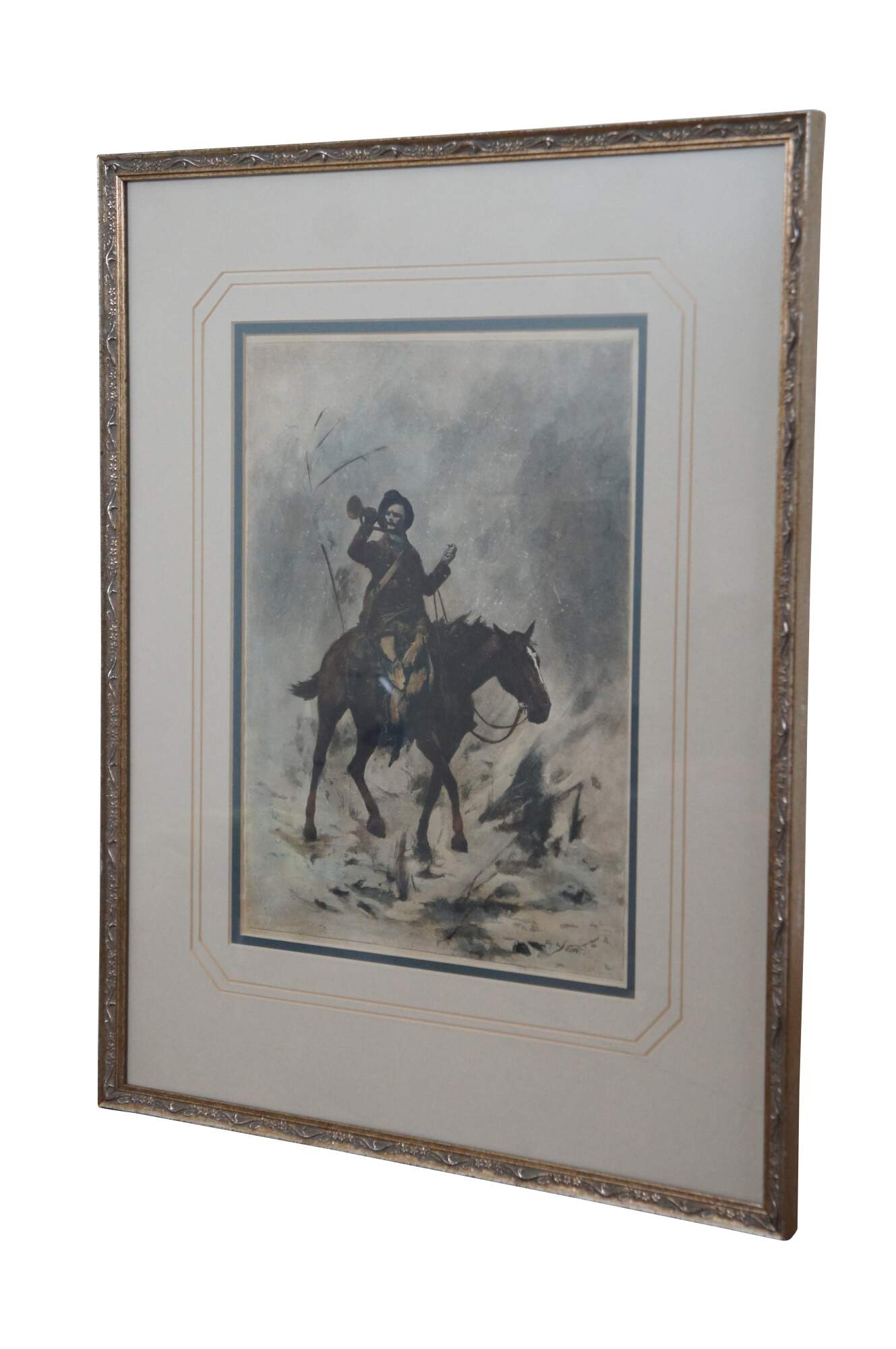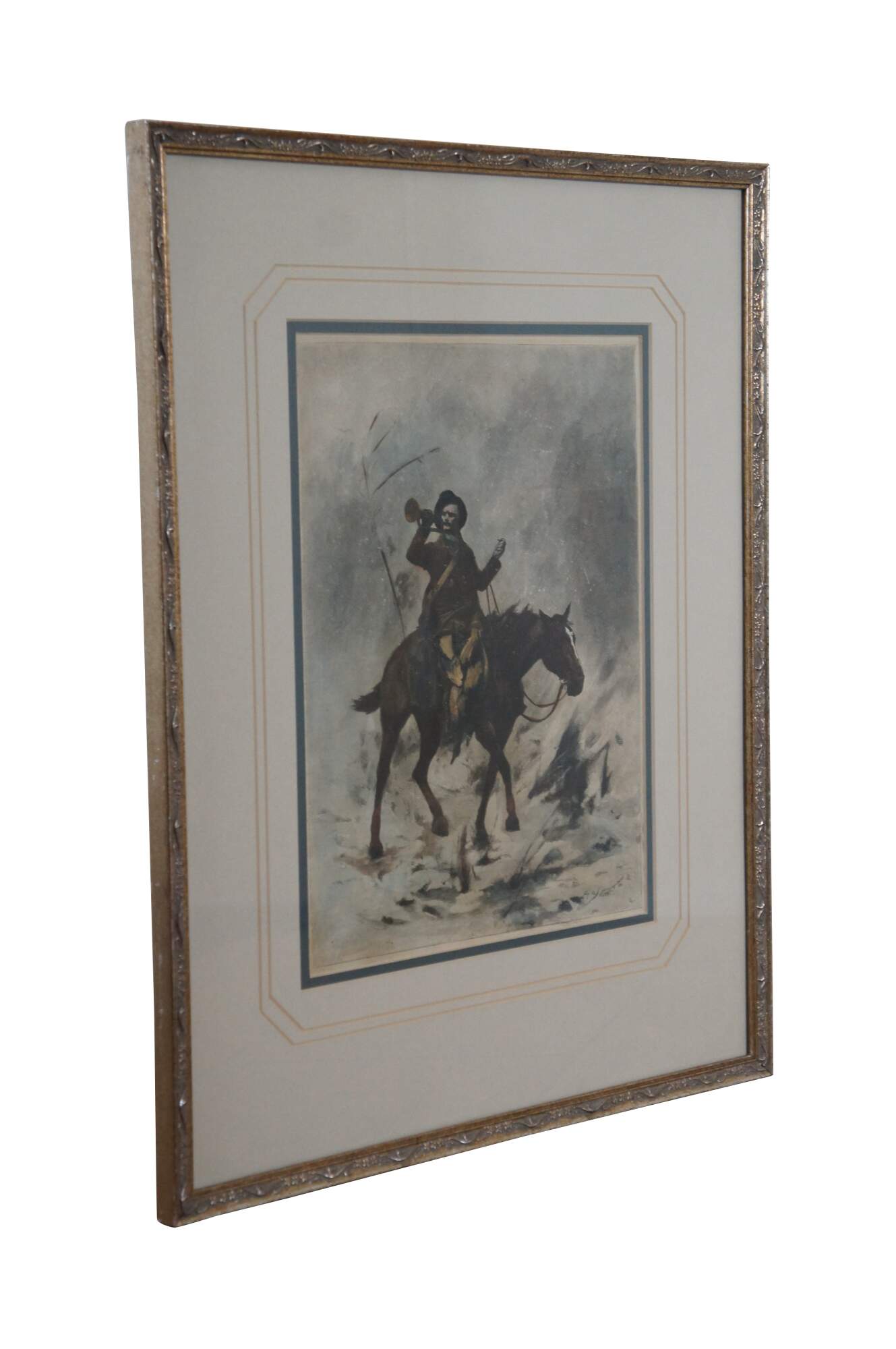 Framed antique hand colored engraving depicting "The Country Postman" by George L. Seymour circa 1884, showing the titular country postman with a bugle raised to his lips, riding a horse through winter snow. Displayed in a distressed, gilded floral frame.