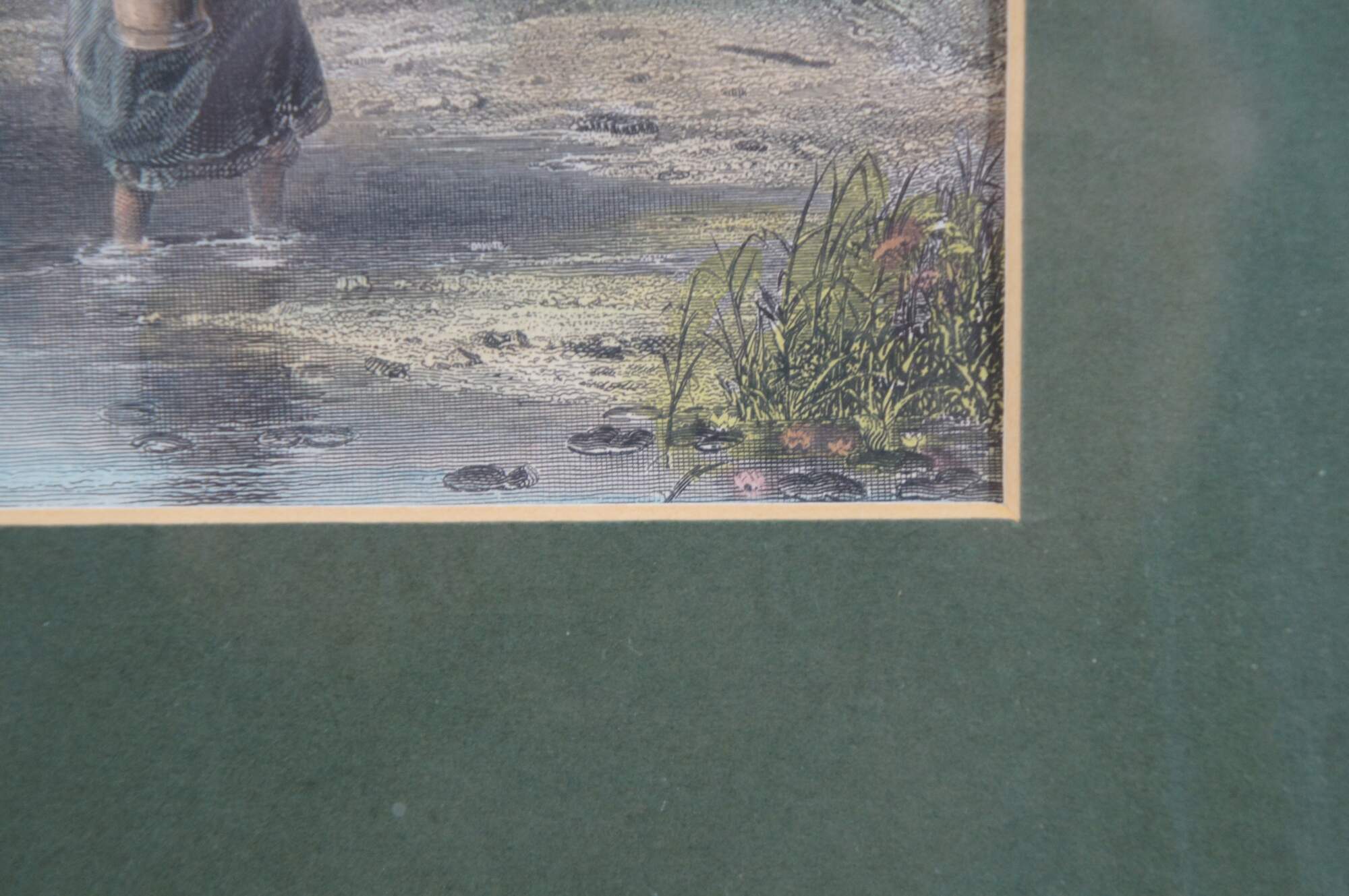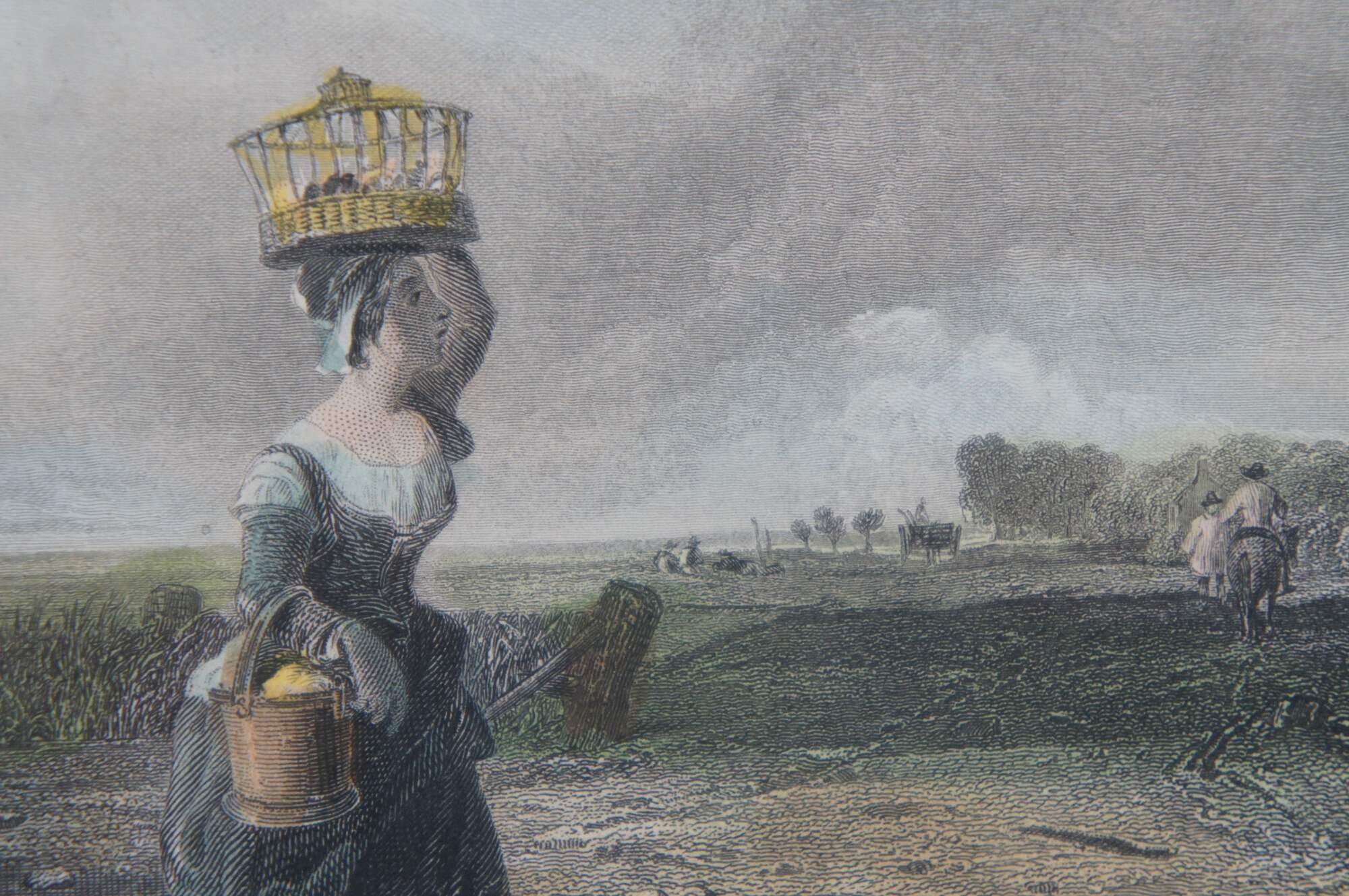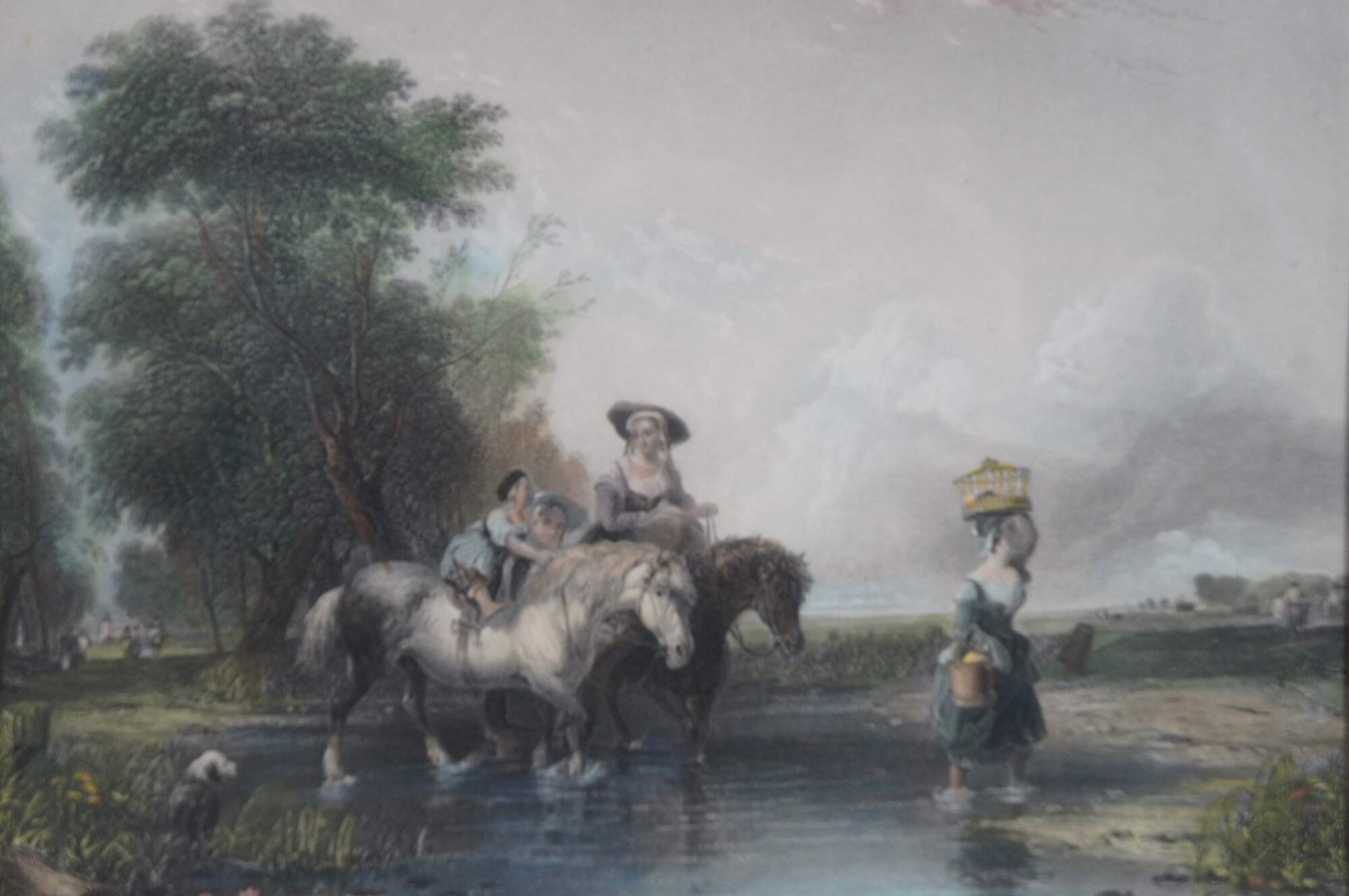 Framed late 19th century hand colored engraving titled "Returning from Market" after Sir Augustus Wall Callcott (original painting first exhibited in 1834), showing three women and a child crossing a stream in a country landscape with other figures. Framed in a simple beveled pine frame.