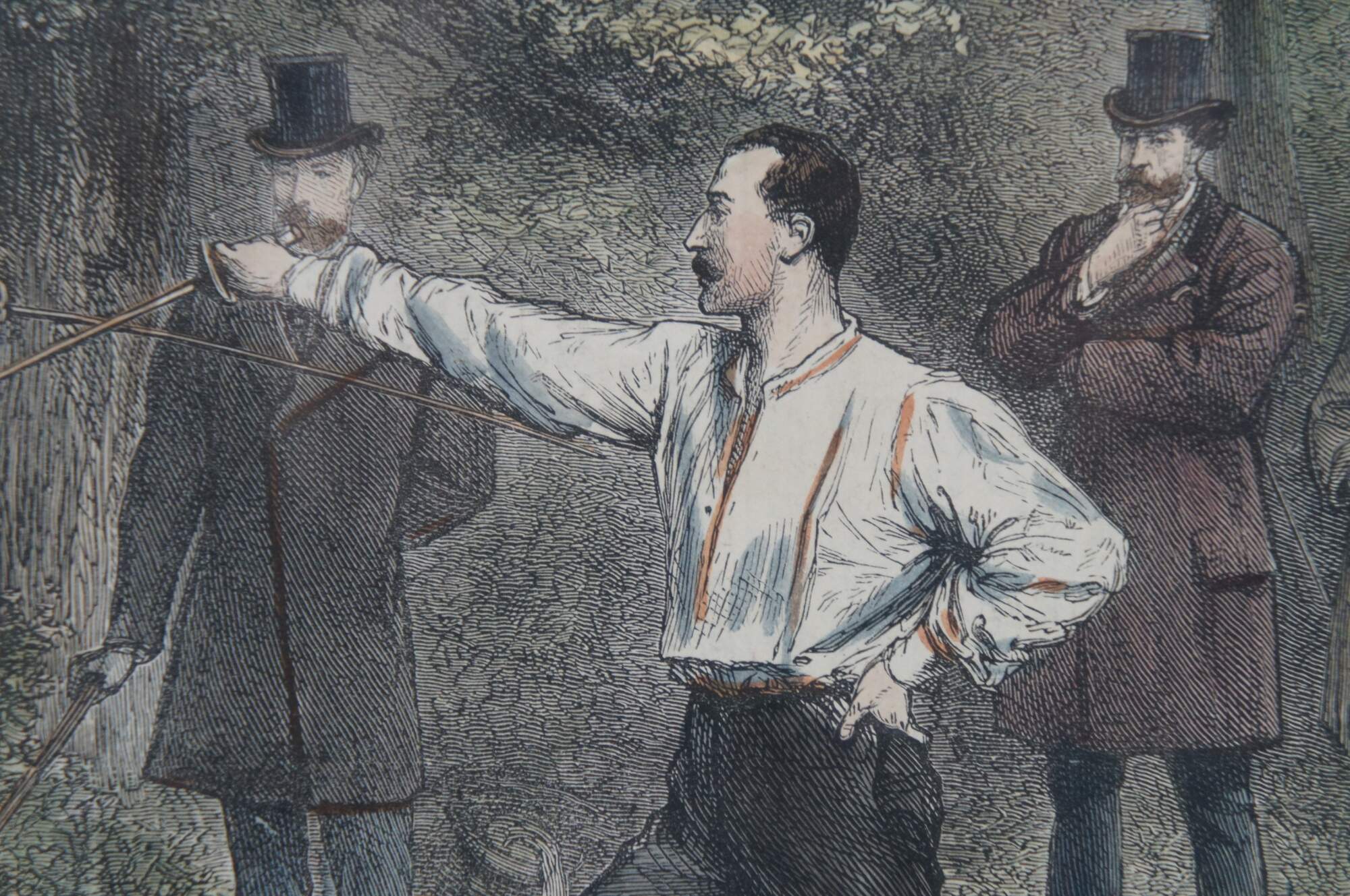 Framed late 19th century hand colored wood engraving depicting "Parisian Duels, an Encounter in the Bois Boulogne" by Godefroy Durand, showing two gentlemen in shitsleeves dueling with fencing foils in a forest, watched by several other well dressed figures. Extracted from The Graphic, December 26, 1874. Framed in a distressed gilded floral frame.