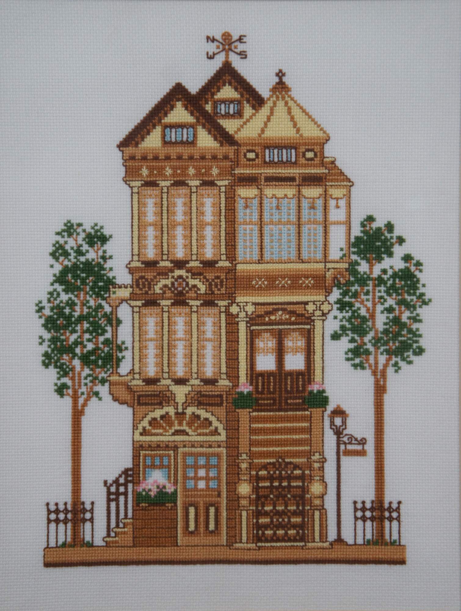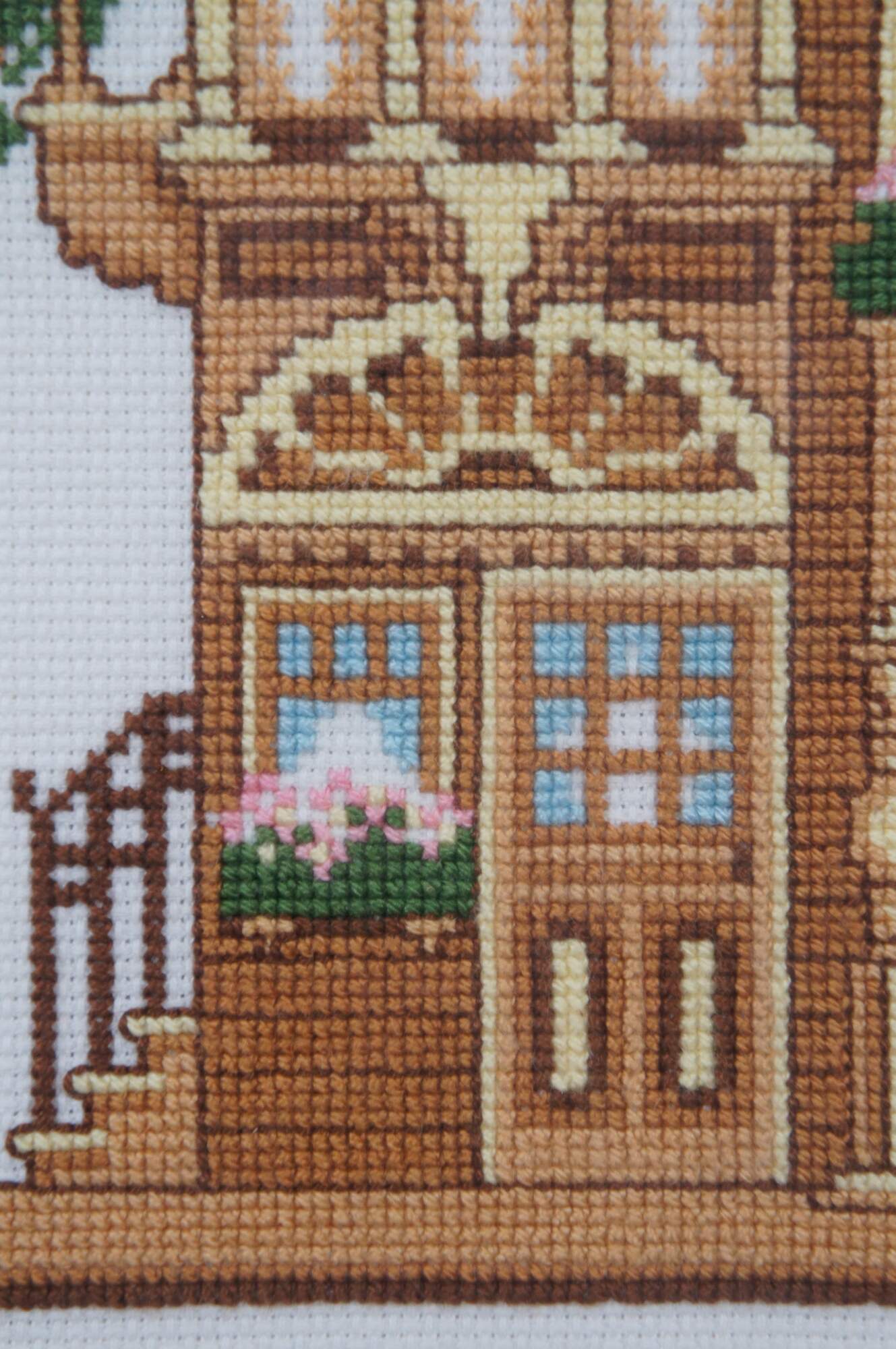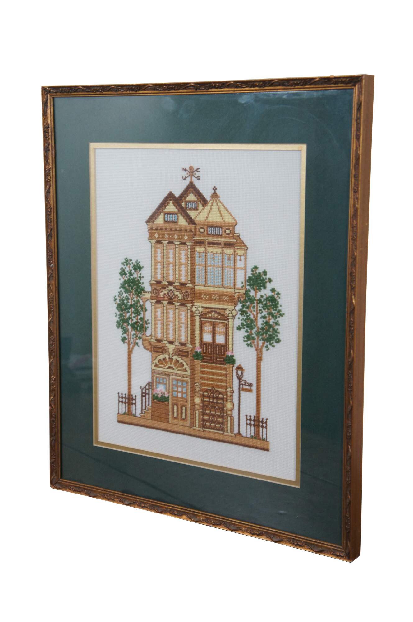 Framed piece of completed needlework depicting a turn of the century yellow Victorian house, from the 1983 Sunset brand counted cross stitch kit #2945. Framed in a distressed gilded floral frame.