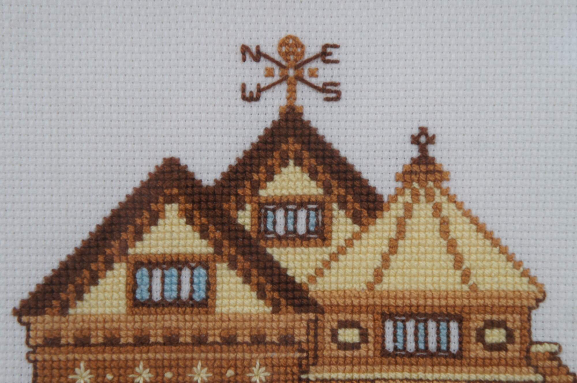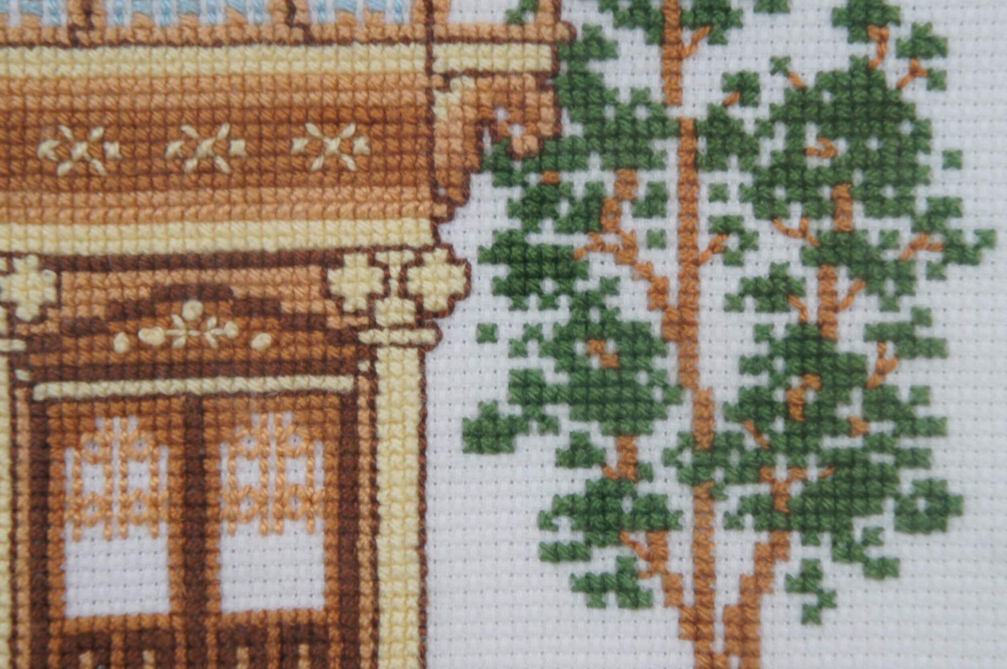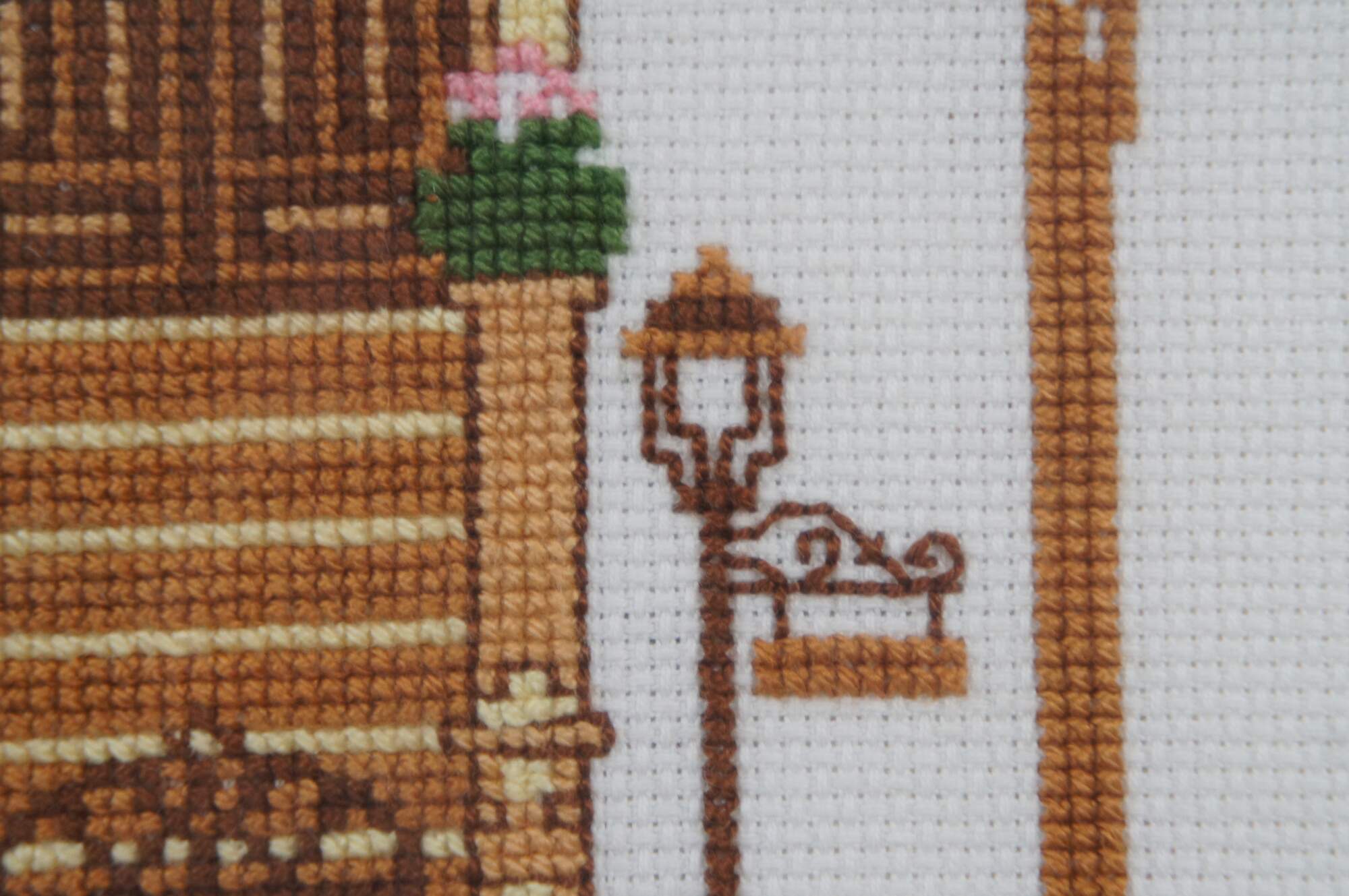 Framed piece of completed needlework depicting a turn of the century yellow Victorian house, from the 1983 Sunset brand counted cross stitch kit #2945. Framed in a distressed gilded floral frame.