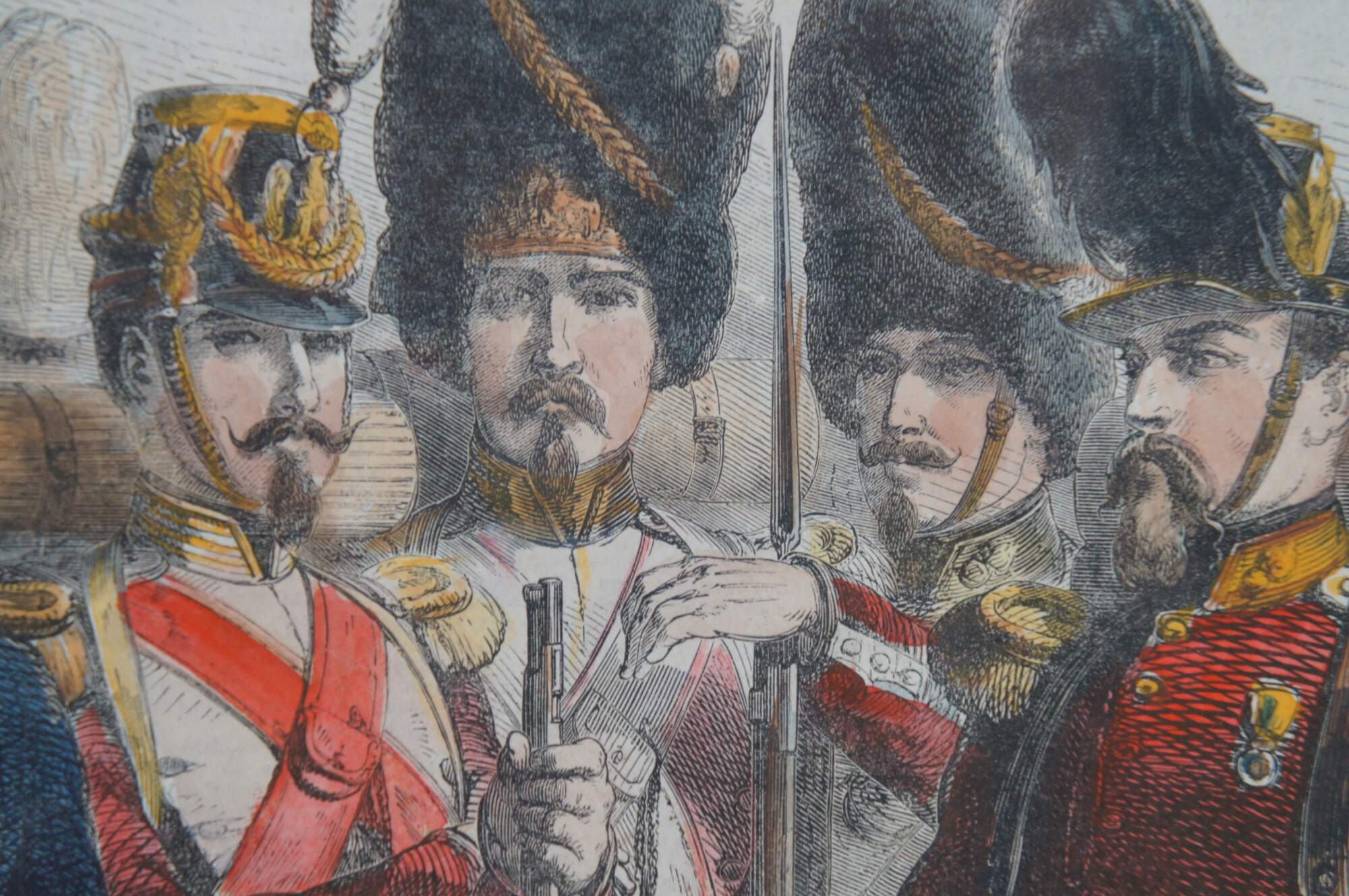 Pair of 19th century hand colored engravings depicting "Infantry & Calvary of the French Imperial Guard", for the Illustrated London News 1854. Signed in plate in lower left corner A.H. Val. Features hand cut mats, framed in gilded, beveled frames with beaded and ribbon twist details.