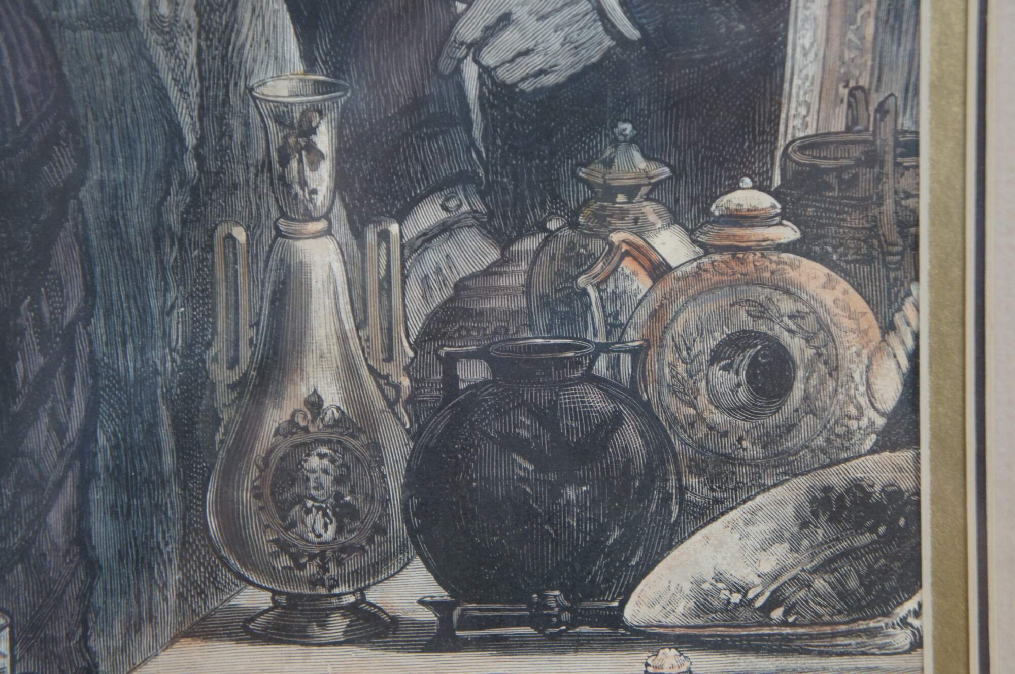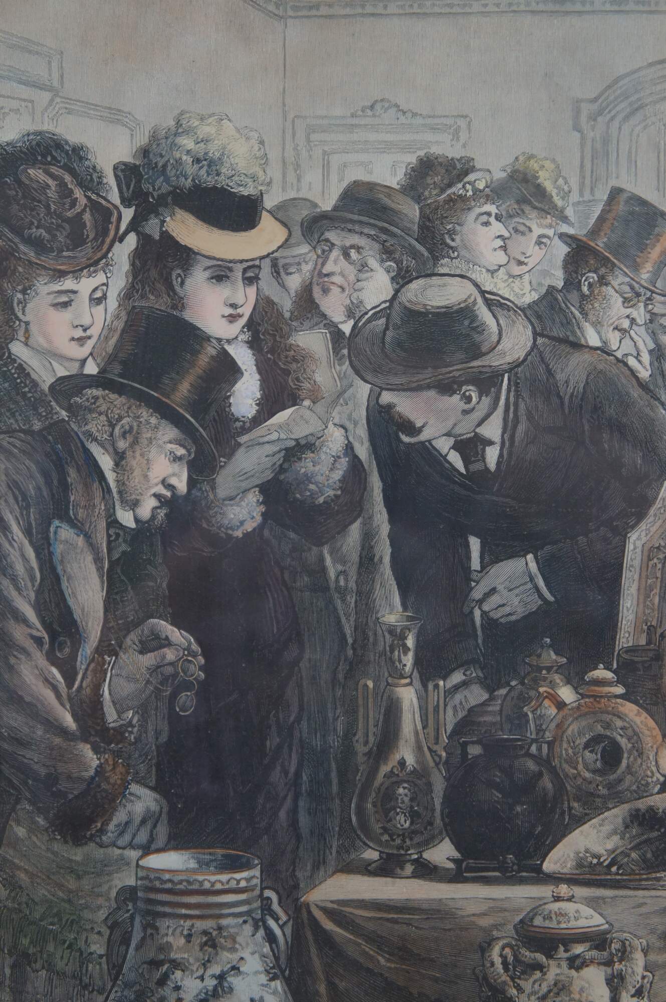 Mid to late 19th century hand colored engraving depicting men and women viewing objects on a table at an auction. Titled New York City - An Auction Sale of Bric-A-Brac From Centennial Exhibition. Published in "Frank Leslie's Illustrated" January 1877. Framed with a unique mat in a gilded frame with beaded and ribbon twist details.
