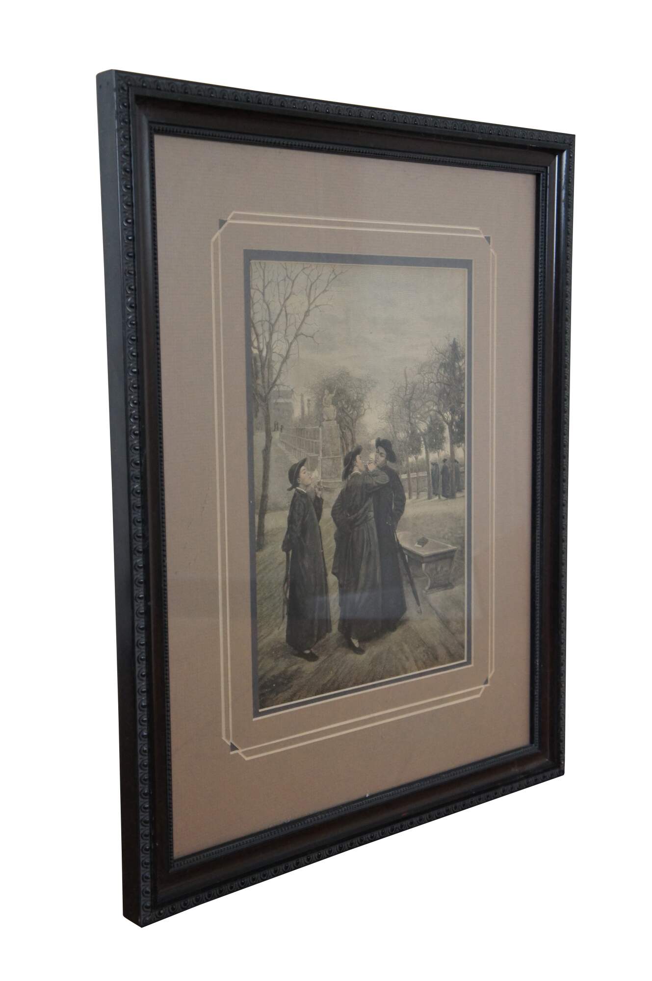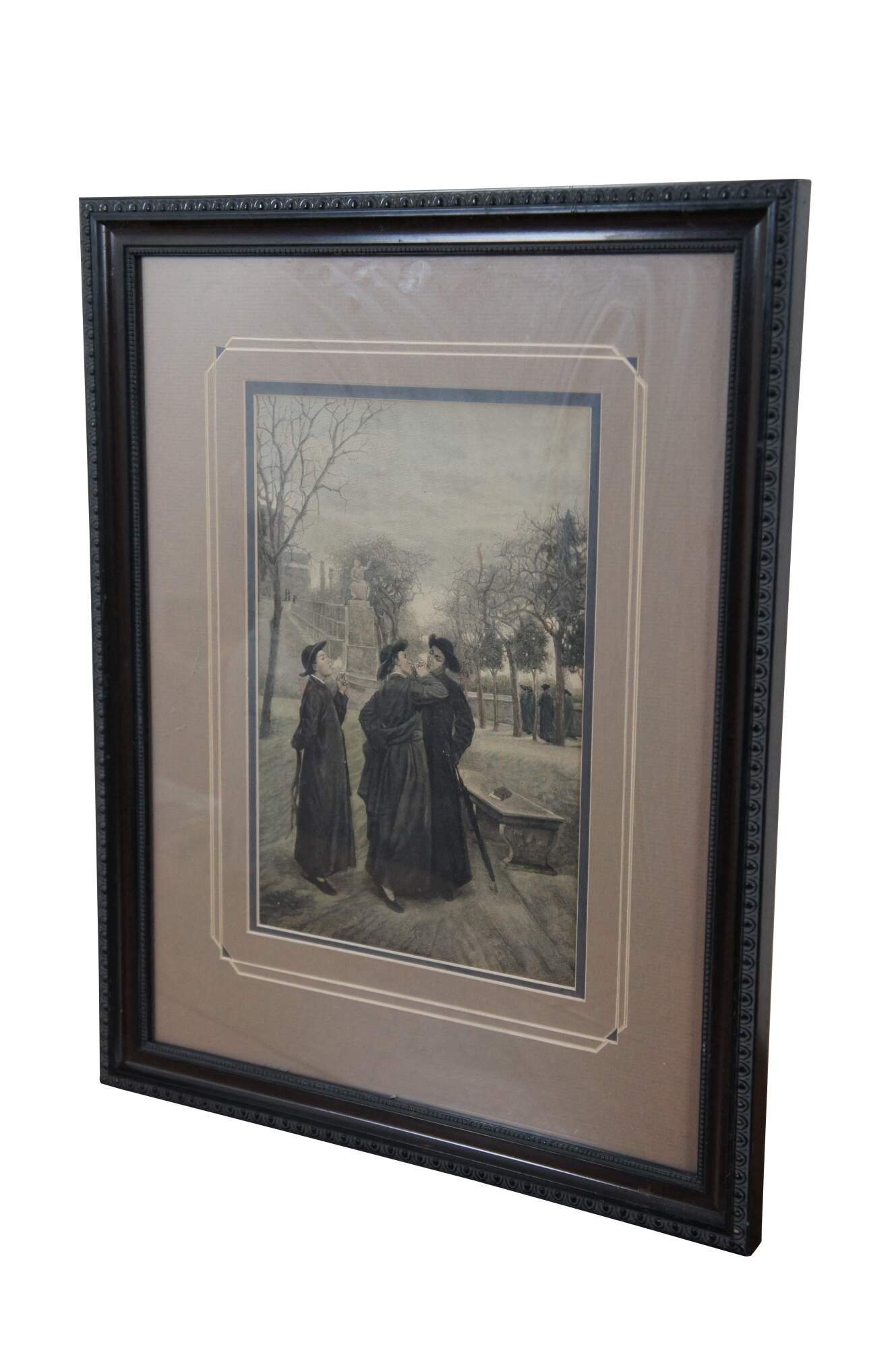 Framed late 19th century hand colored engraving depicting "Relaxation on Monte Pincio Near Rome" by E. Lowenthal, showing a trio of young priests in black vestments and hats taking a cigarette break. Framed over hand cut mat with glass in dark wood frame with beaded trim and egg and dart molding.