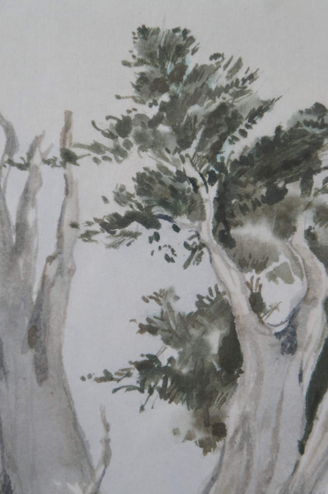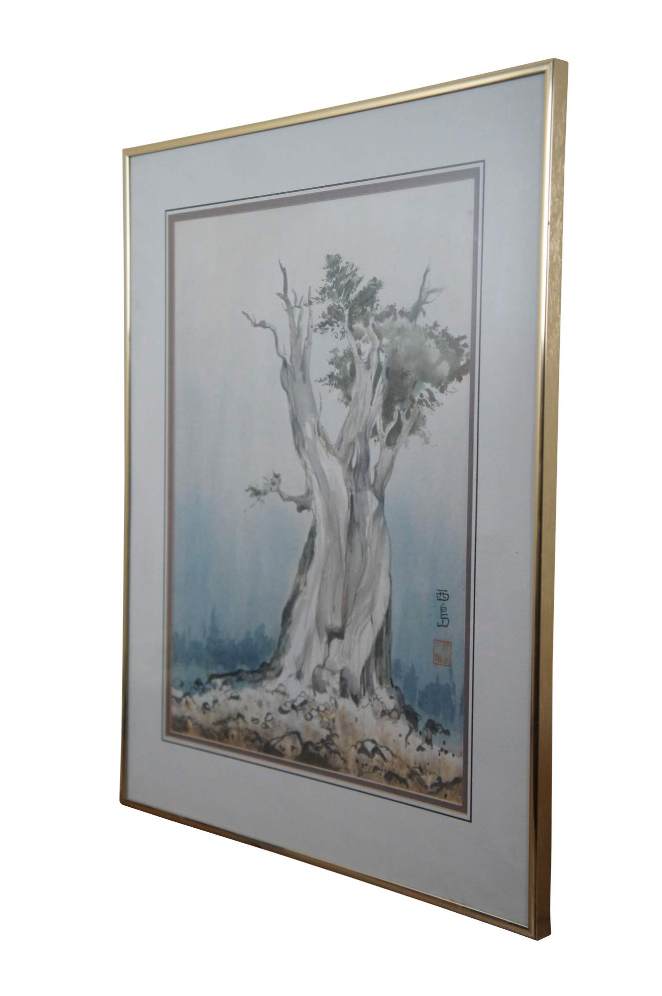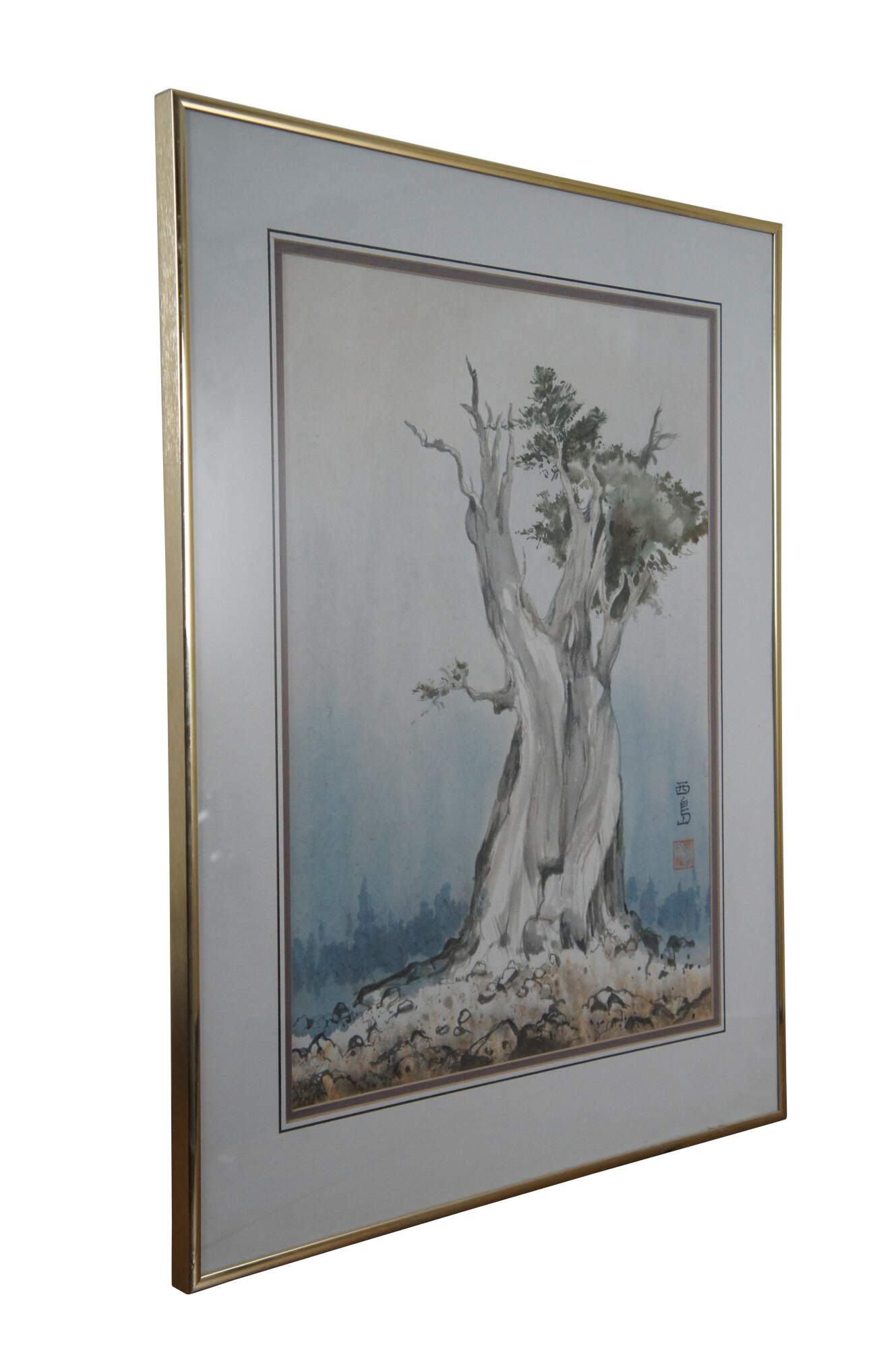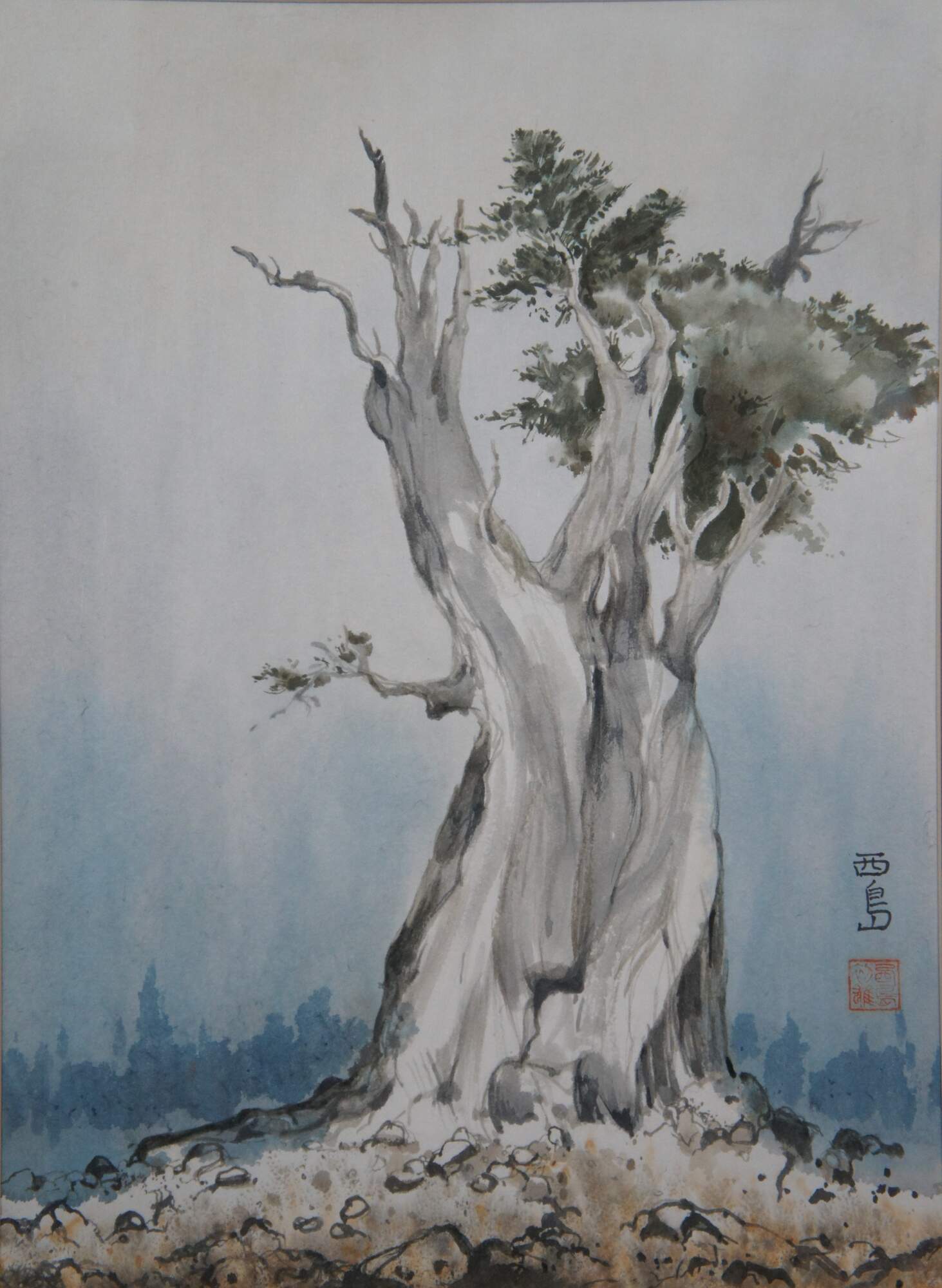 Vintage Japanese watercolor painting on paper depicting a somewhat barren pine tree with a thick trunk in rocky soil. Signed/stamped on right side. Framed in metallic gold frame. Signature translates to Nishijima