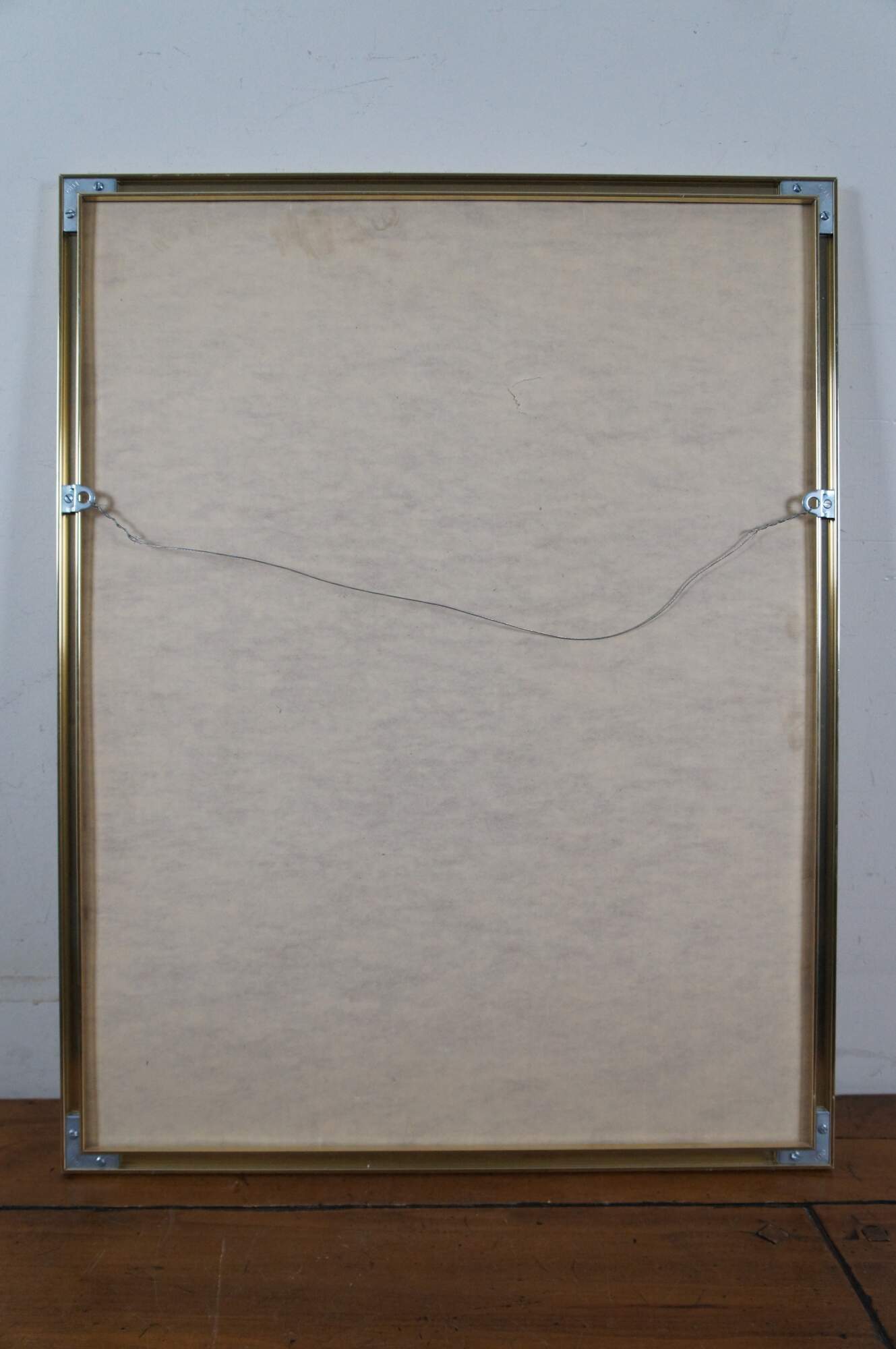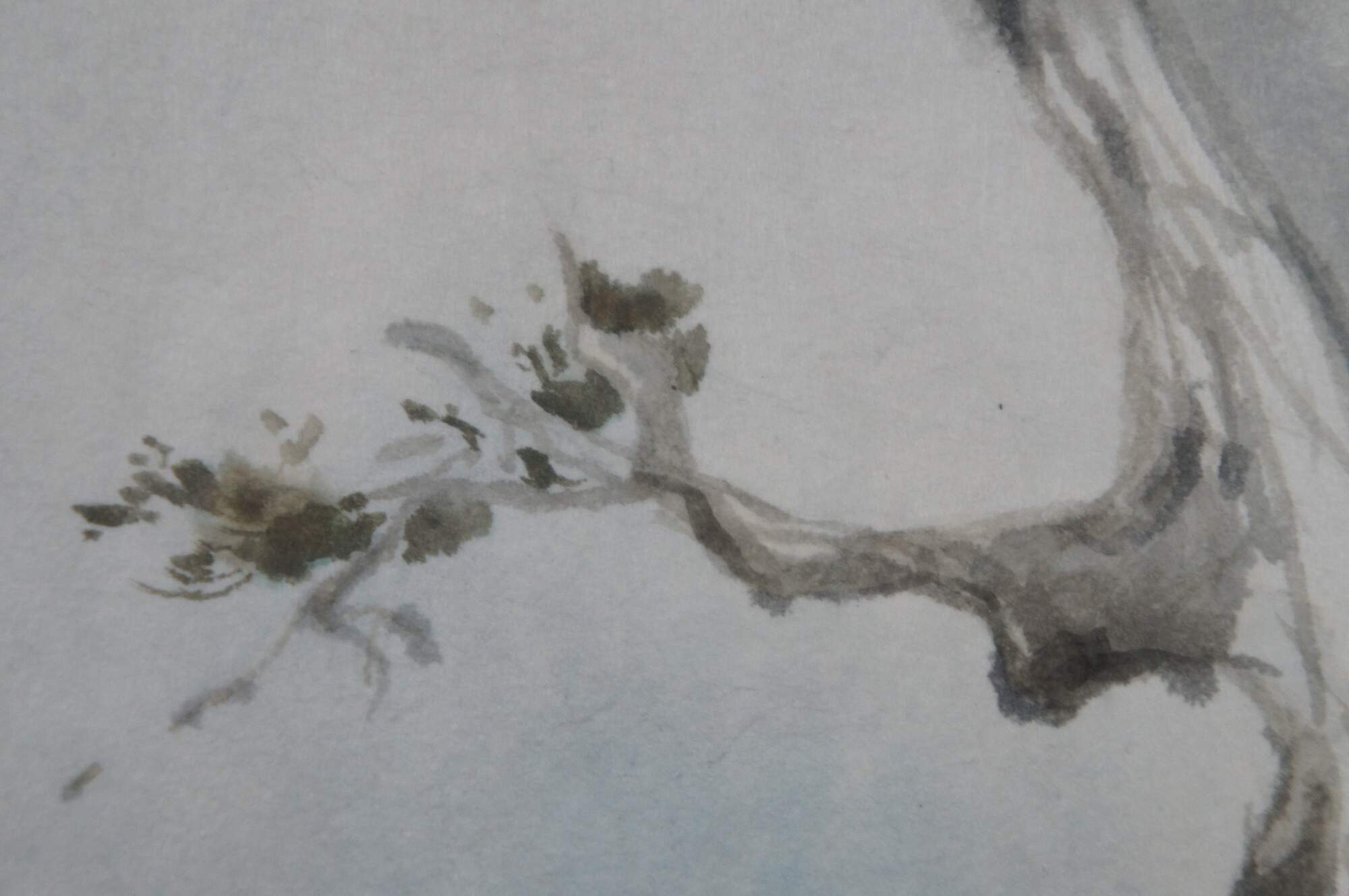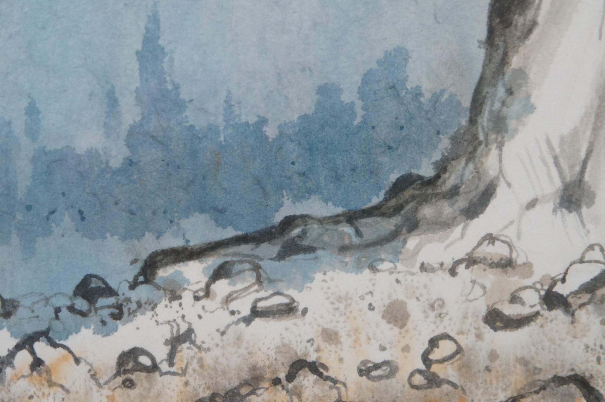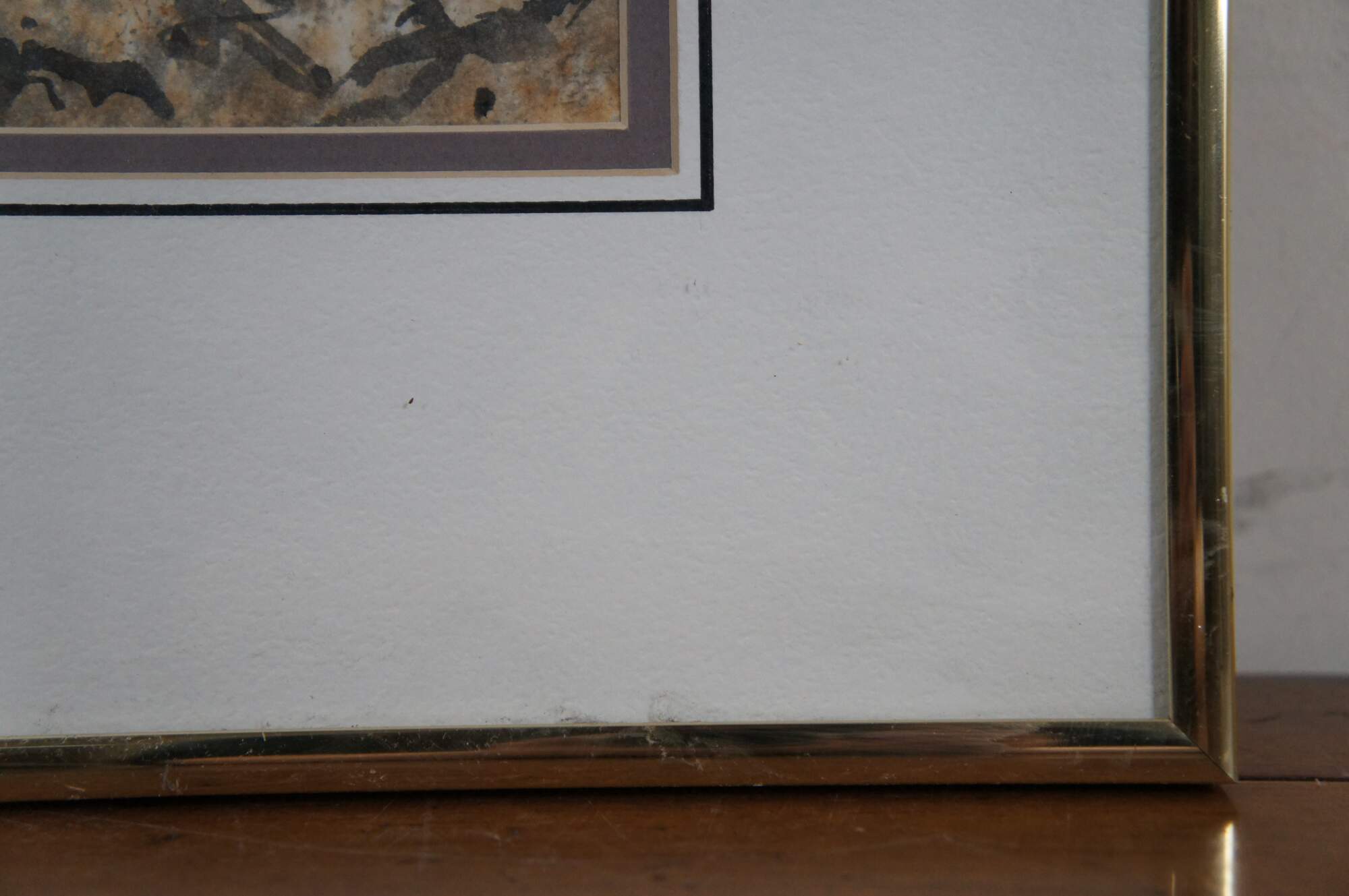 Vintage Japanese watercolor painting on paper depicting a somewhat barren pine tree with a thick trunk in rocky soil. Signed/stamped on right side. Framed in metallic gold frame. Signature translates to Nishijima