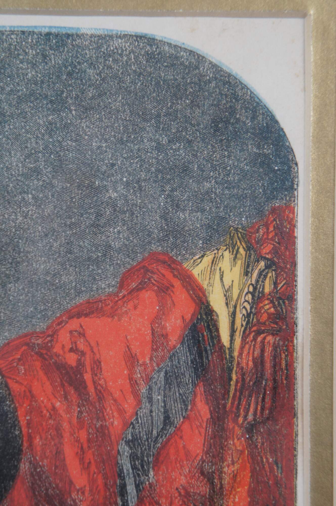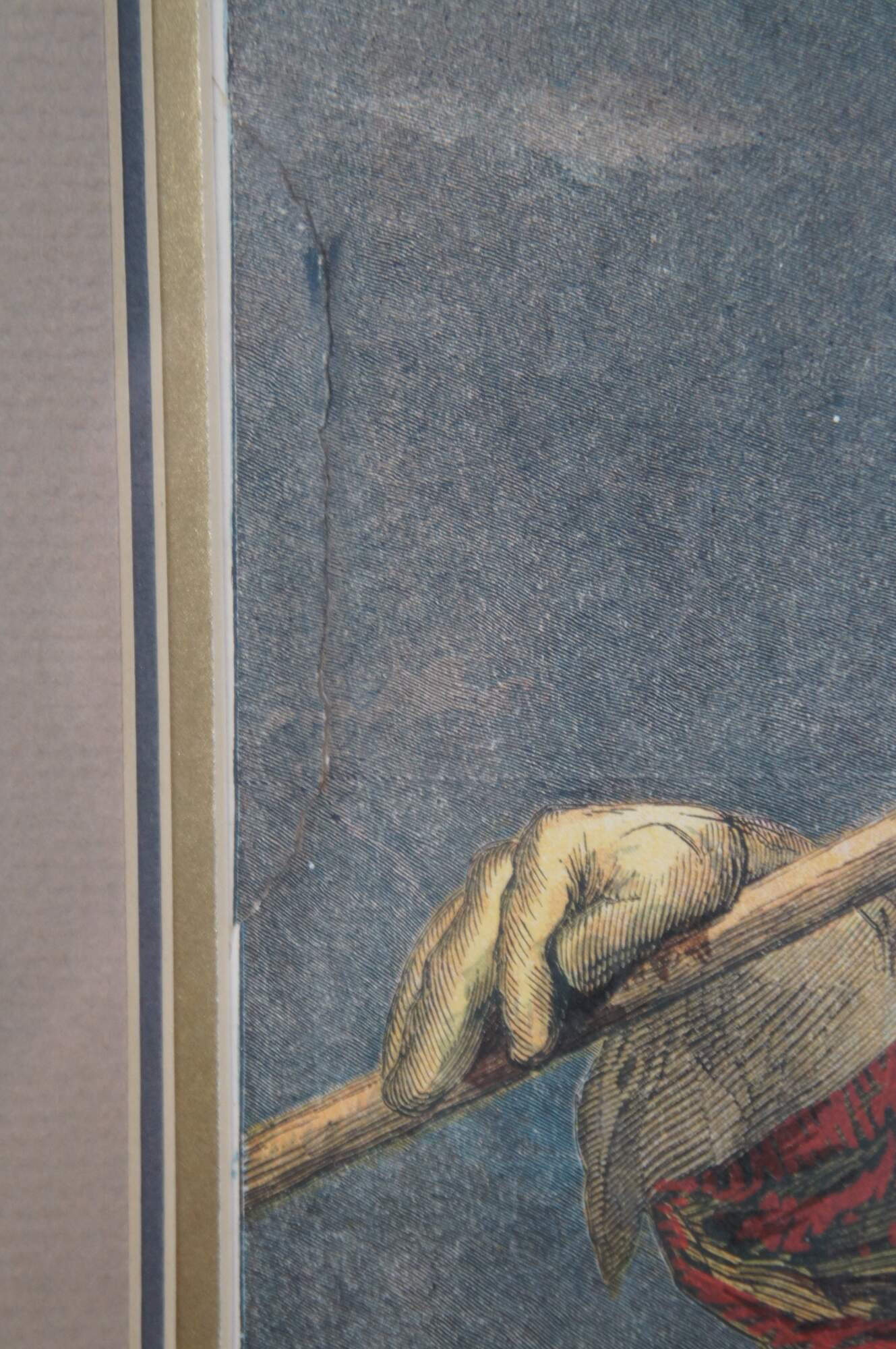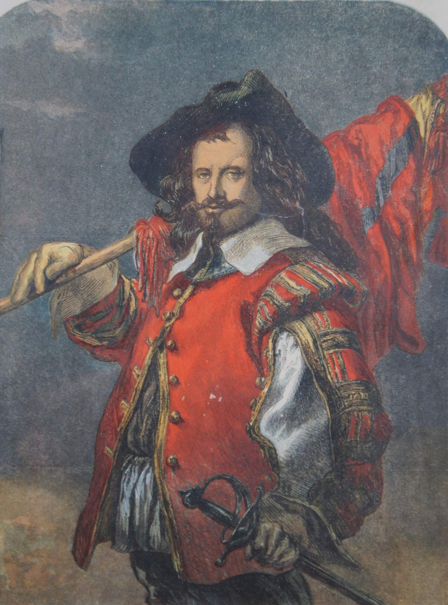 Framed mid 19th century hand colored engraving depicting a Cavalier / Musketeer holding s staff with flag. Titled "The Standard Bearer" by J. Gilbert "From the Exhibition of Old Water Colours," extracted from The Illustrated London News, 1856, published by George C. Leighton. Framed under a hand cut mat in a gilded frame with beaded and ribbon twist details.