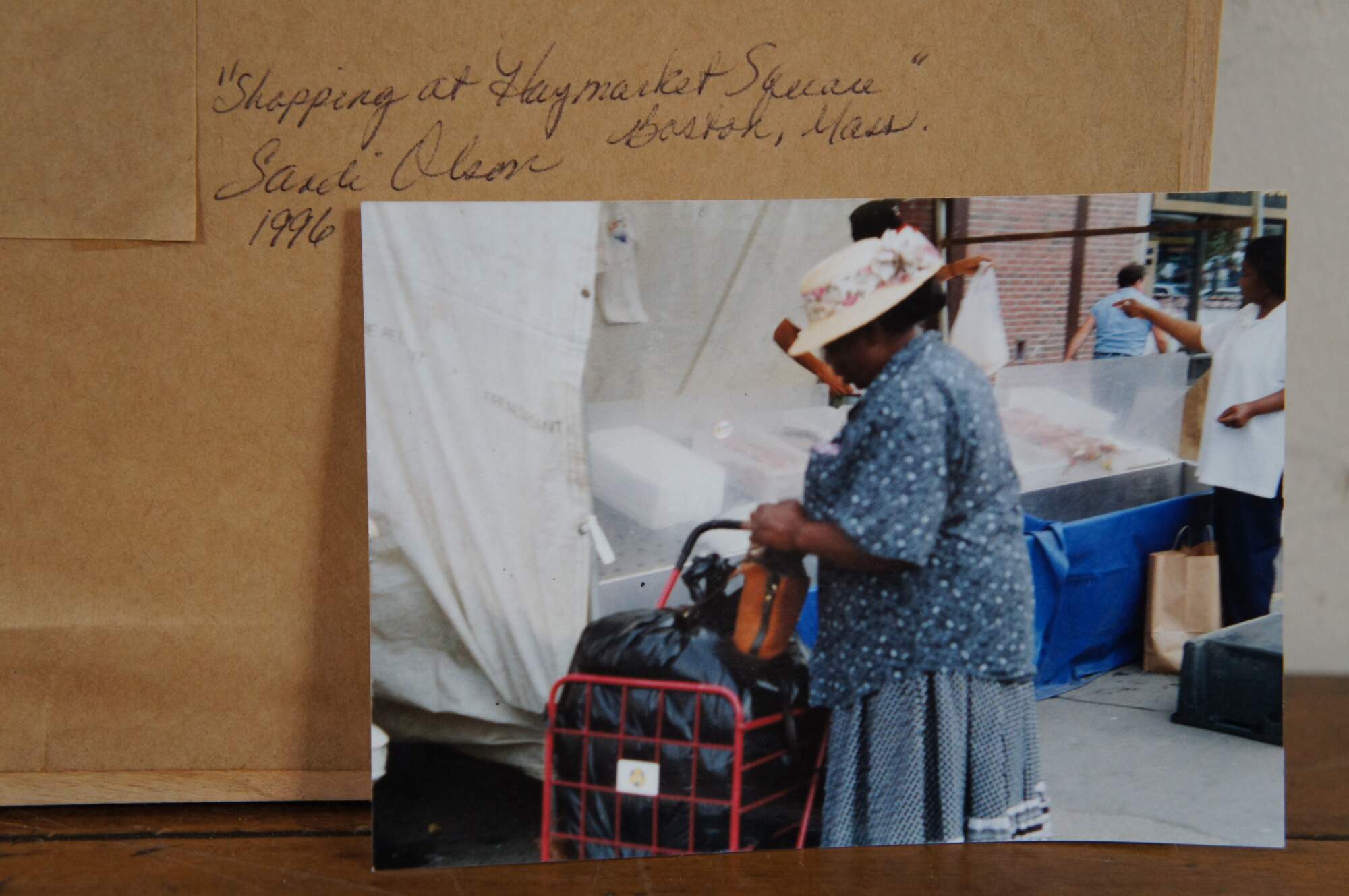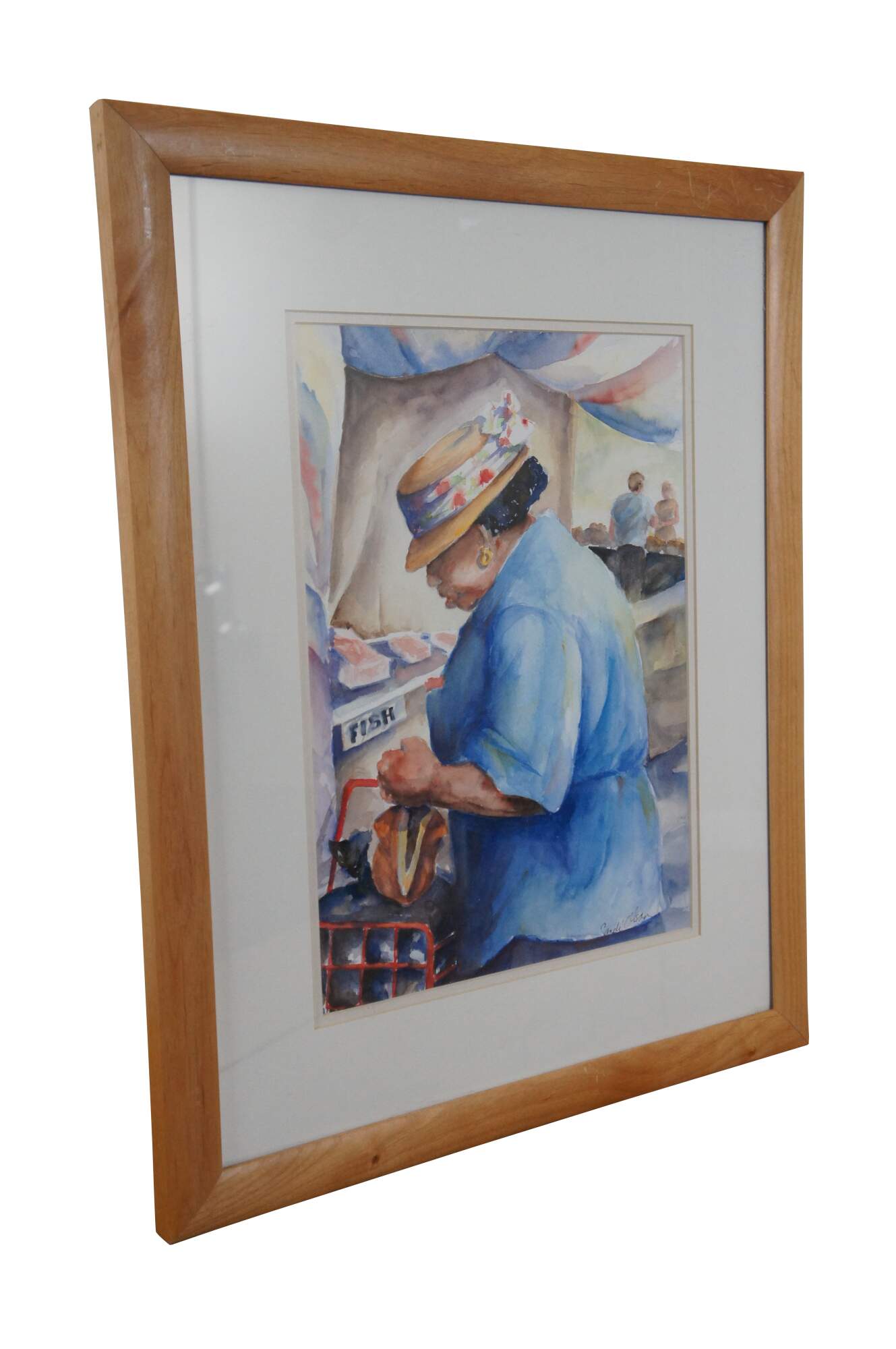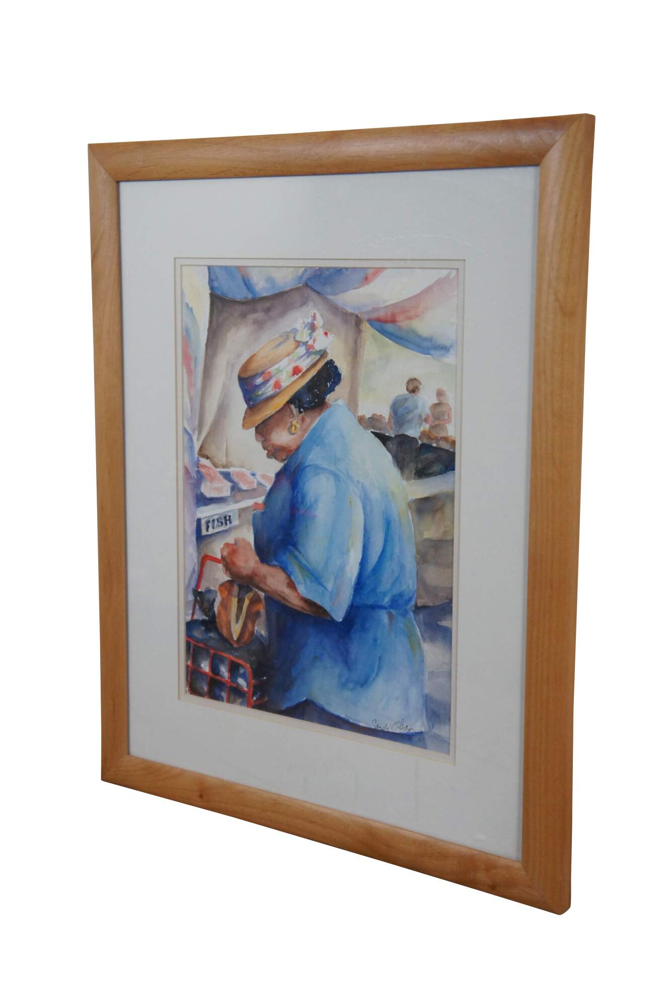 Vintage framed watercolor on paper painting titled "Shopping at Haymarket Square" Boston, Mass. by Sandi Olson 1996, showing a woman in a straw hat and blue shirt, shopping at a fish stall. Signed in lower right corner. Includes original reference photograph. Framed in a beveled wood frame under glass.