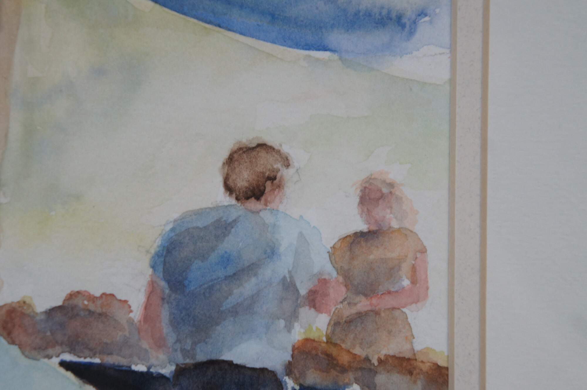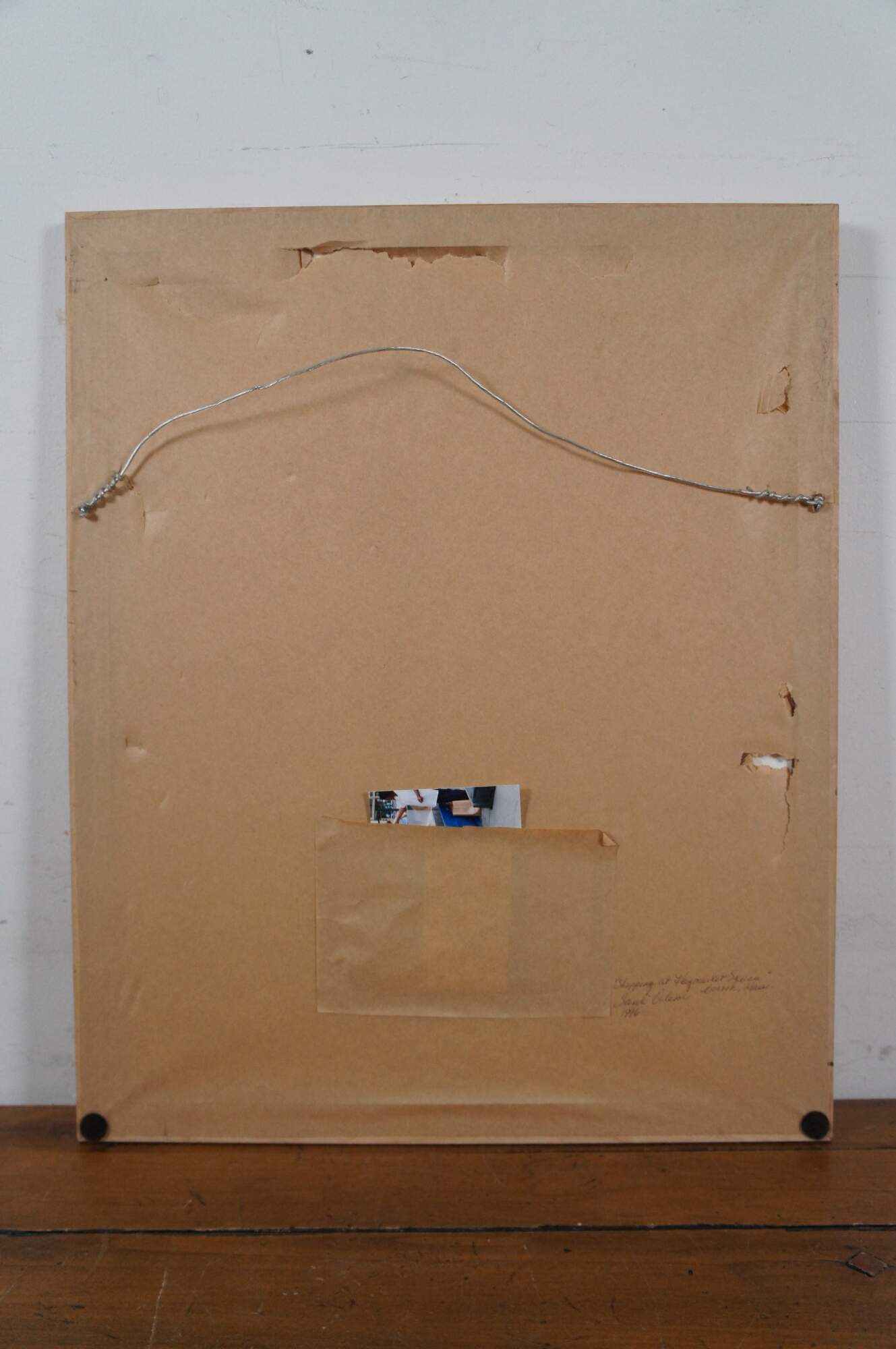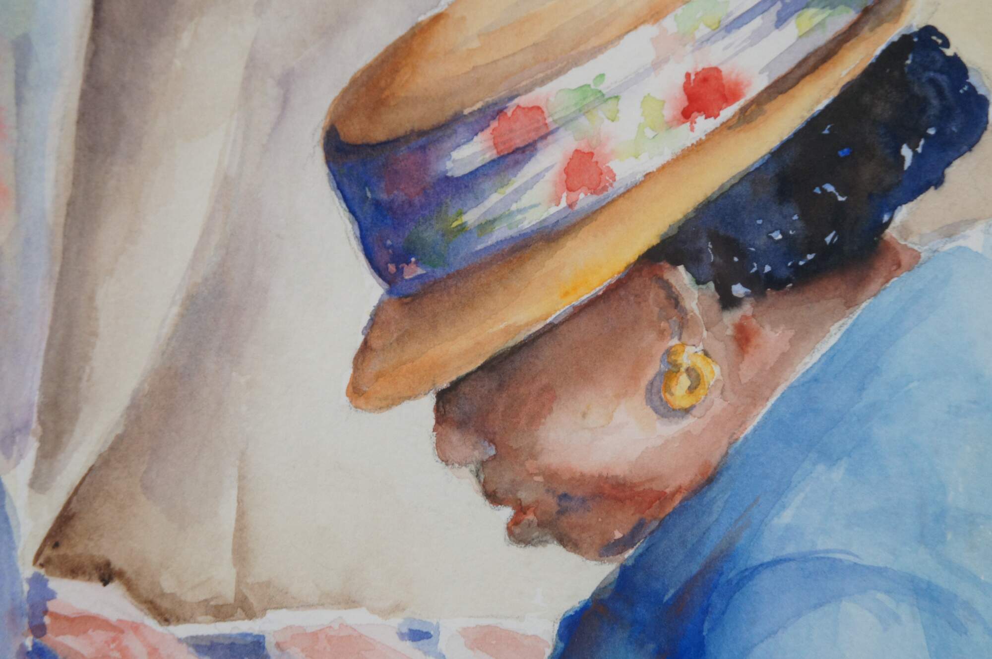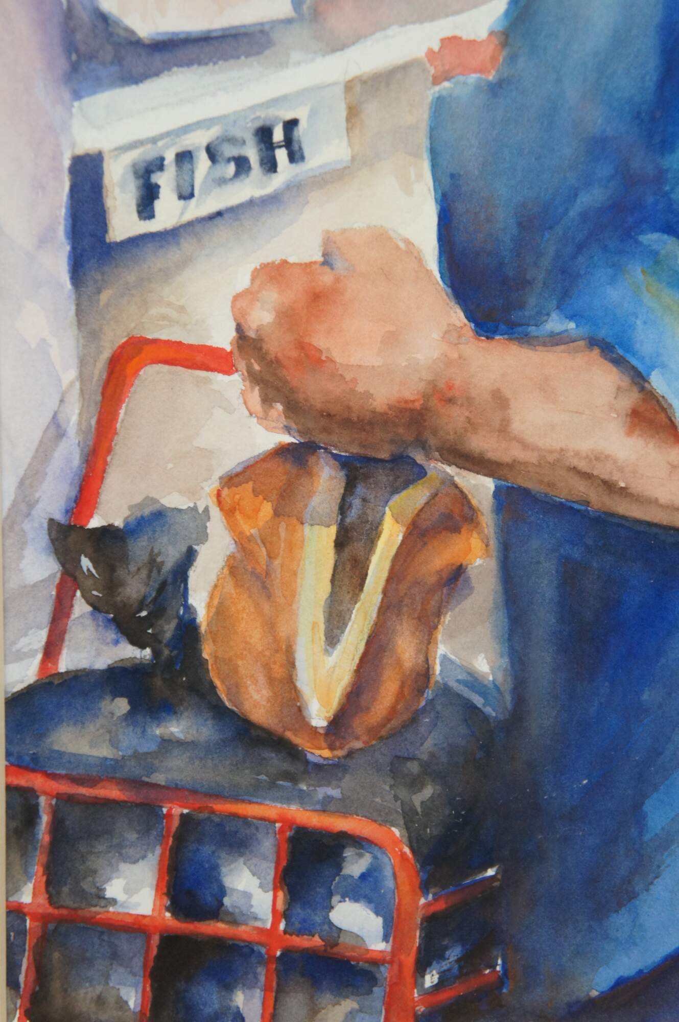 Vintage framed watercolor on paper painting titled "Shopping at Haymarket Square" Boston, Mass. by Sandi Olson 1996, showing a woman in a straw hat and blue shirt, shopping at a fish stall. Signed in lower right corner. Includes original reference photograph. Framed in a beveled wood frame under glass.