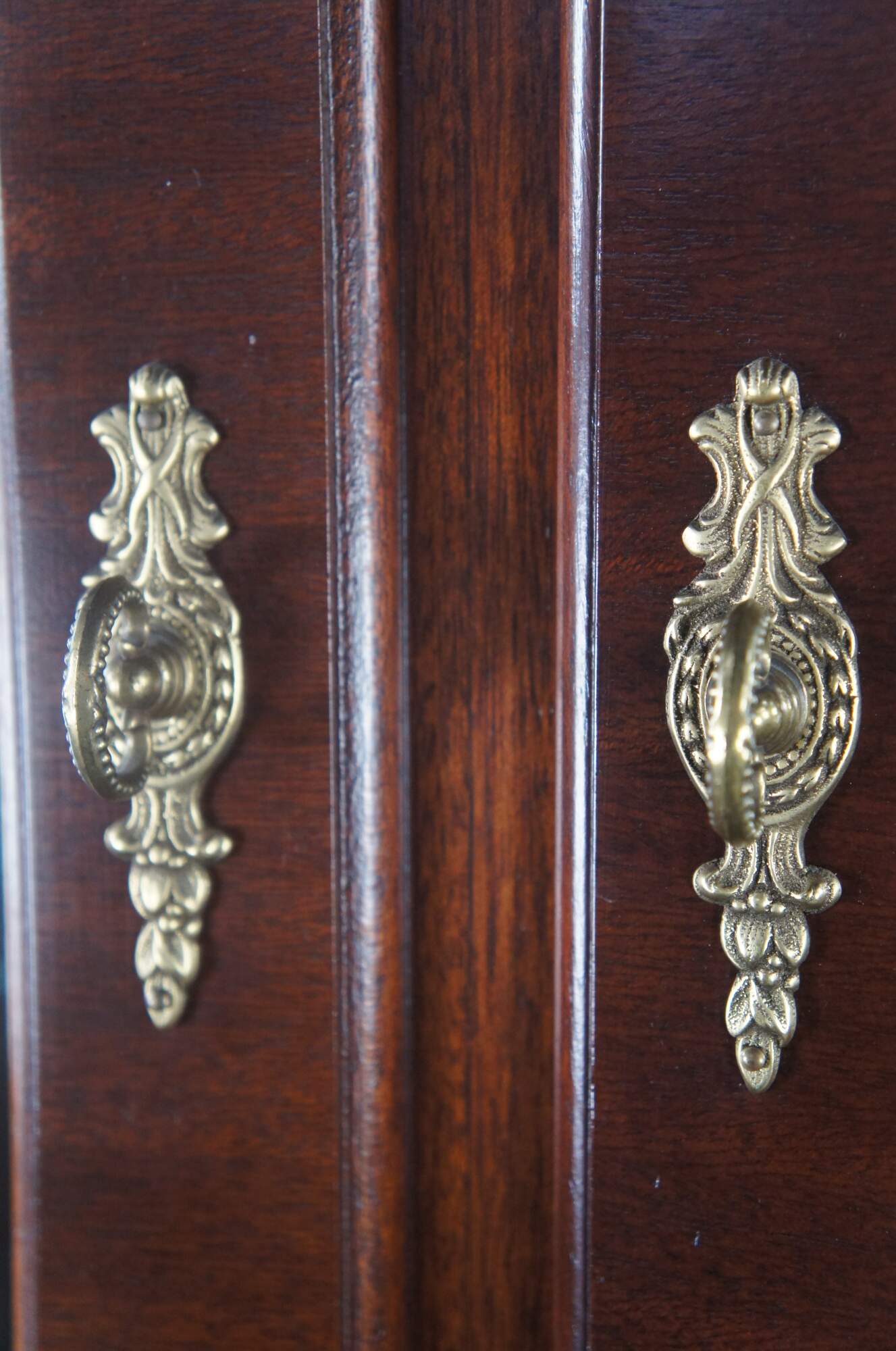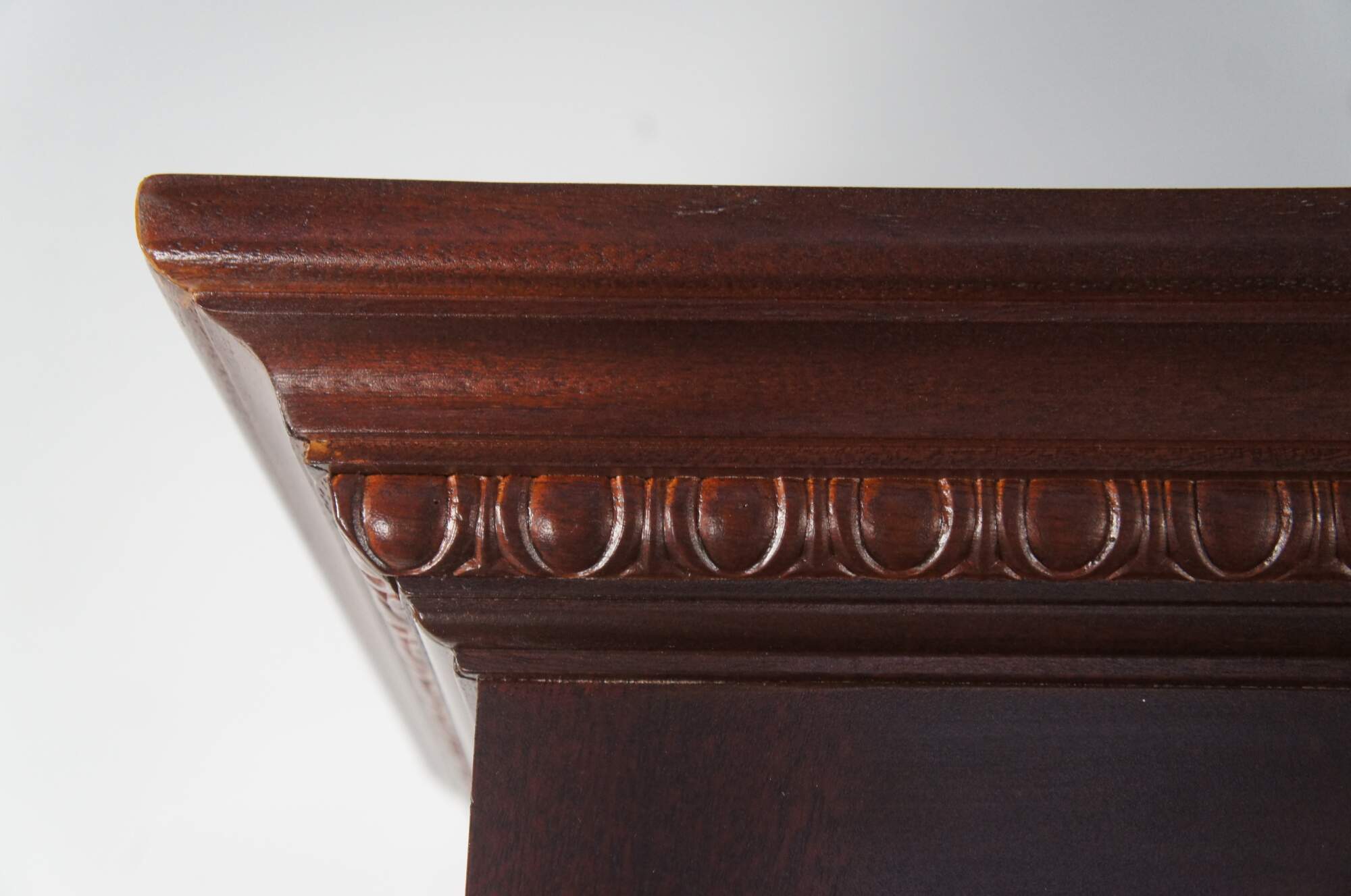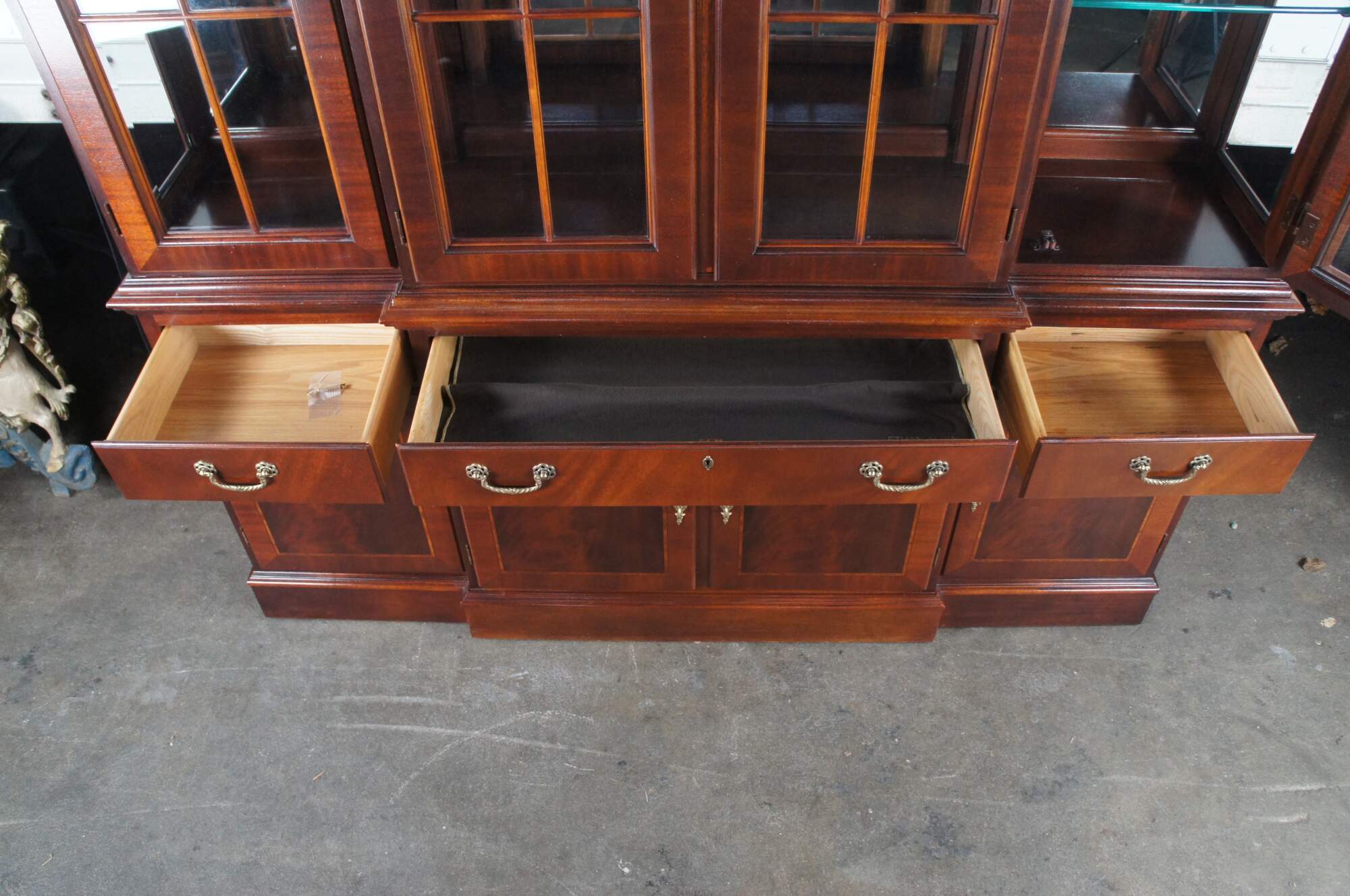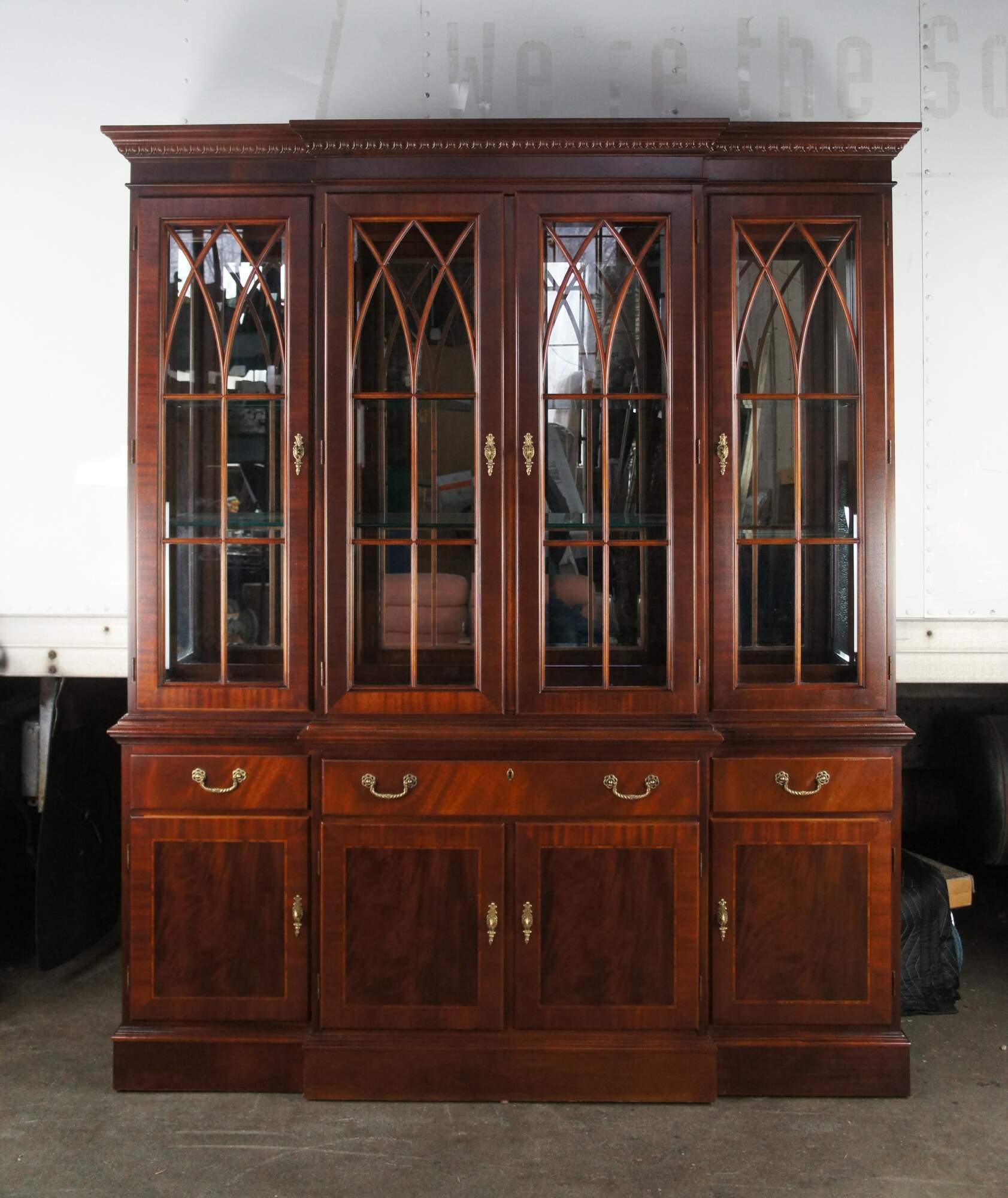 Ethan Allen 18th Century English Chippendale / Georgian style Breakfront. Made from mahogany with banded cross mahogany lower doors. Features a glass display portion with gothic fretwork, a pierced open pediment crown and Egg and Dart Molding. Opens to a mirrored backing with adjustable glass shelves and plate grooves. Buffet portion has three dovetailed drawers with a central lined silverware cloth. Lower cabinet opens to three compartments with a central shelf. #22-6550, finish 254