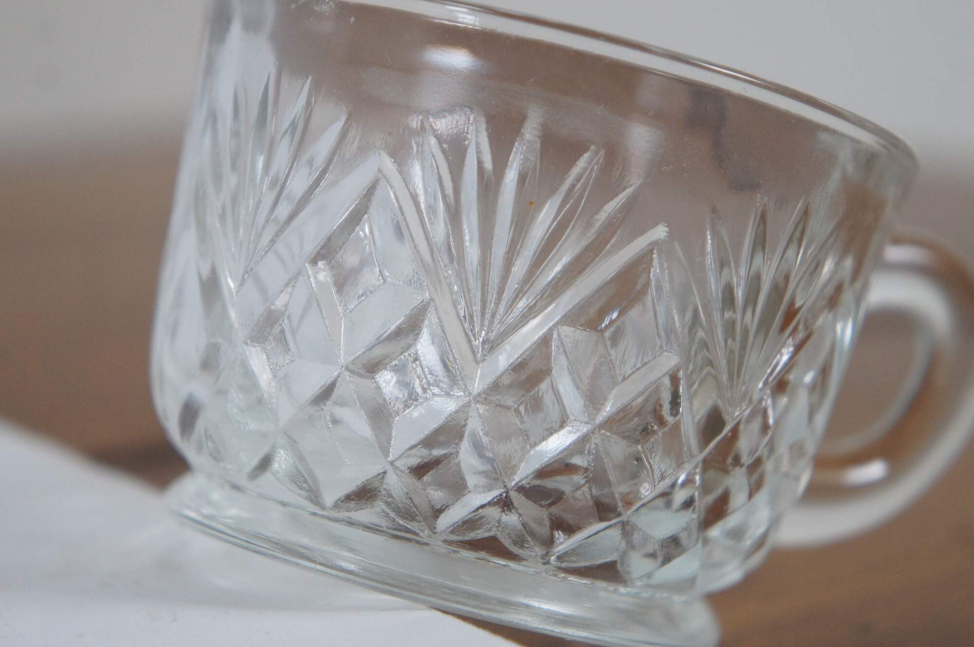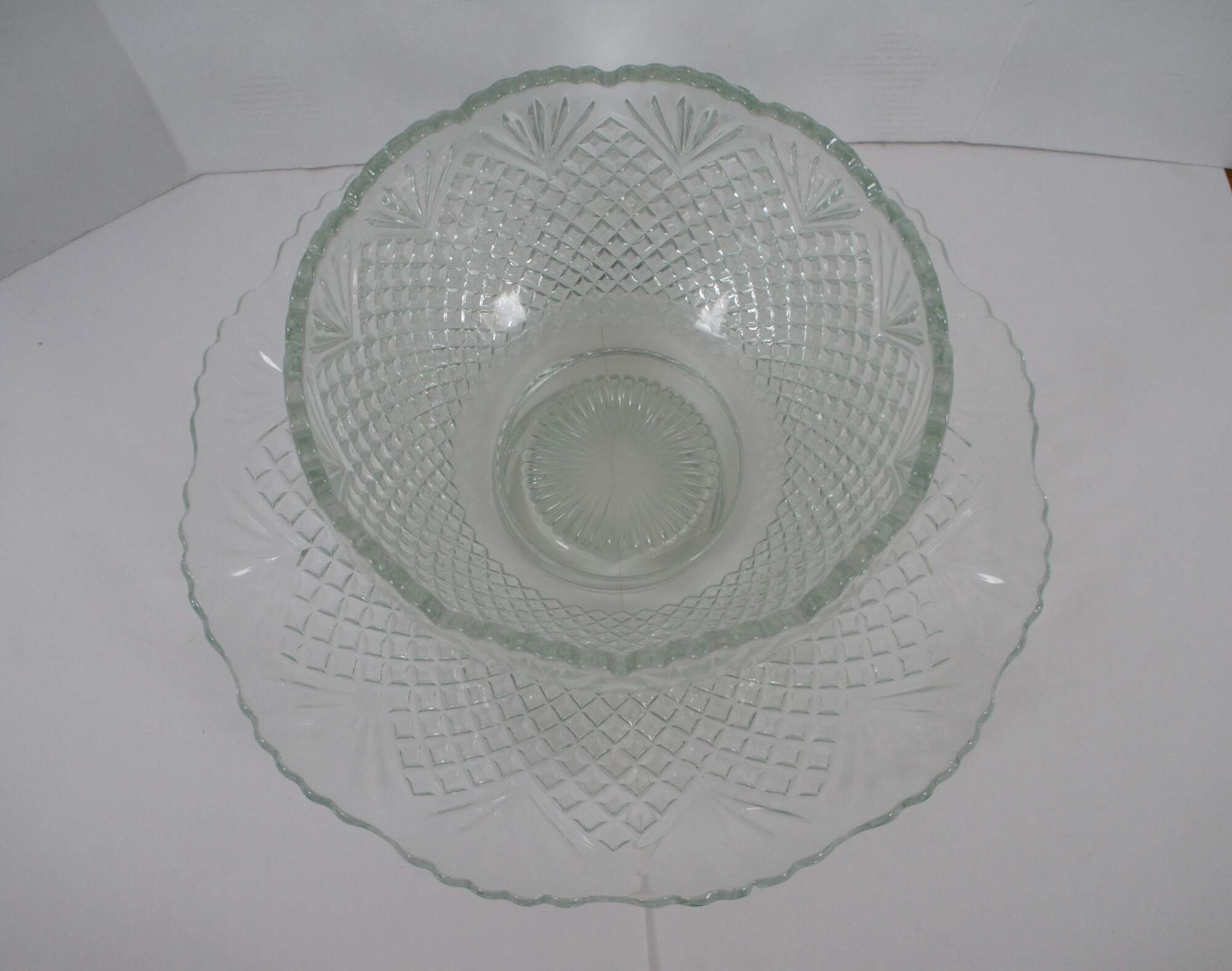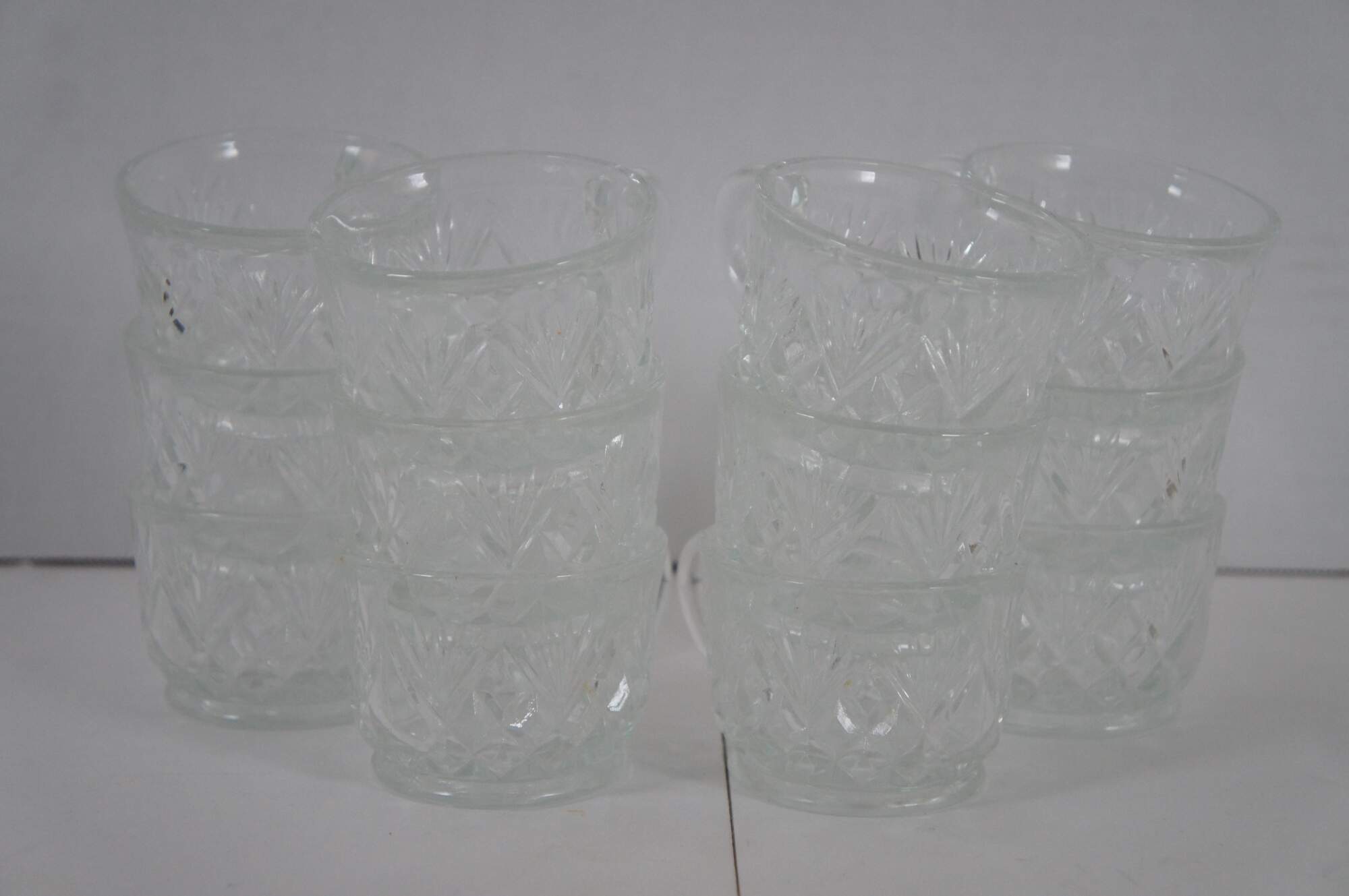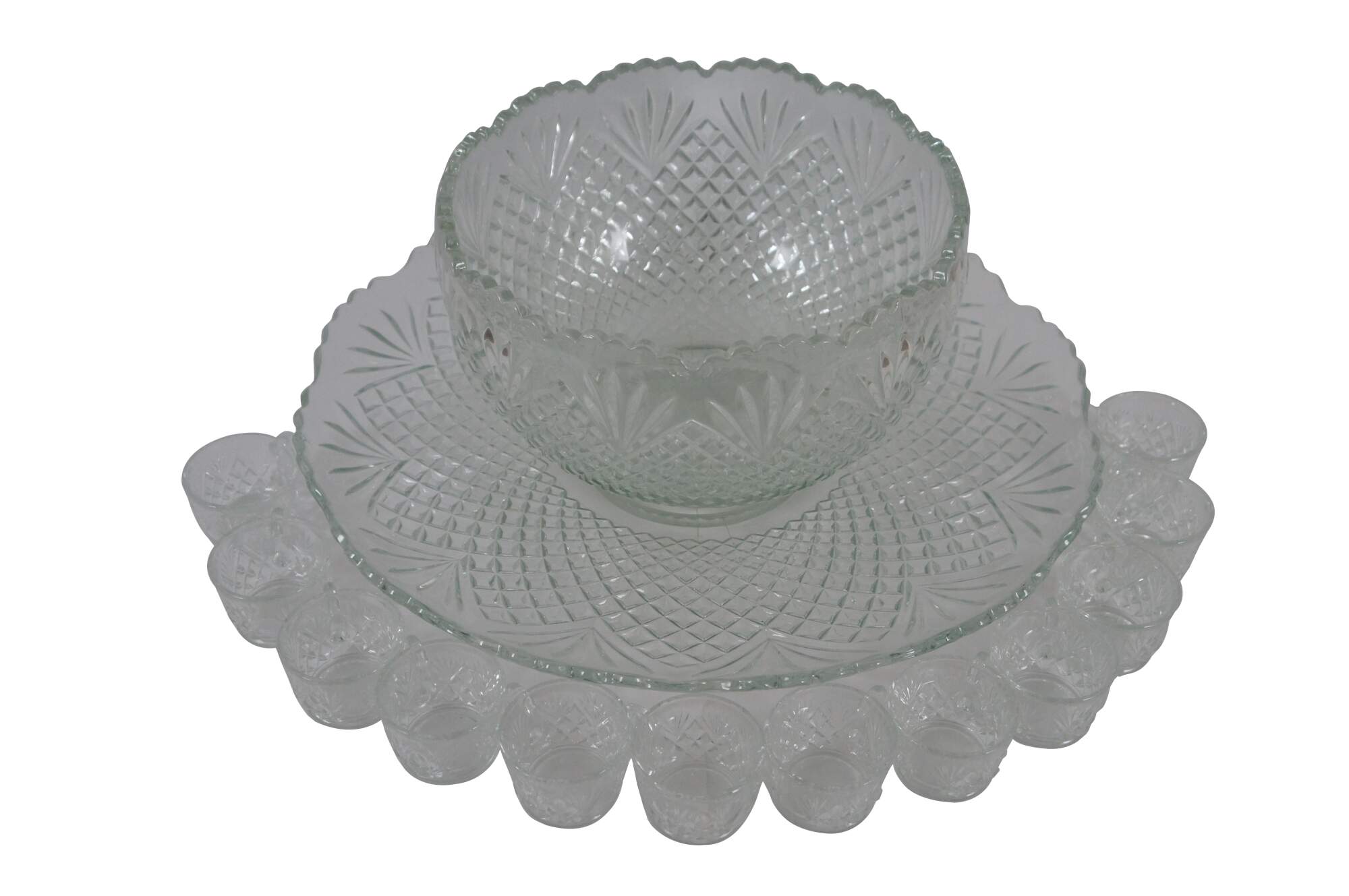 Circa 1940s pressed glass punch set attributed to L.E. Smith Glass Company in the Pineapple pattern. Includes bowl, underplate, and 12 cups.
