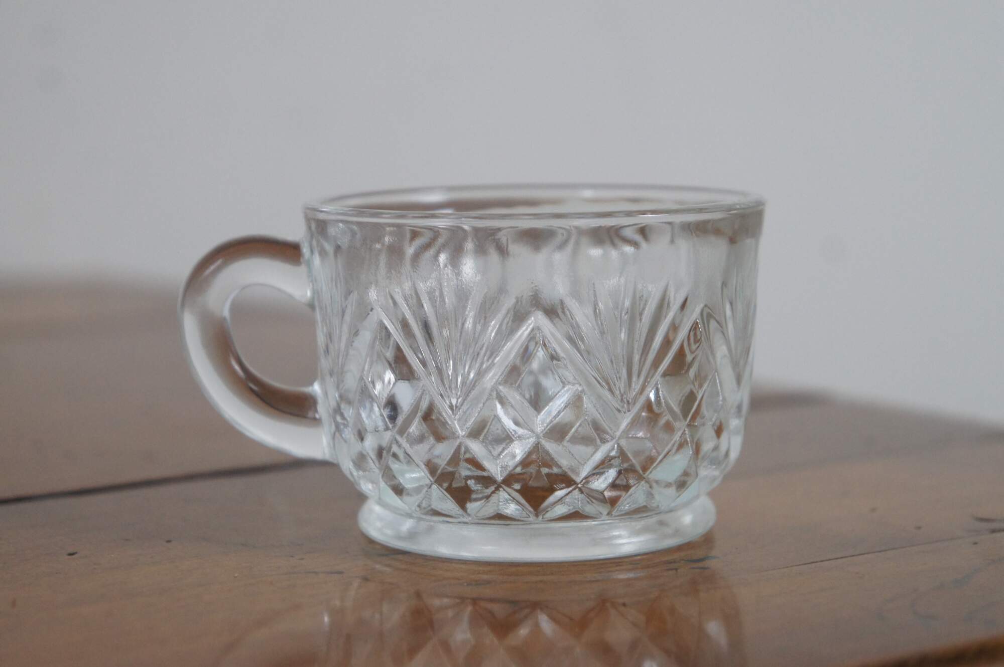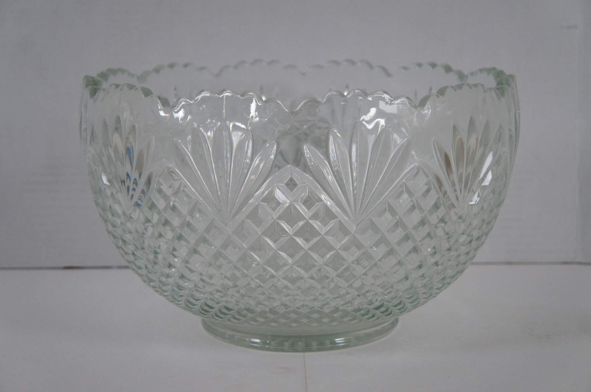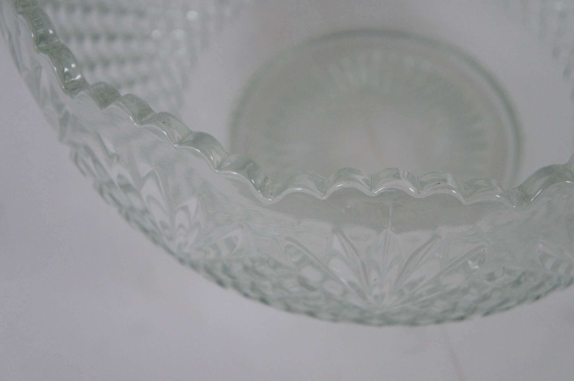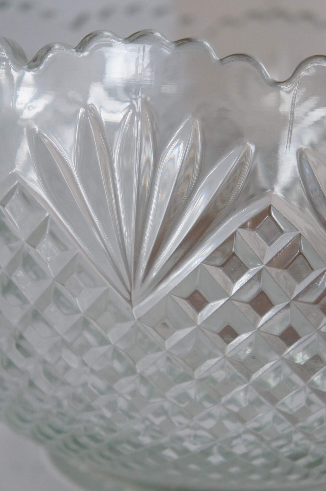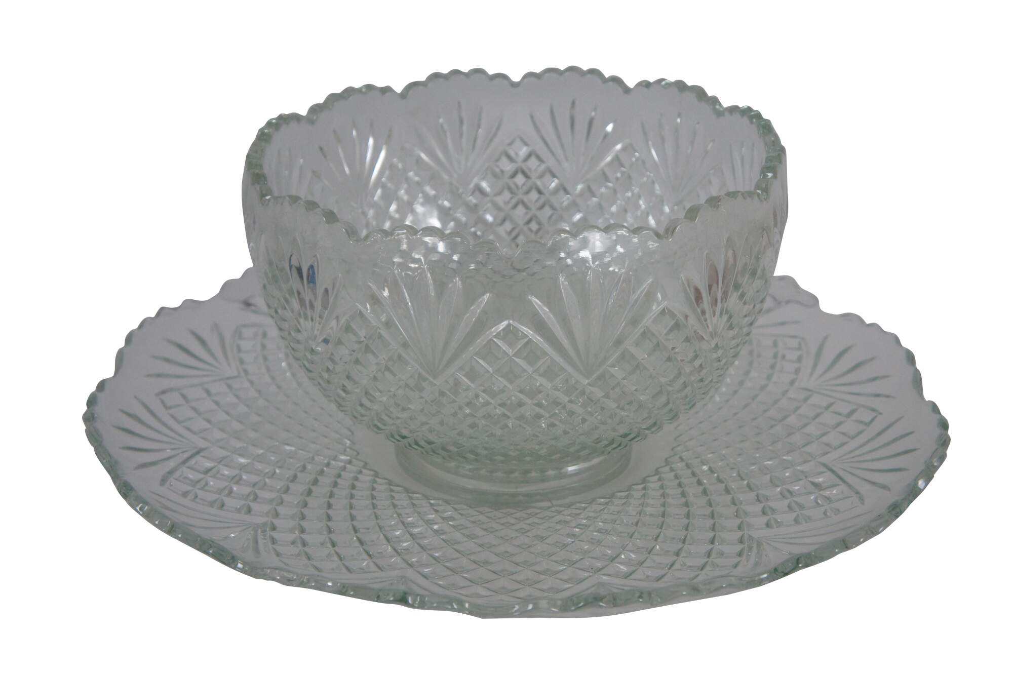 Circa 1940s pressed glass punch set attributed to L.E. Smith Glass Company in the Pineapple pattern. Includes bowl, underplate, and 12 cups.