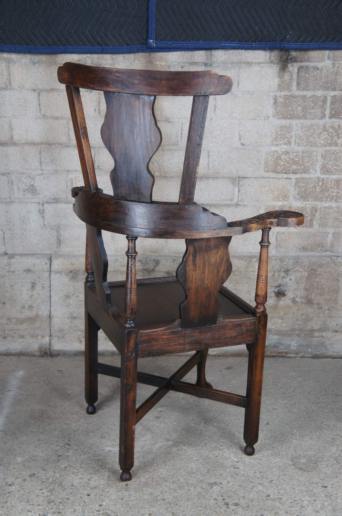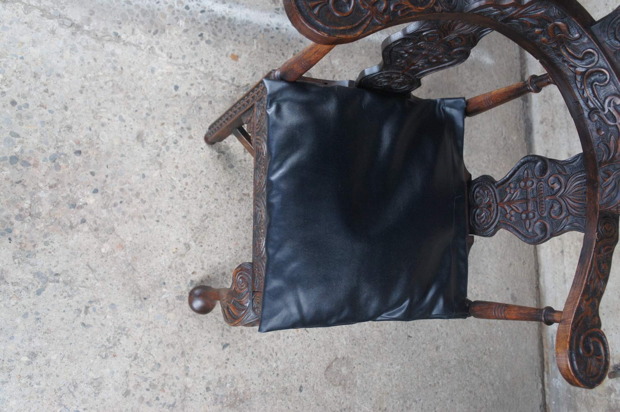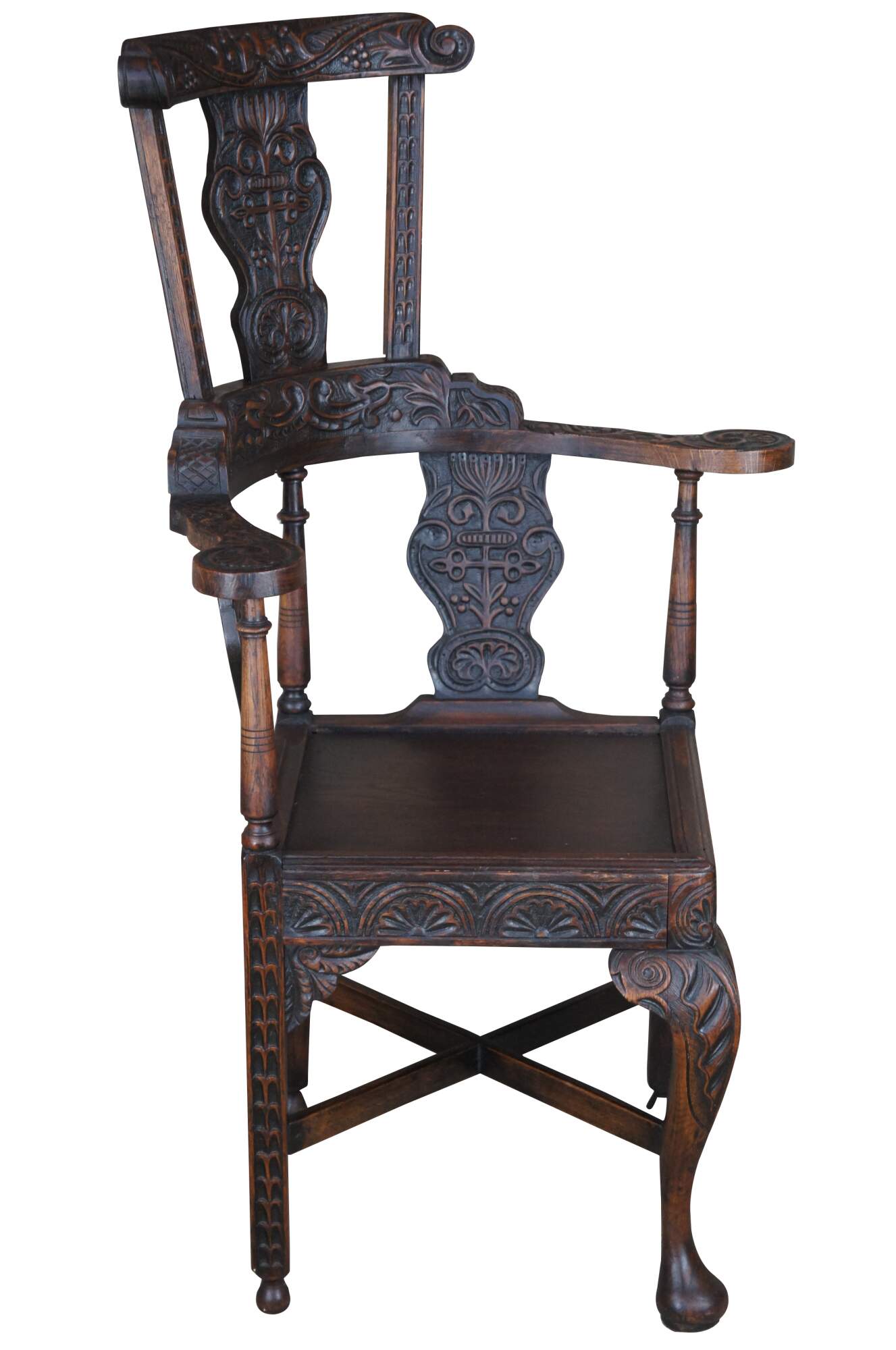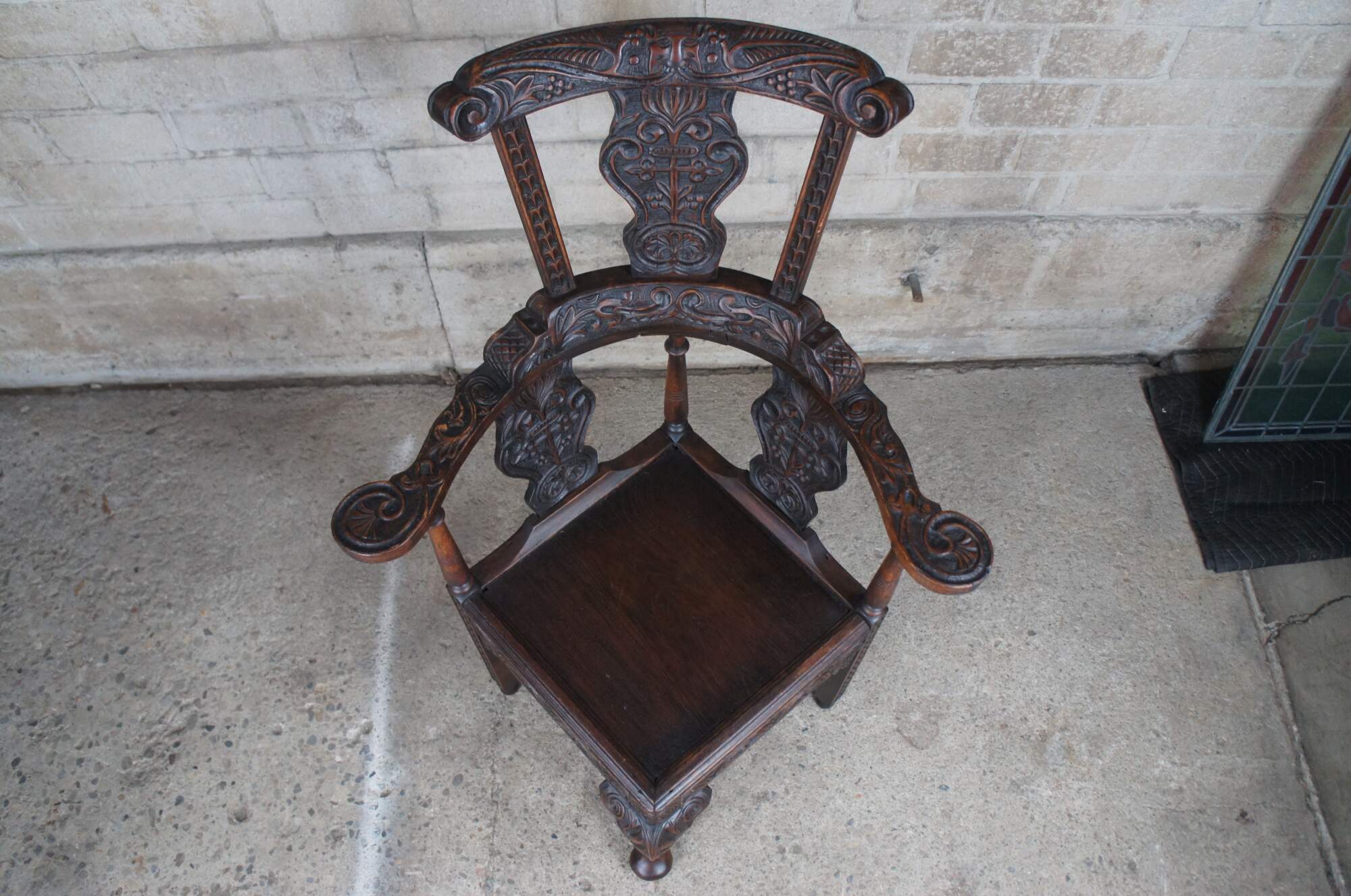 Exceedingly Rare English Yorkshire Wainscot High back corner armchair, circa 17th century. Made of oak with an impressive hand carved back that features a whimsical figure along the crest over a foliate and berries motif, C and S scrolls, turned supports, and hand tooling throughout. The chairs apron showcases a scalloped shell at the corner between an arcade of palladiums over a flower and lower leafy spandrels. The chair is supported by four legs with a pronounced central cabriole leg and acanthus carved knee leading to pad foot. Includes a leather removable seat cushion.