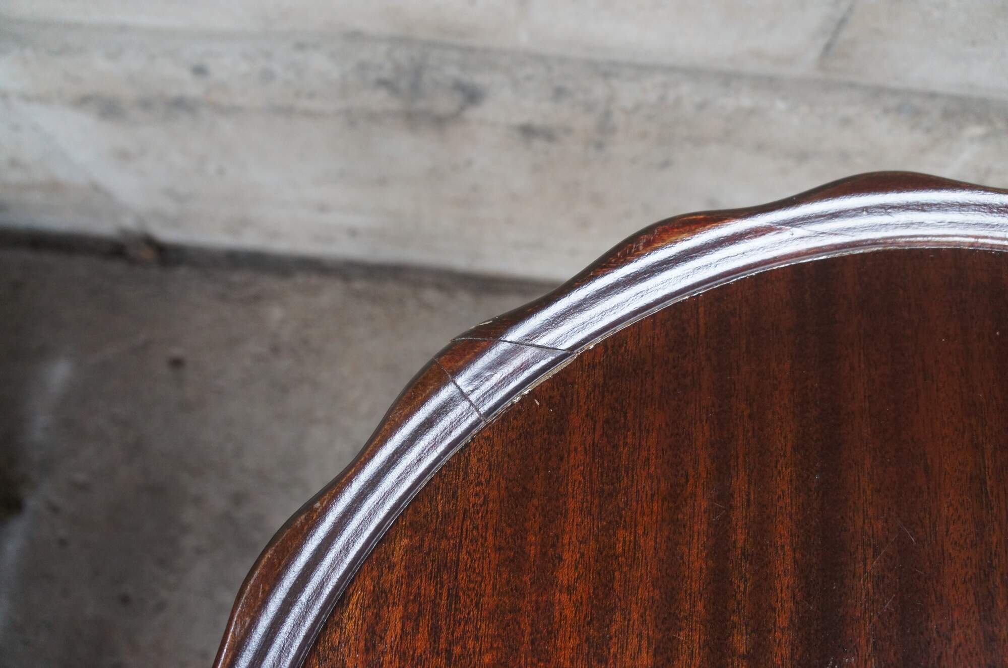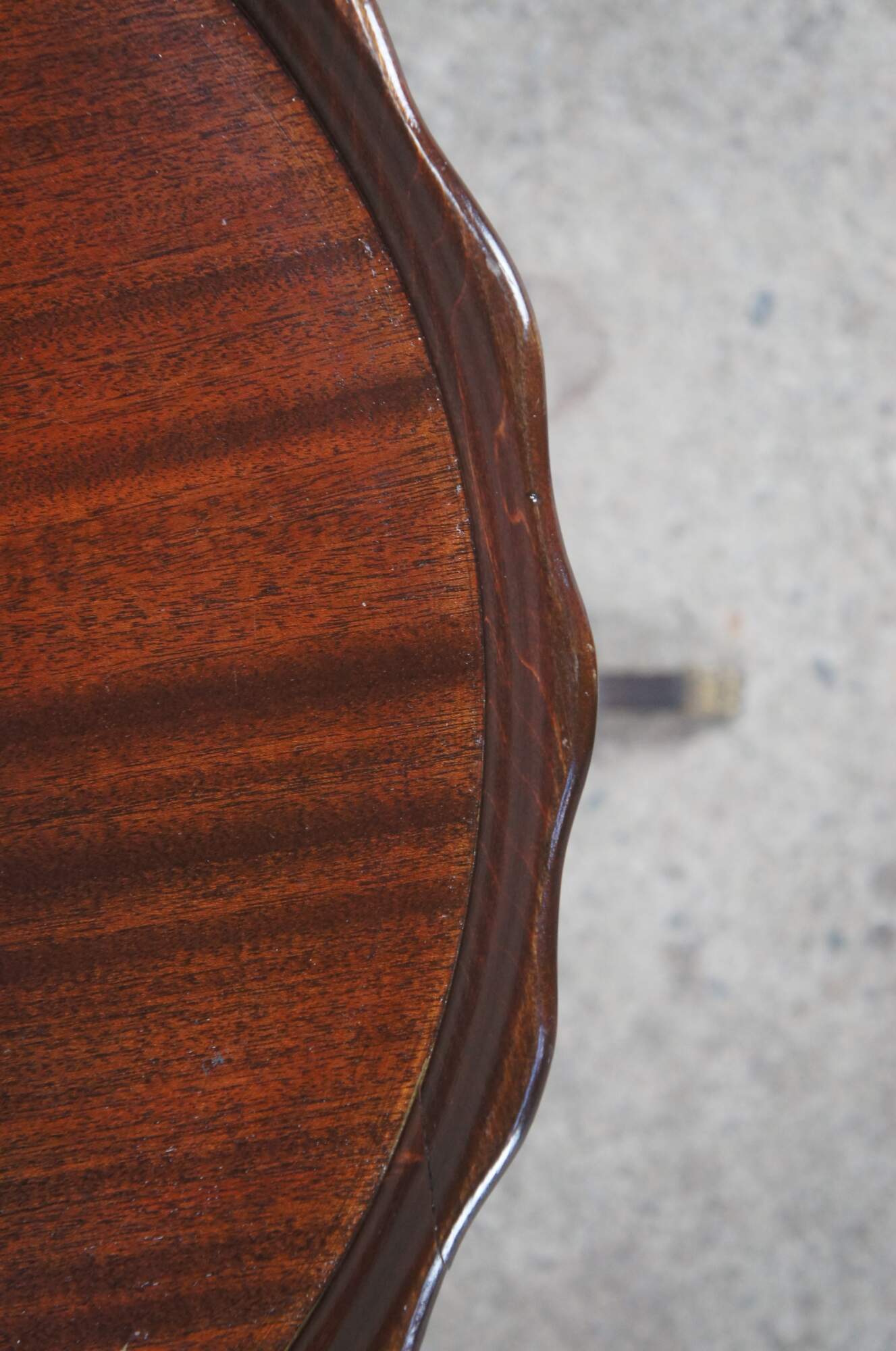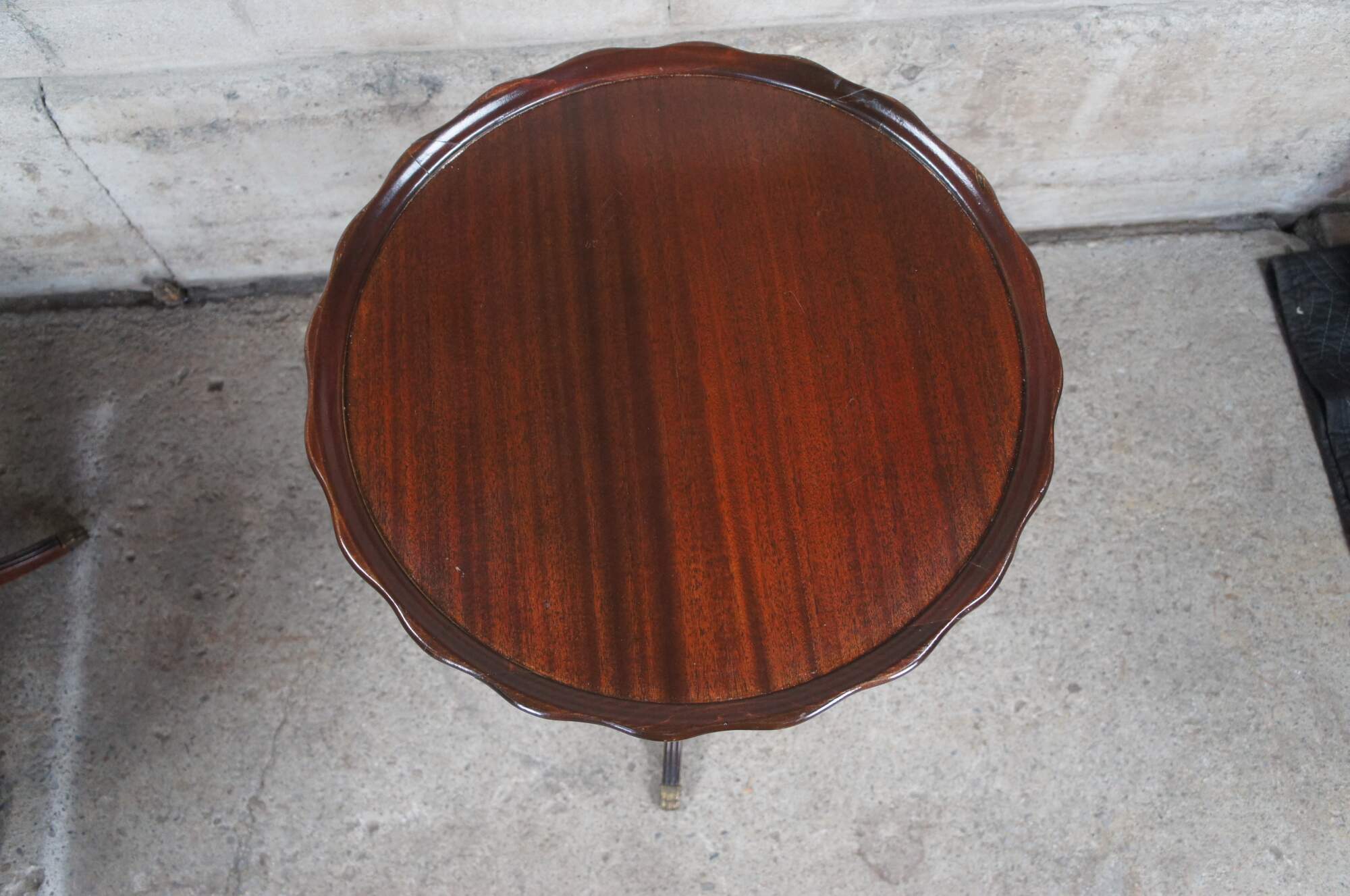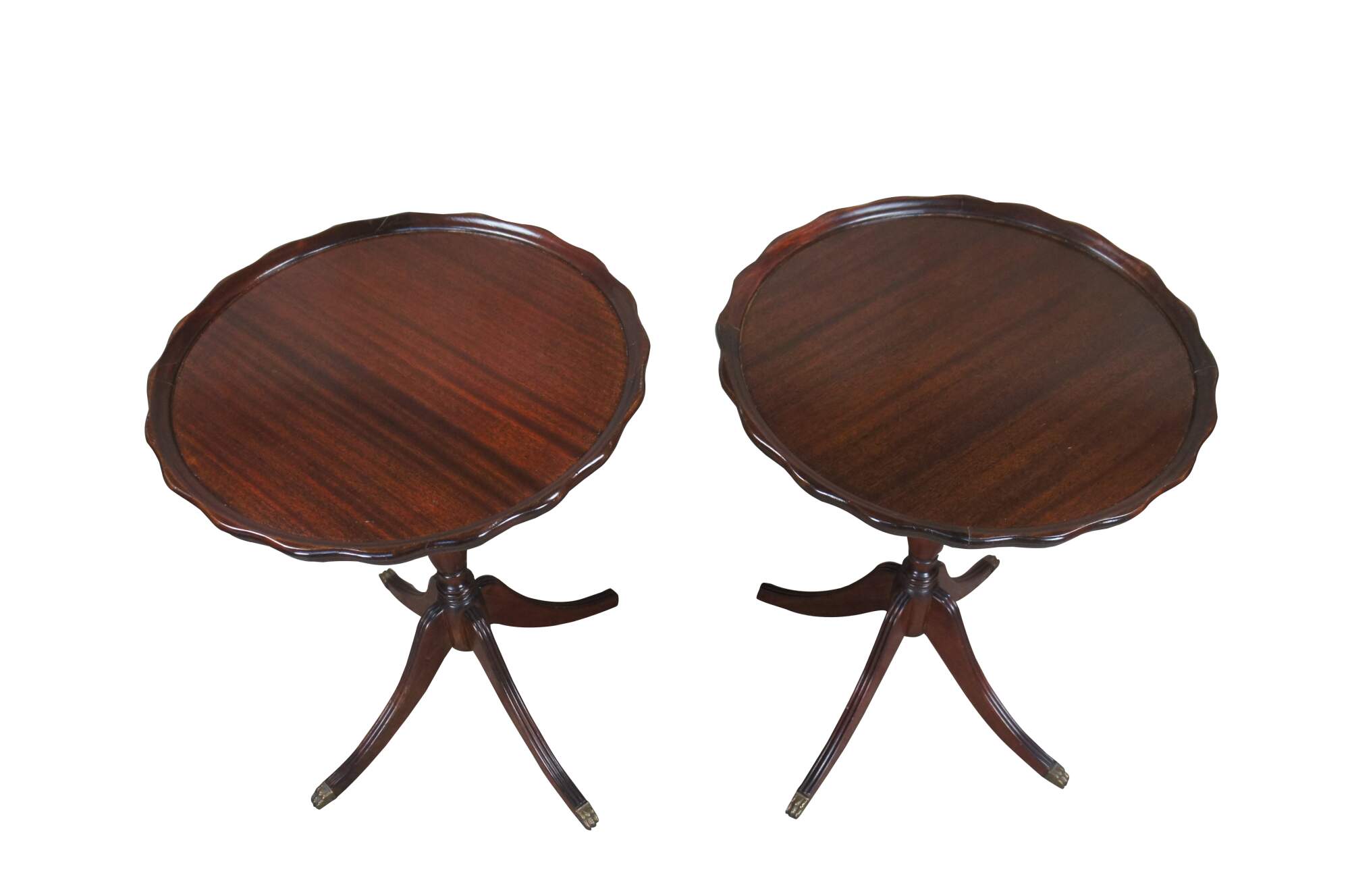 1940s Duncan Phyfe style pie crust tables. Made from mahogany with an inset scalloped top over a turned support with downswept fluted Duncan Phyfe legs and brass capped paw feet.