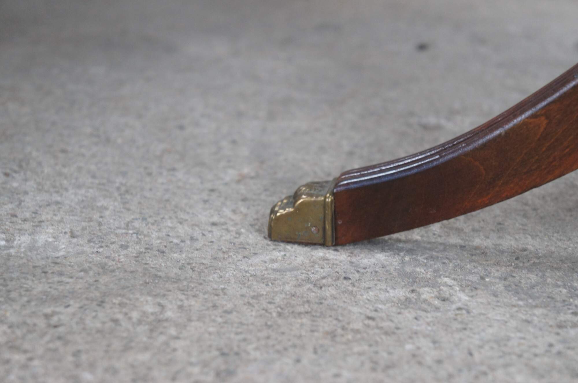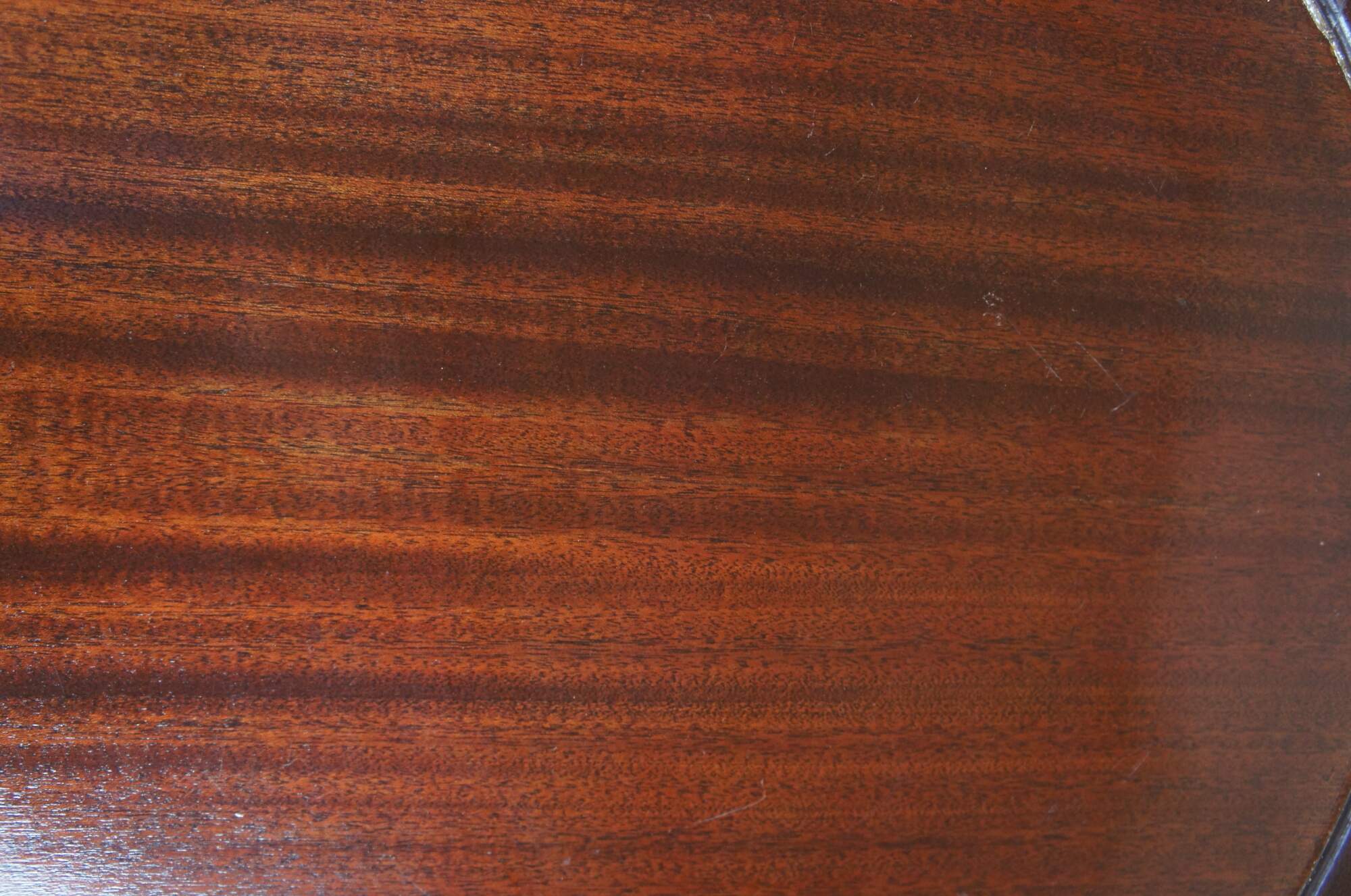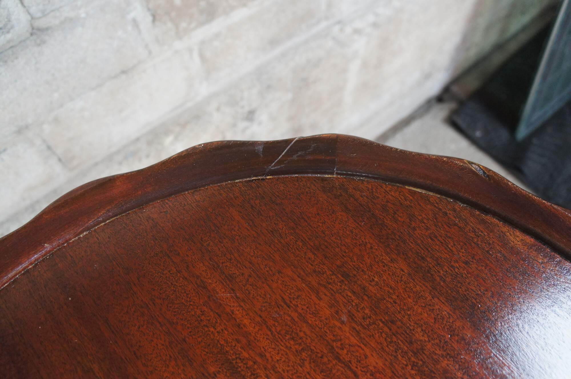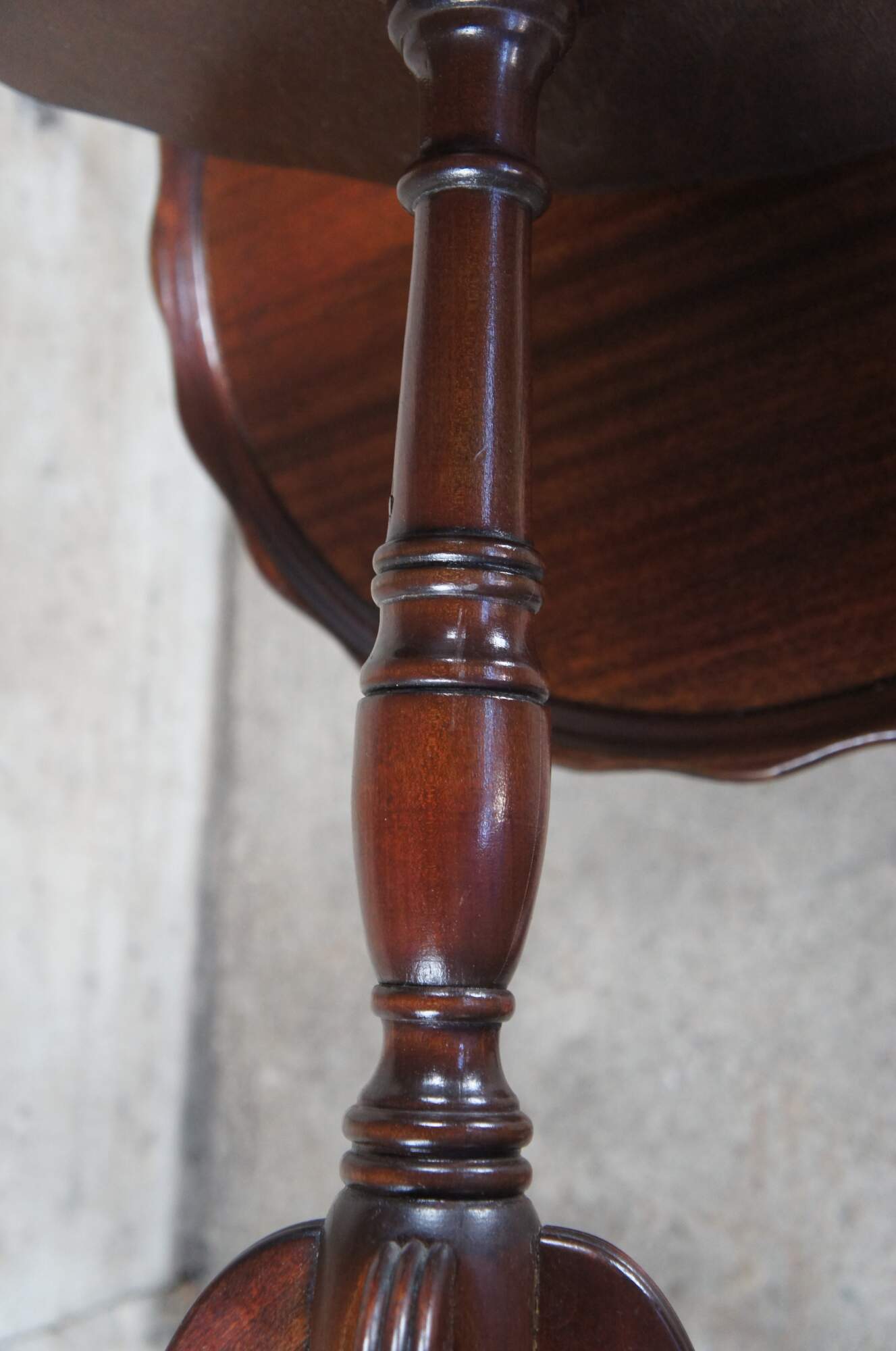 1940s Duncan Phyfe style pie crust tables. Made from mahogany with an inset scalloped top over a turned support with downswept fluted Duncan Phyfe legs and brass capped paw feet.