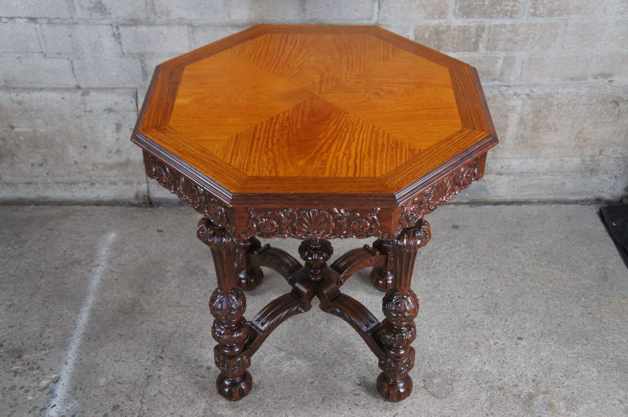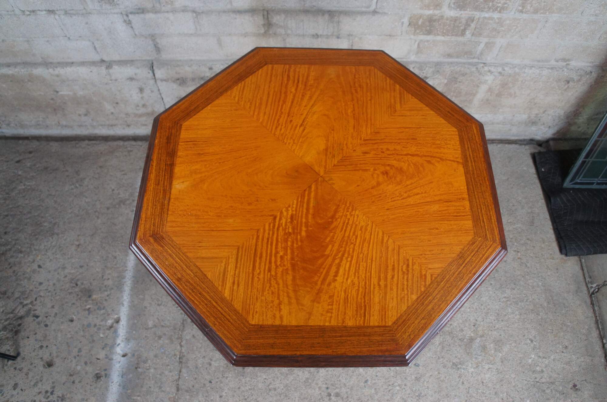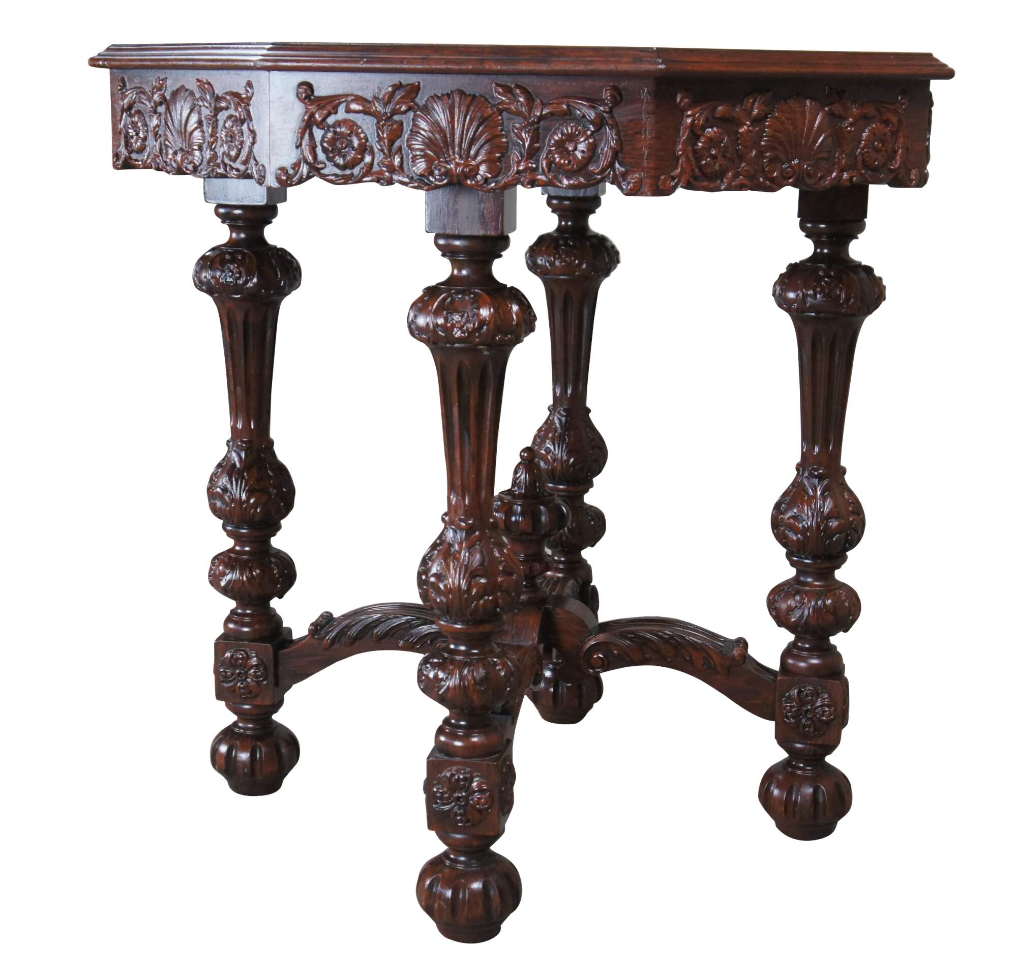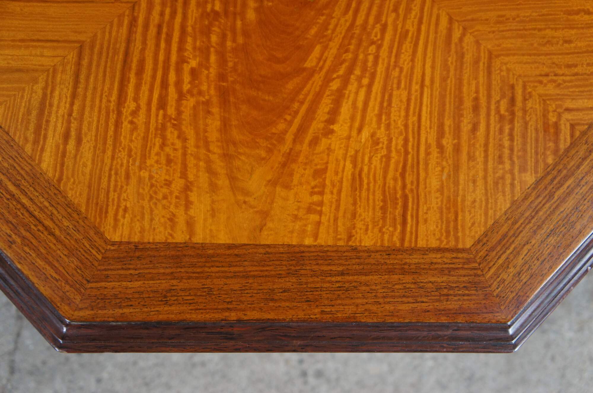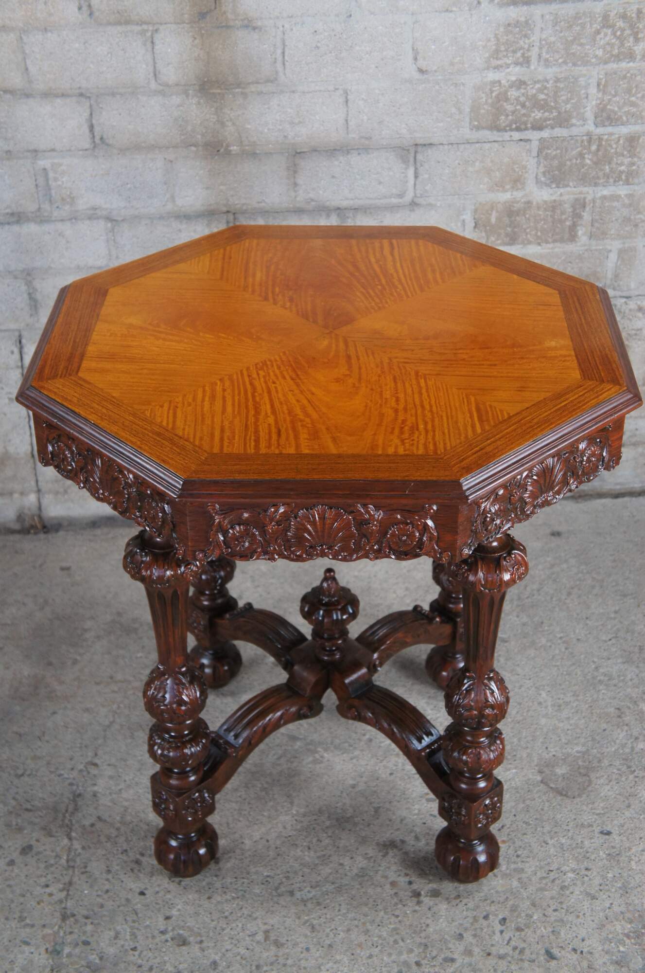 An impressive Octagonal center or side table by Johnson Hadley Johnson, circa 1930s. Made from walnut with a matchbook veneered satinwood top. Drawing inspiration from French and Italian Baroque styling. Features a scalloped carved and foliate swag apron over robust carved and turned legs with fluting and acanthus leaf accents over bun feet. Each leg is connected by a central stretcher with beautifully turned trophy shaped finial. Marked along the base with brass tag, #2744.