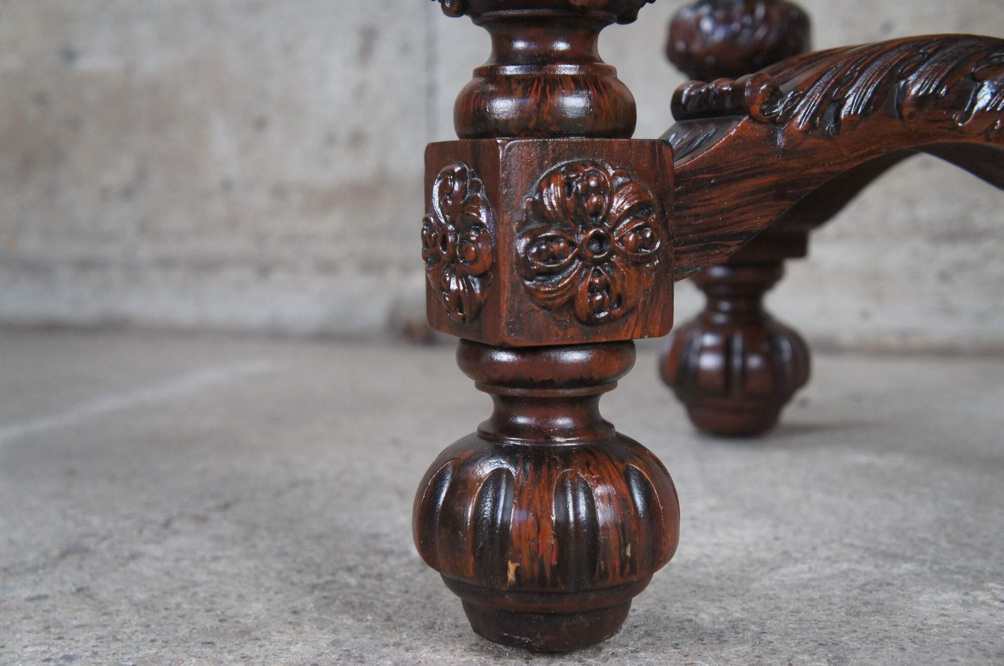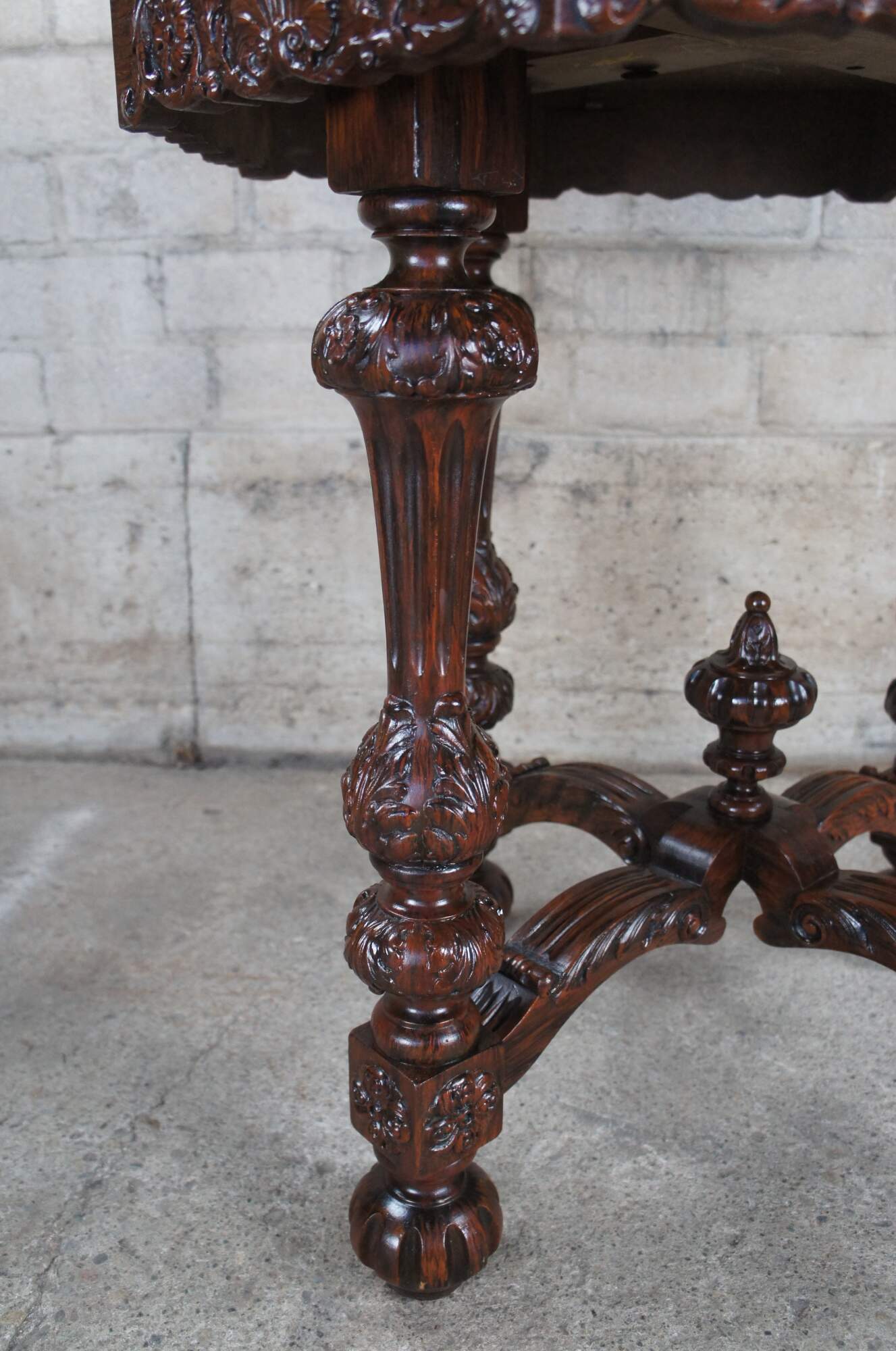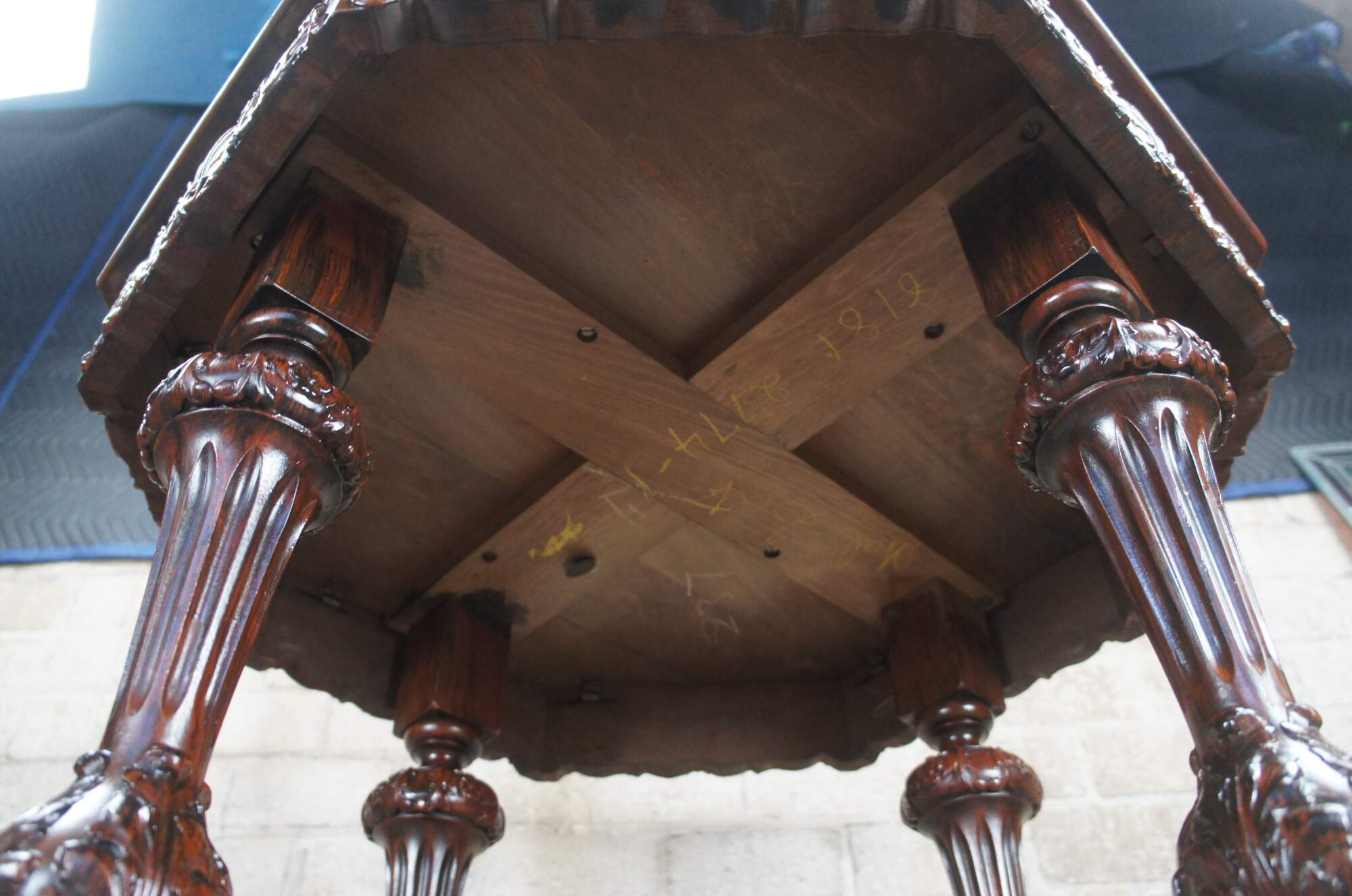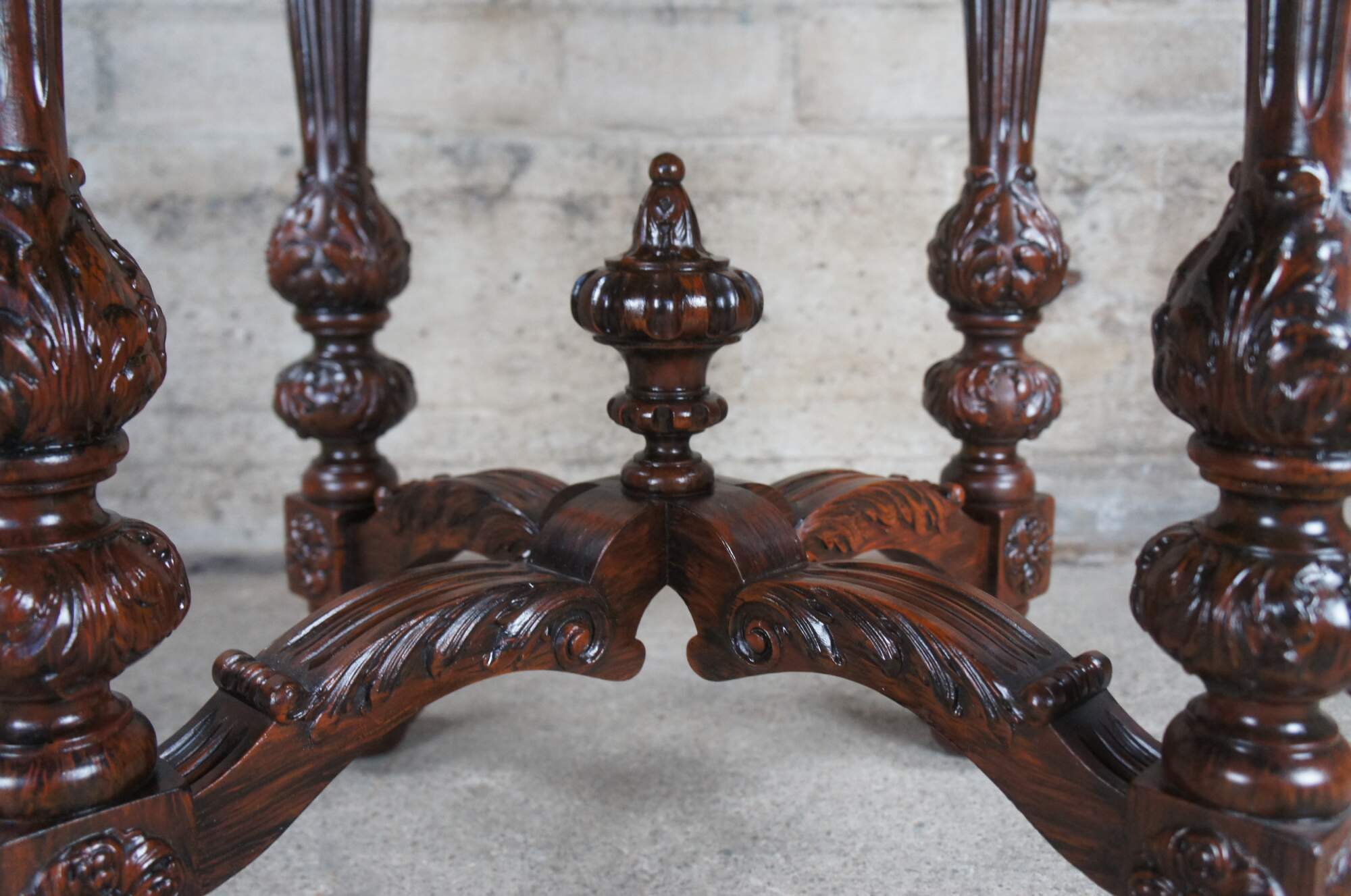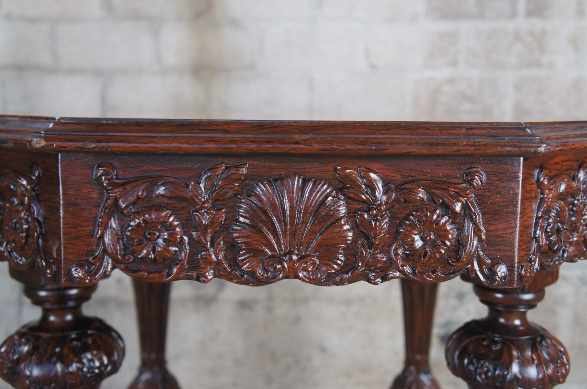 An impressive Octagonal center or side table by Johnson Hadley Johnson, circa 1930s. Made from walnut with a matchbook veneered satinwood top. Drawing inspiration from French and Italian Baroque styling. Features a scalloped carved and foliate swag apron over robust carved and turned legs with fluting and acanthus leaf accents over bun feet. Each leg is connected by a central stretcher with beautifully turned trophy shaped finial. Marked along the base with brass tag, #2744.