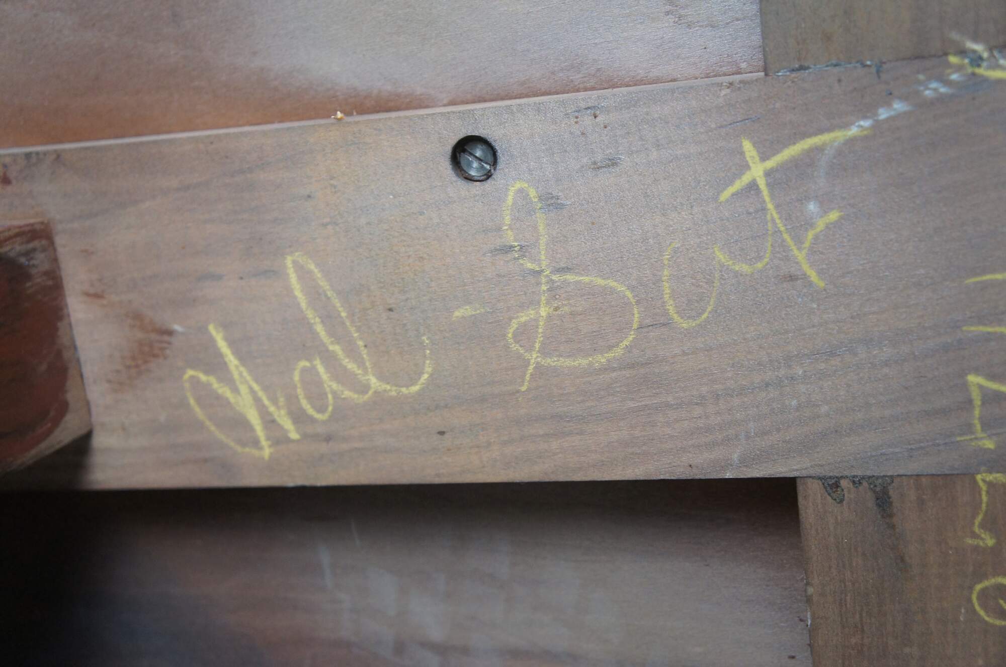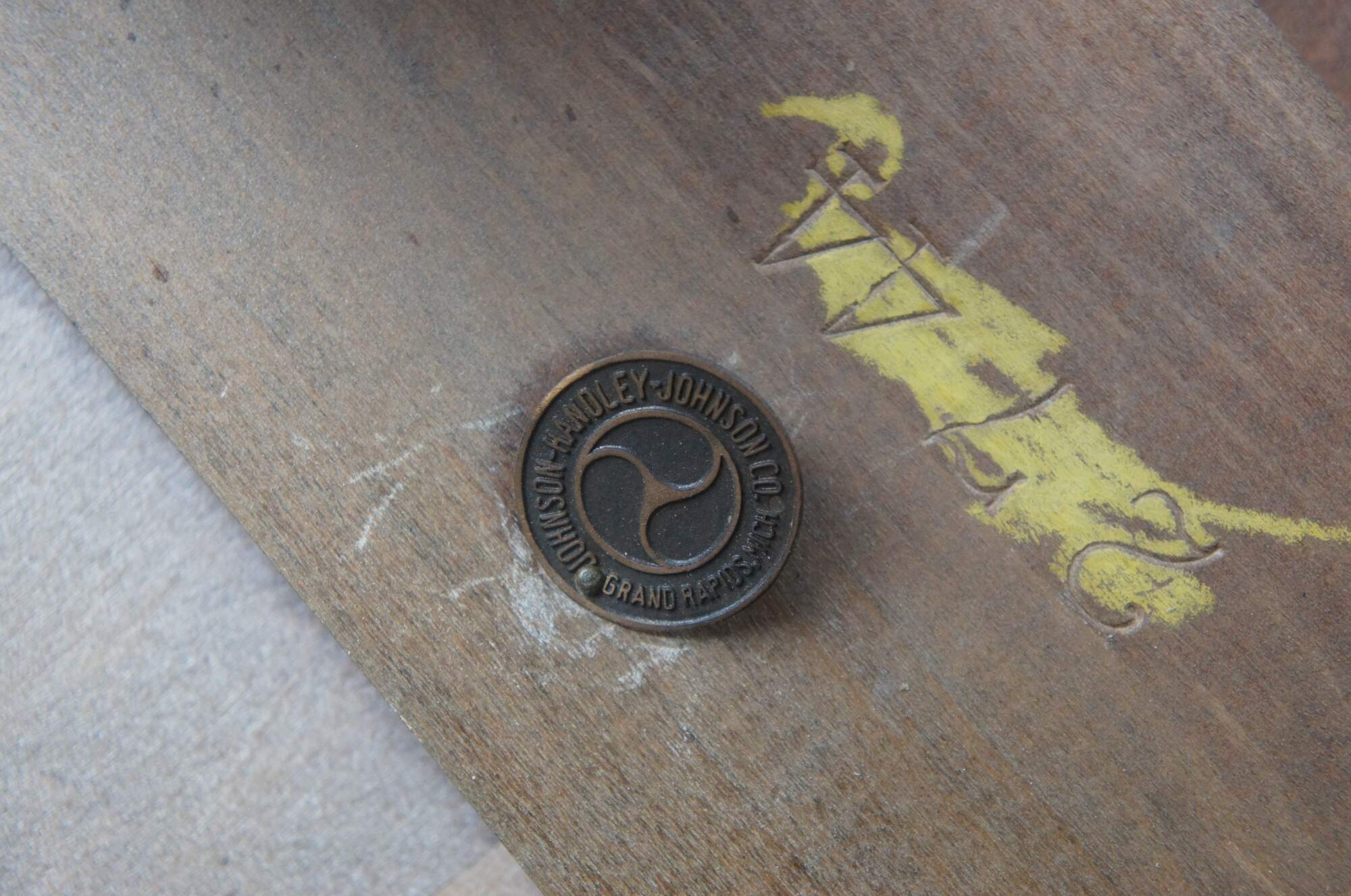 Johnson Furniture was founded in 1908 by three brothers (Carl, Hjalmar, and Axel) who emigrated from Sweden in 1887. Specializing in period revivals from the styles of Sheraton, Hepplewhite, Empire, Colonial and other European designs. Carl had received a medal for his cabinetmaking skills from the King of Sweden before moving stateside. He worked closely with their in house designer Tom Handley to create these beautiful masterpieces. Tom's designs featured intricate marquetry and elaborate carvings, like the one offered above. He became an officer of the company in 1922, holding this position until his death in 1926. At this point their label changed to Johnson Handley Johnson paying homage to him. The company remained in business until 1983.