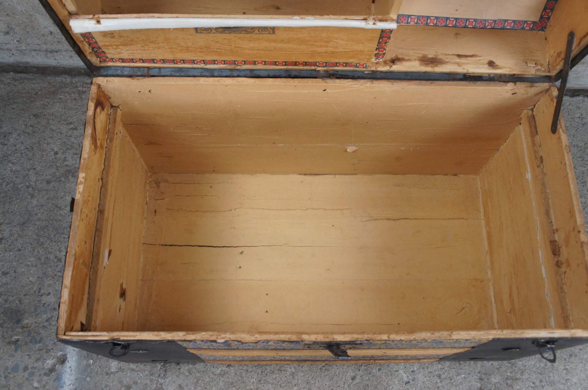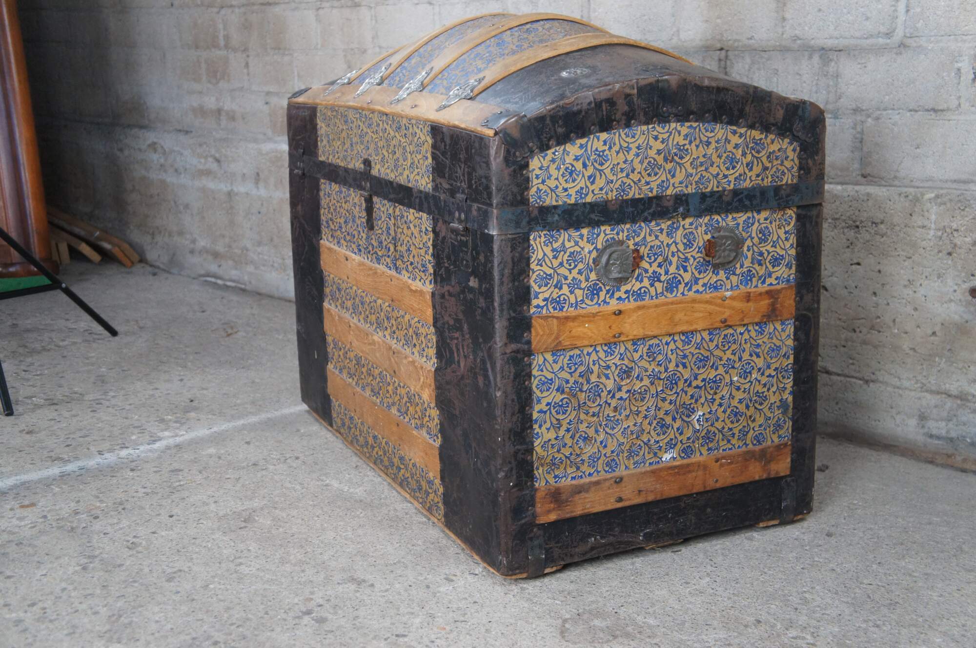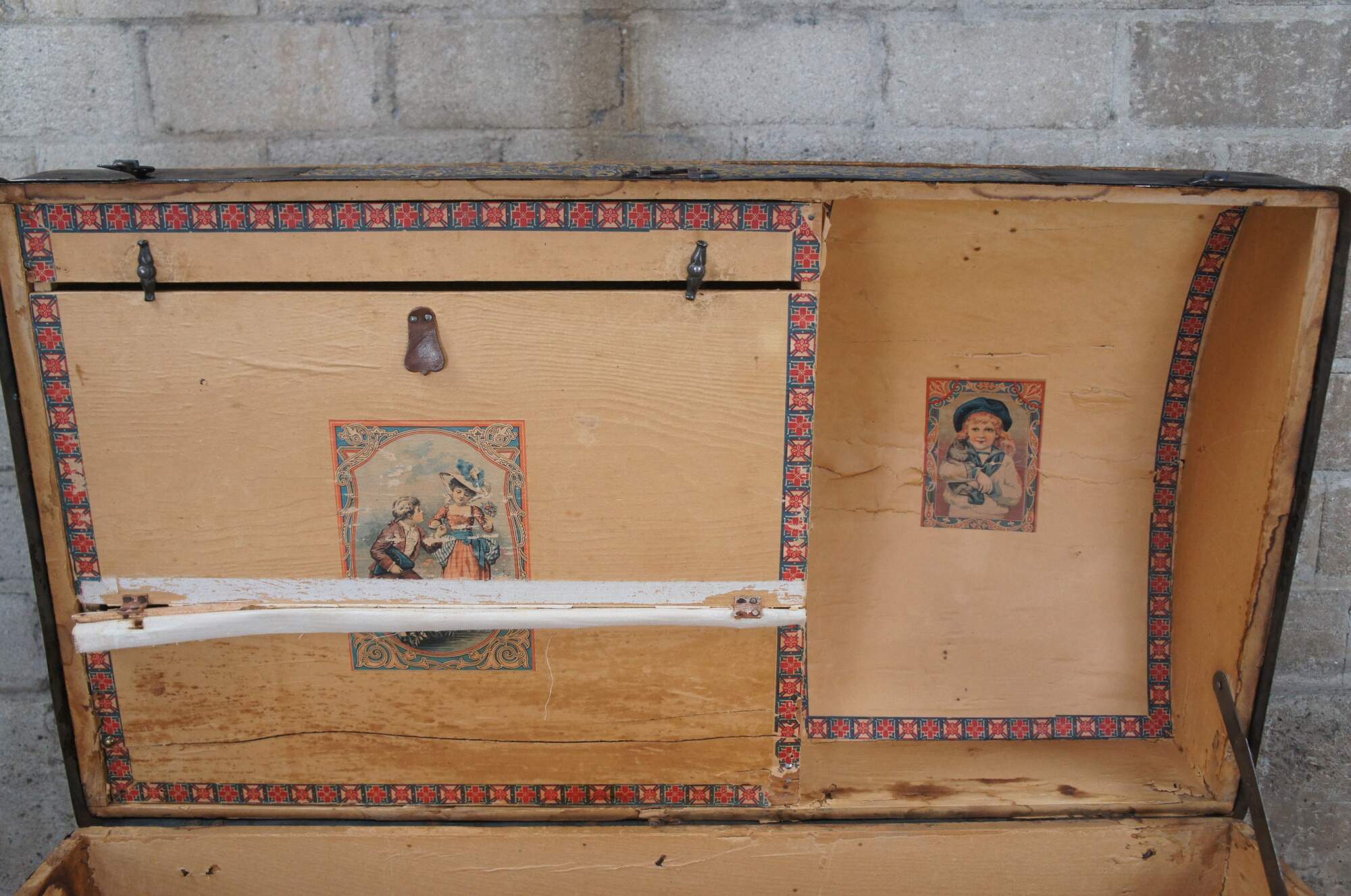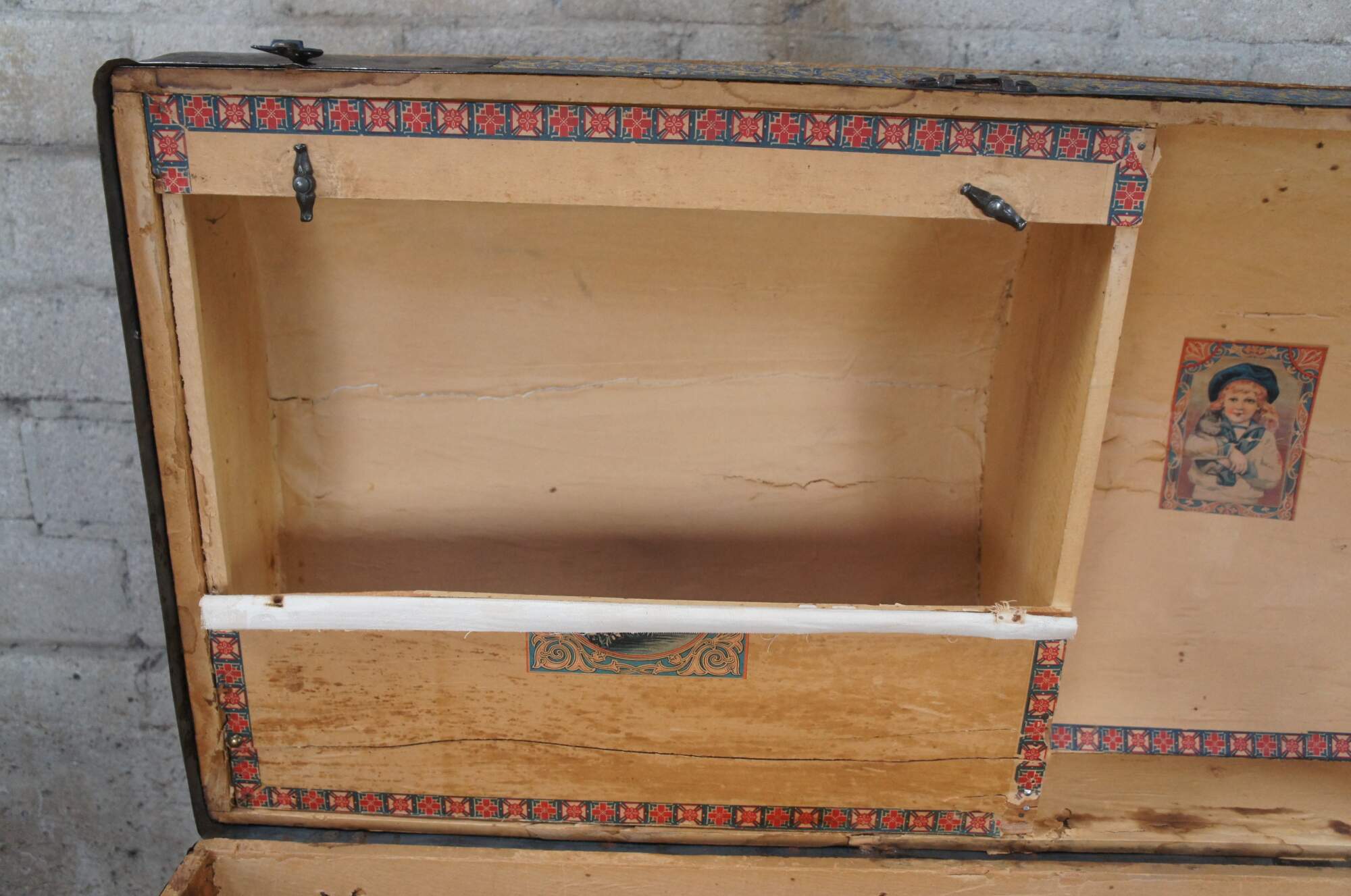 Good Overall; wear commensurate with age and use. Missing leather handles. Central lock is broken and latches don't align perfectly. Interior compartment on the lid is split / loos. Some peeling paper on interior.