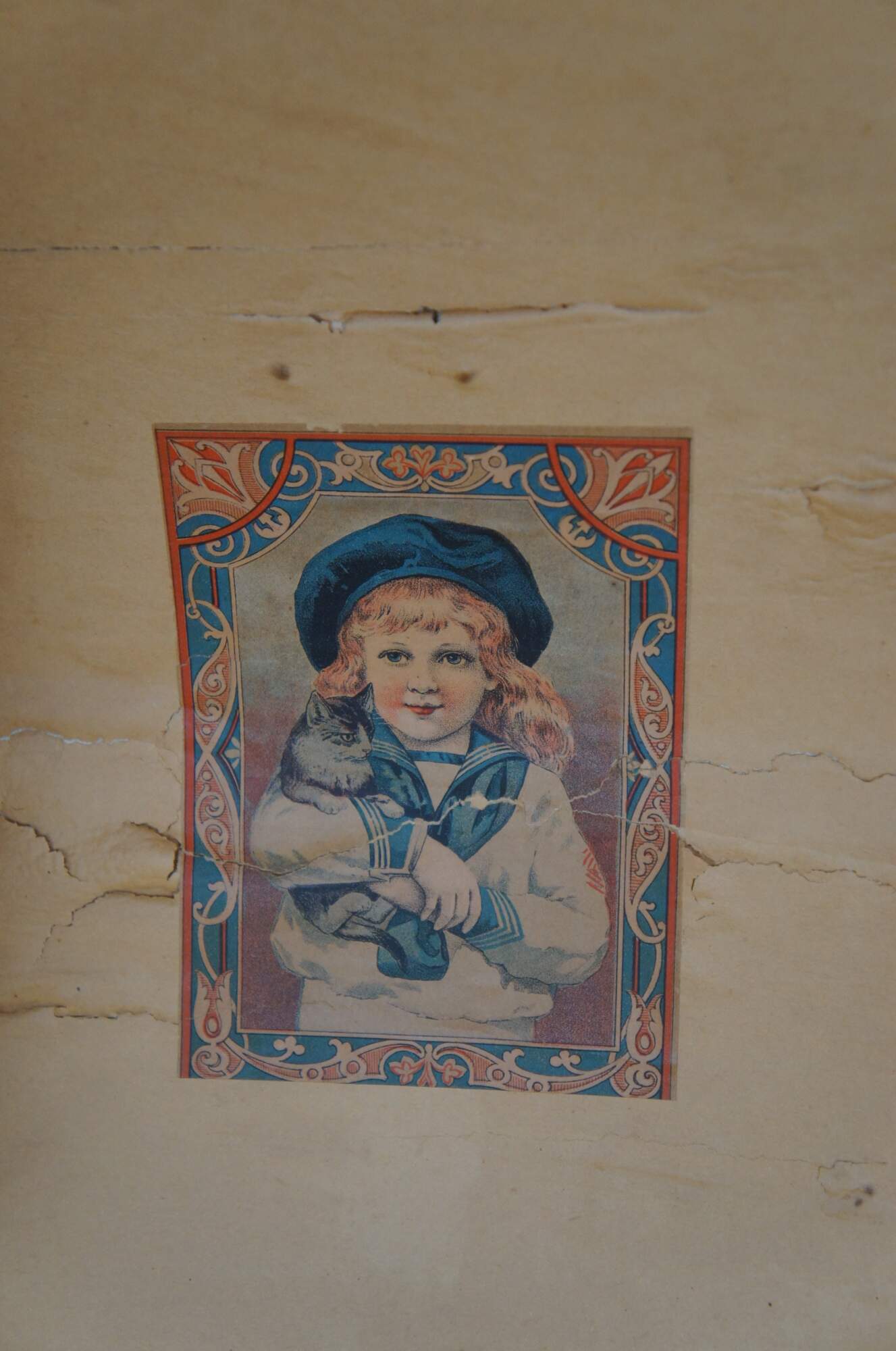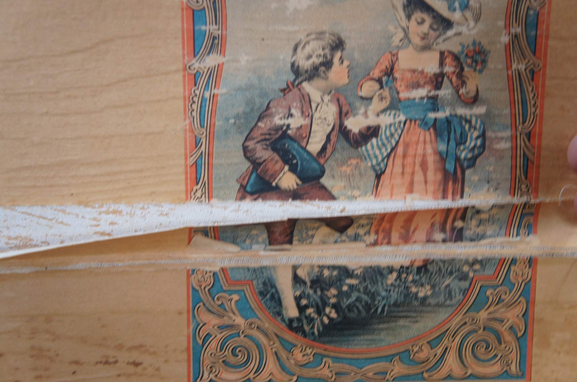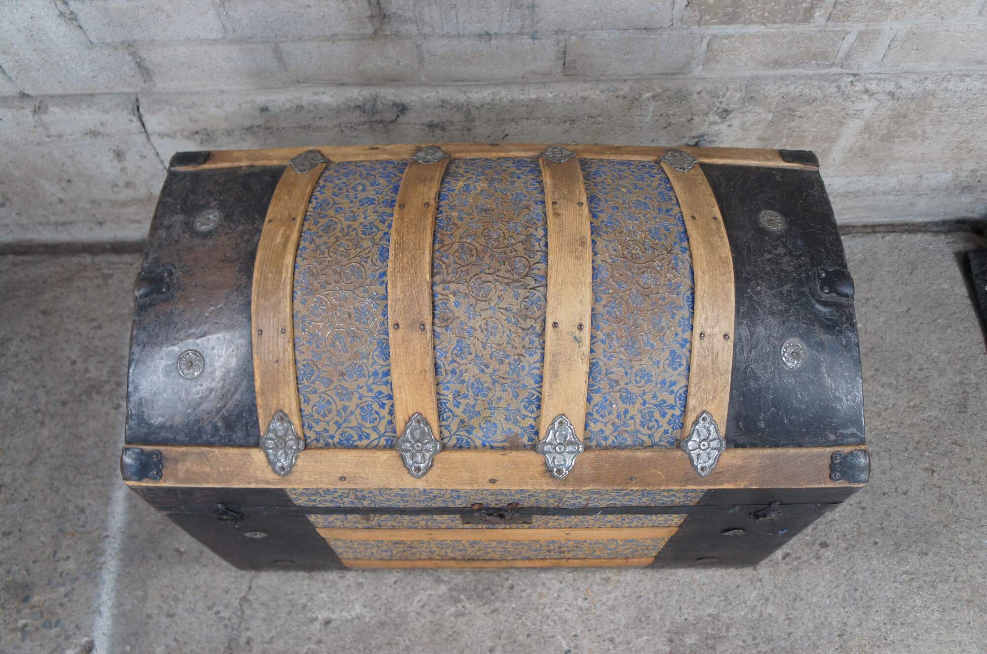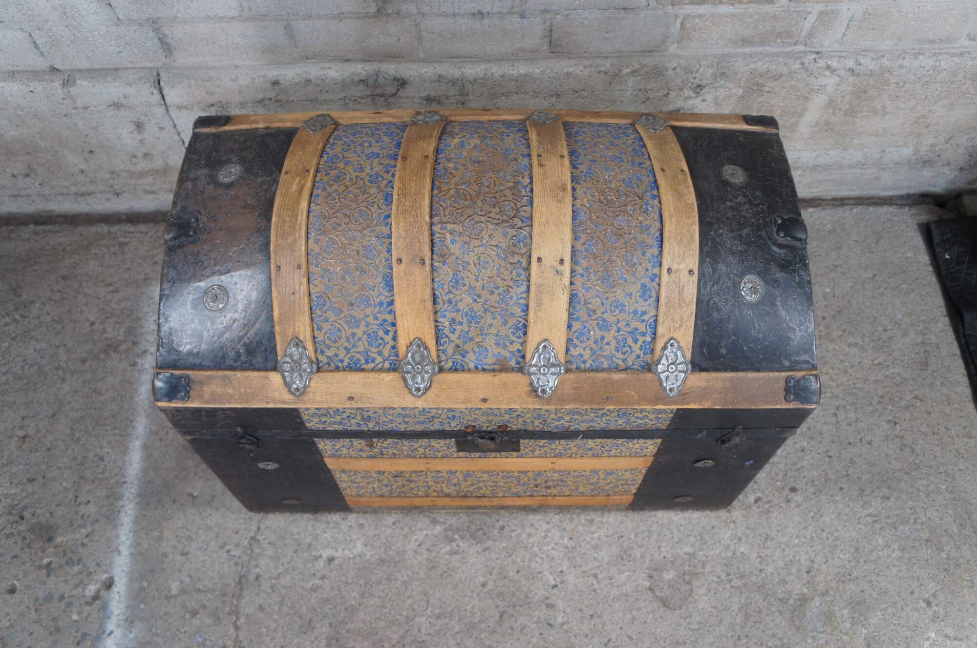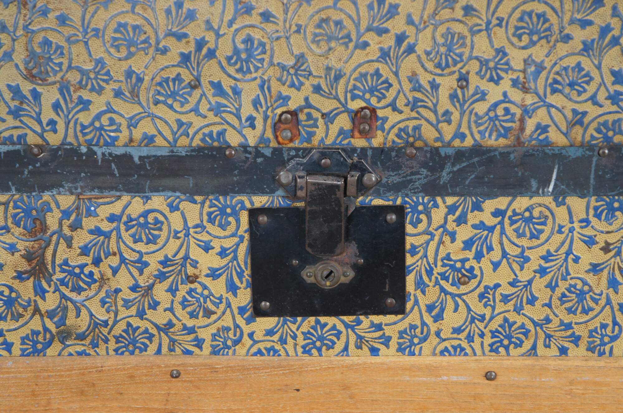 Good Overall; wear commensurate with age and use. Missing leather handles. Central lock is broken and latches don't align perfectly. Interior compartment on the lid is split / loos. Some peeling paper on interior.