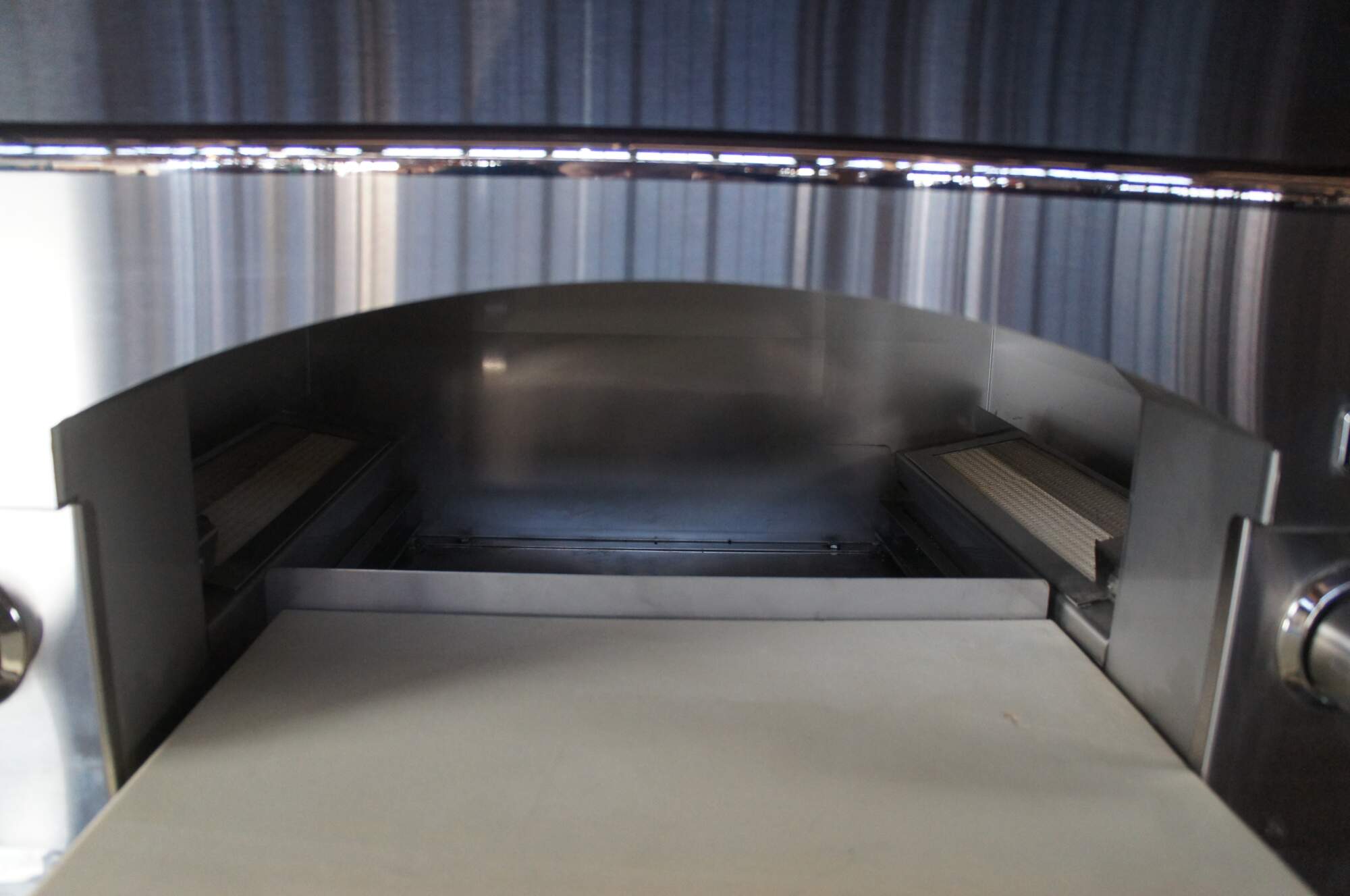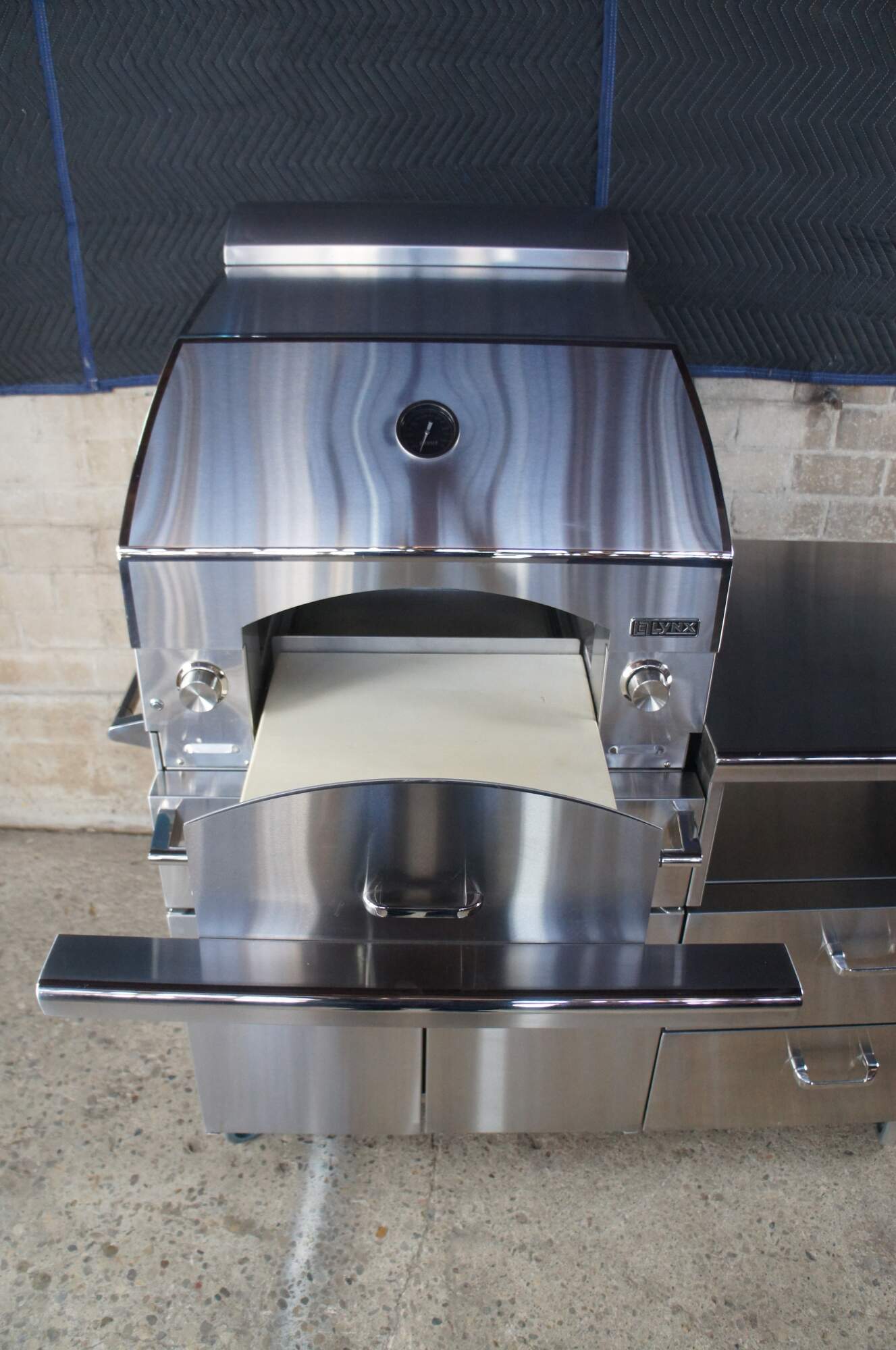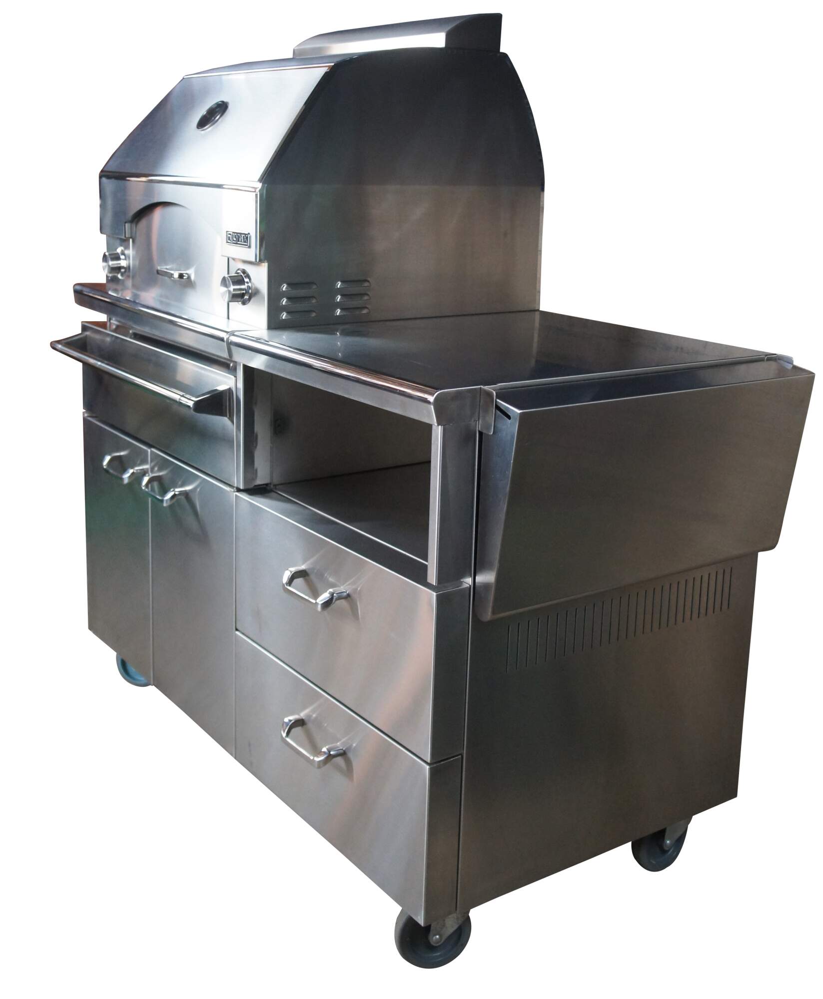 This freestanding natural gas pizza oven will be the center of attention at your next gathering. With the capacity to bake a 18 inch pie, the inside hosts a specially formulated concrete heat-retaining dome and 400 square inch cooking surface which is perfect for the high heat demanded. The variable infrared heating system is designed to quickly preheat to 700 degrees Fahrenheit, saving energy. The front door seals the pizza oven closed, focusing the heat on the pizza. Unique in the industry, the cooking surface pulls forward for easy access to last minute topping adjustments or pizza removal. Night-time pizza baking is no issue with blue LED control knob illumination and interior halogen light. The outside is made of stylish and sturdy stainless steel with hand-polished mirrored edges for a professional, yet fun, look. The pizza oven comes complete with the freestanding cart that has a surface for food prep, 3 drawers and adouble-door cabinet. Reversible top chimney lets you control where the smoke and heat go, so as not to mar walls or bother guests. Endless hours of quality cooking, conversations and fun is sure to follow when using this Napoli Pizza Oven by Lynx.