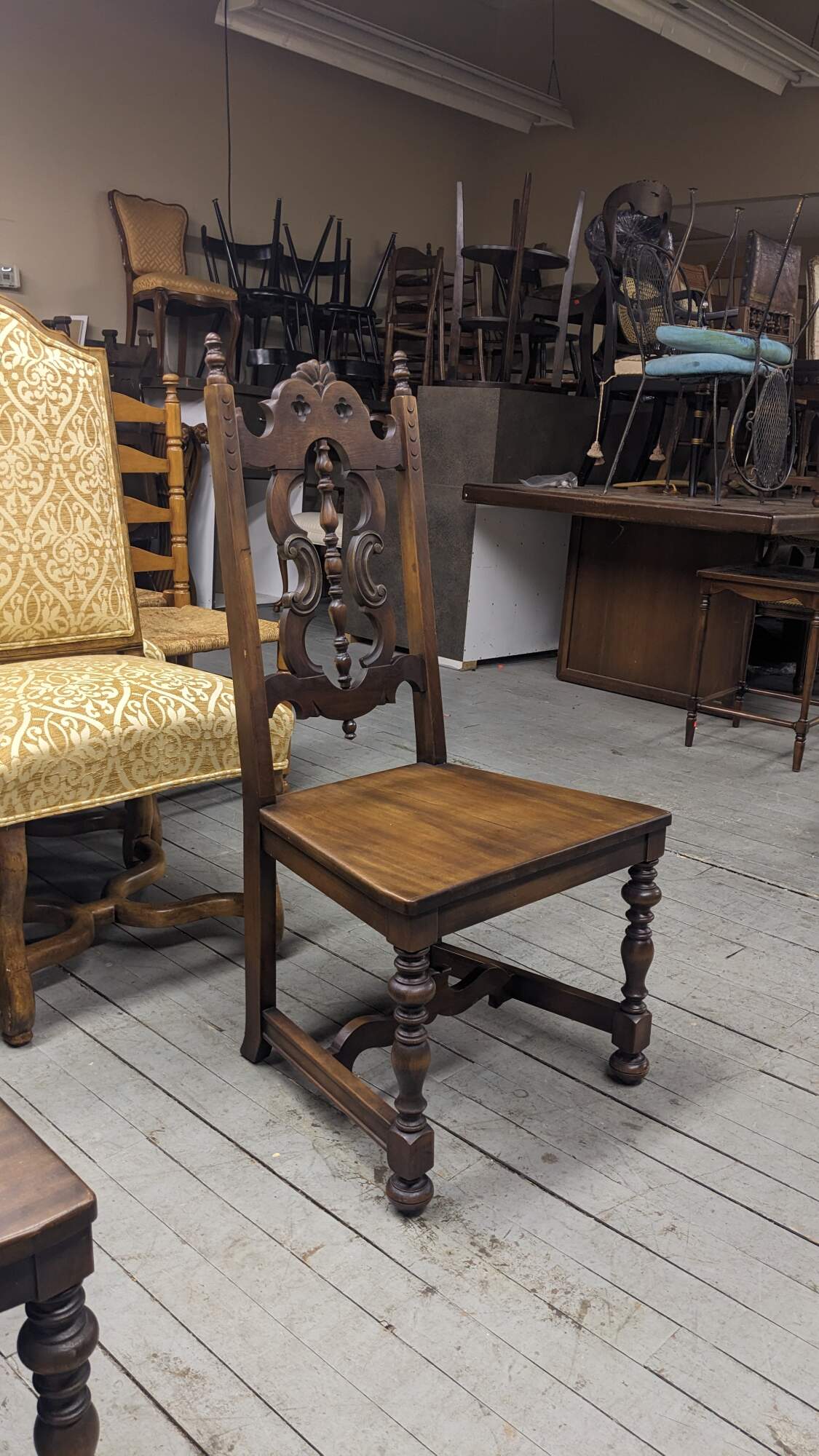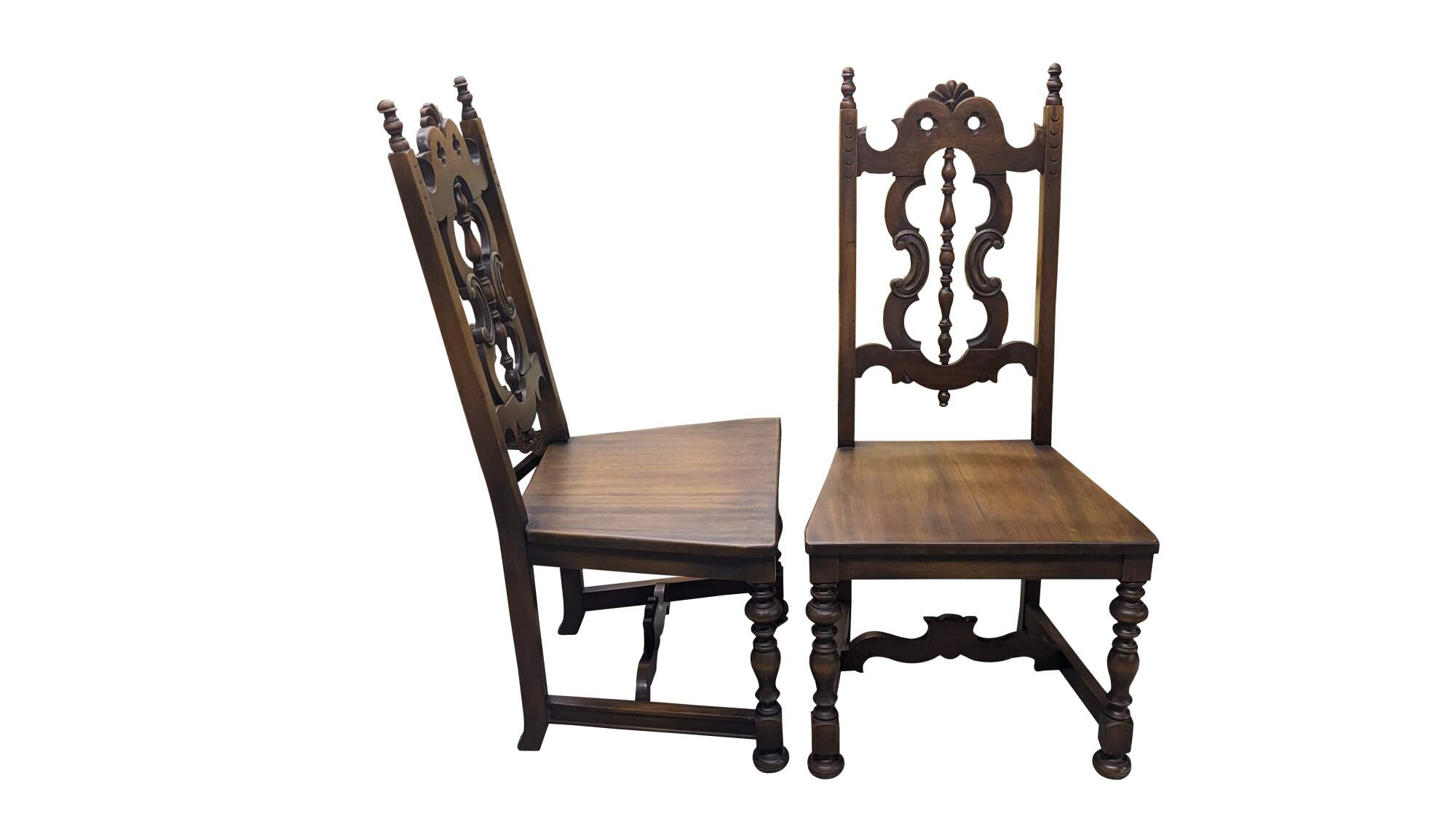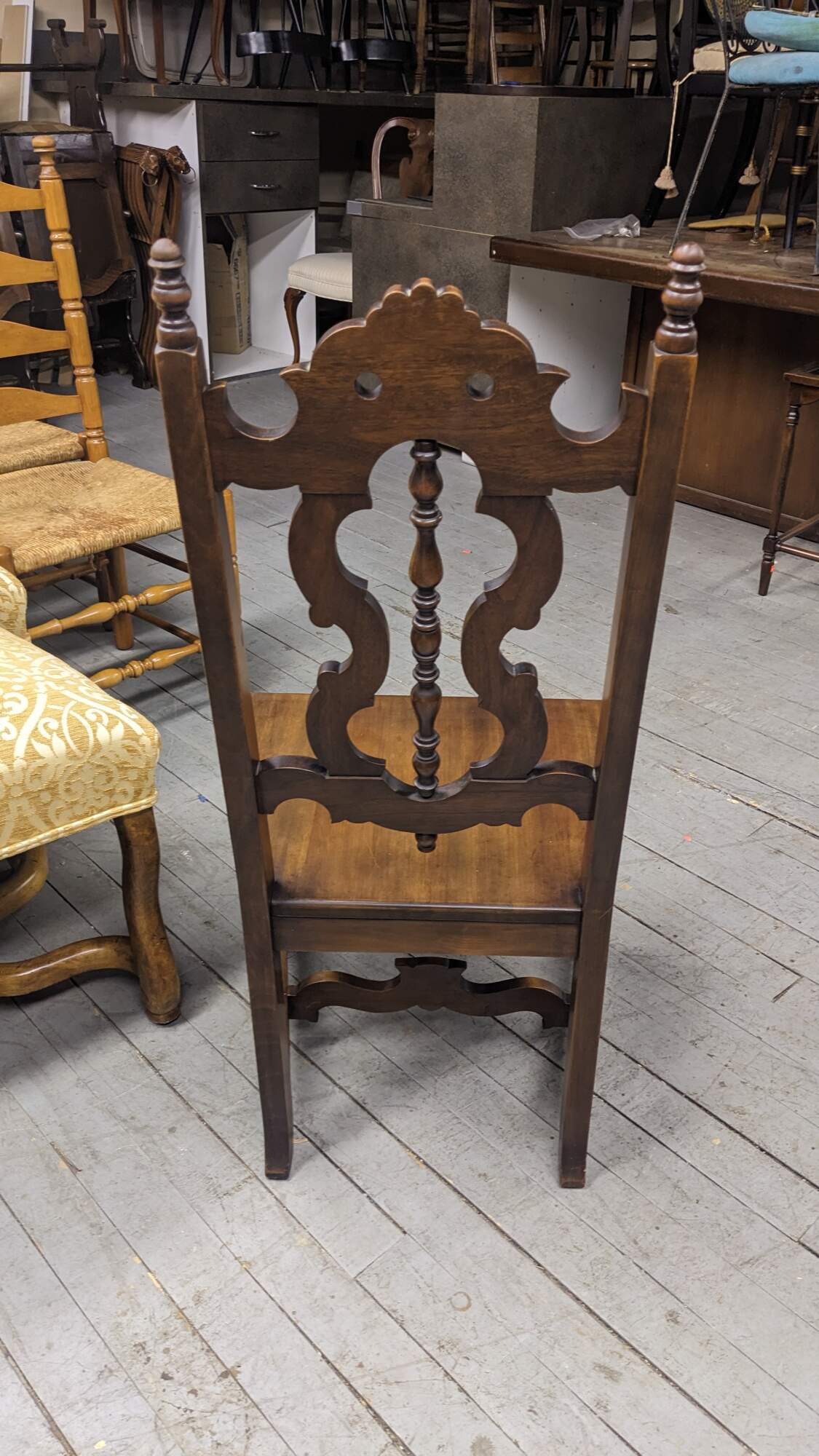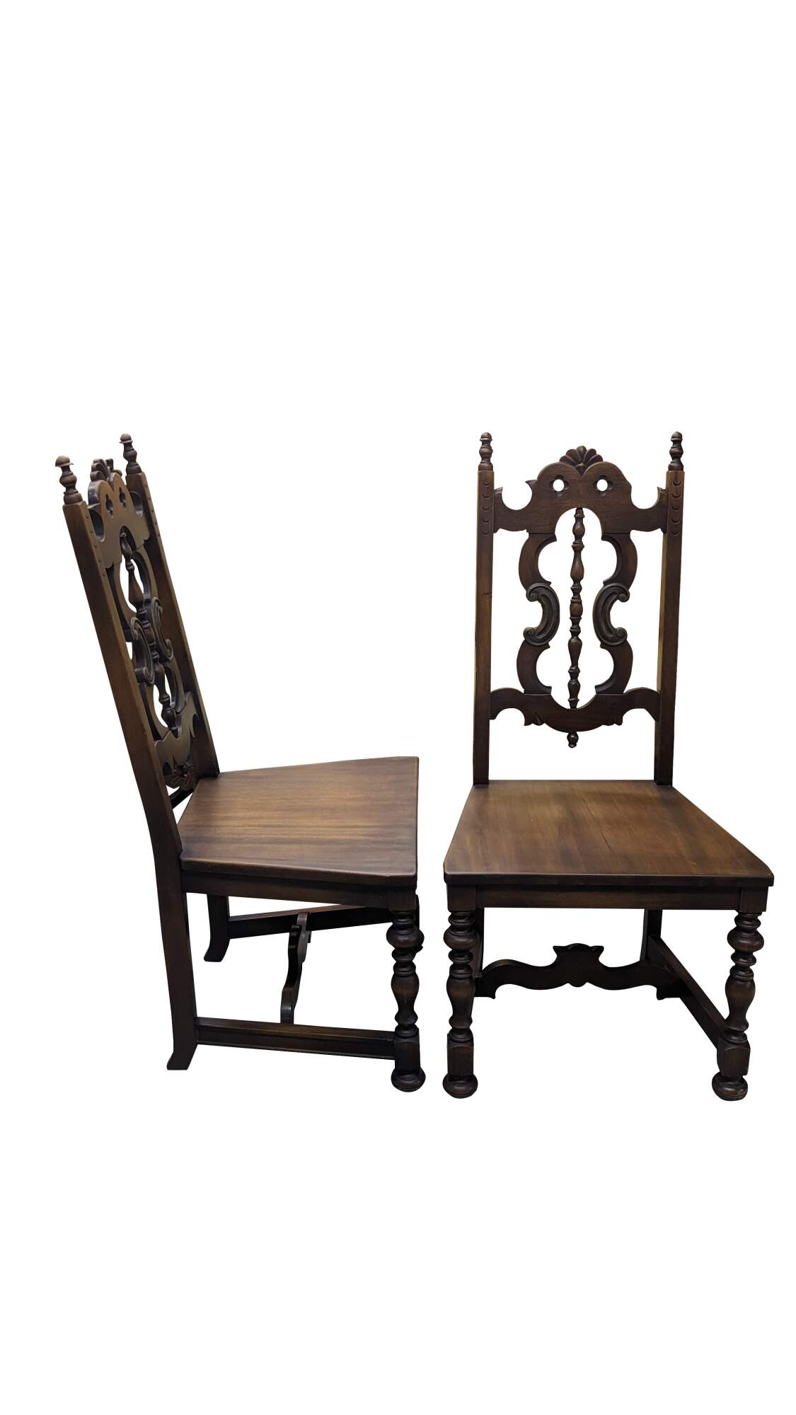 Set of 4 antique Life Time Furniture Jacobean / Spanish Revival dining chairs. Made of walnut featuring Jacobean styling with turned supports, pierced back, serpentine accents and finials.