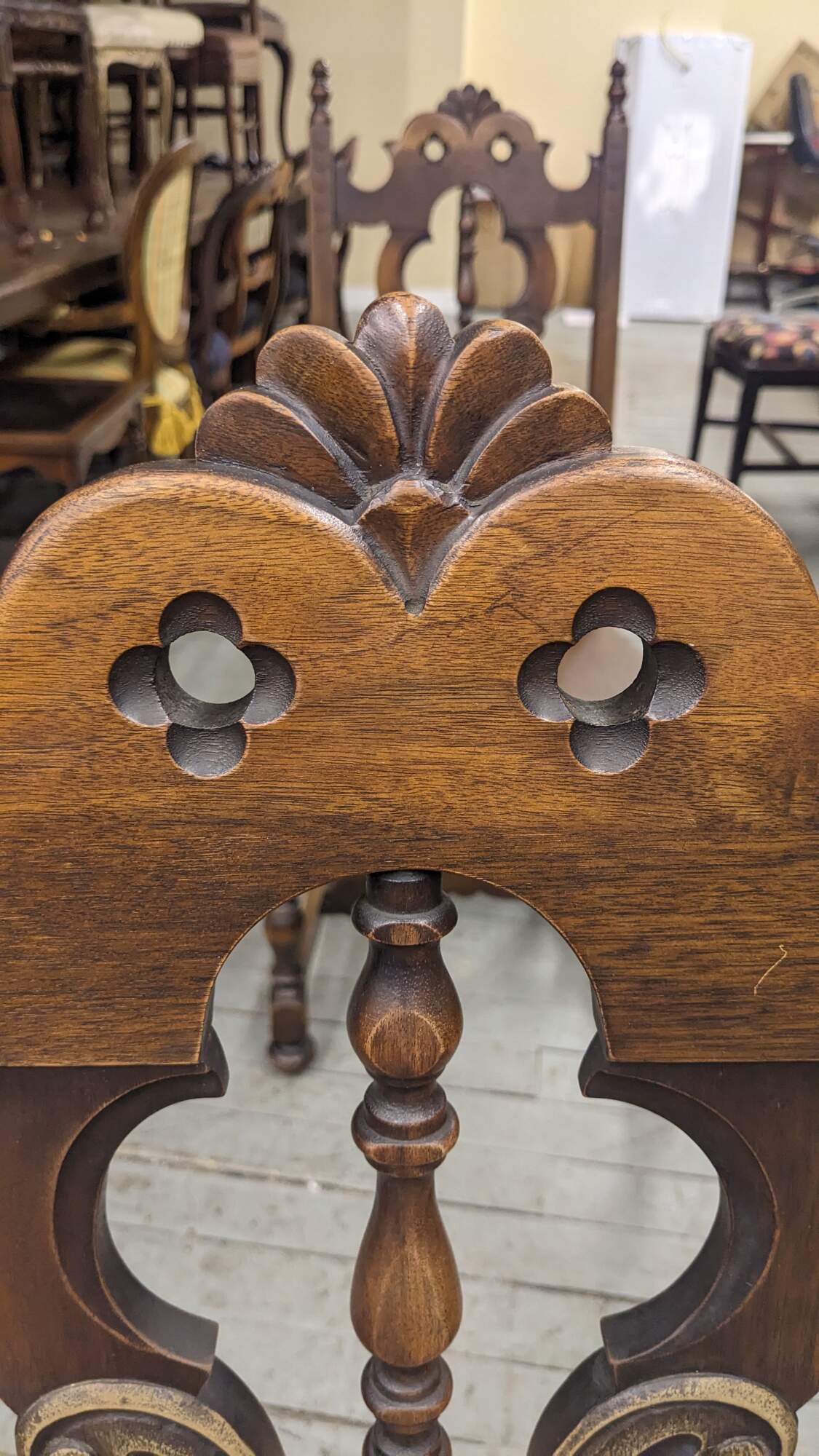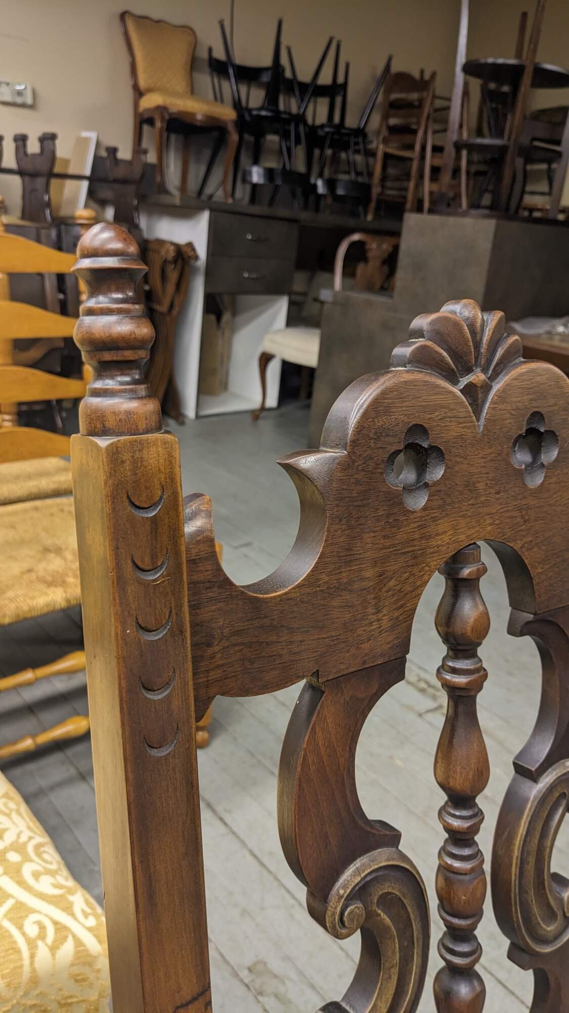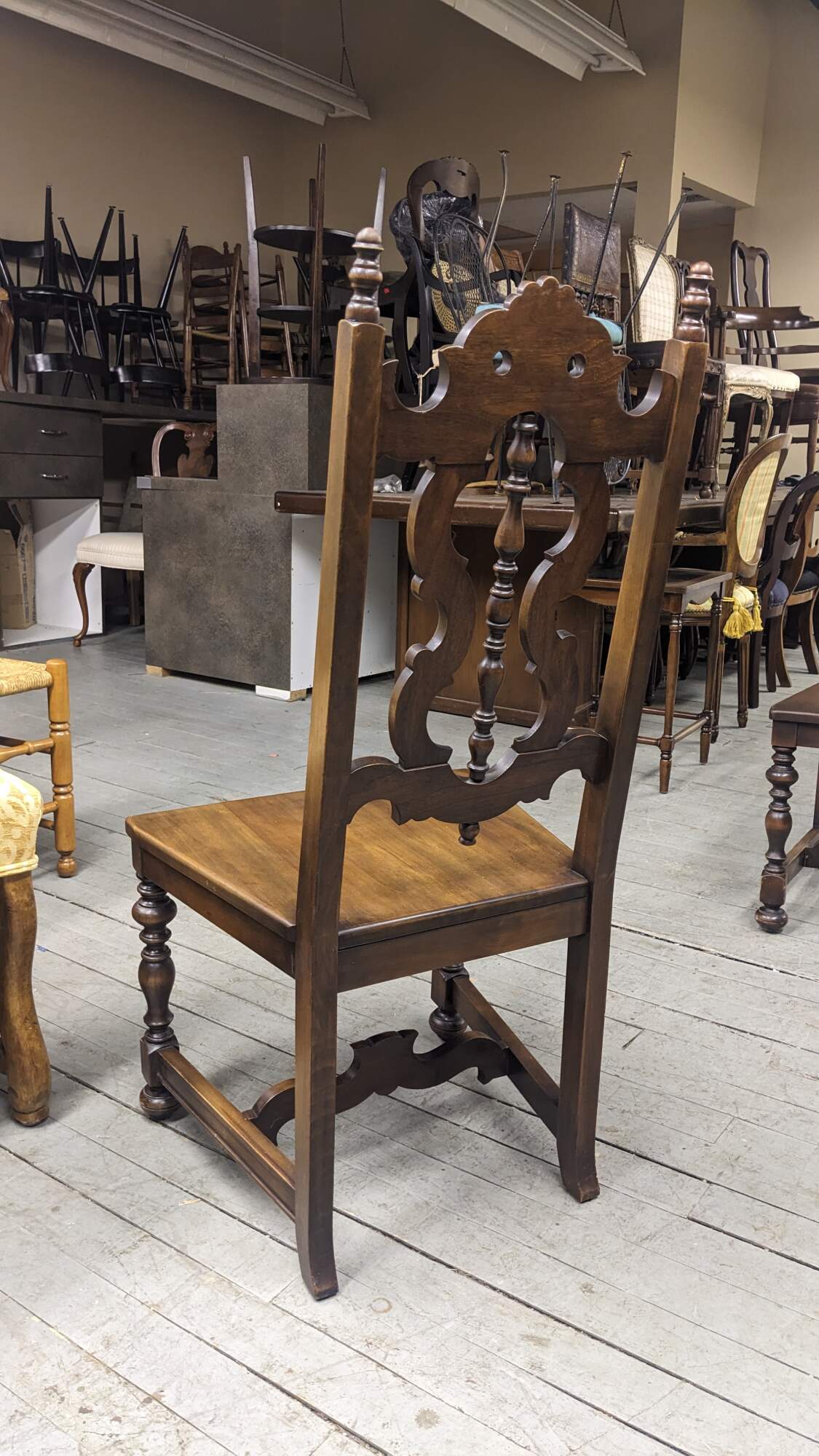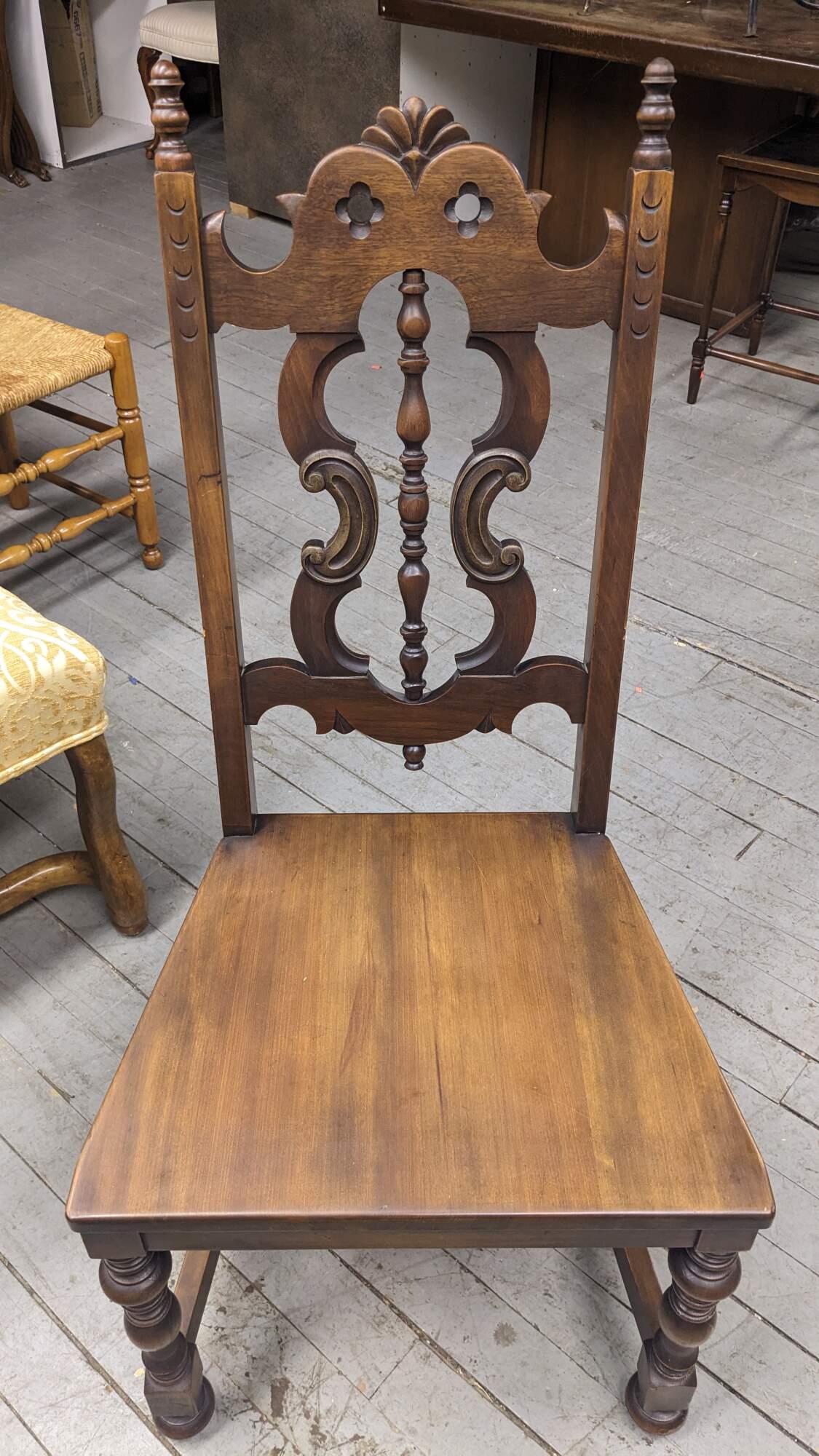Set of 4 antique Life Time Furniture Jacobean / Spanish Revival dining chairs. Made of walnut featuring Jacobean styling with turned supports, pierced back, serpentine accents and finials.