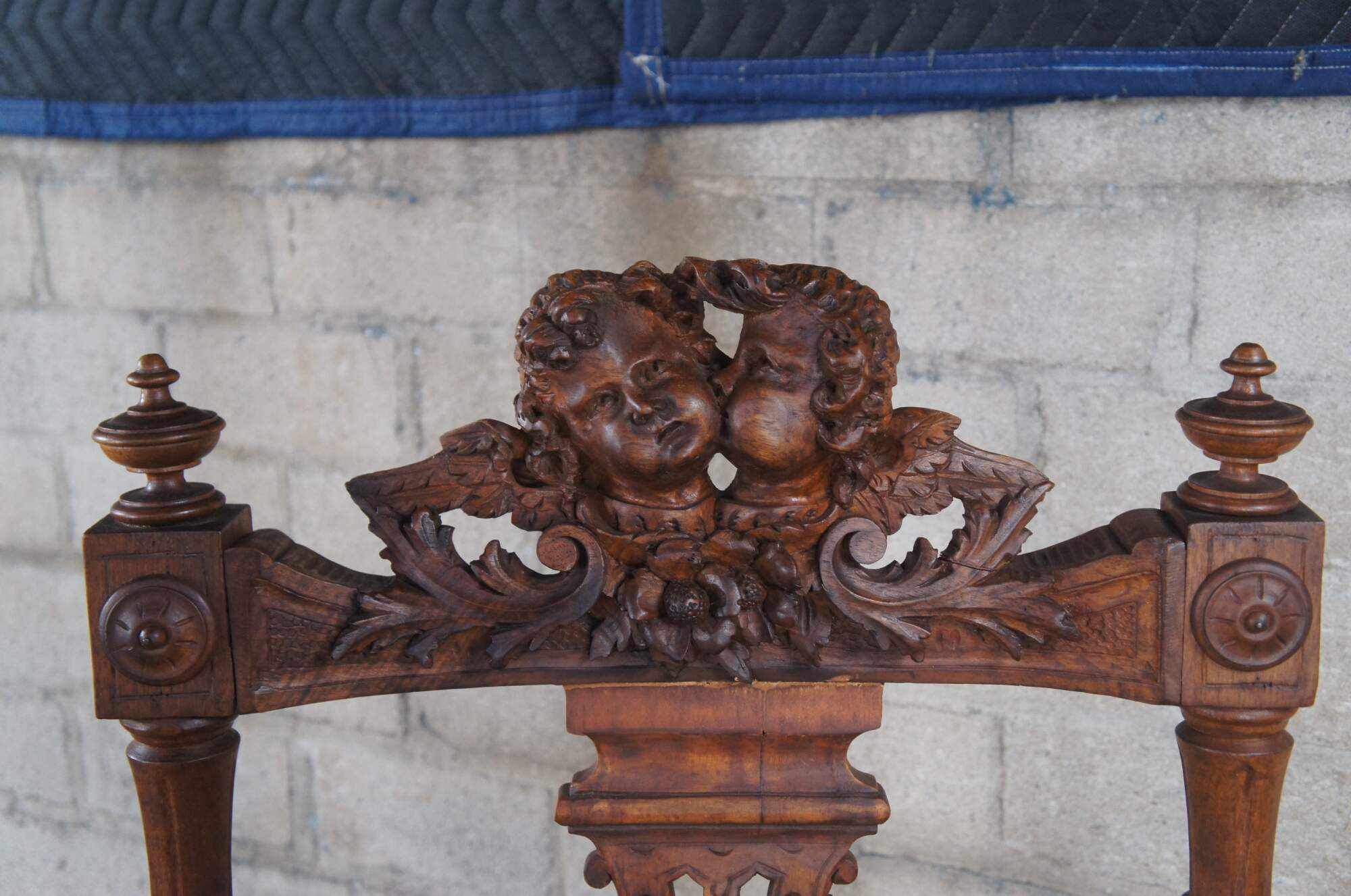 Two antique Italian Renaissance parlor armchairs, circa 1870s. Made of walnut featuring ornate carved and reticulated design with figural puttis / angels / cherubs adorned throughout.