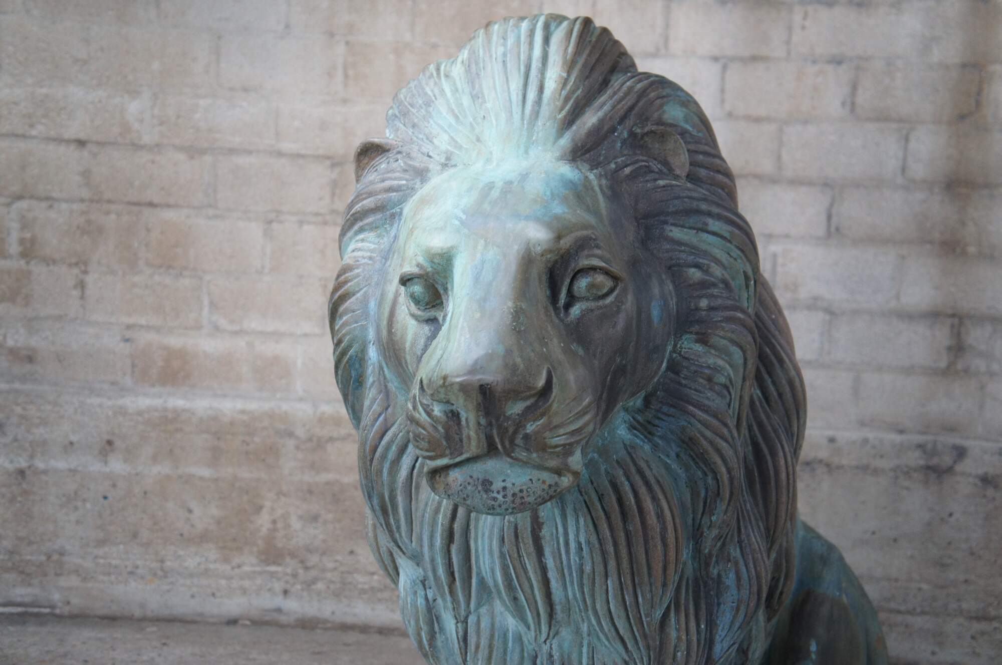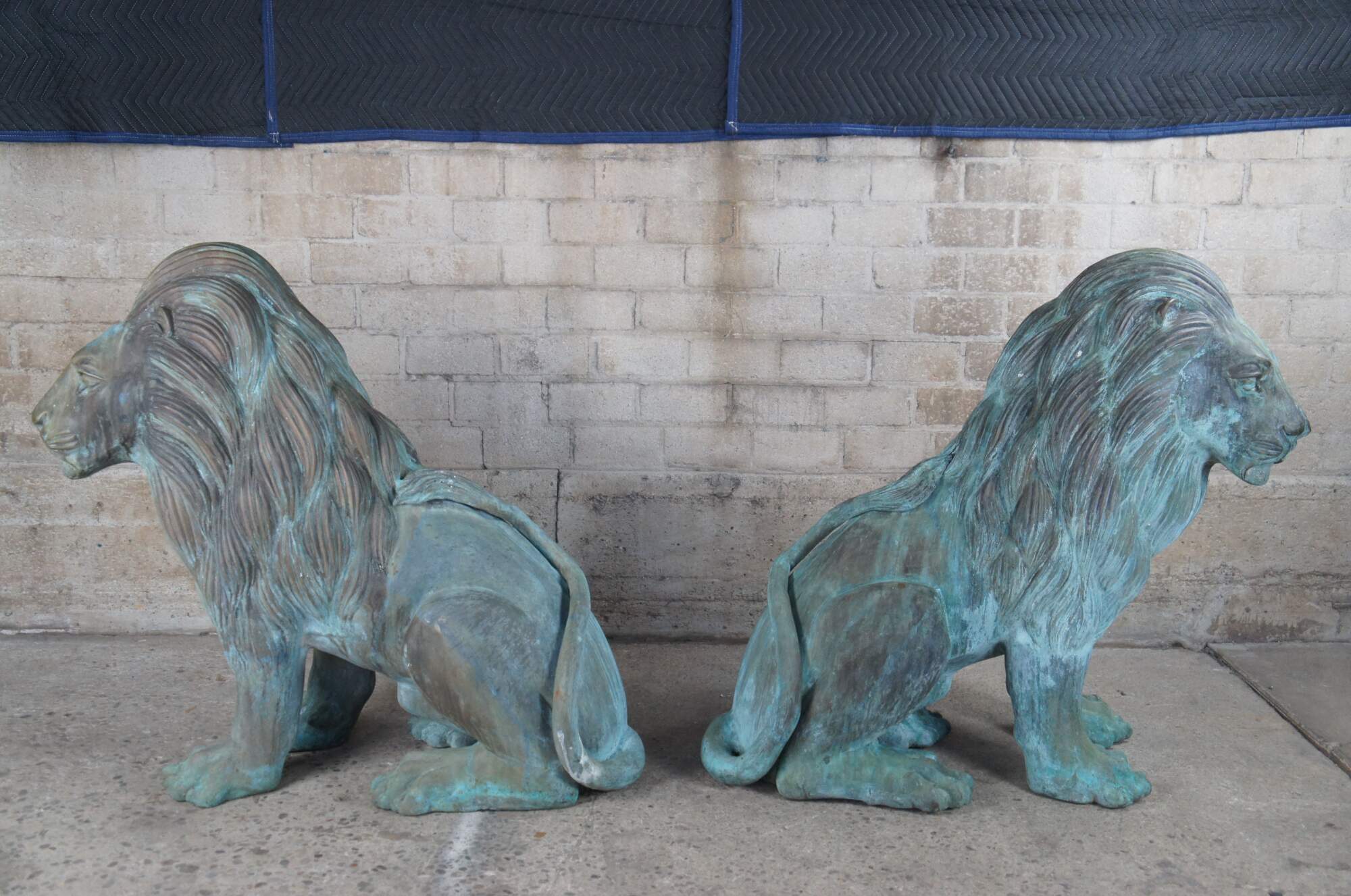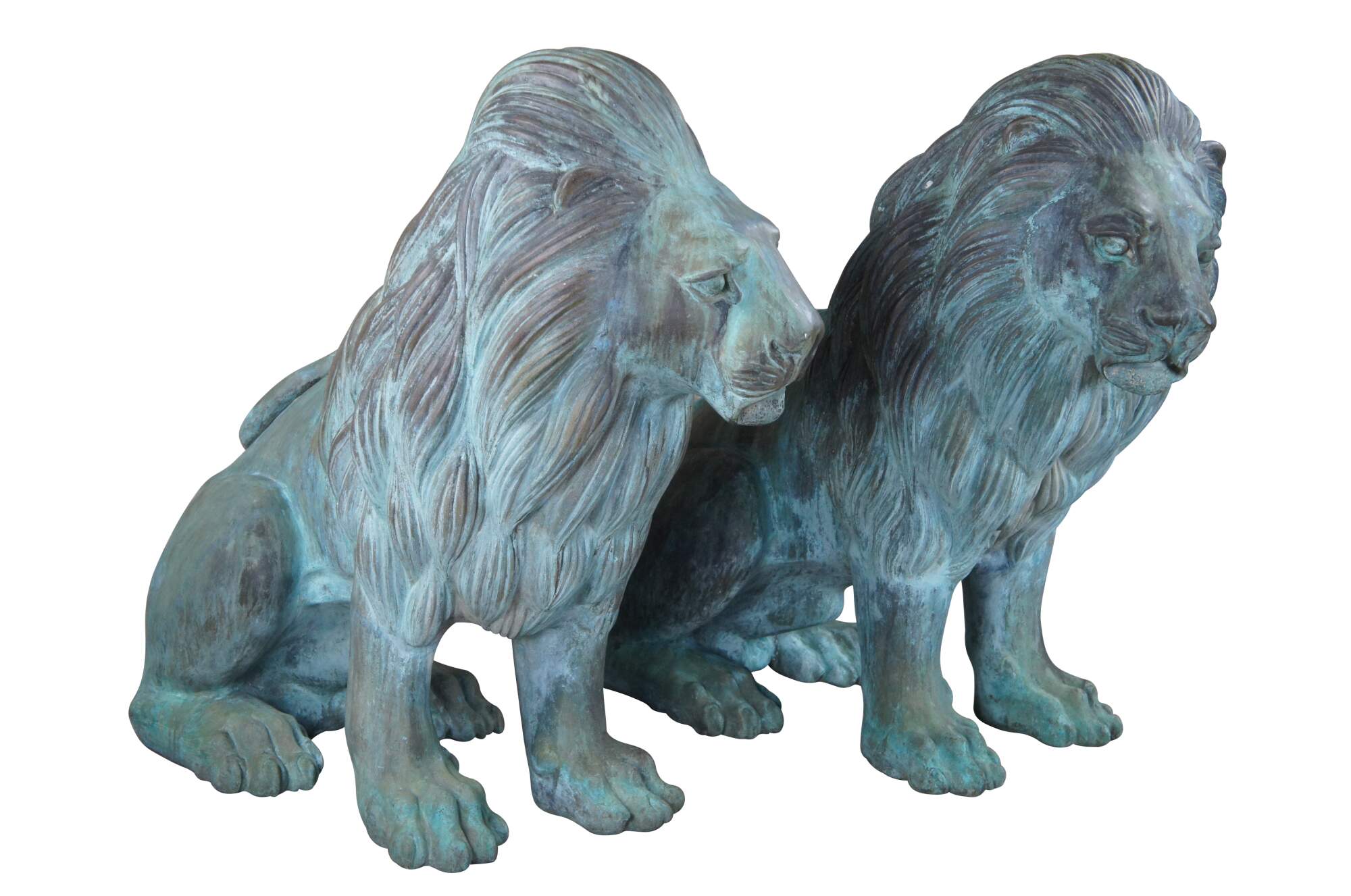 Two large and impressive entry gate lion statues. This beautiful pair of left and right facing lions are made of cast bronze featuring heavy verdigris patina. Their life like patina makes for a grand addition to any setting. Suitable for Indoor or Outdoor/Garden Use