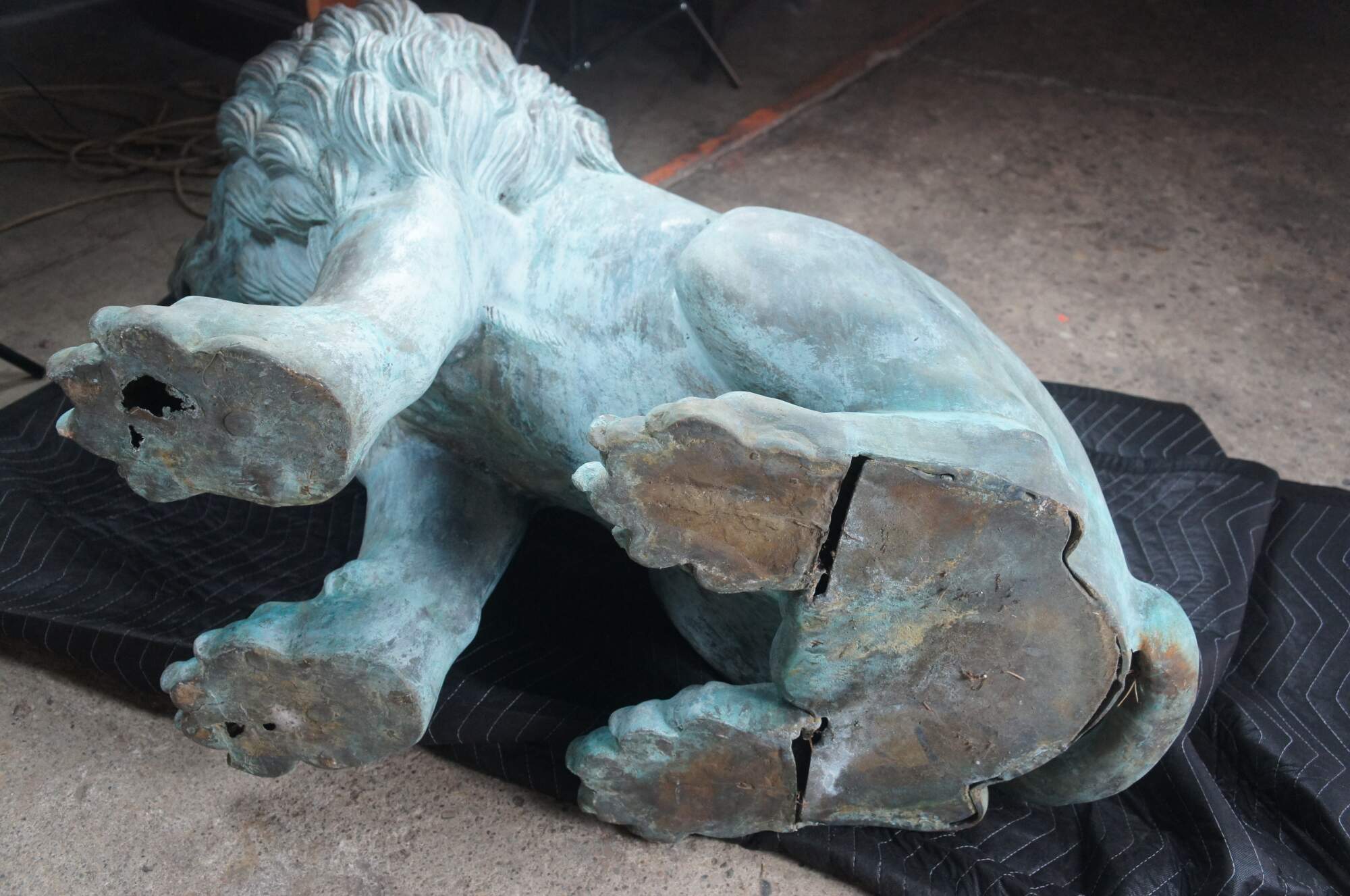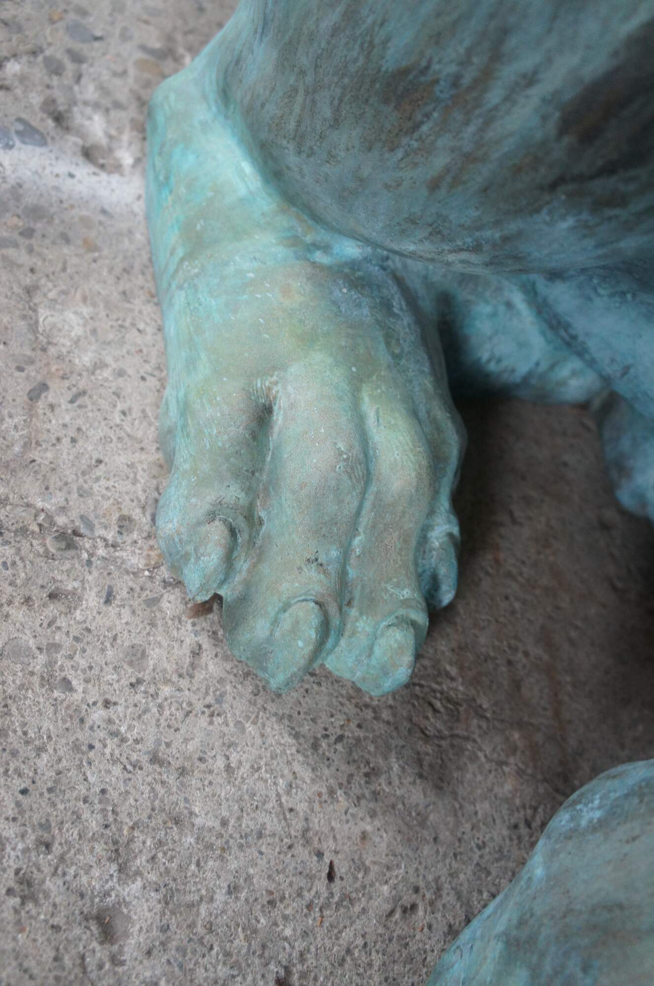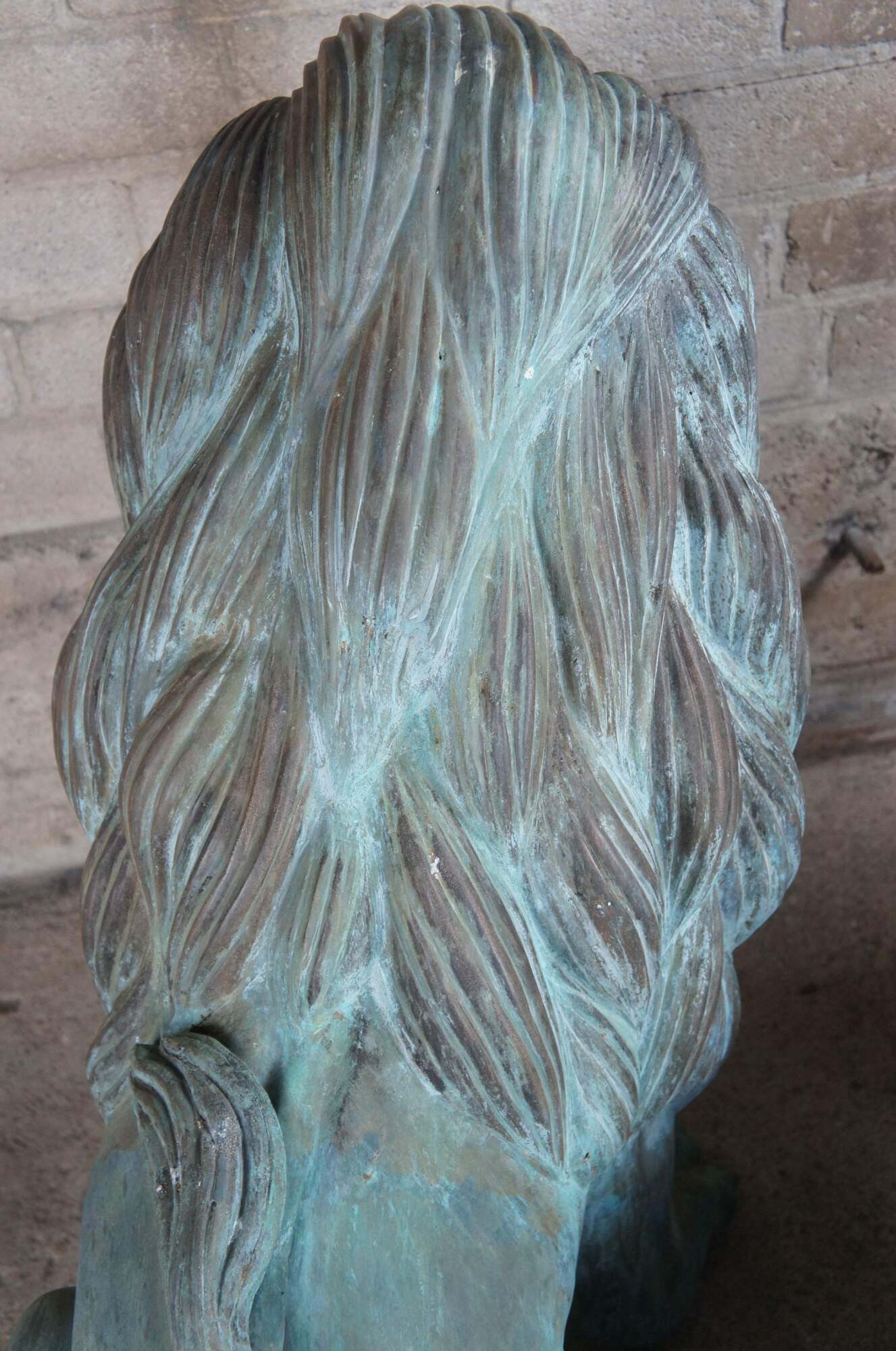 Two large and impressive entry gate lion statues. This beautiful pair of left and right facing lions are made of cast bronze featuring heavy verdigris patina. Their life like patina makes for a grand addition to any setting. Suitable for Indoor or Outdoor/Garden Use