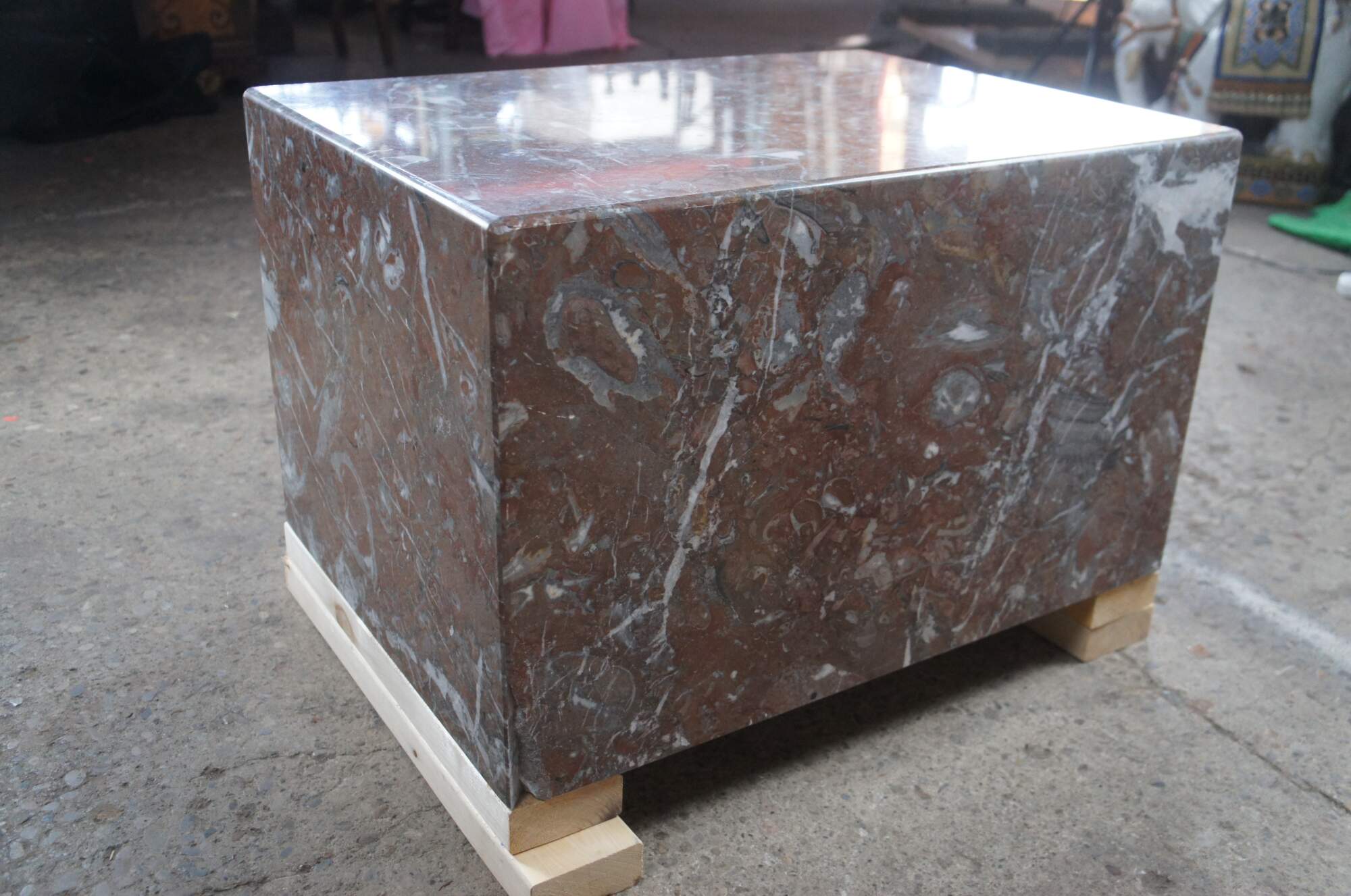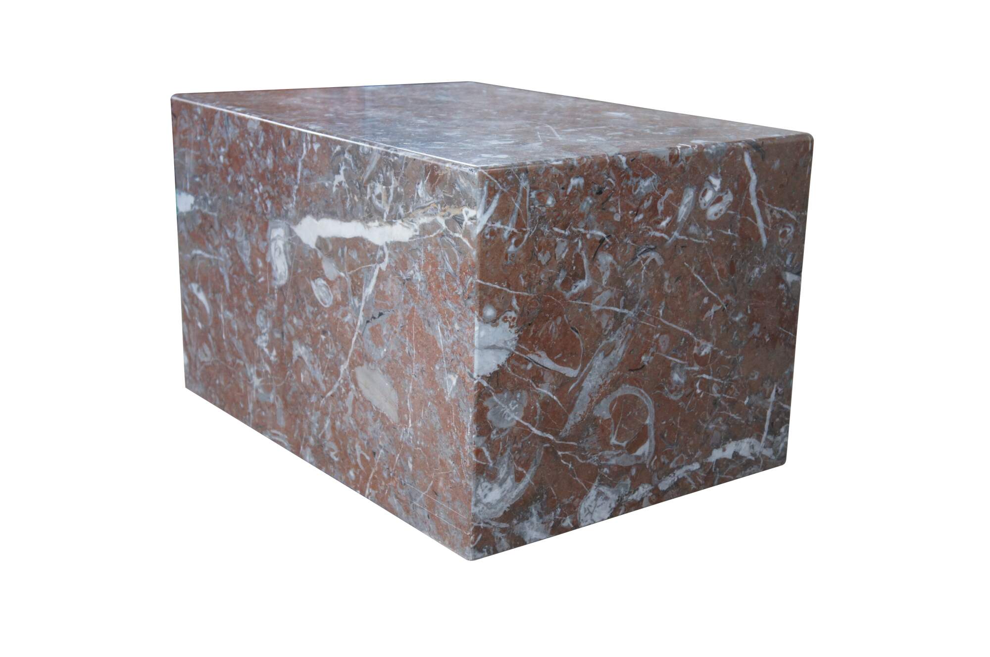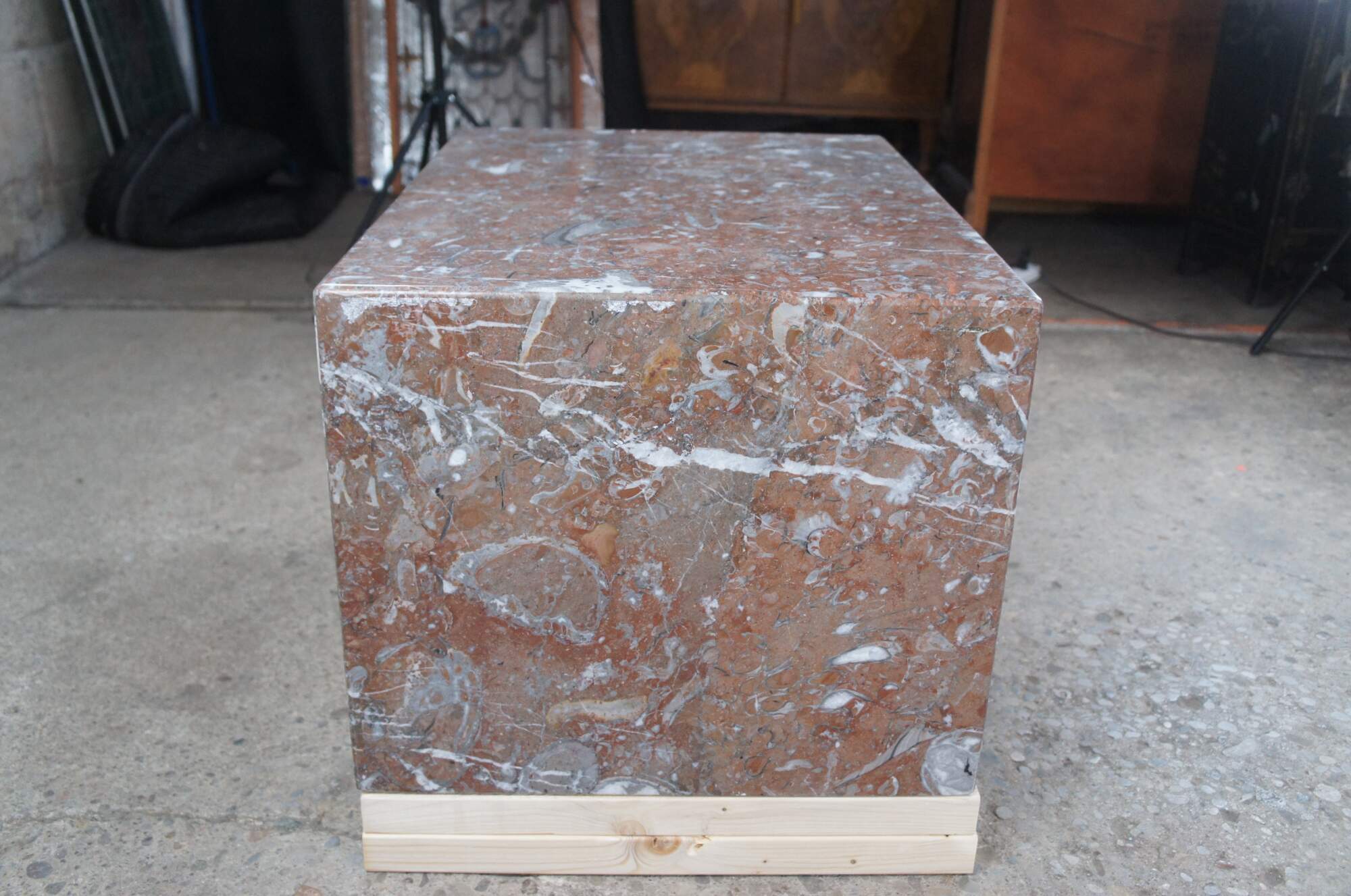 Italian minimalist cube form plinth, circa 1970s. Made from marble with pink and grey color. The perfect base to display any heavy object, sculpture or statue. Can also be used as an end, side or coffee table. The plinth is extremely heavy. 2 Available, sold separately.