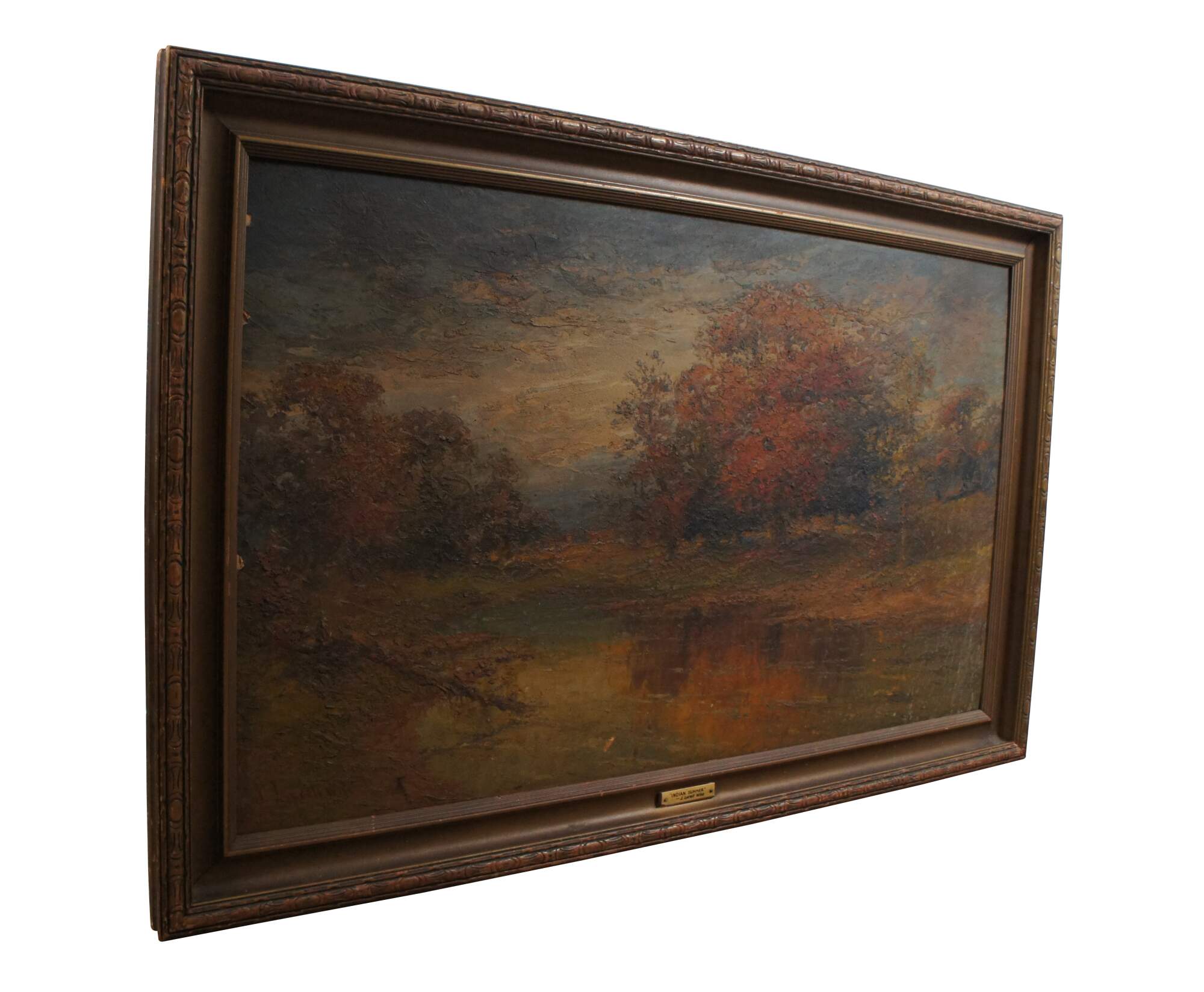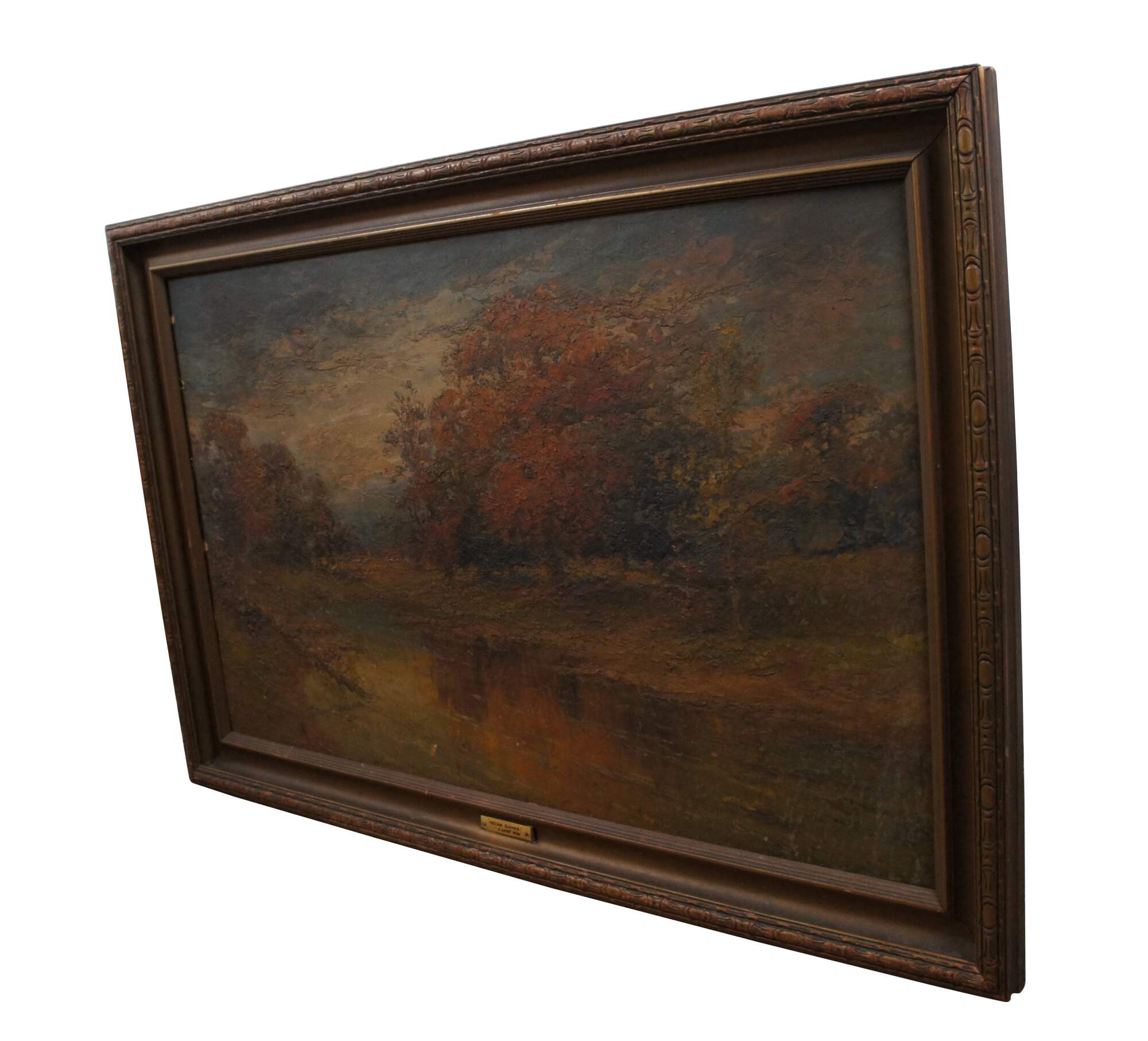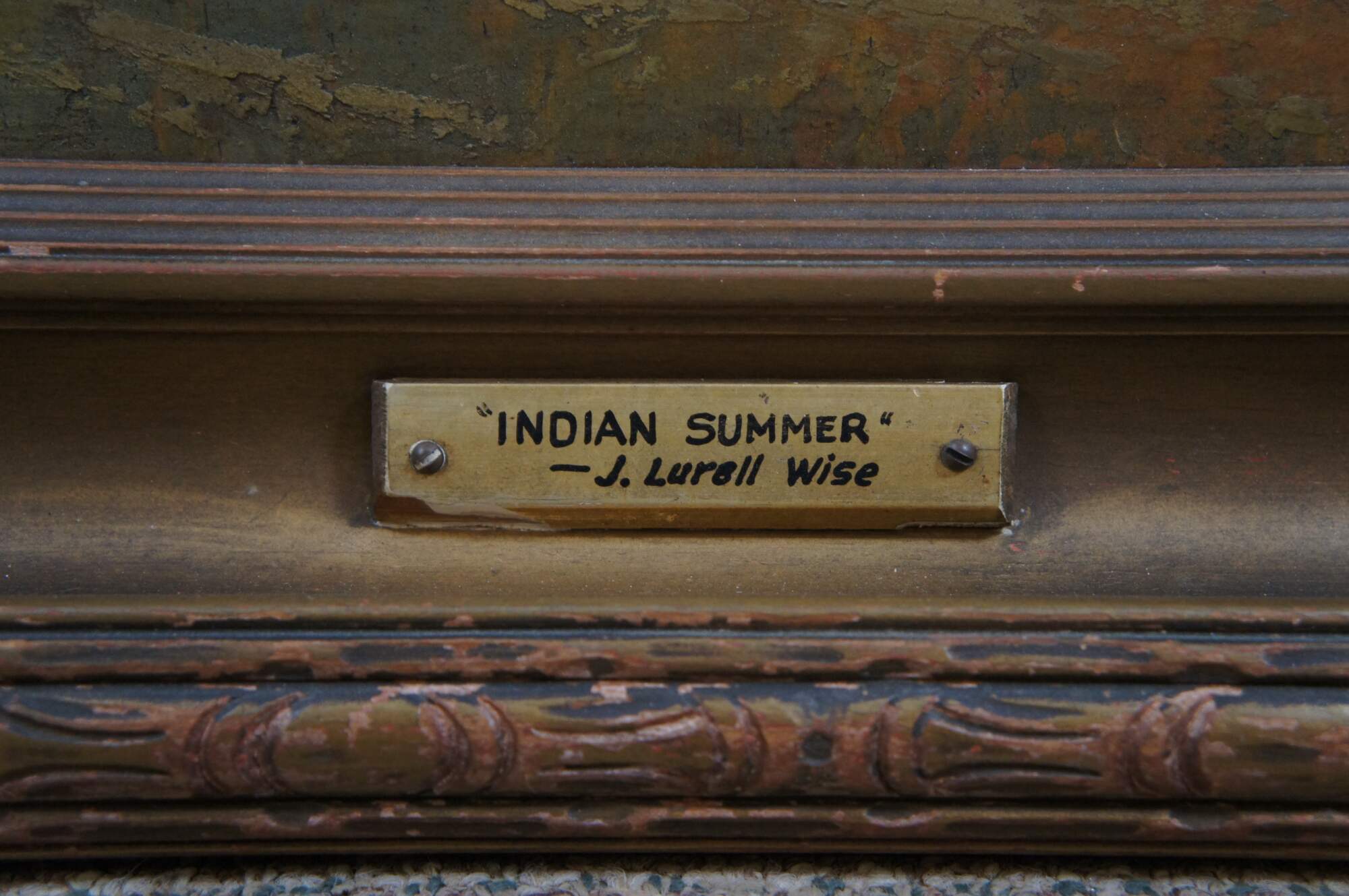 Early 20th century oil on canvas impressionist landscape painting of autumn trees along a river, titled "Indian Summer" by J. Lurell Wise. Signed in lower left corner. Framed in beveled frame with carved detail edge and brass plaque.