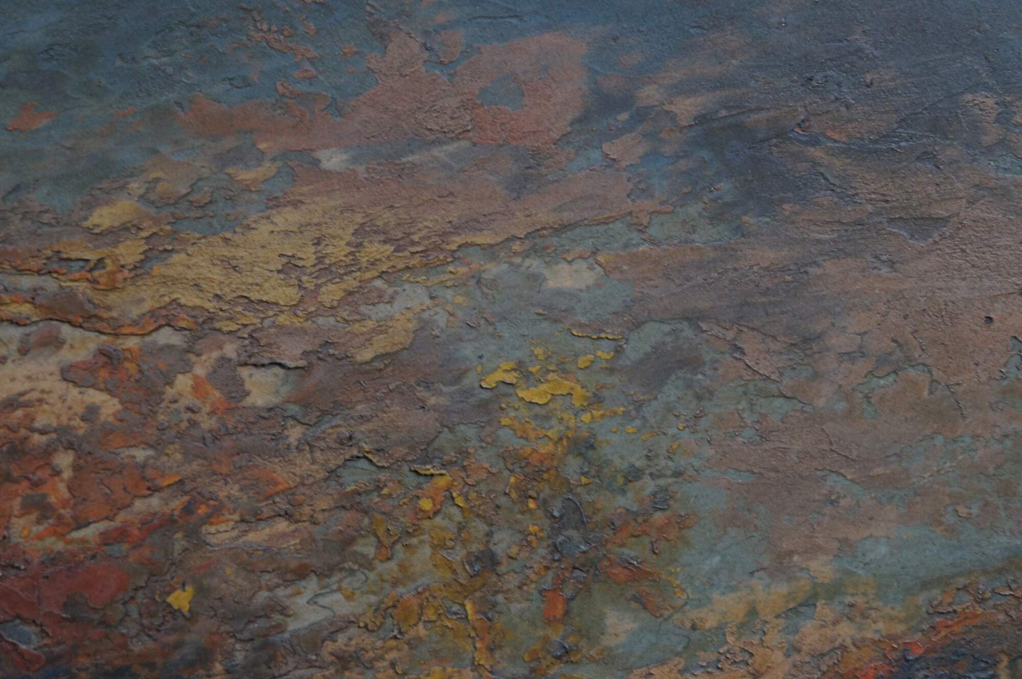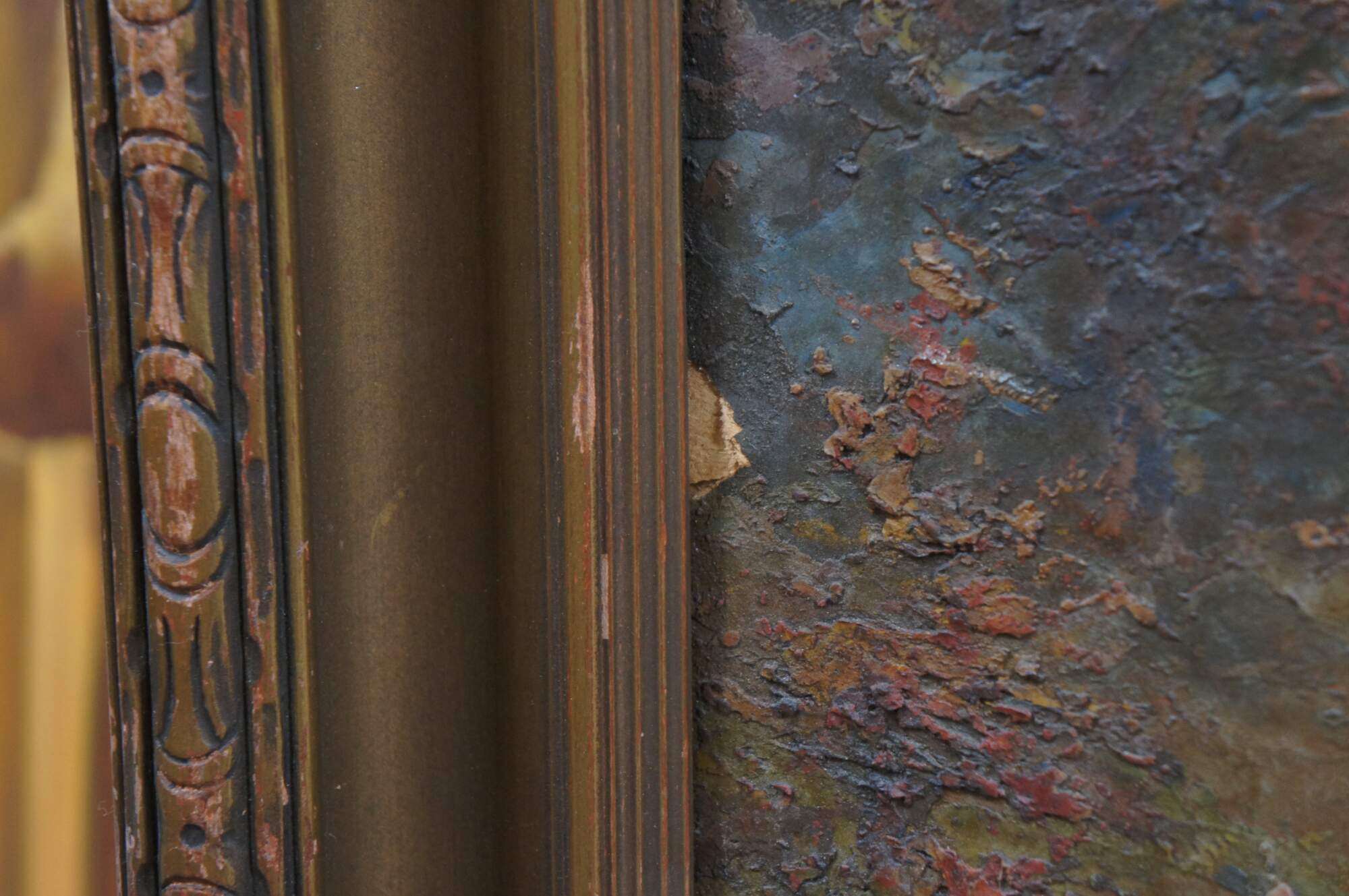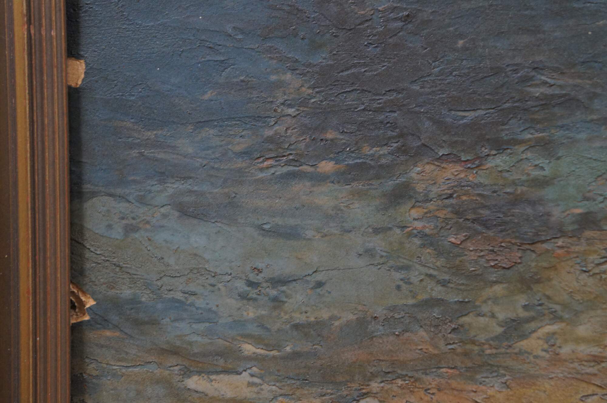 Early 20th century oil on canvas impressionist landscape painting of autumn trees along a river, titled "Indian Summer" by J. Lurell Wise. Signed in lower left corner. Framed in beveled frame with carved detail edge and brass plaque.